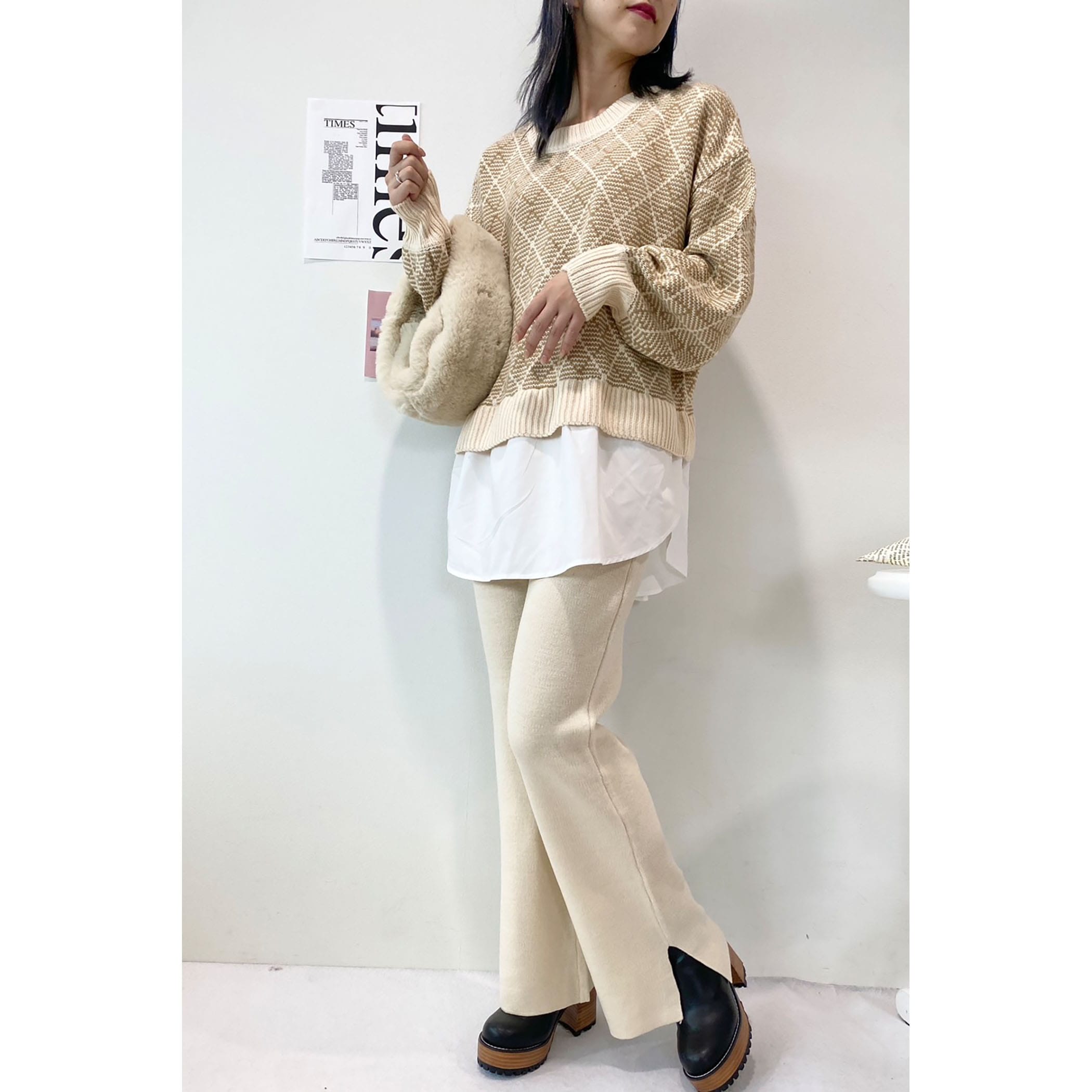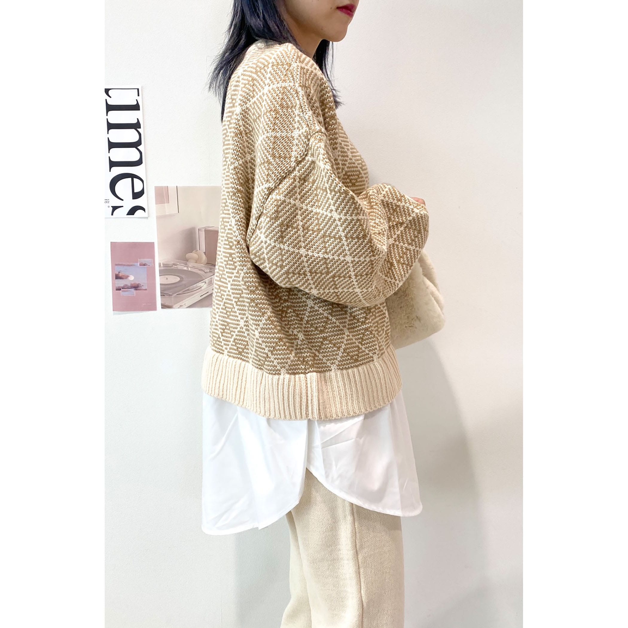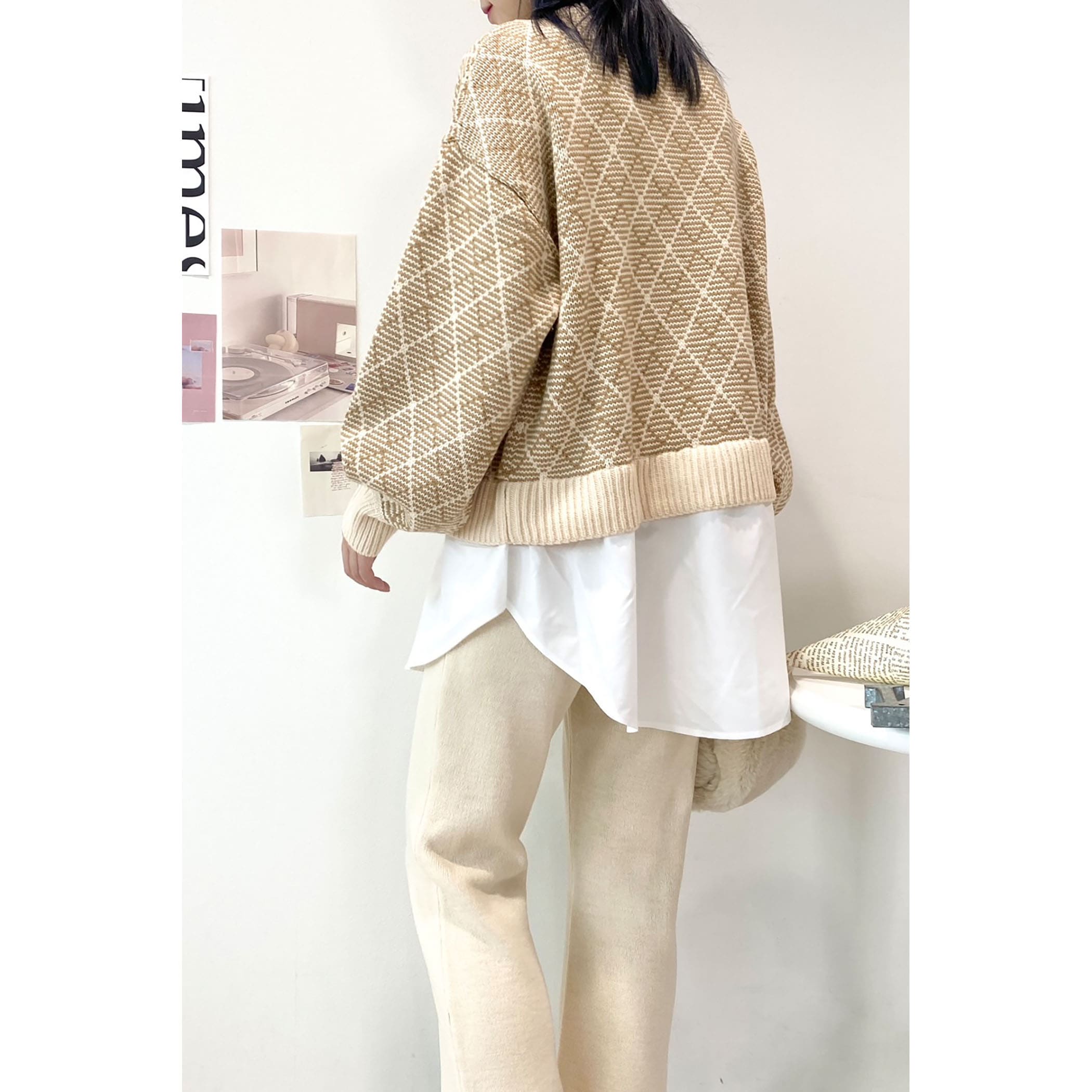 一枚で主役級のダイヤ柄ジャガードニット。ジャガードニットとブラウスをレイヤードしたようなデザインで、これ一枚でかわいいが完成する優秀アイテムです。ドロップショルダーのデザインと、ビッグシルエットが抜け感のあるデザインです。チクチク感を気にすることなくふんわりと優しい肌触りで着ていただけます。