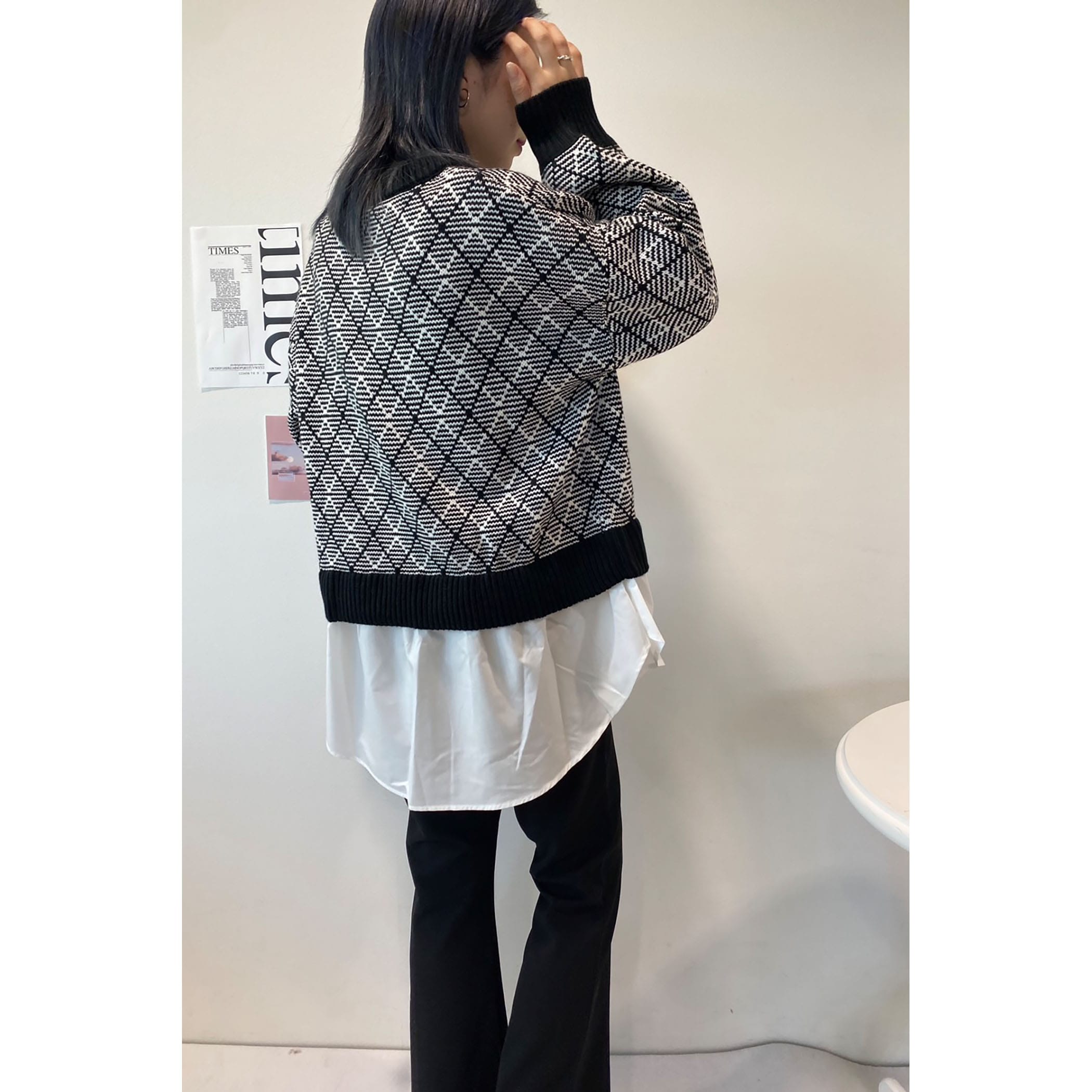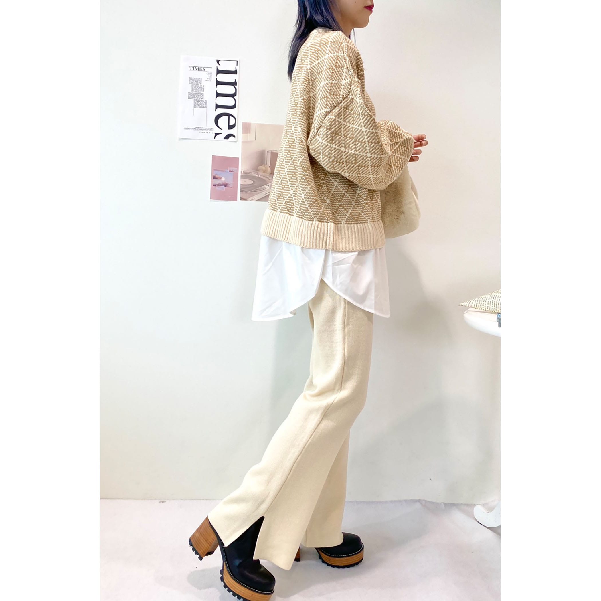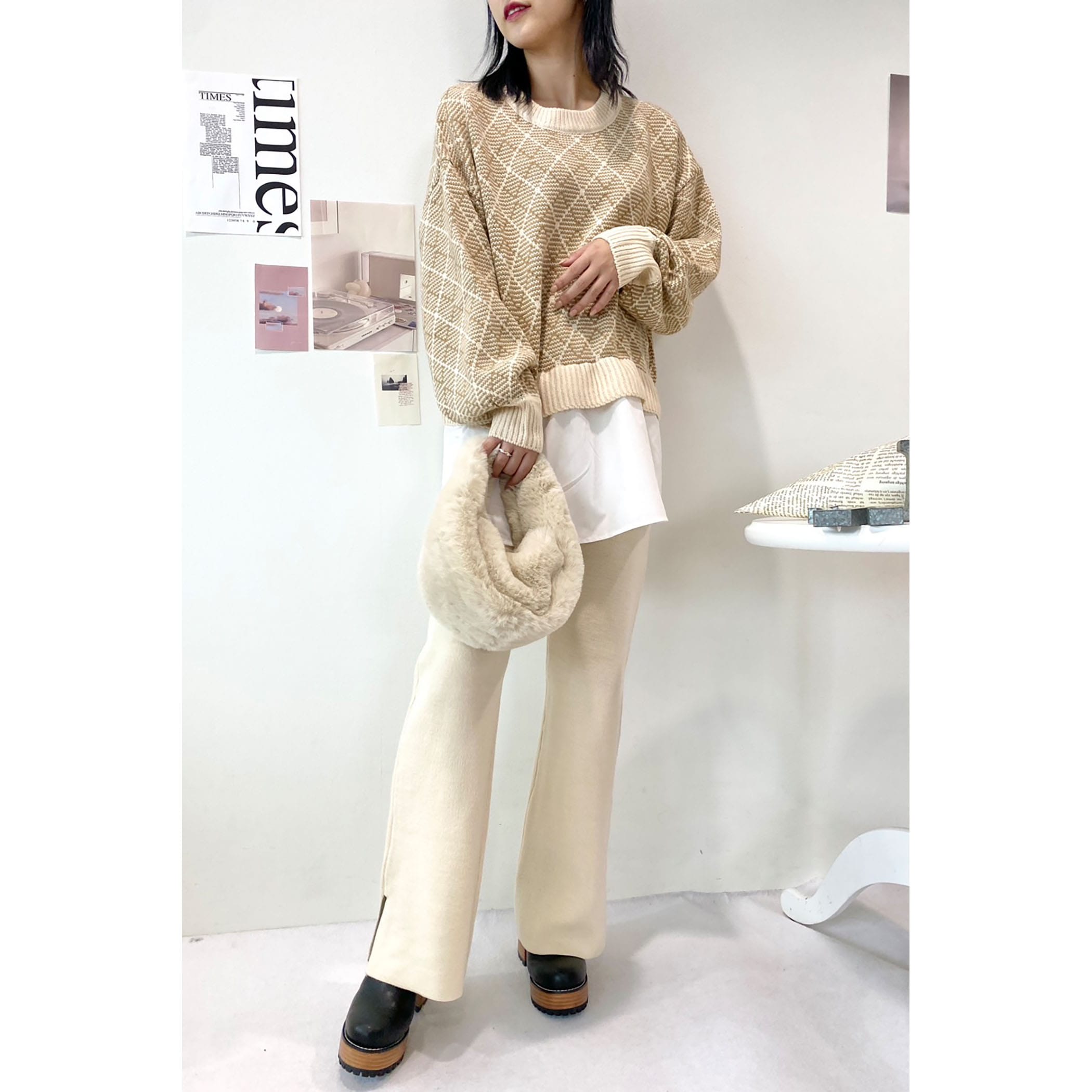 一枚で主役級のダイヤ柄ジャガードニット。ジャガードニットとブラウスをレイヤードしたようなデザインで、これ一枚でかわいいが完成する優秀アイテムです。ドロップショルダーのデザインと、ビッグシルエットが抜け感のあるデザインです。チクチク感を気にすることなくふんわりと優しい肌触りで着ていただけます。