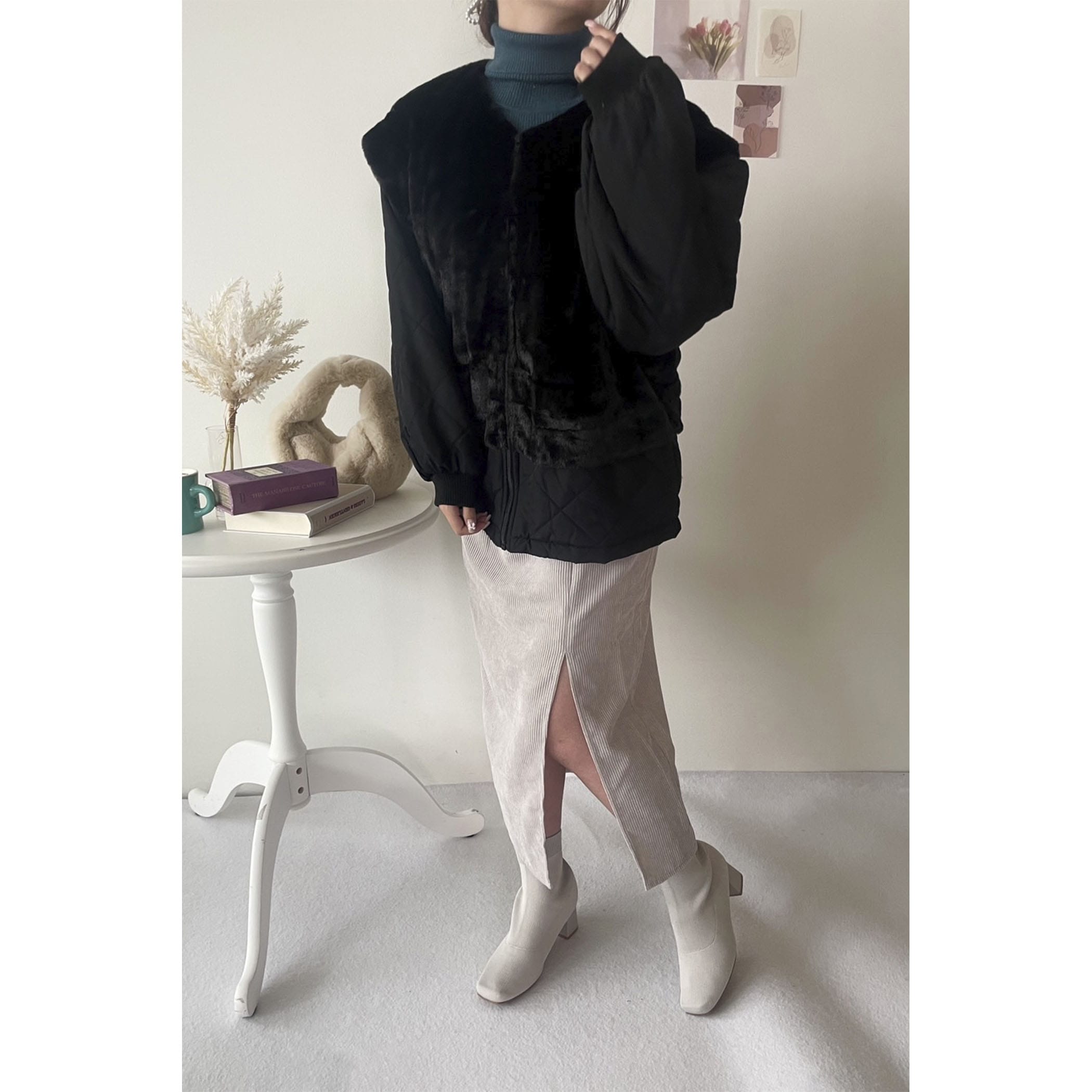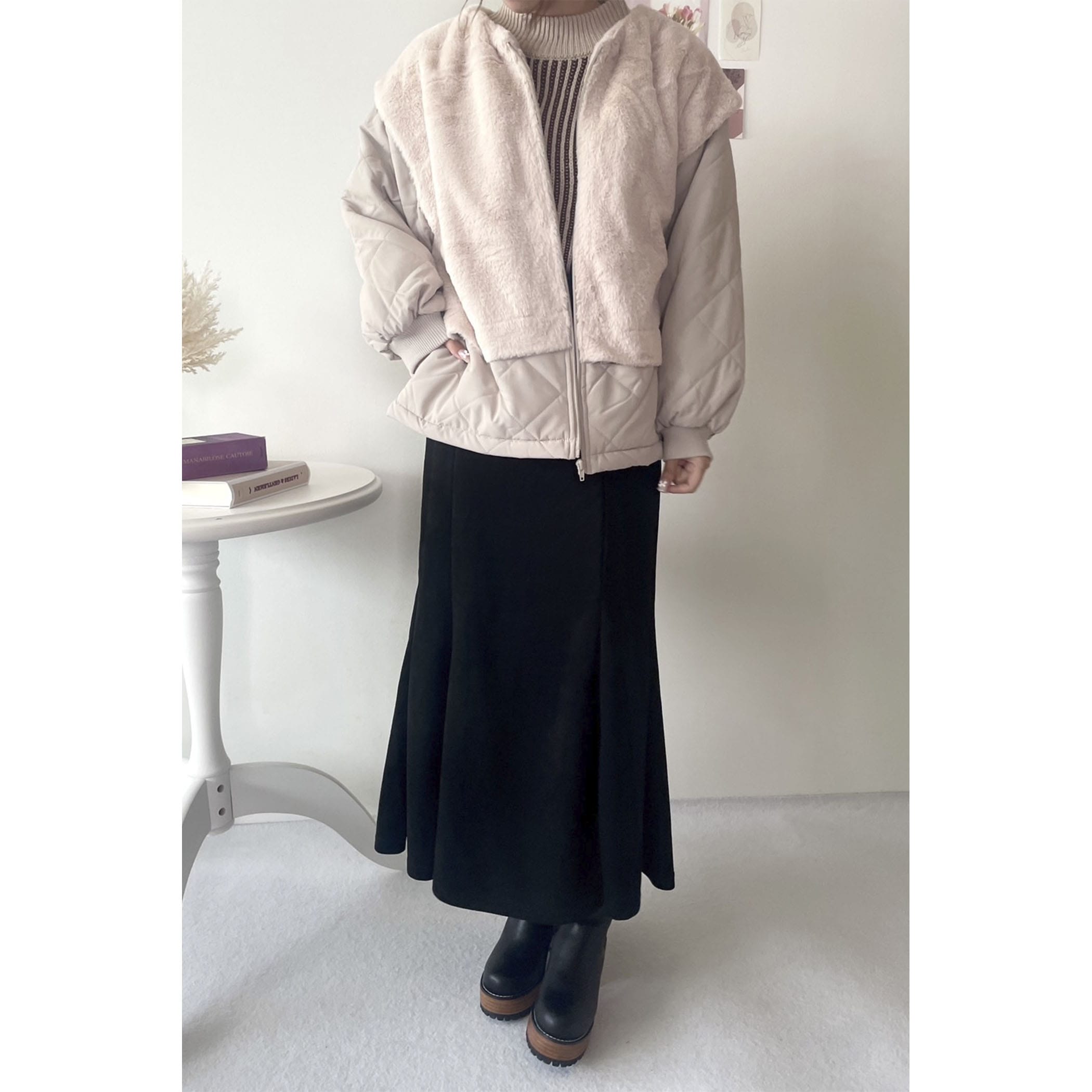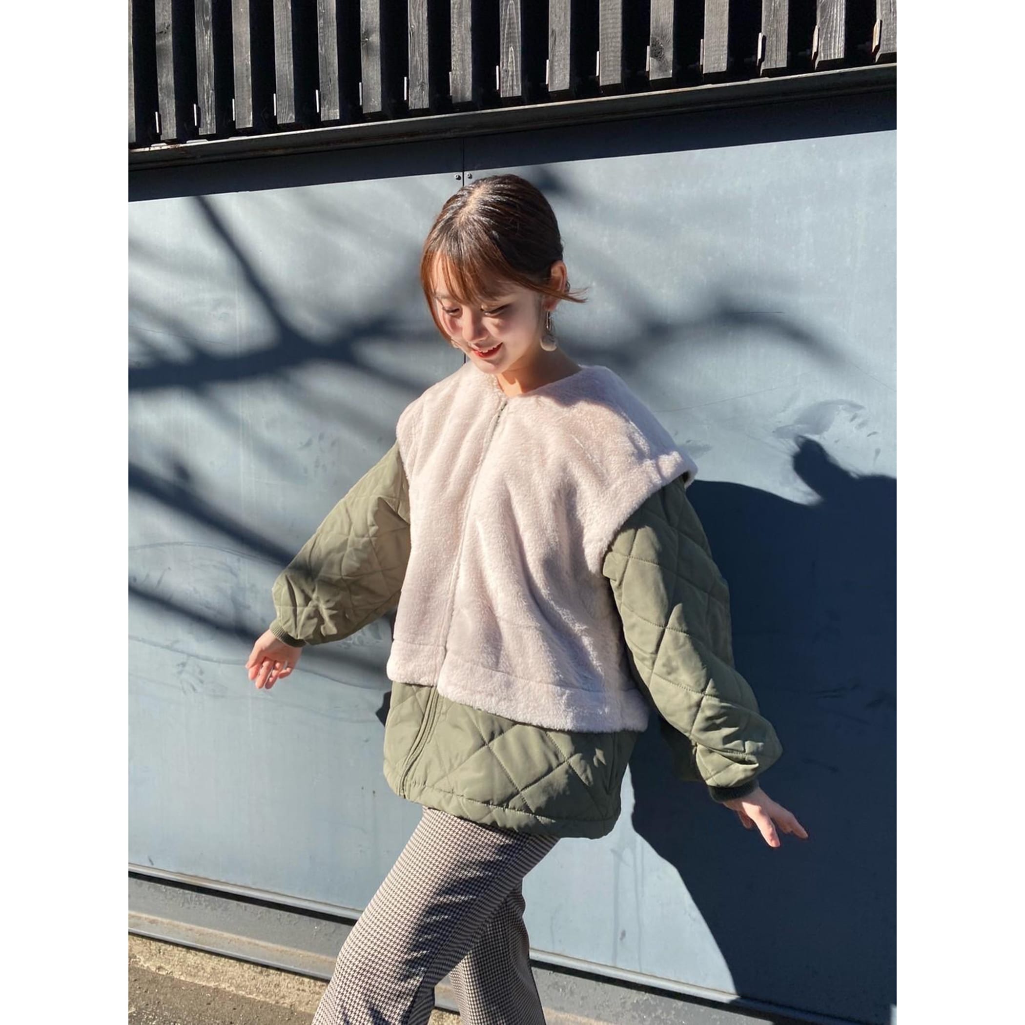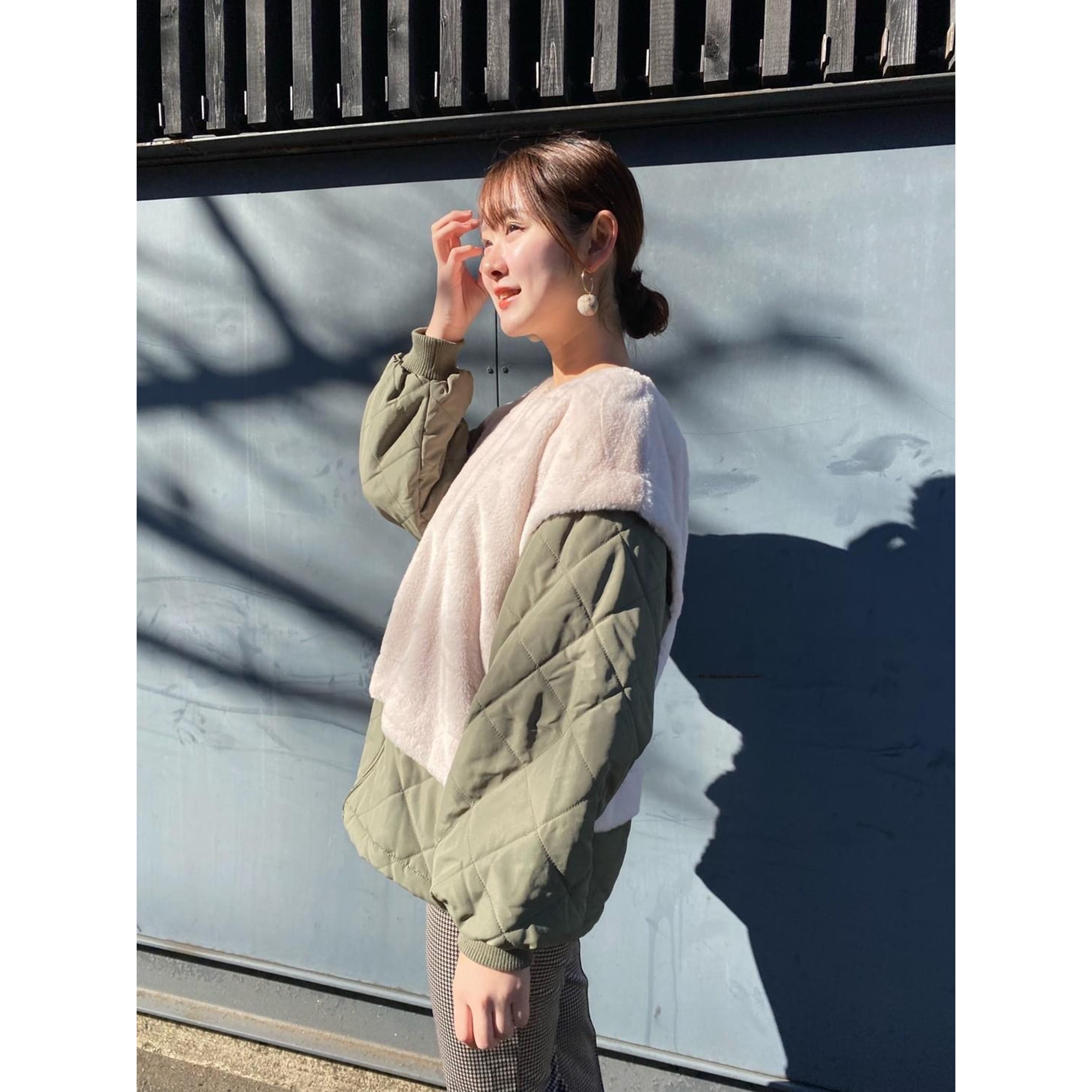キルトアウターとベストがレイヤードされたようなトレンドライクな中綿アウター。カジュアルな印象のアイテムですが、マーメイドスカートやワンピース・フレアボトムとも相性のいい一枚です。衿ぐりがVネックなのでタートネックのアイテムとあわせてレイヤードスタイルも楽しめます。