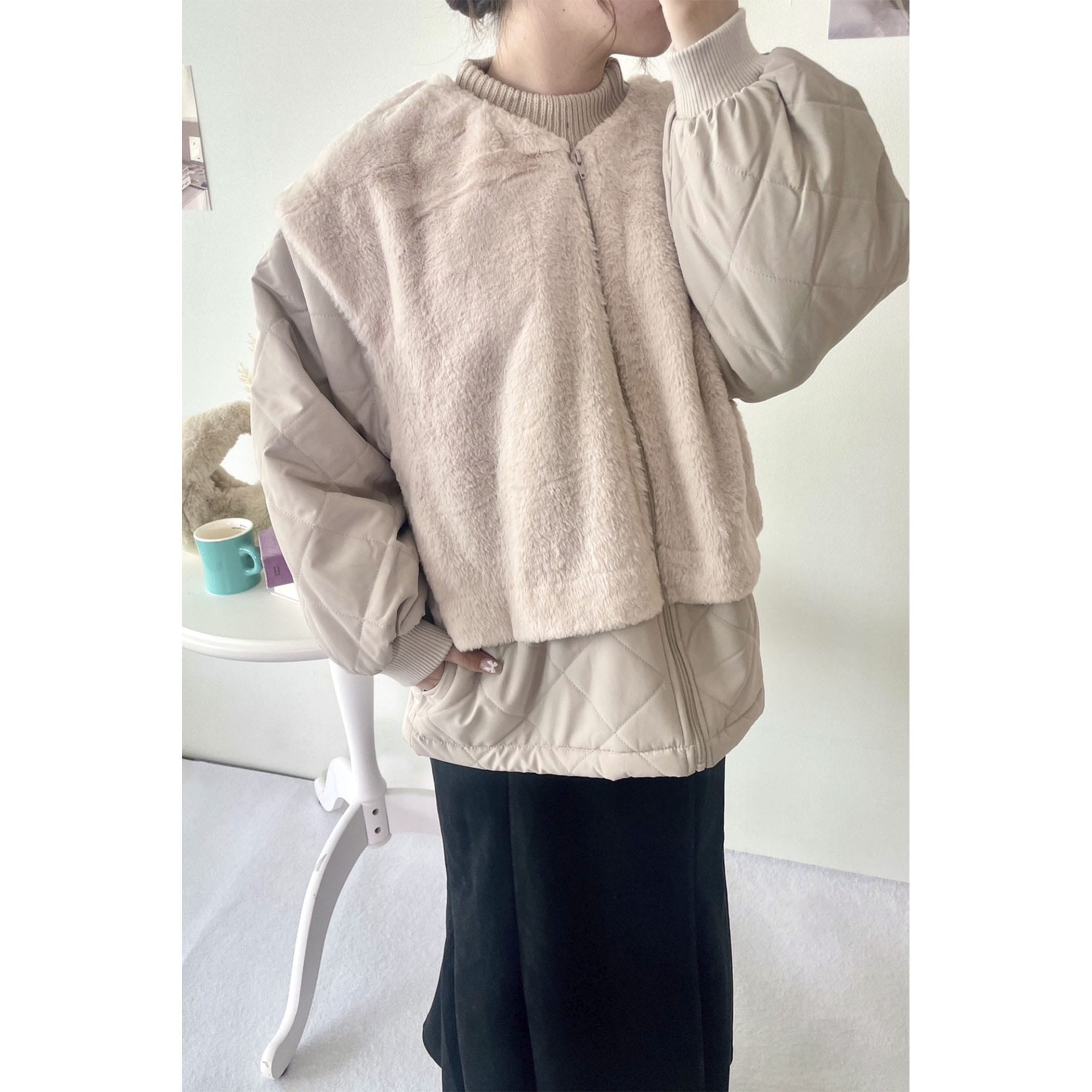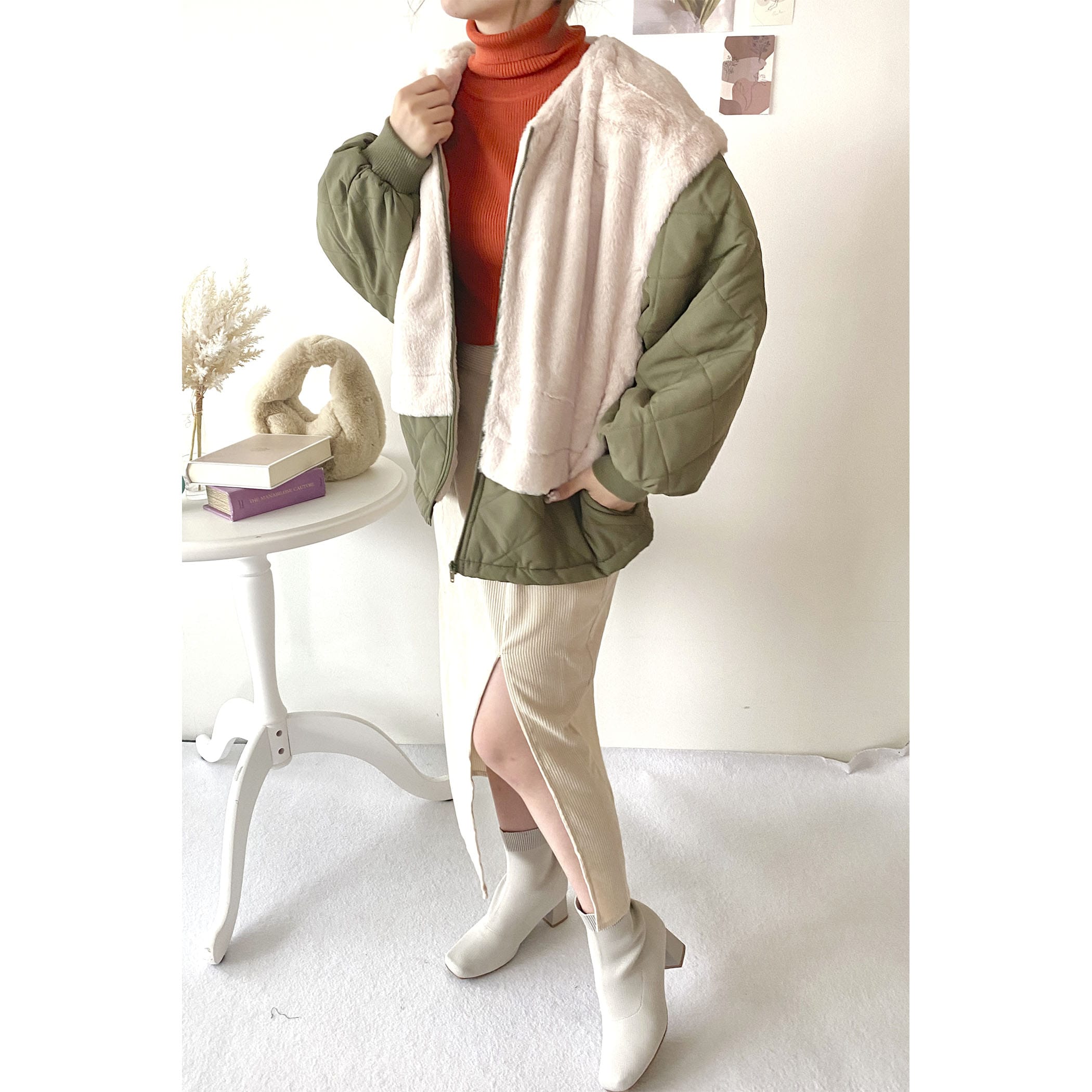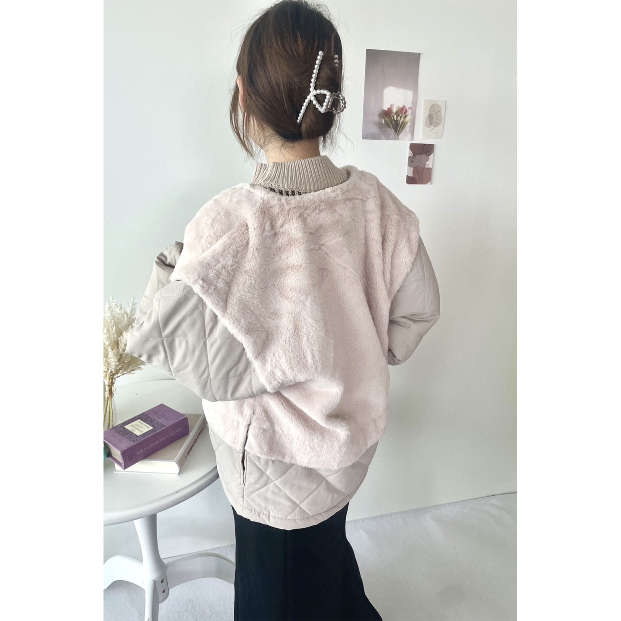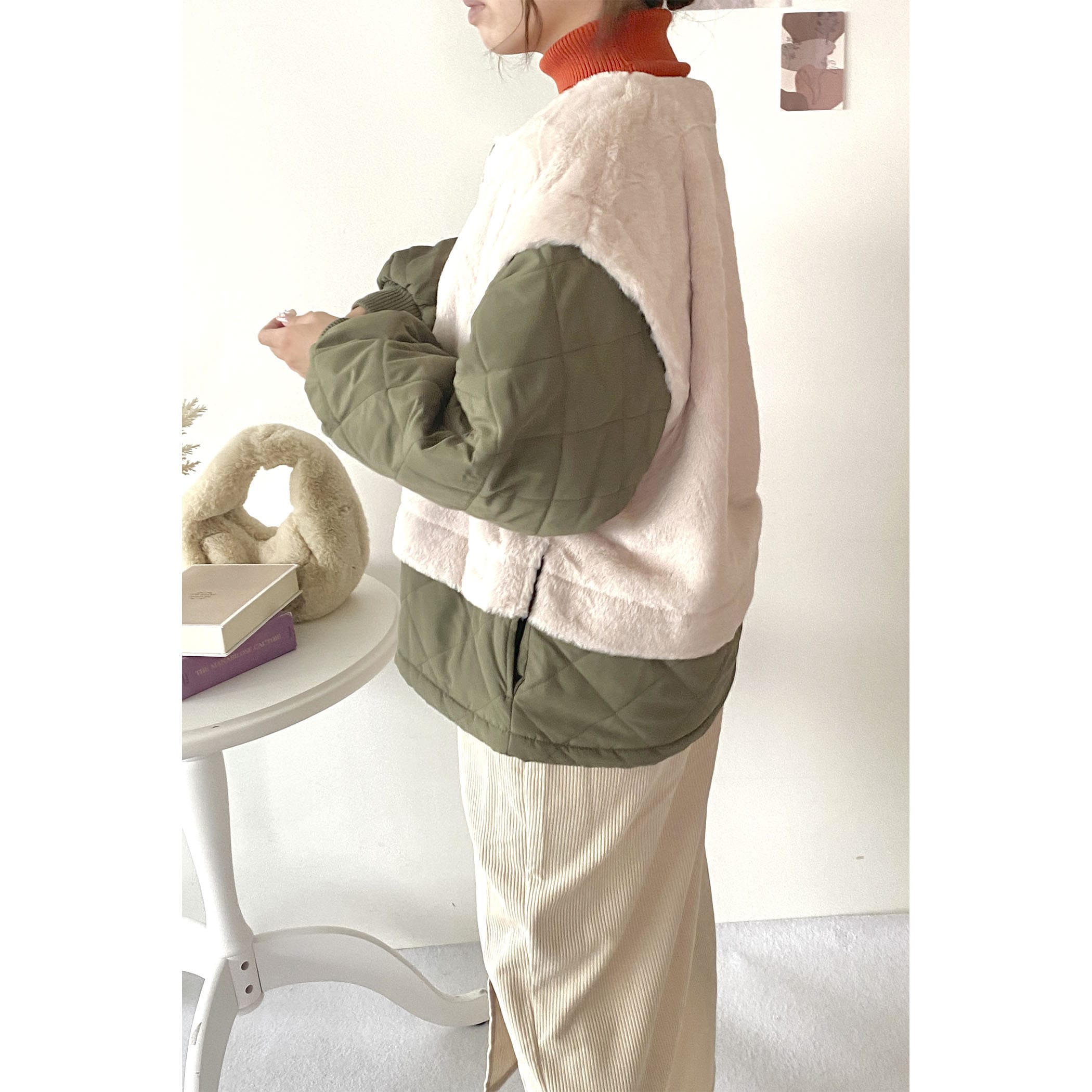 キルトアウターとベストがレイヤードされたようなトレンドライクな中綿アウター。カジュアルな印象のアイテムですが、マーメイドスカートやワンピース・フレアボトムとも相性のいい一枚です。衿ぐりがVネックなのでタートネックのアイテムとあわせてレイヤードスタイルも楽しめます。