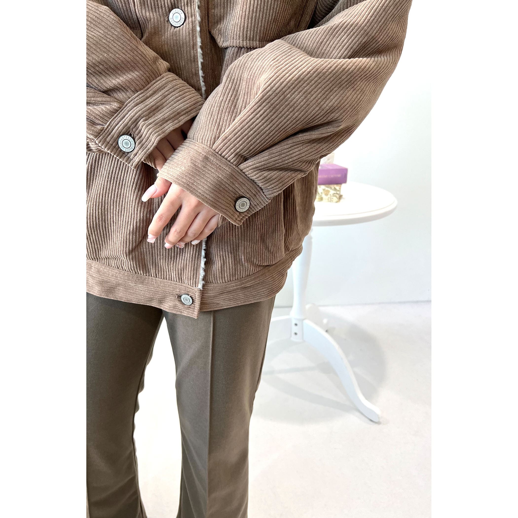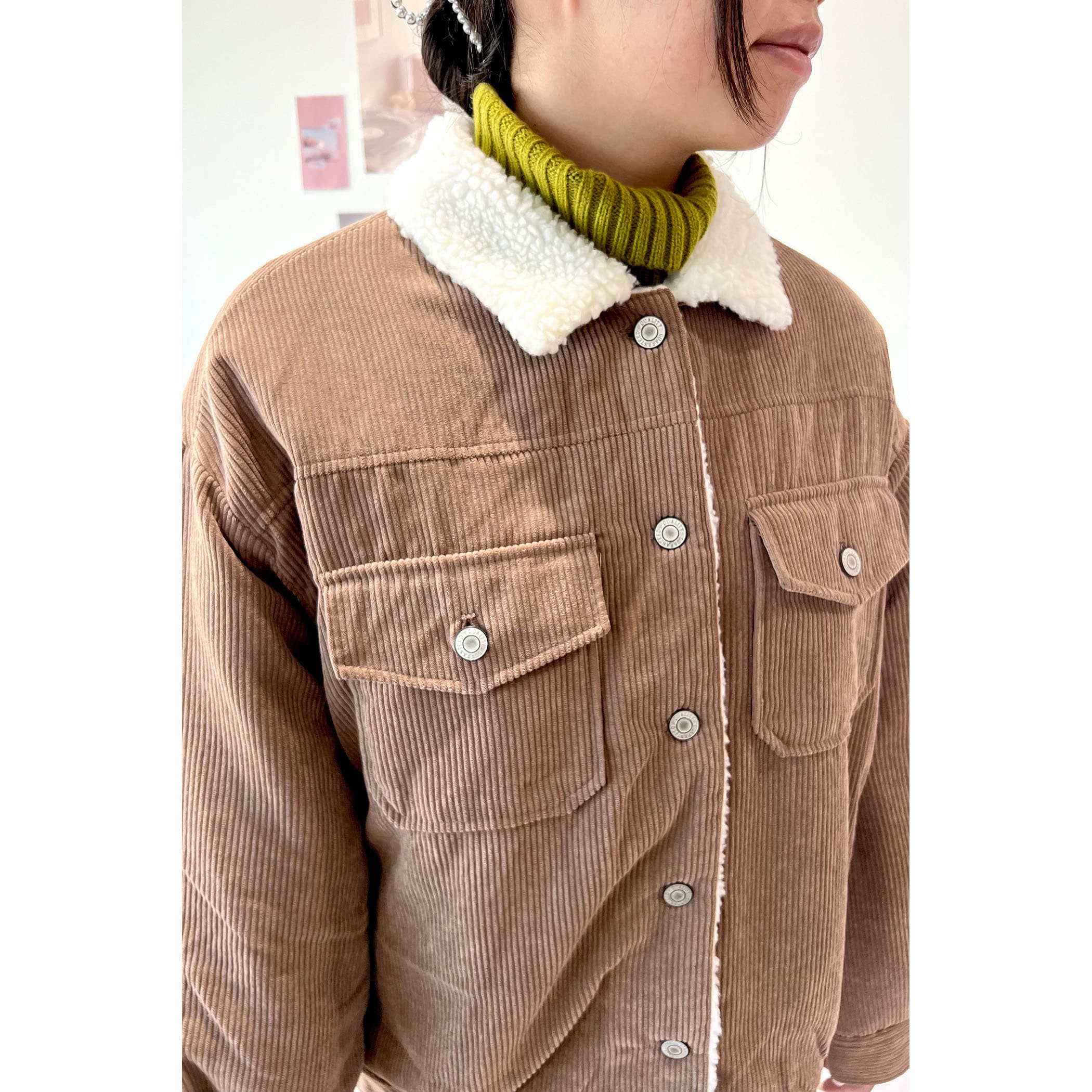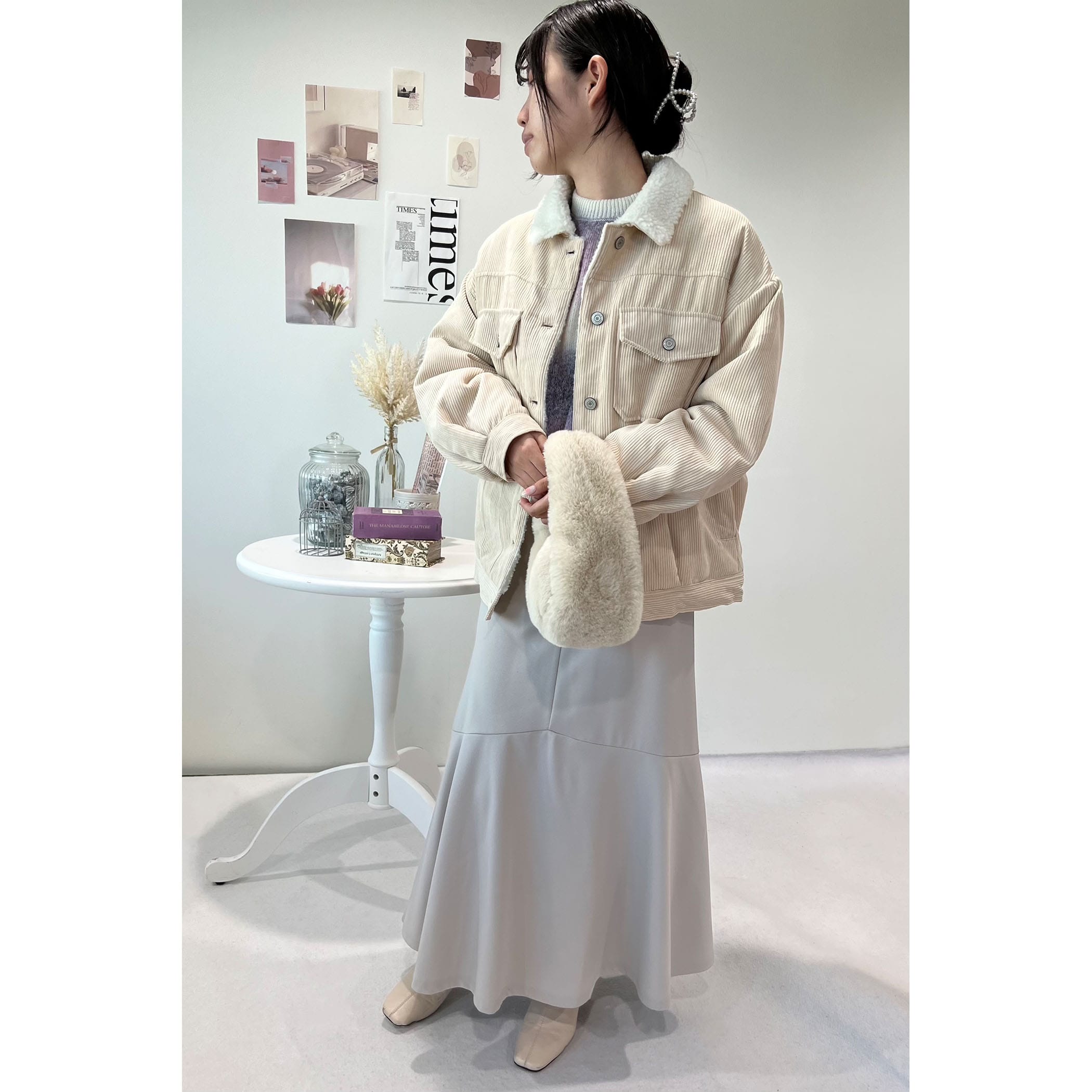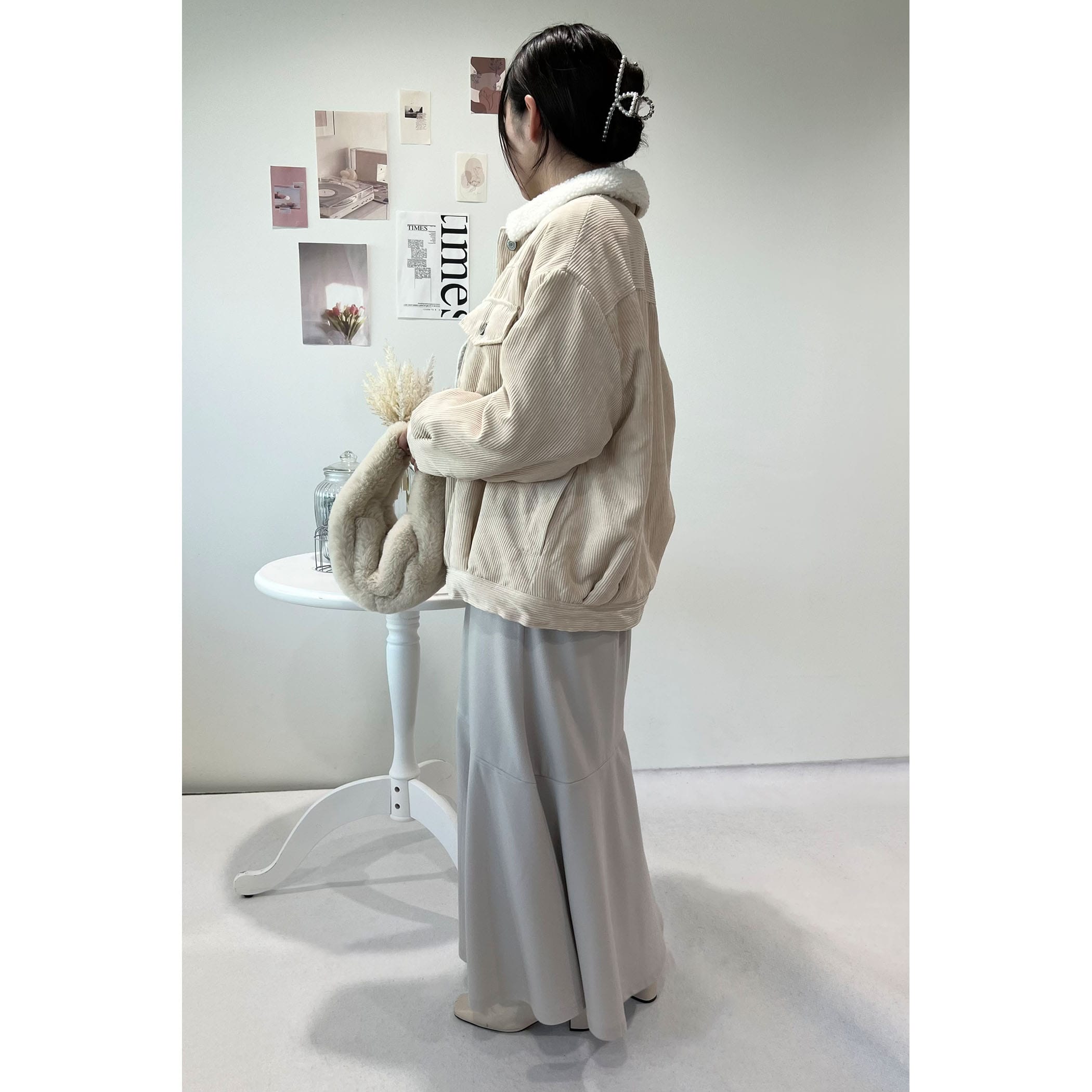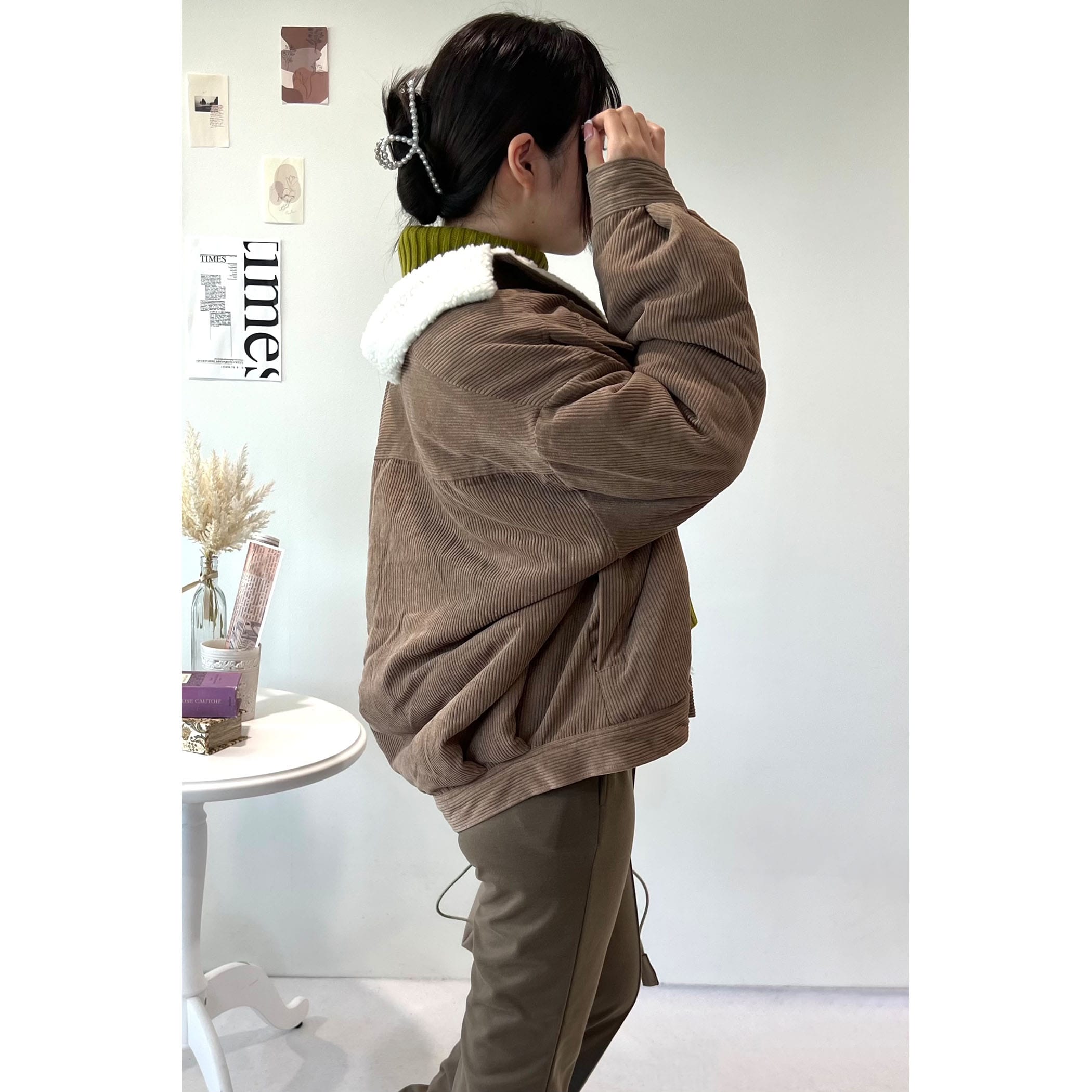 衿のボア配色がポイントのコーデュロイジャケット。オーバーサイズなのでスカートやワンピースと合わせてガーリーに、パンツと合わせてメンズライクにも着ていただけます。身頃の裏側にボア・袖の裏側がキルトになっているので、トレンドライクなアイテムですが防寒対策もバッチリな一枚です。