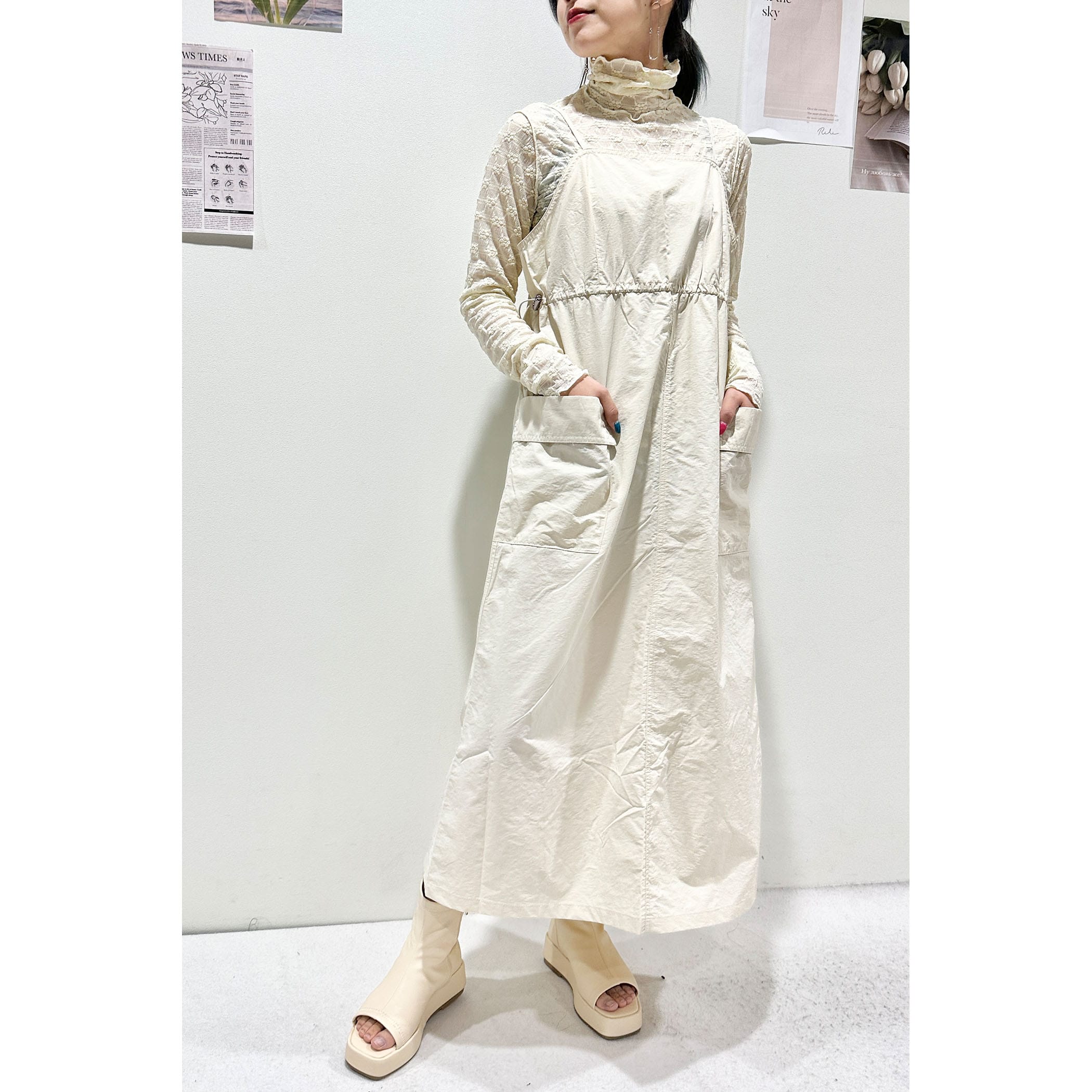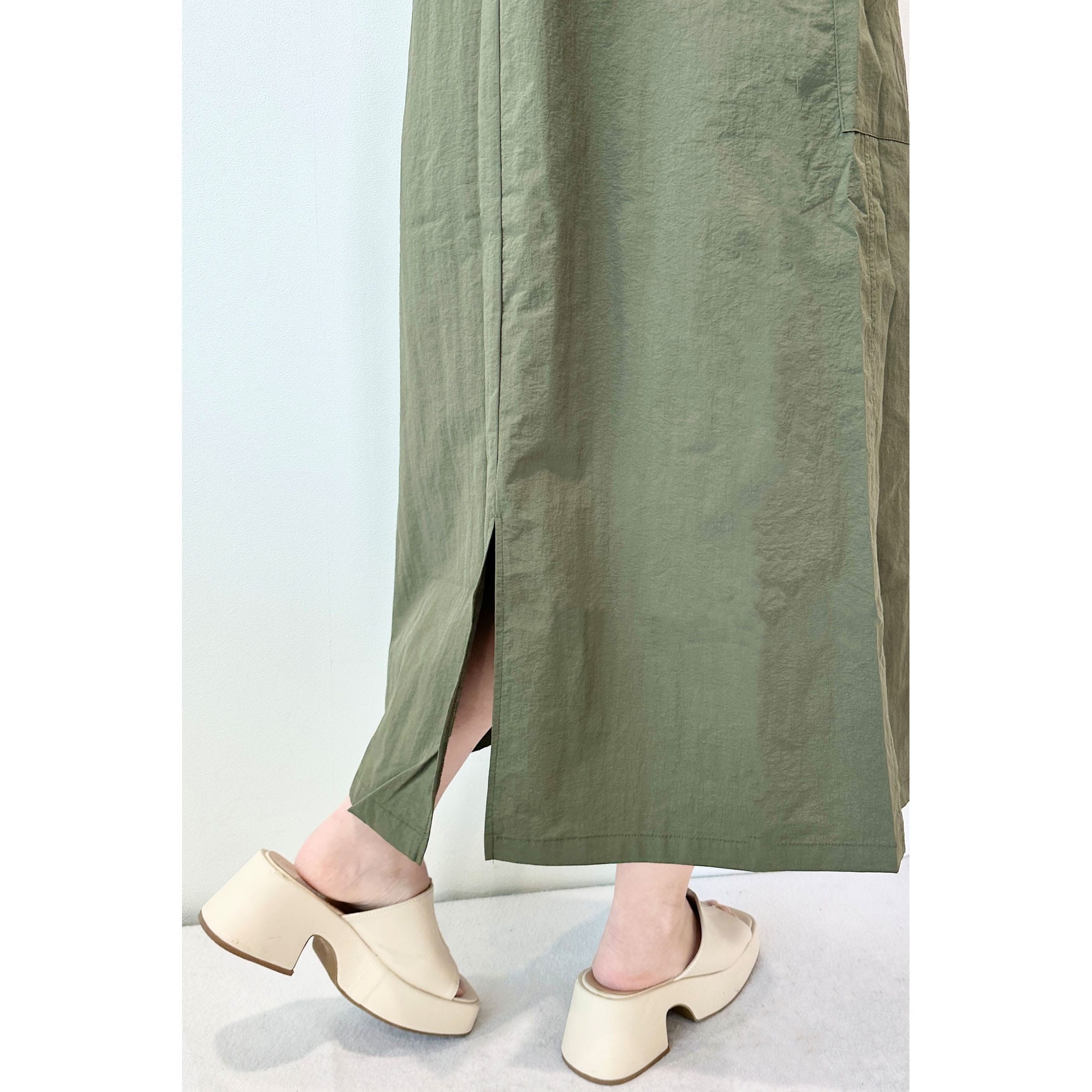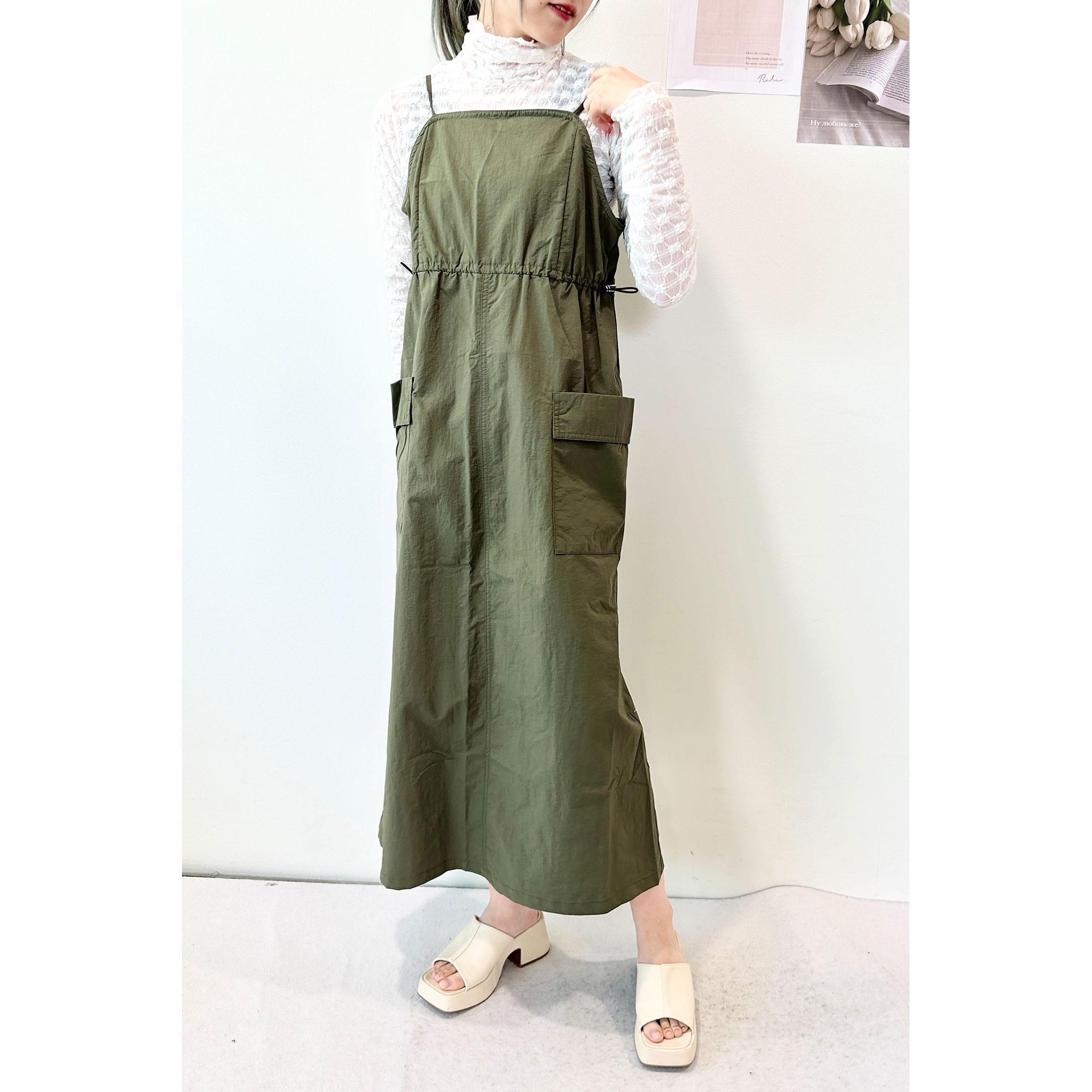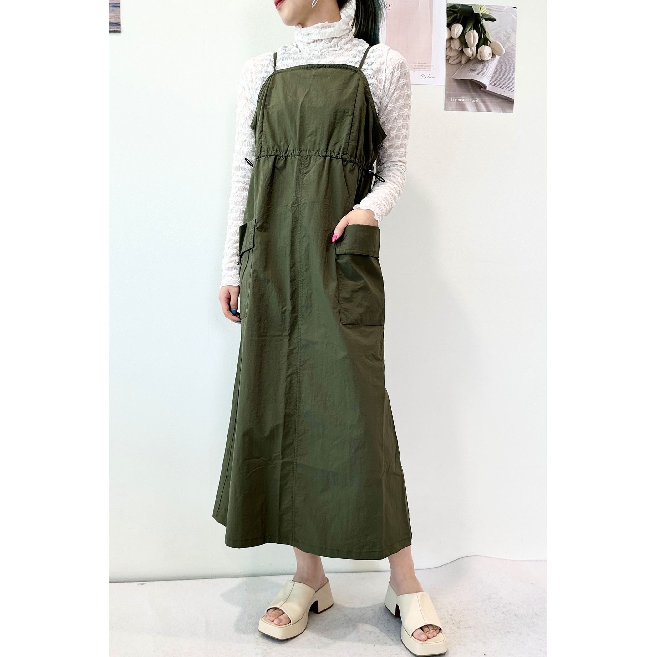 大きめのポケットとウエストのドロストがポイントのワークミリタリーなジャンスカ。裾巾を広めにデザインしていてバックにスリットを入れているので、歩くとふんわりと広がるシルエットが可愛いです。軽量なナイロン素材でバスト・ウエスト共のゆとりのあるサイズ感なので、体のラインを拾わず締め付けもなく着ていただけます。