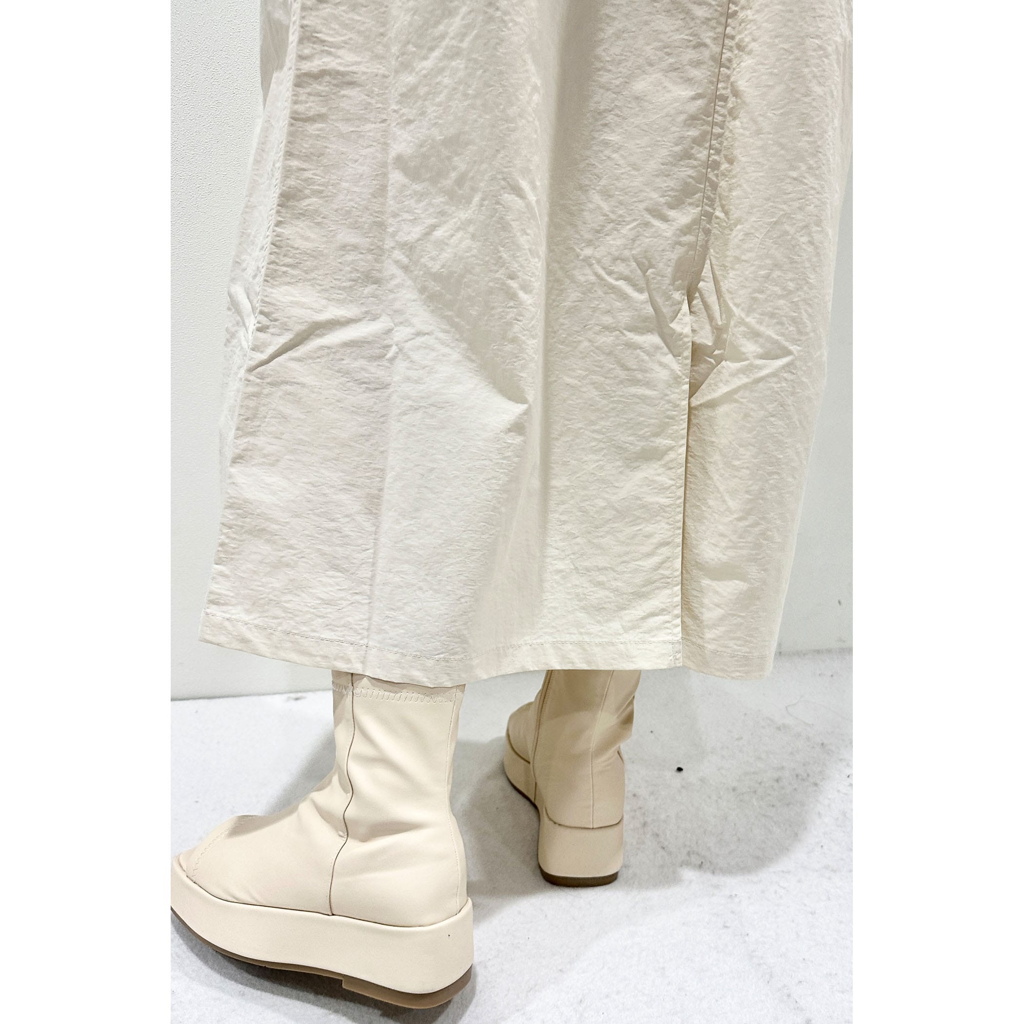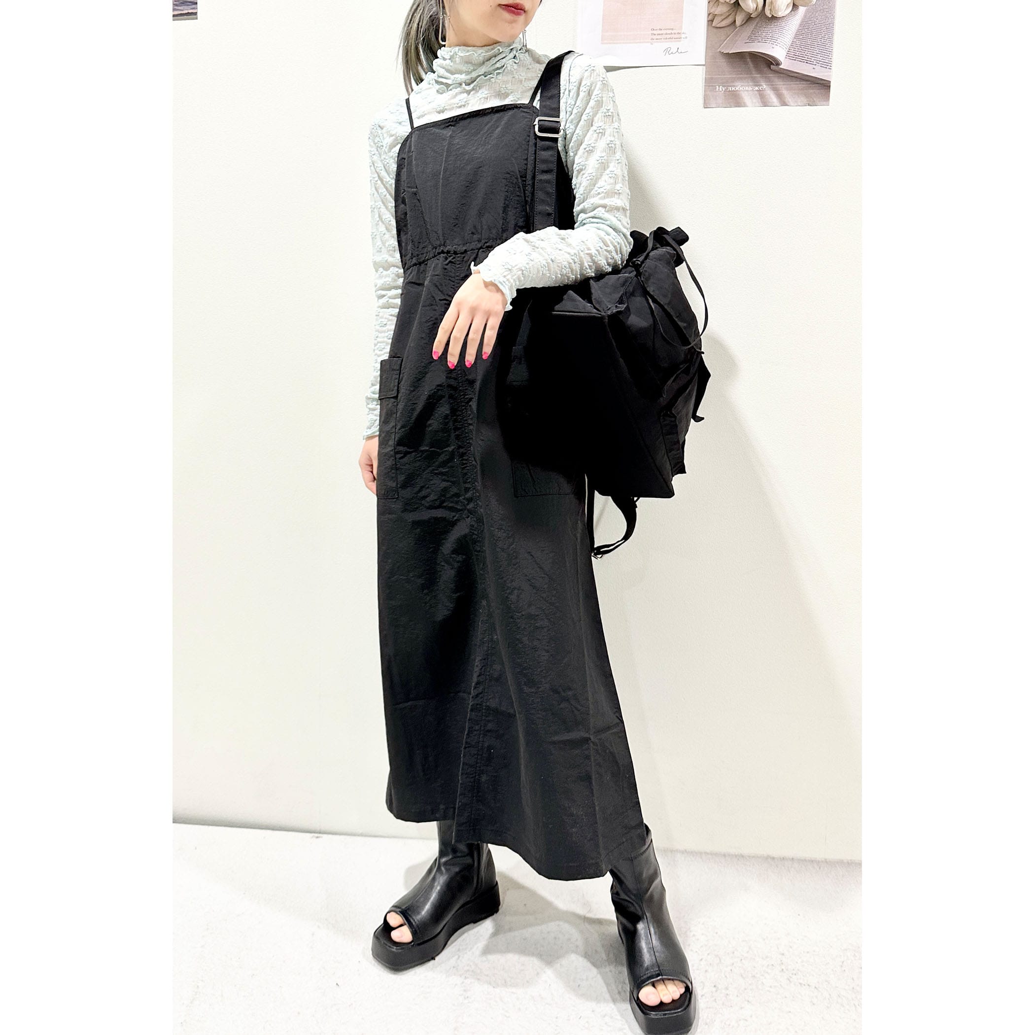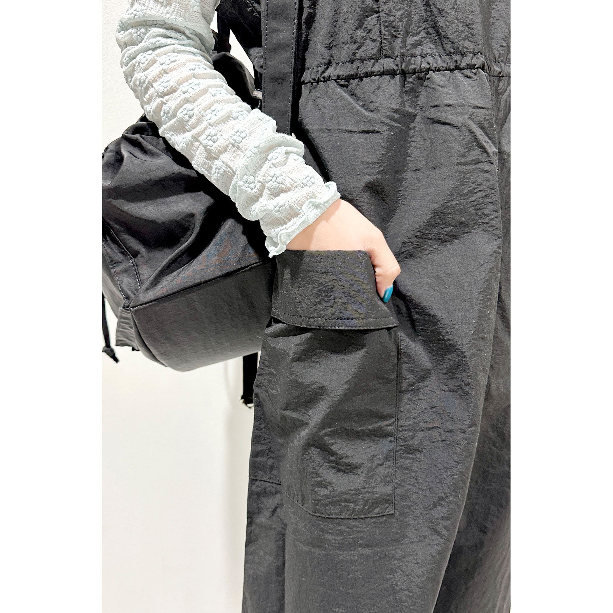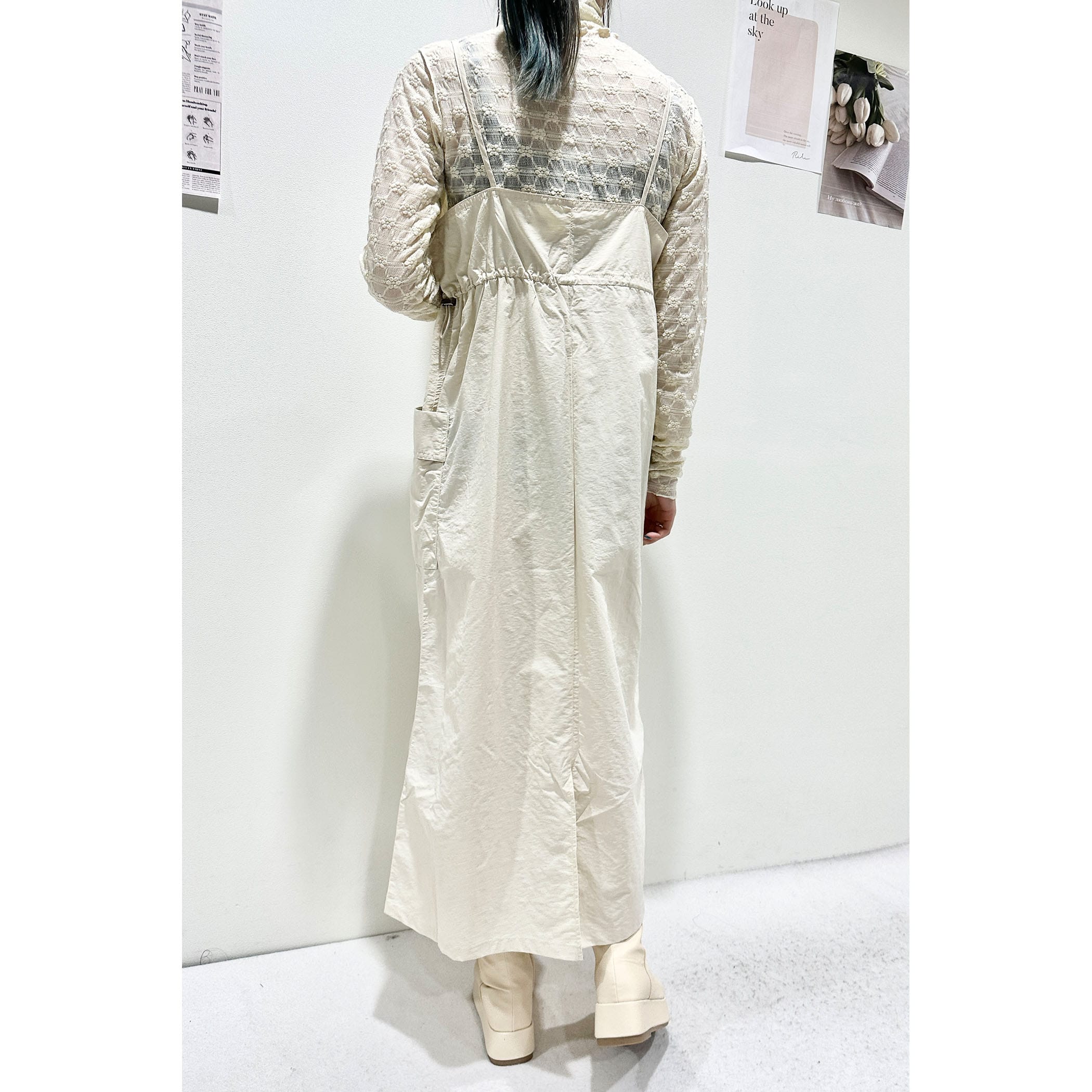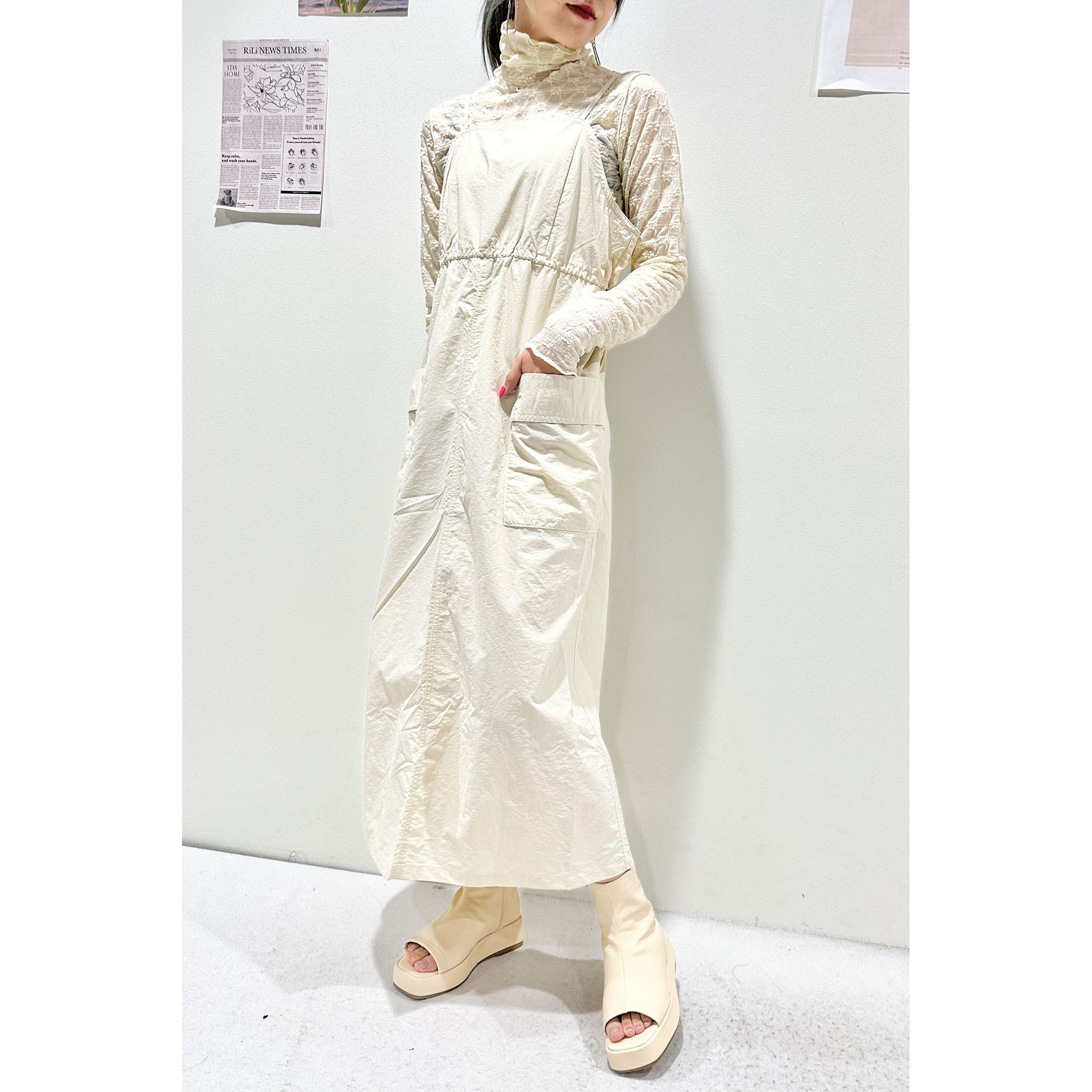 大きめのポケットとウエストのドロストがポイントのワークミリタリーなジャンスカ。裾巾を広めにデザインしていてバックにスリットを入れているので、歩くとふんわりと広がるシルエットが可愛いです。軽量なナイロン素材でバスト・ウエスト共のゆとりのあるサイズ感なので、体のラインを拾わず締め付けもなく着ていただけます。