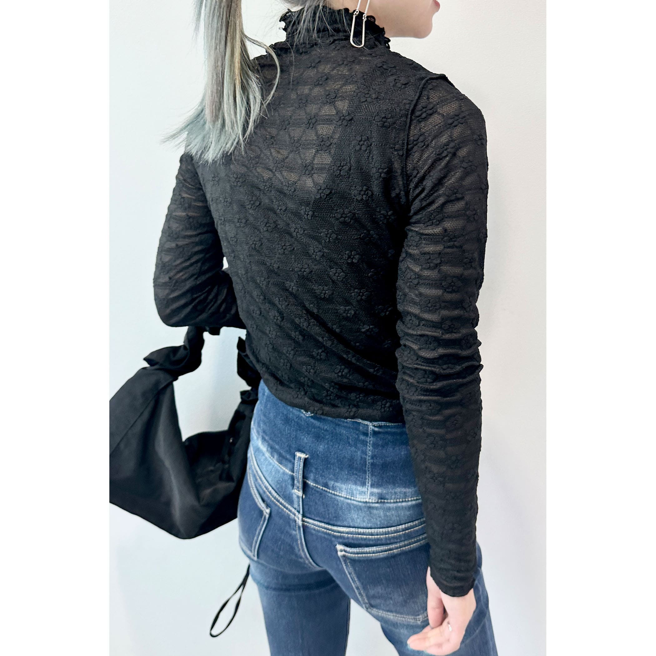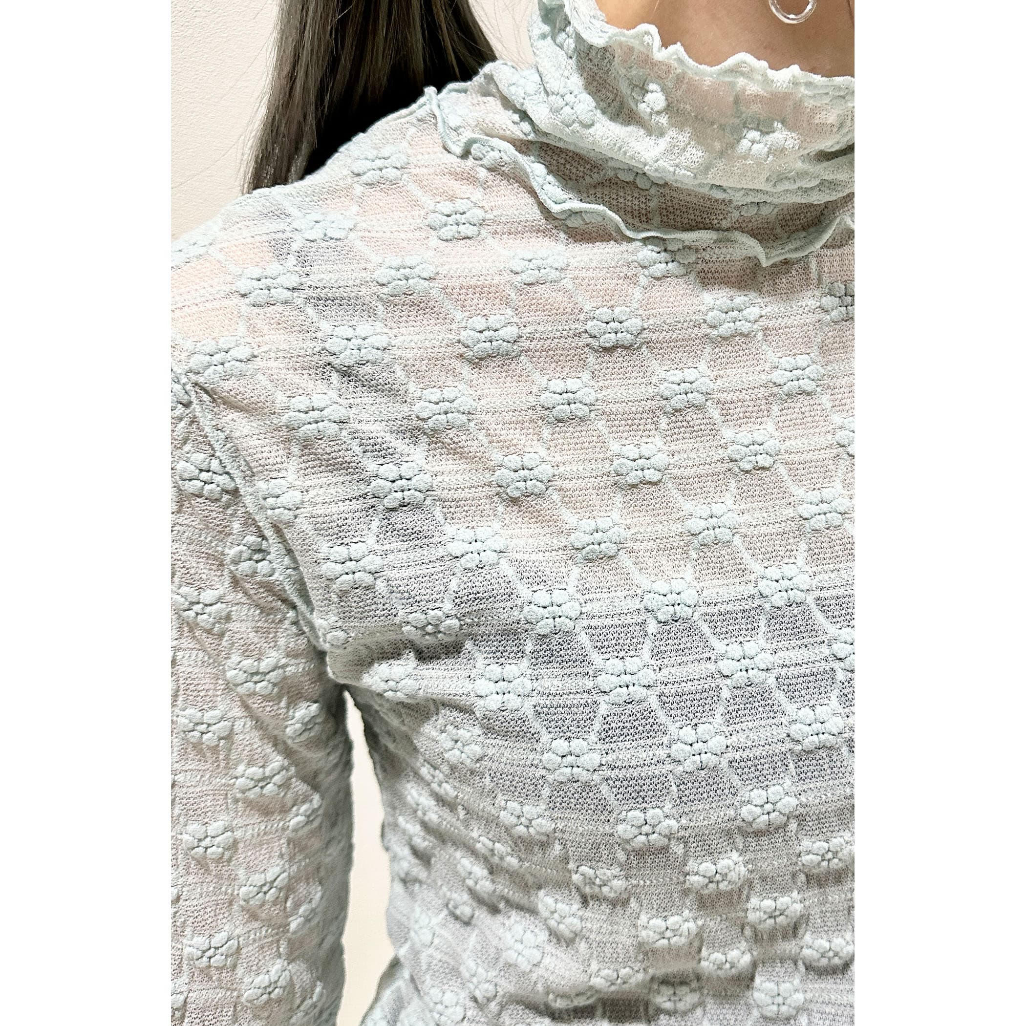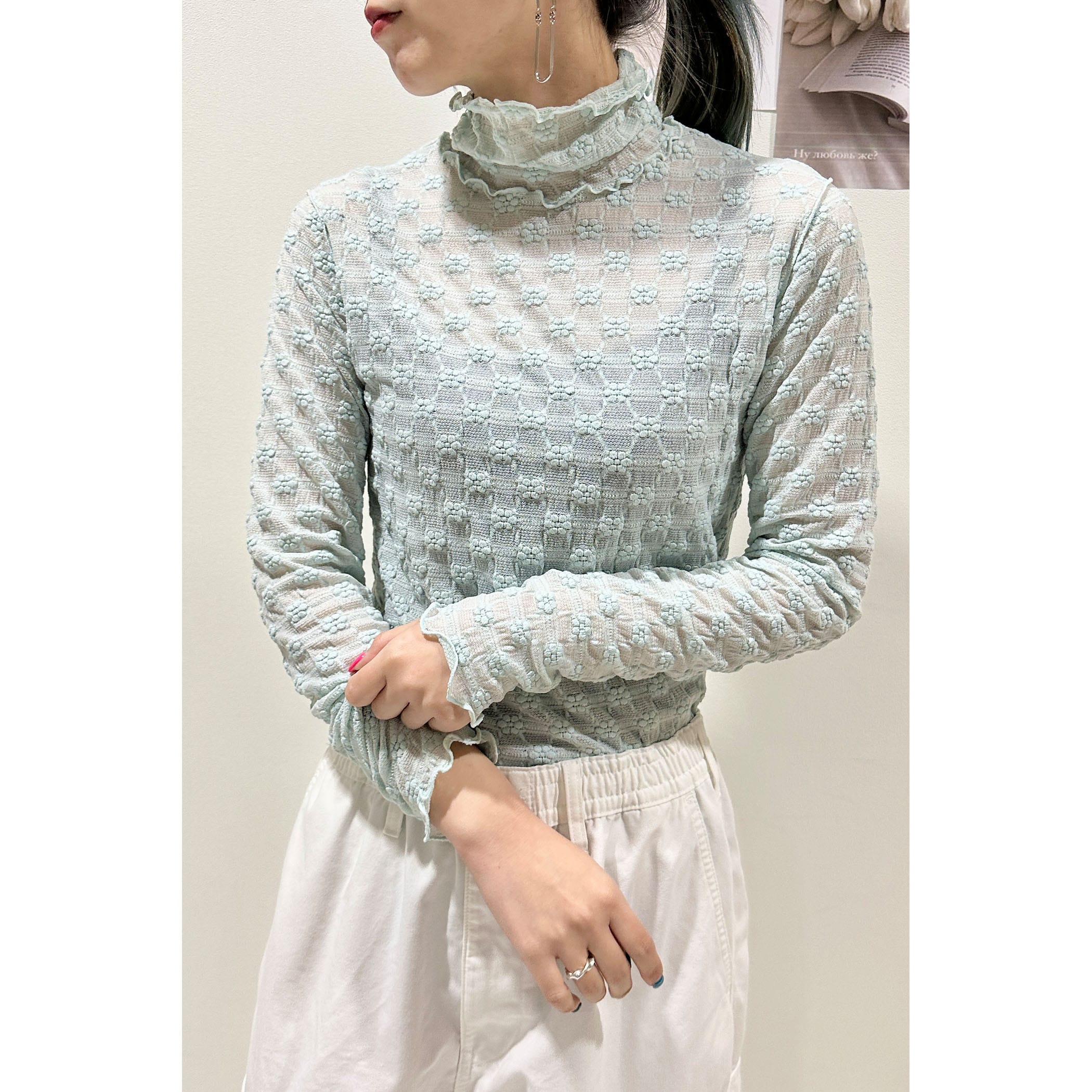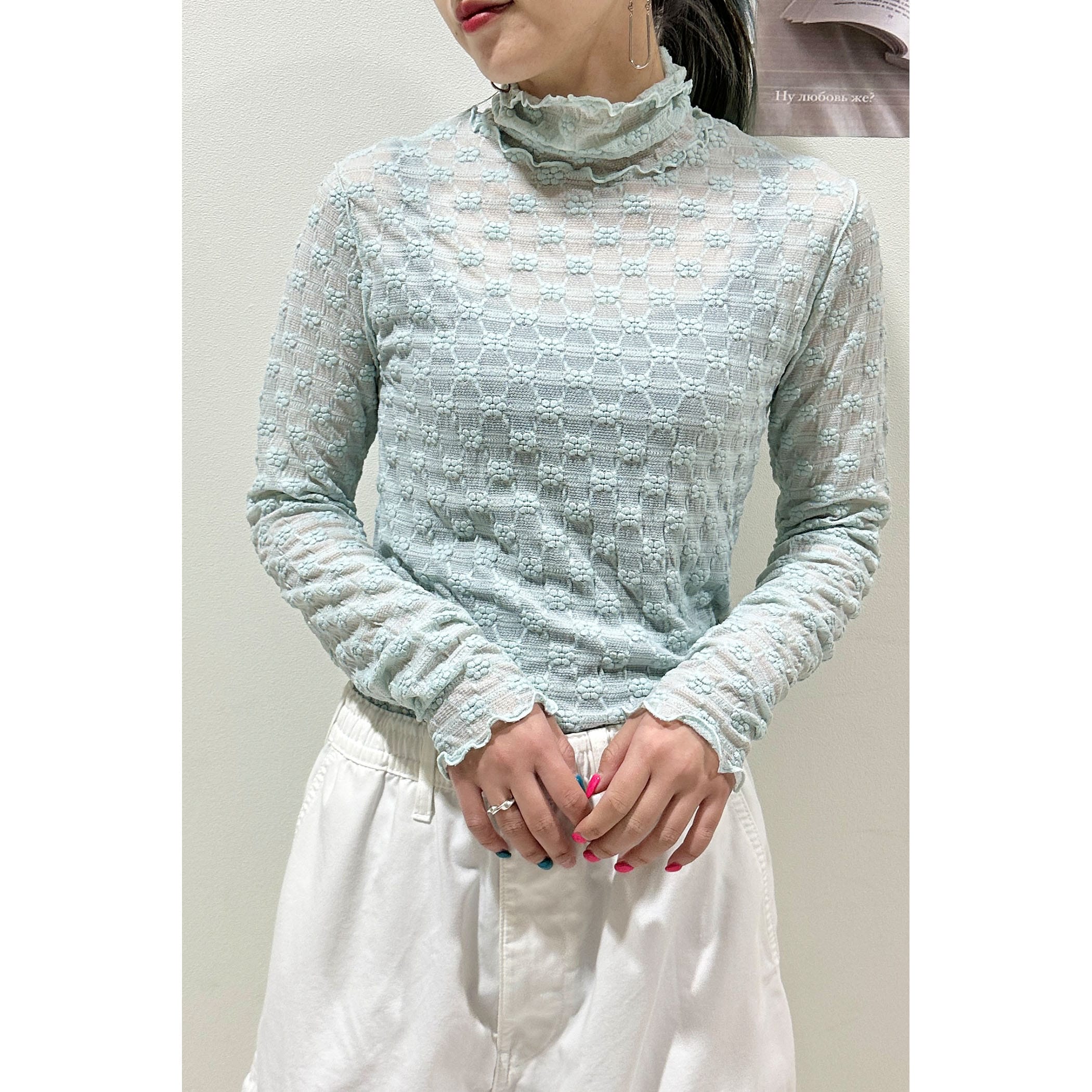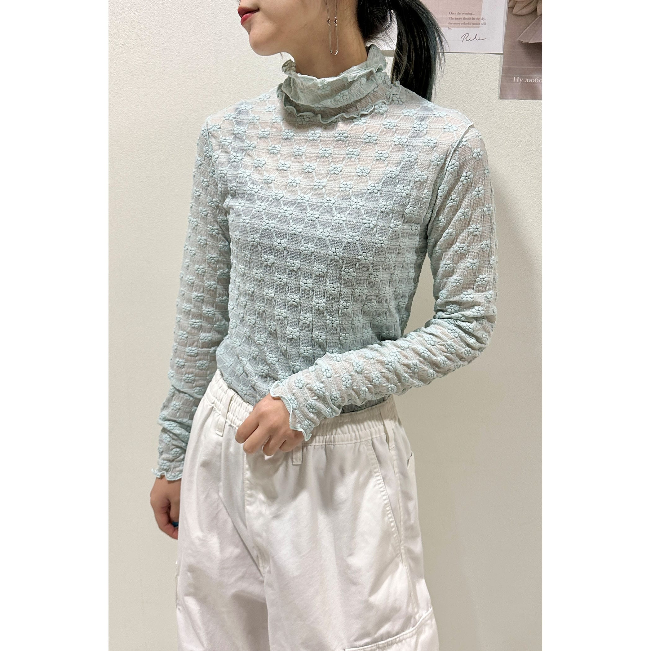 上品な透け感とフェミニンは花柄が可愛いハイネックメロートップス。一枚での着用はもちろん、ワンピースやシャツ・トレーナーと合わせたレイヤードスタイルもオススメです。形はシンプルなのでボトムを選ばすコーディネートでき、着るだけで華やかな印象を演出してくれるトレンドアイテムです。
