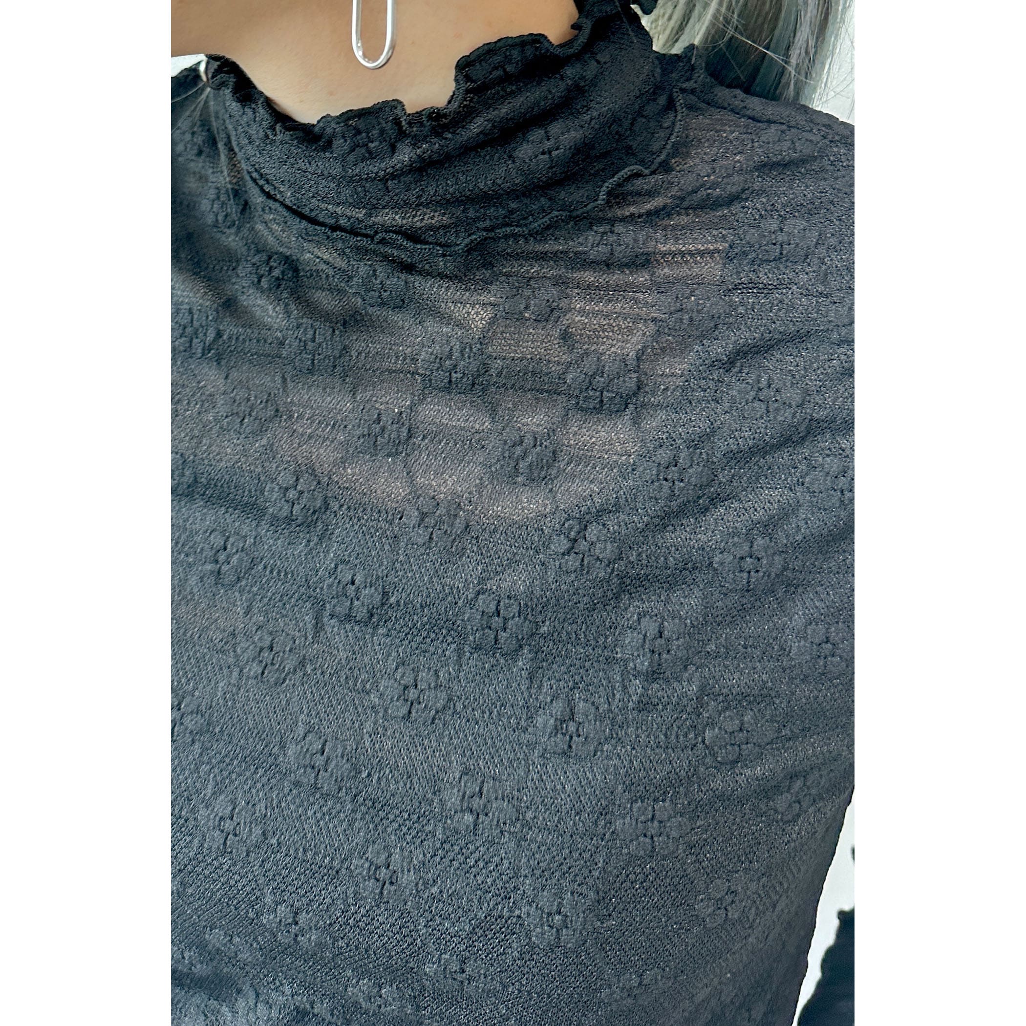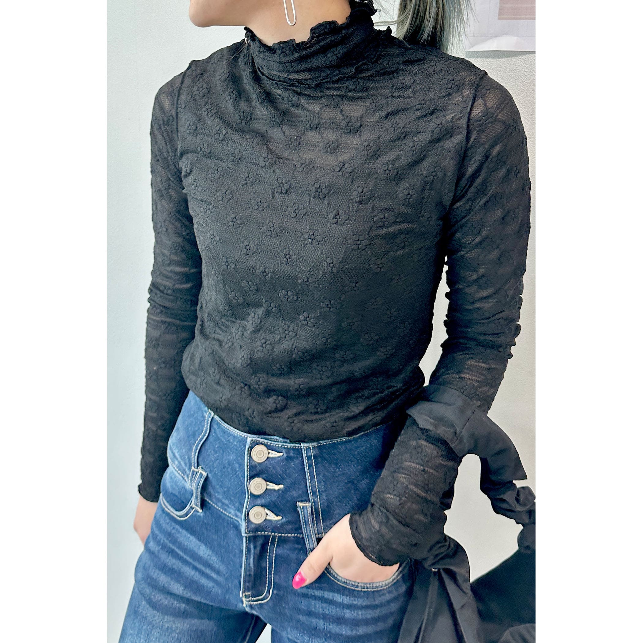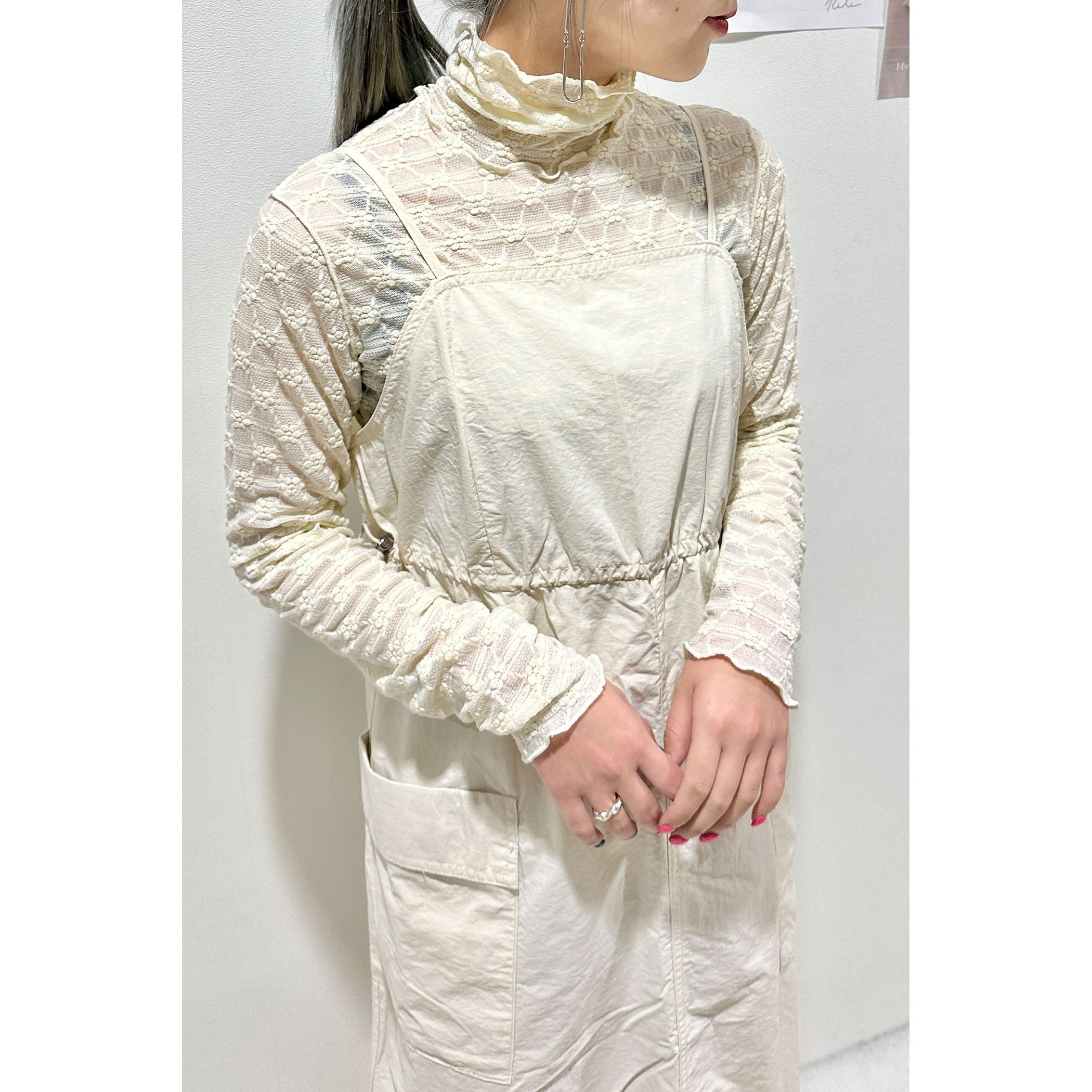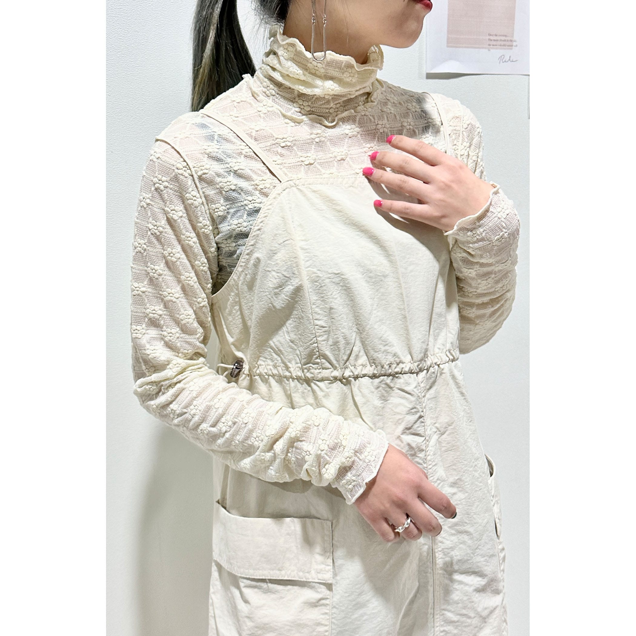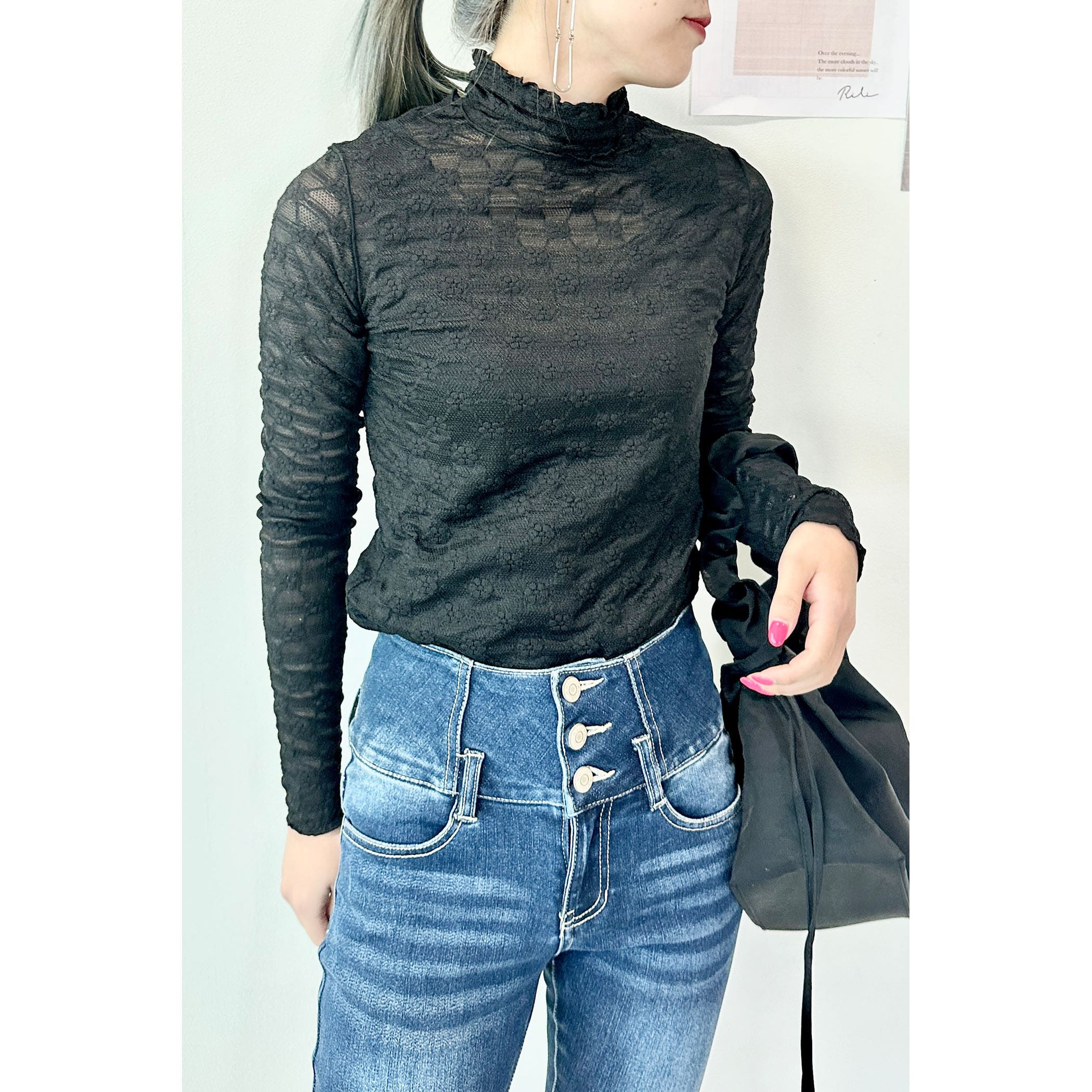 上品な透け感とフェミニンは花柄が可愛いハイネックメロートップス。一枚での着用はもちろん、ワンピースやシャツ・トレーナーと合わせたレイヤードスタイルもオススメです。形はシンプルなのでボトムを選ばすコーディネートでき、着るだけで華やかな印象を演出してくれるトレンドアイテムです。