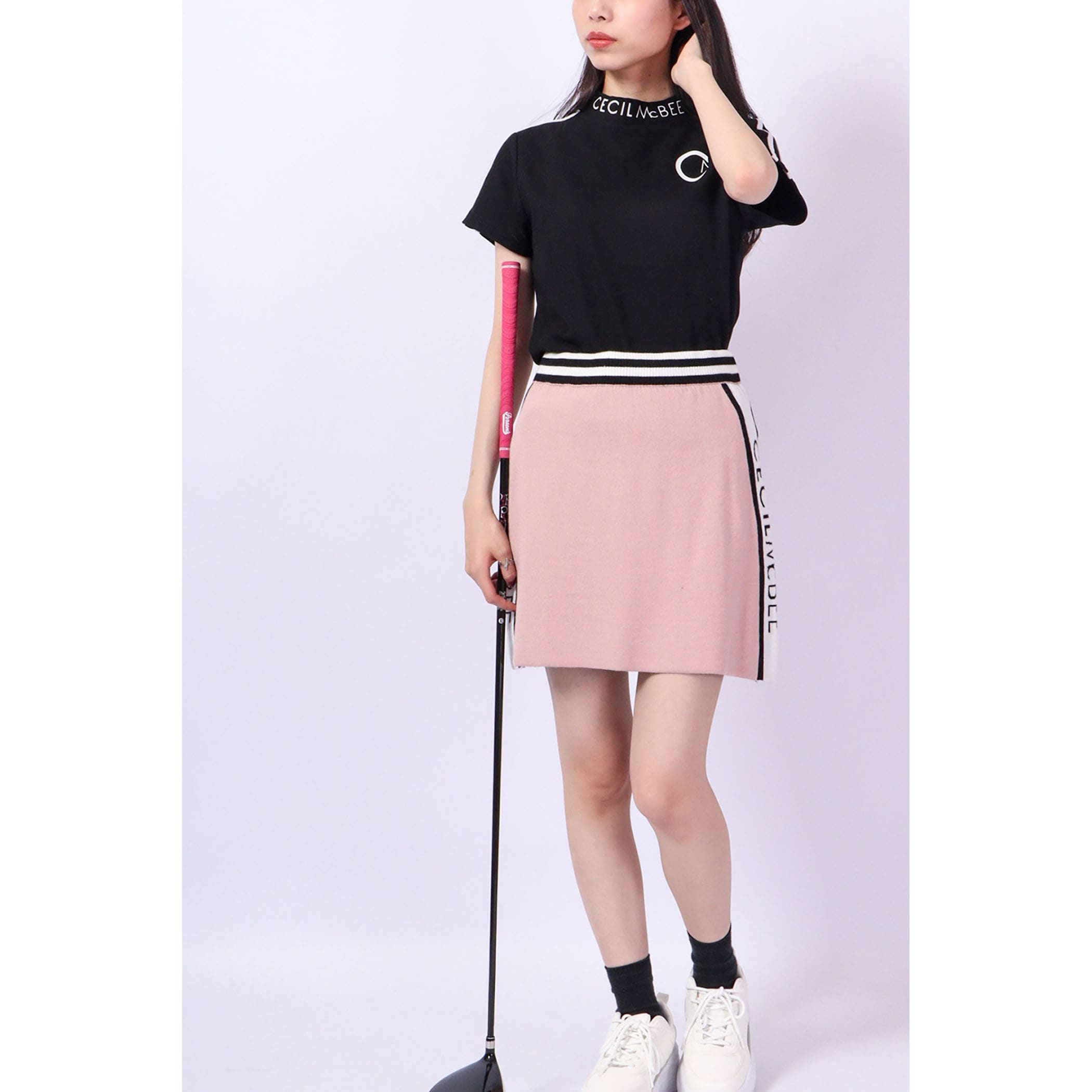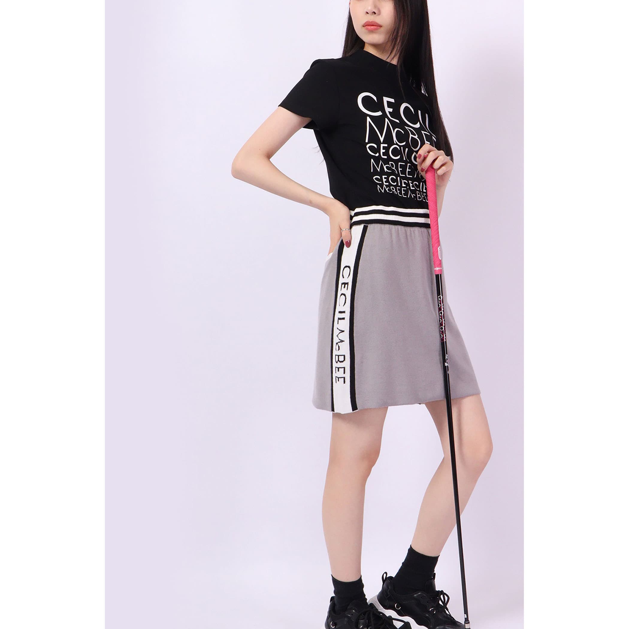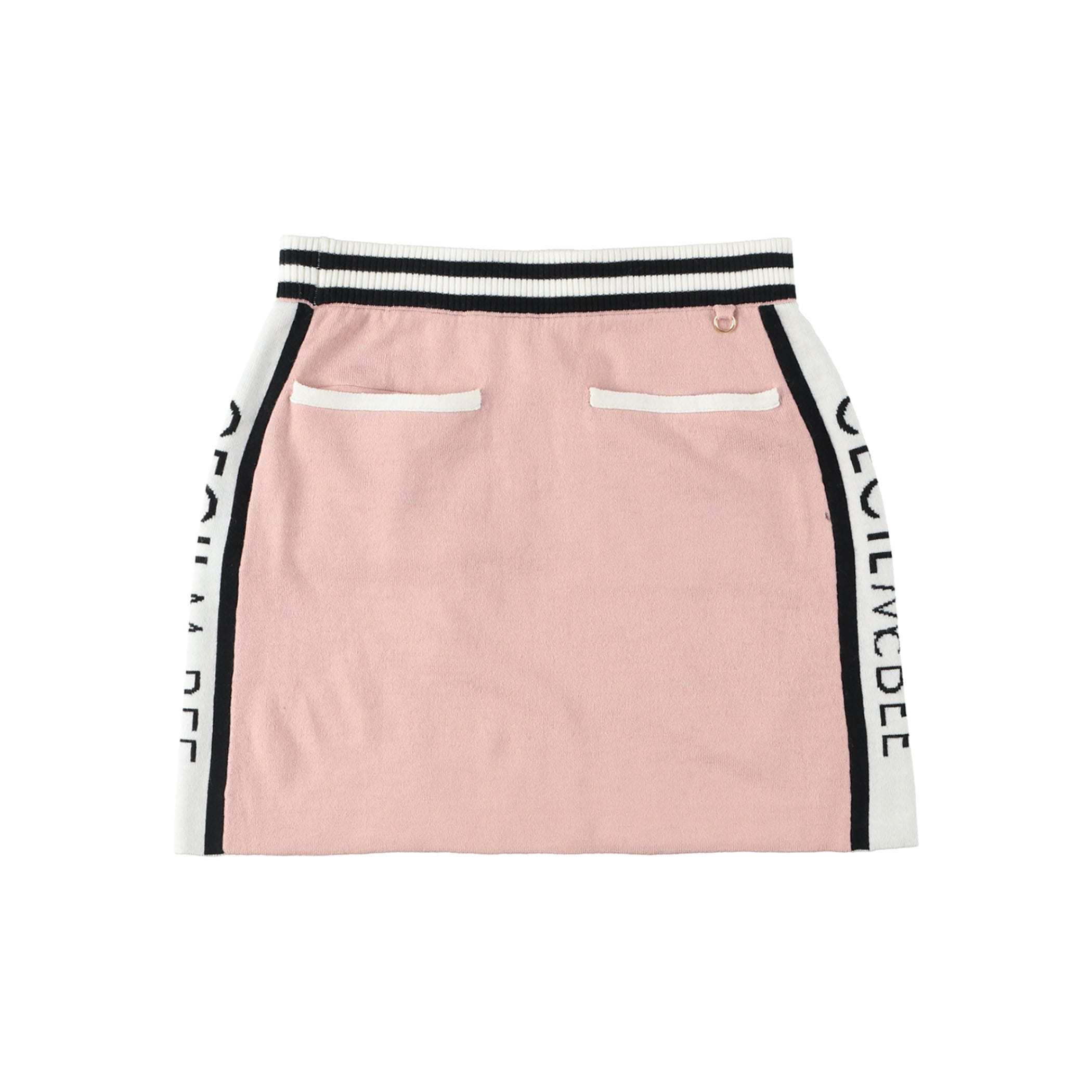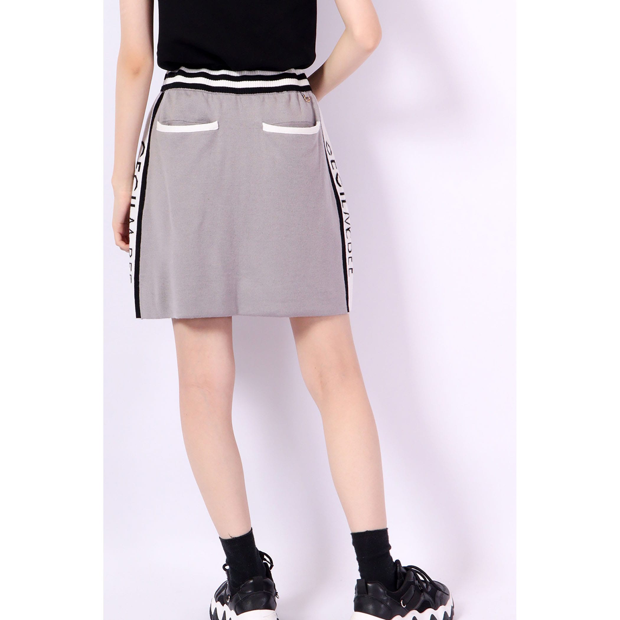 ラインロゴニットスカート。スポーティーなスカート。ニットなの涼しい時期のでゴルフでの動きやすさやカジュアル着としても女性らしいシルエットになっています。3012010、3012011とセットアップ可能です。