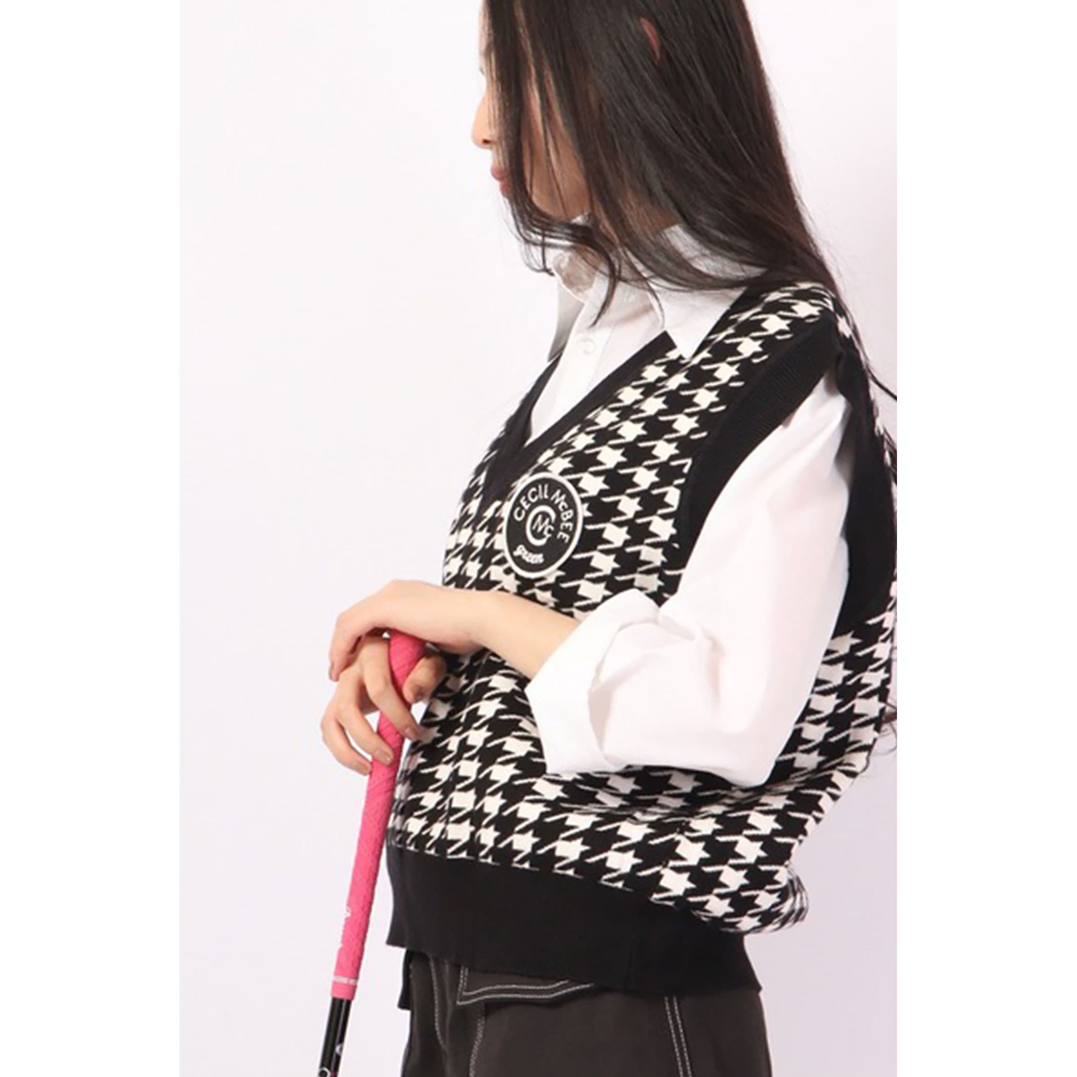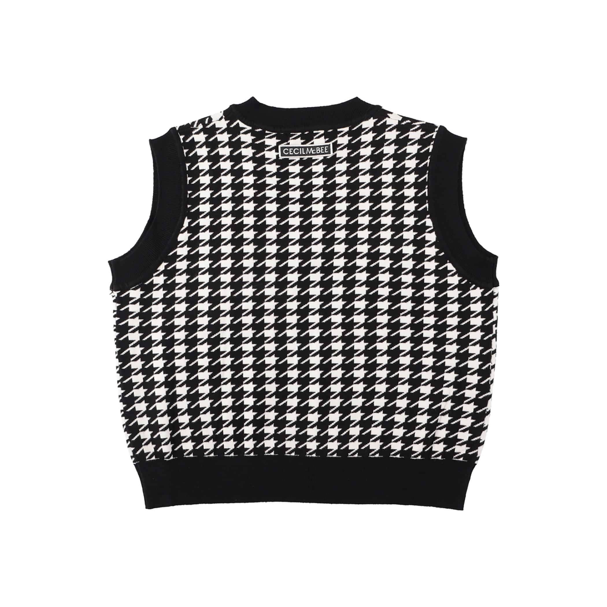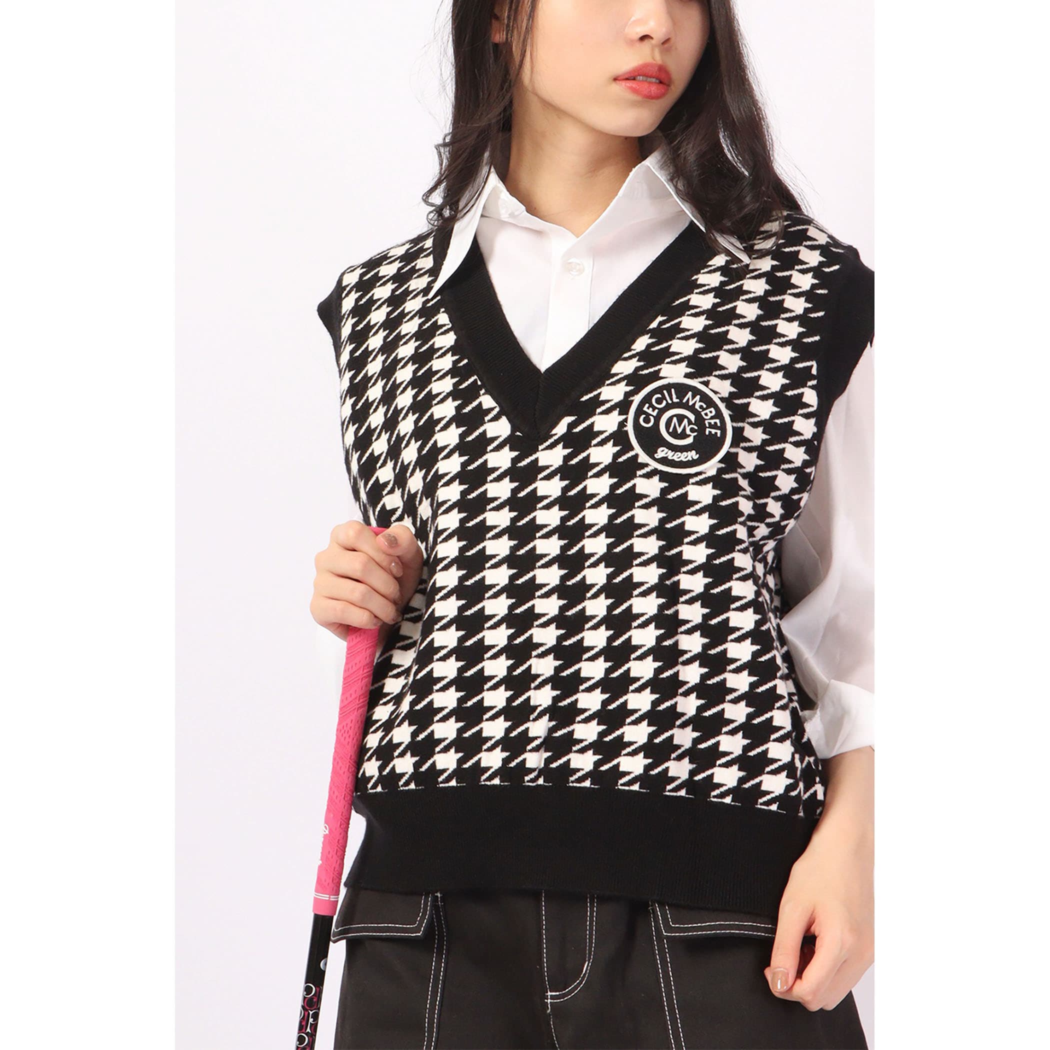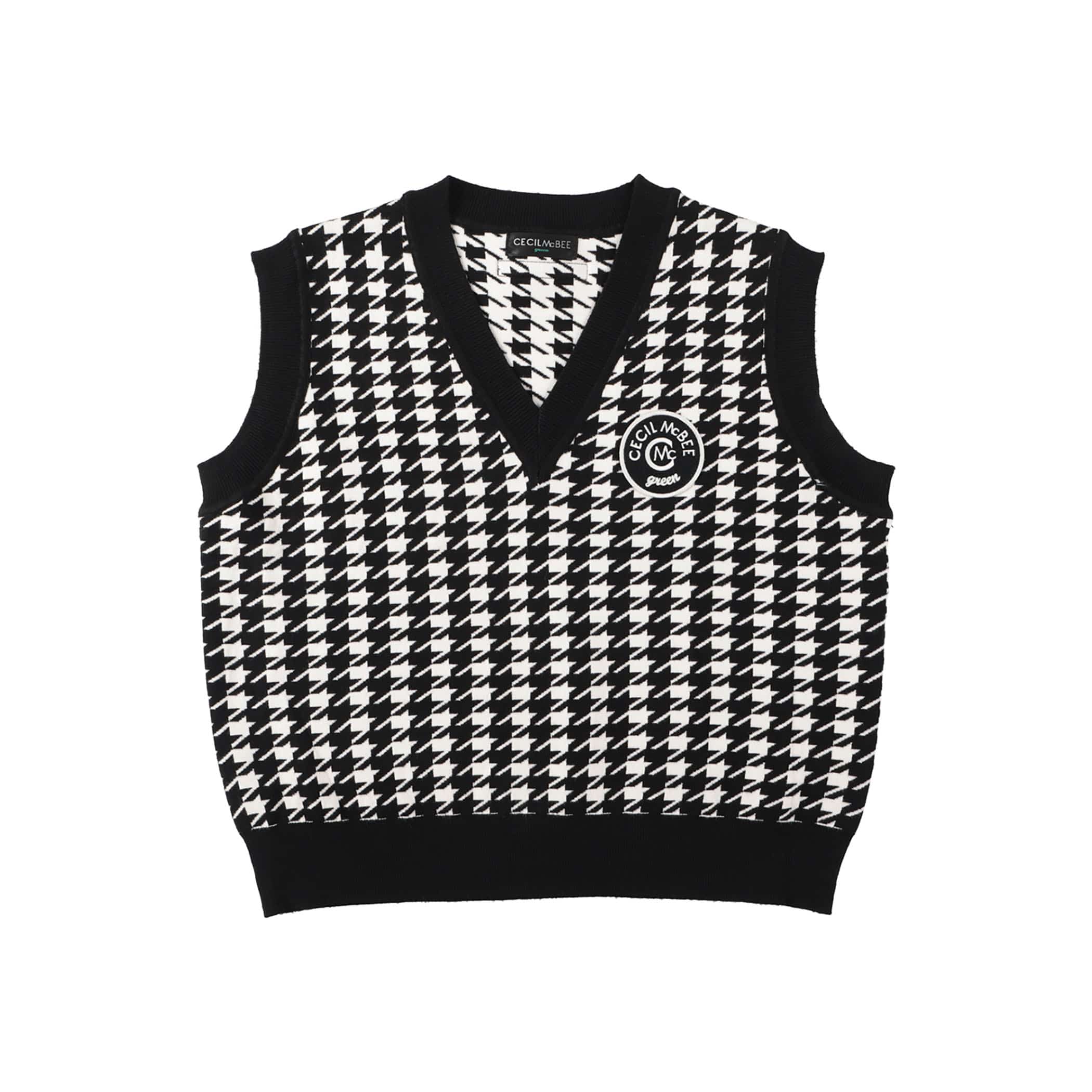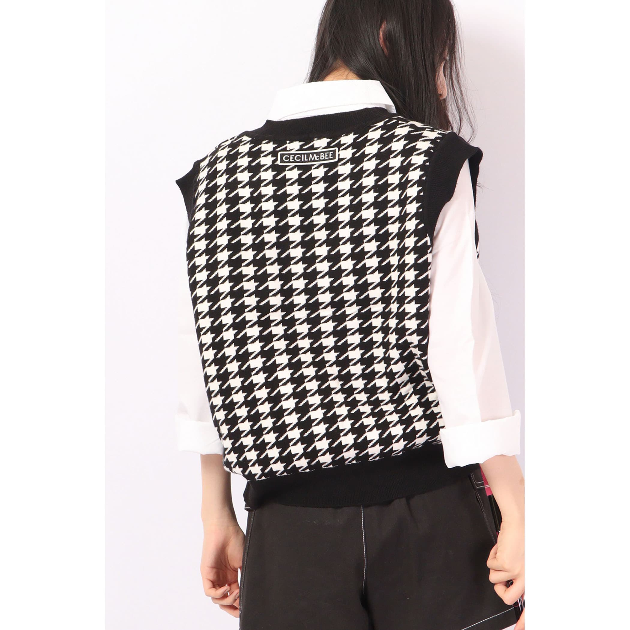 左胸と背中首下にワッペンが付いた千鳥柄ニットベスト。ゆったりシルエットのベストなので、普段使いにもオススメです。