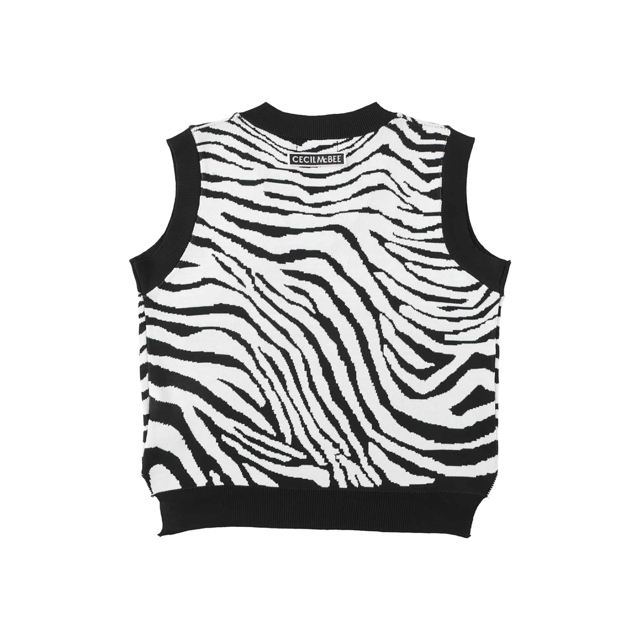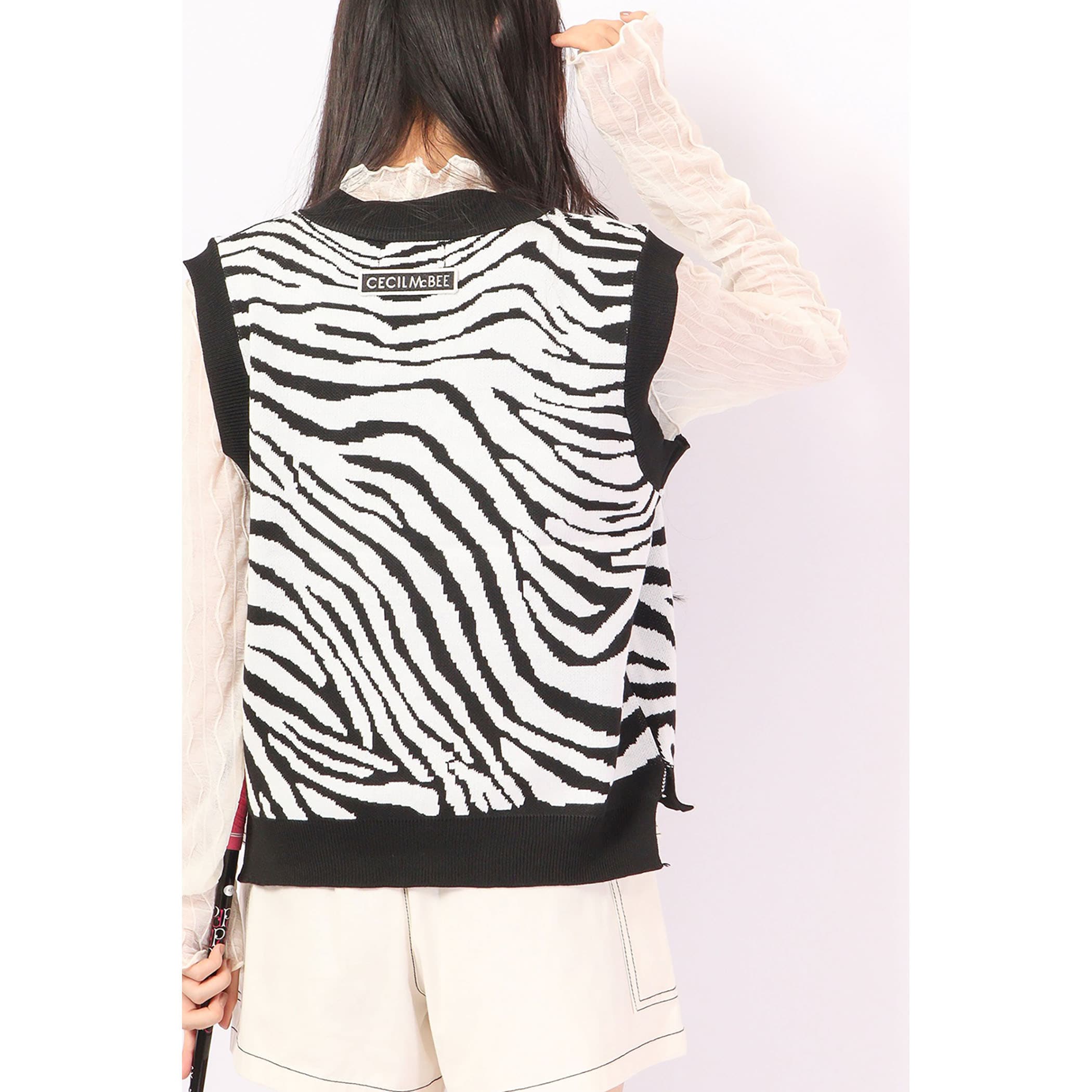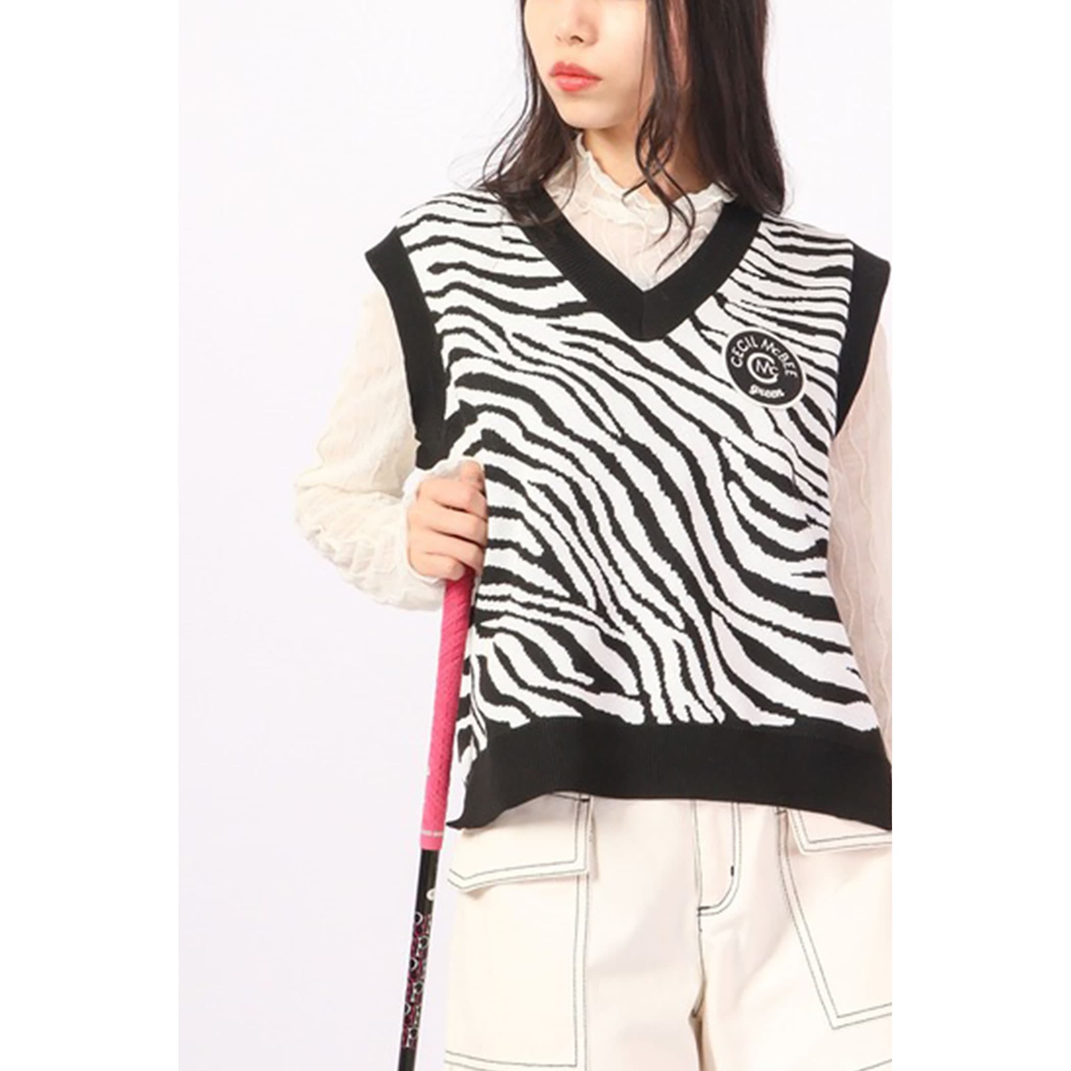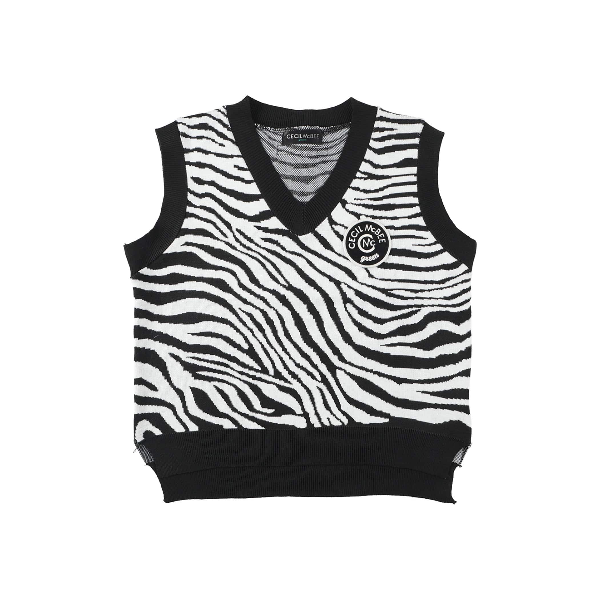 左胸と背中首下にワッペンが付いたゼブラ柄ニットベスト。ゆったりシルエットのベストなので、普段使いにもオススメです。