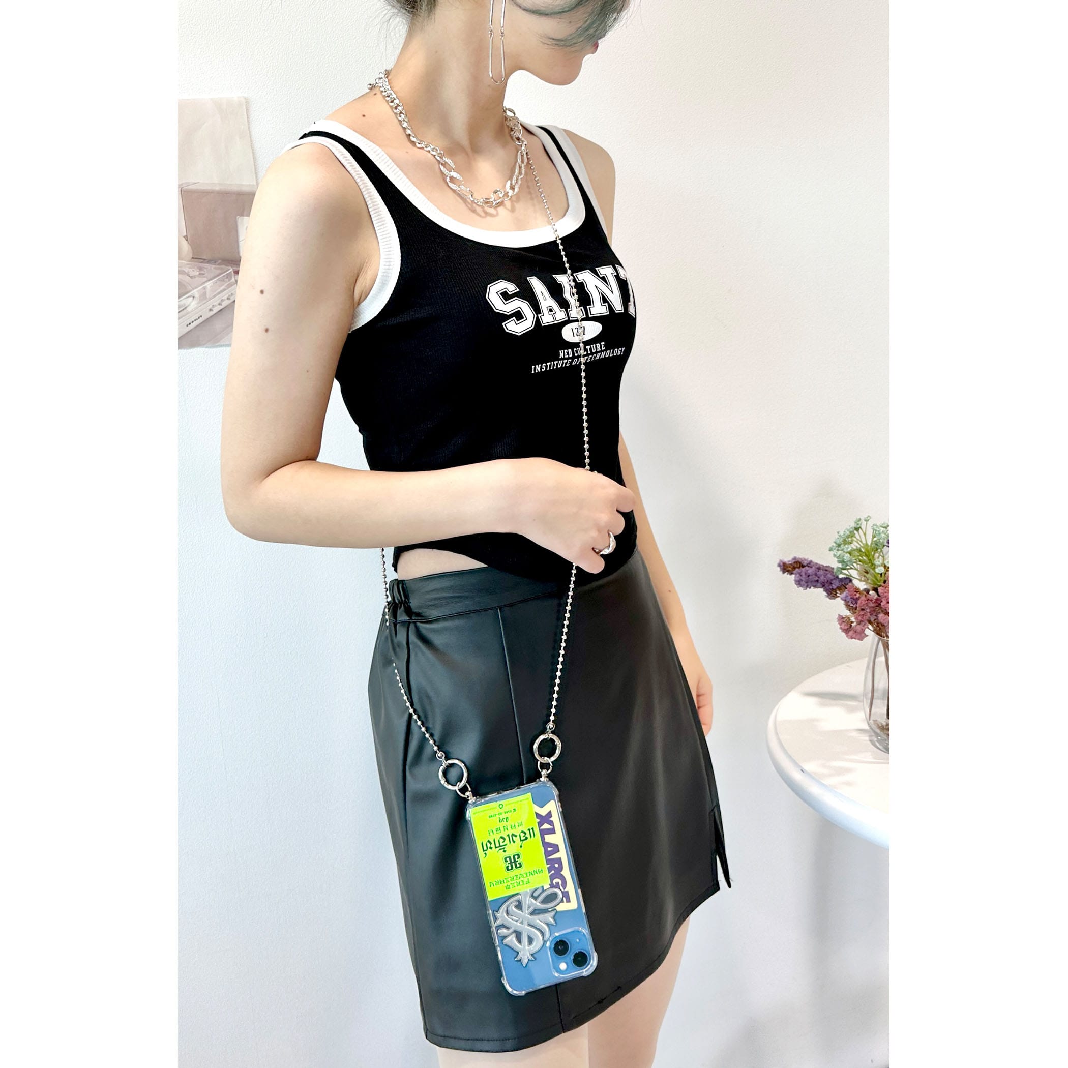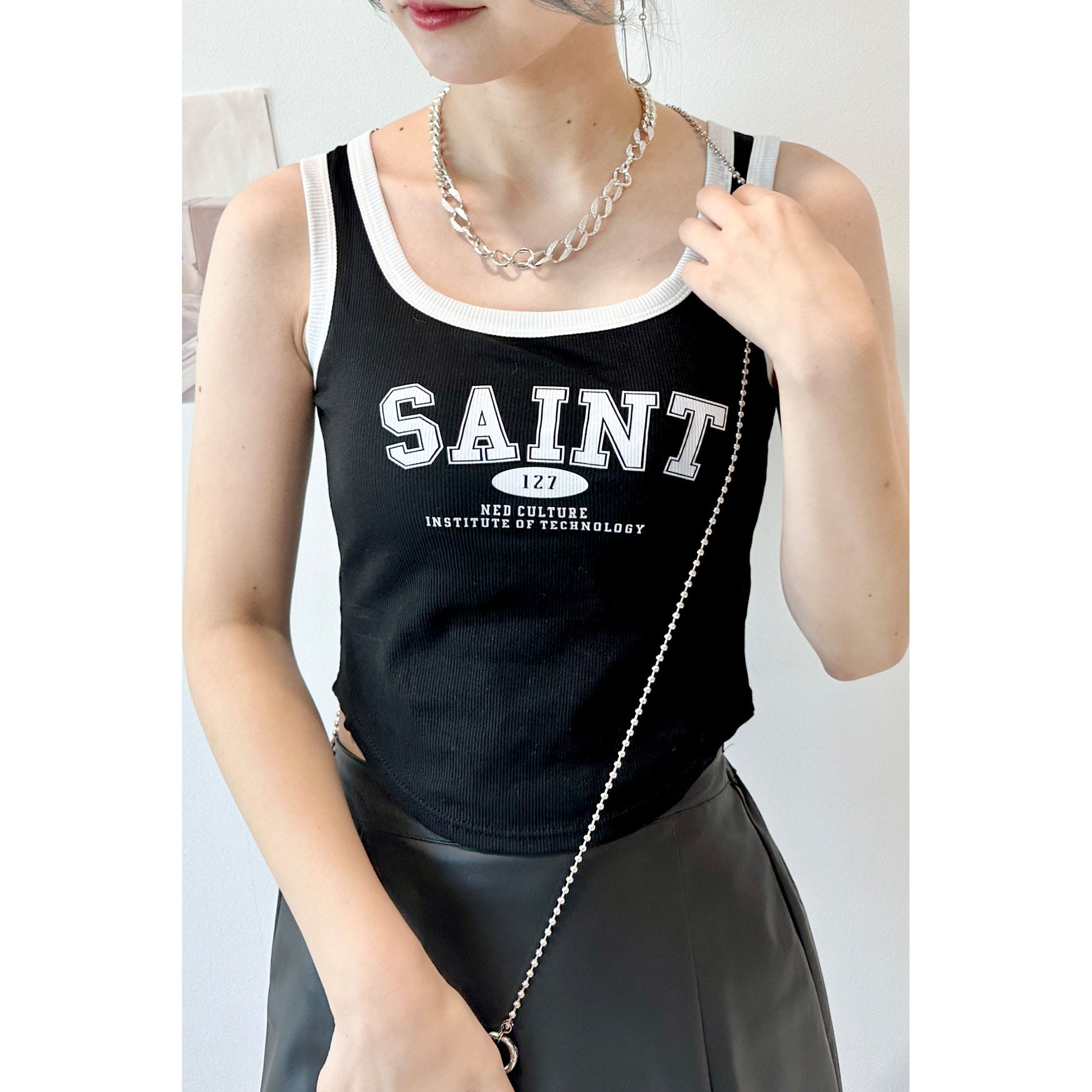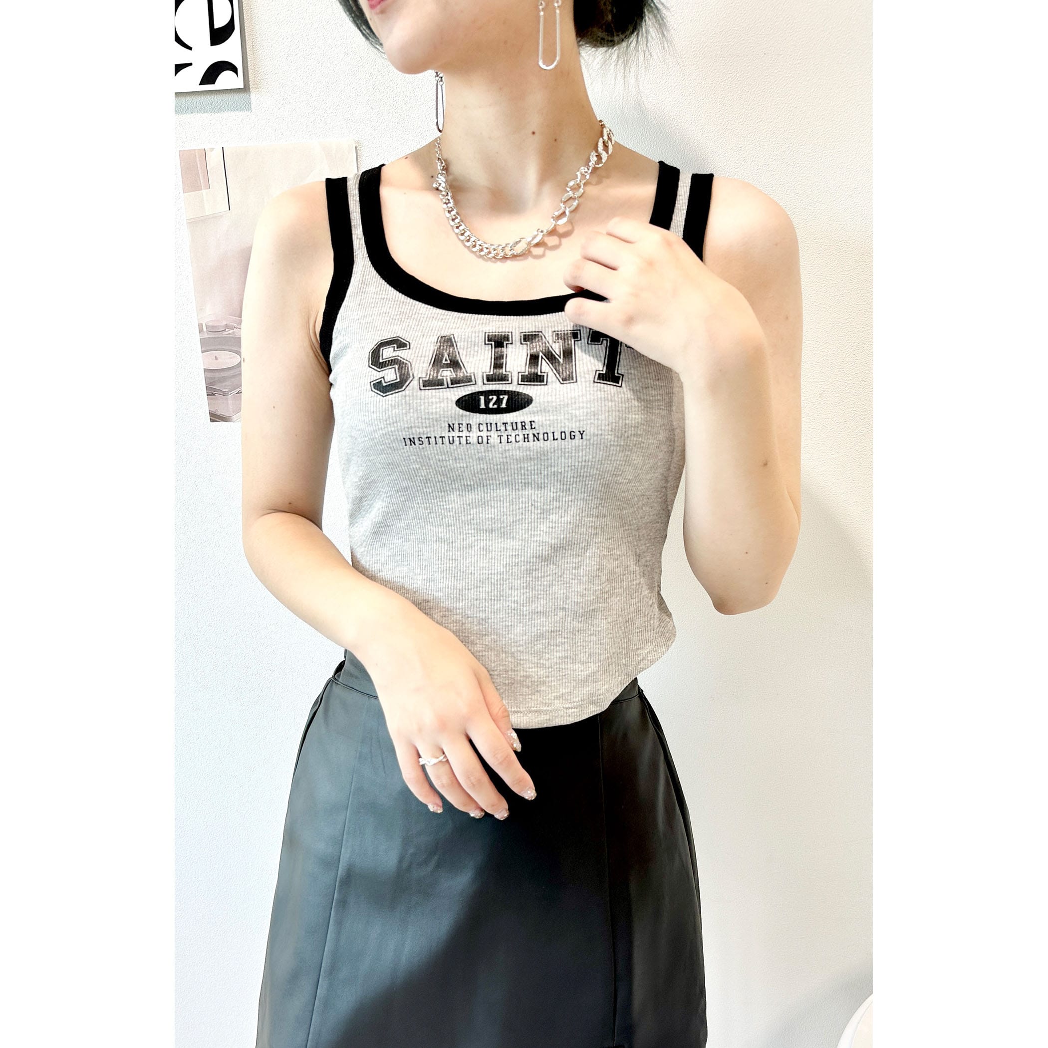 胸元のロゴが目を惹くタンクです。Uネックでお顔周りをすっきり見せてくれます。