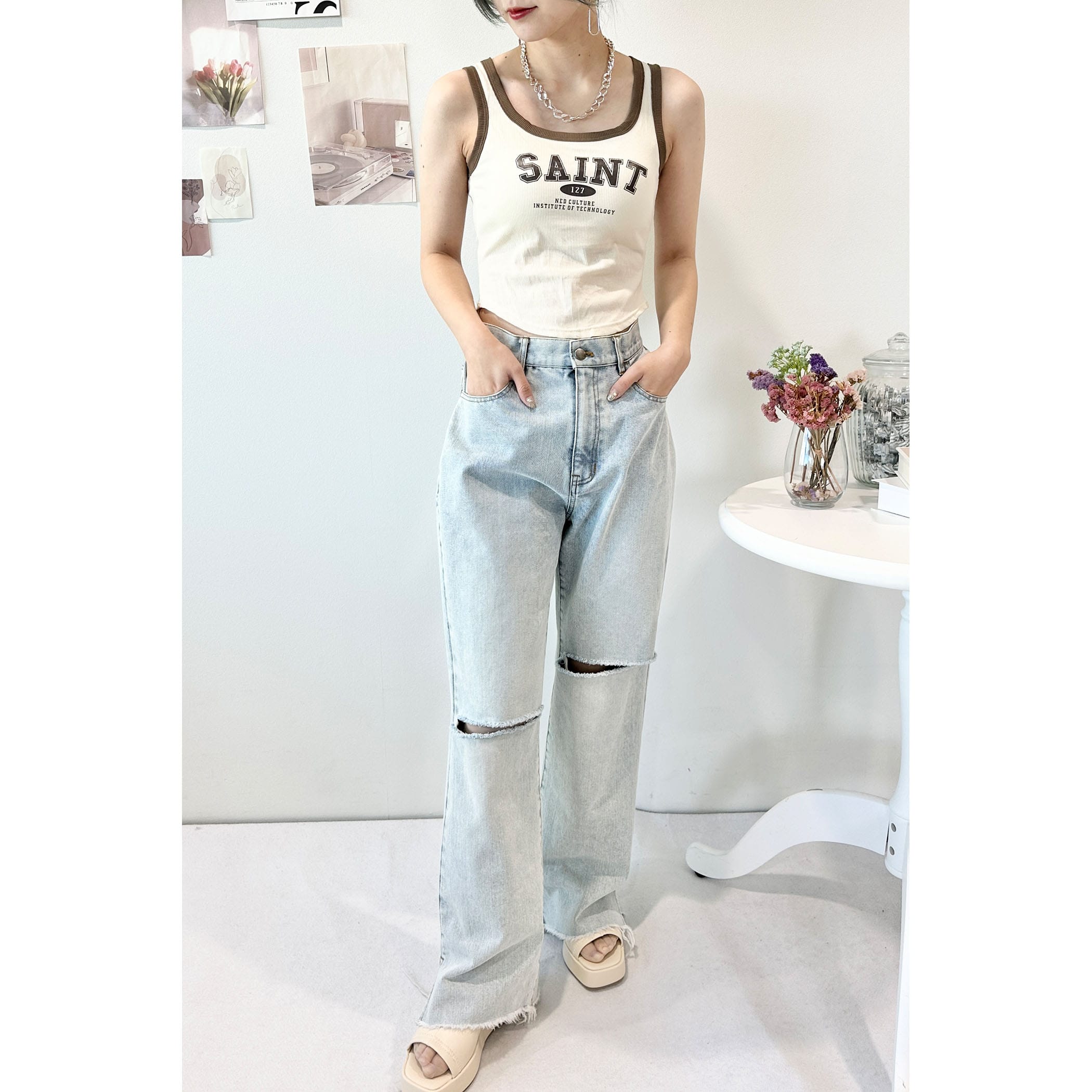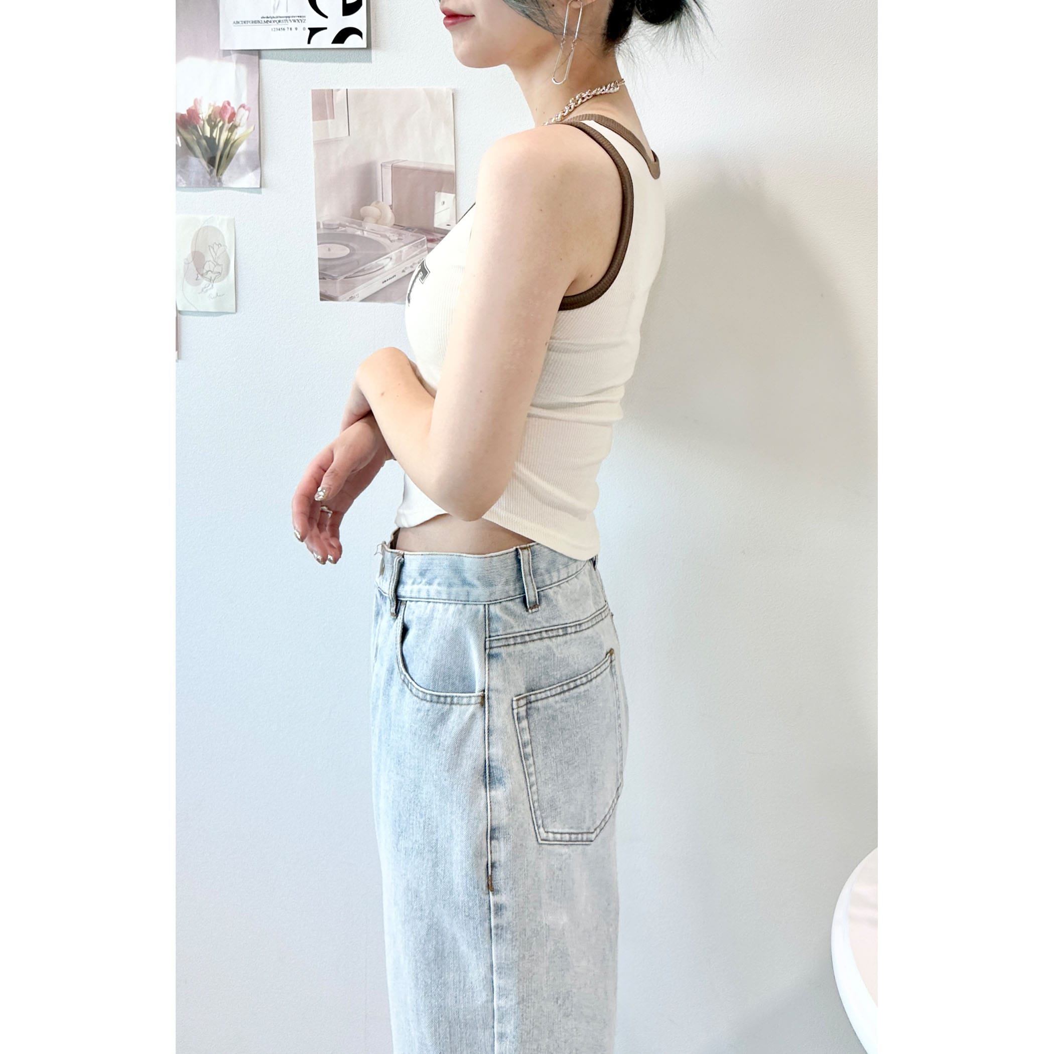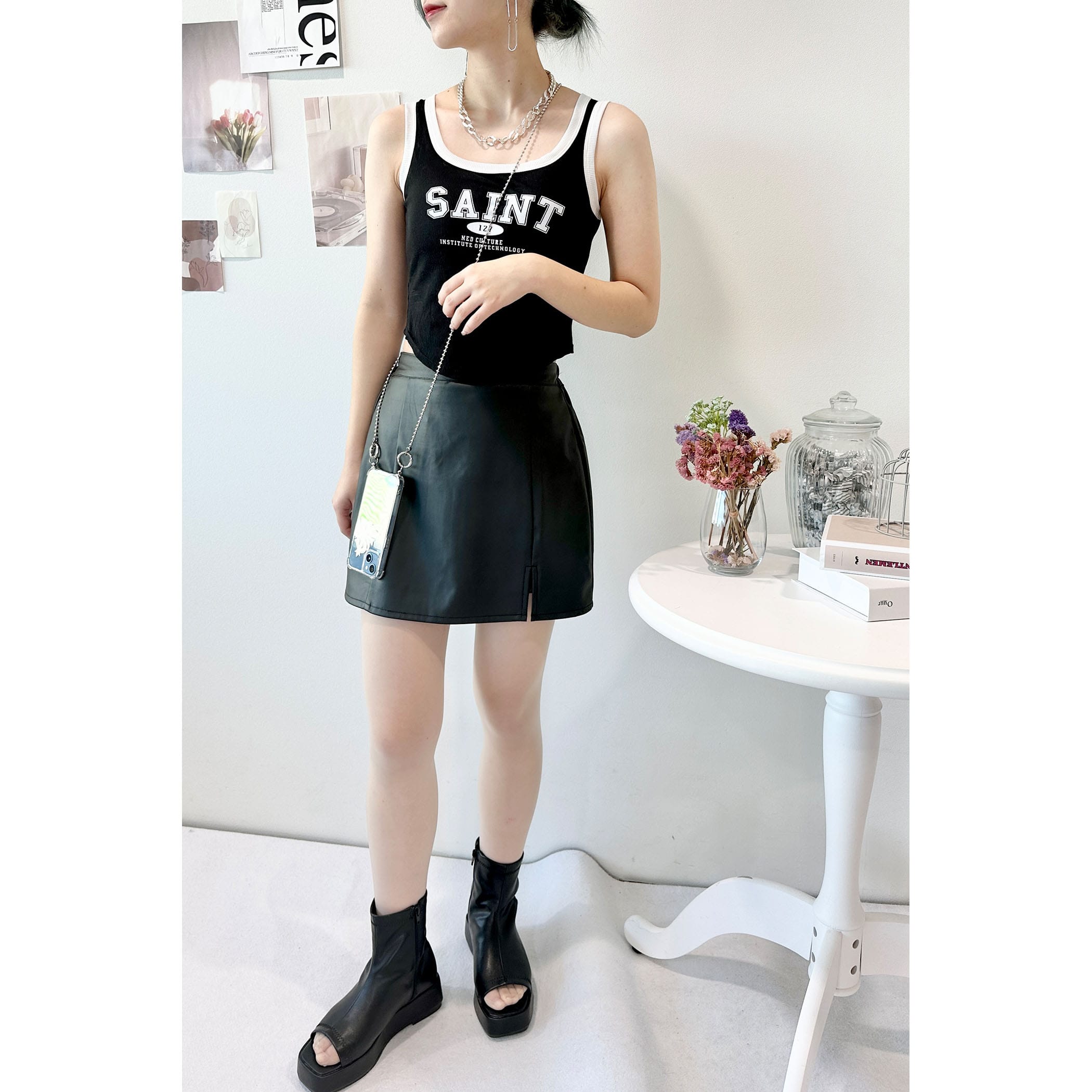 胸元のロゴが目を惹くタンクです。Uネックでお顔周りをすっきり見せてくれます。