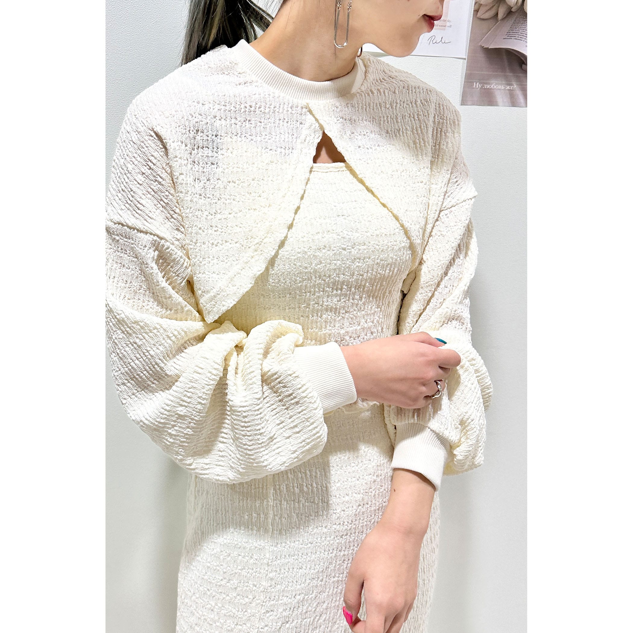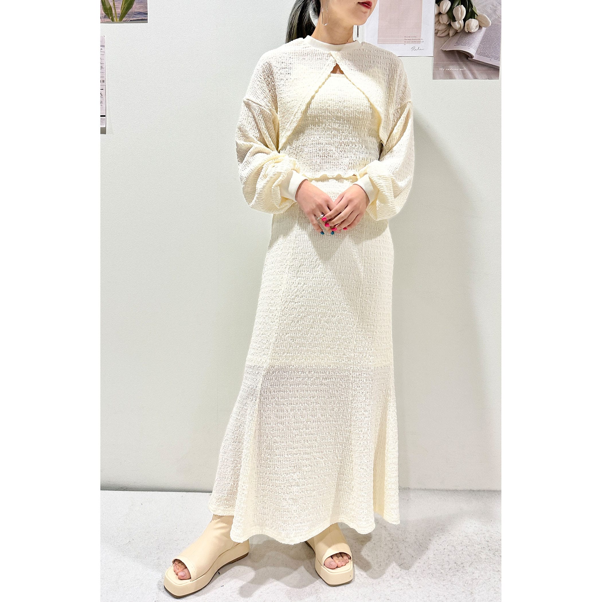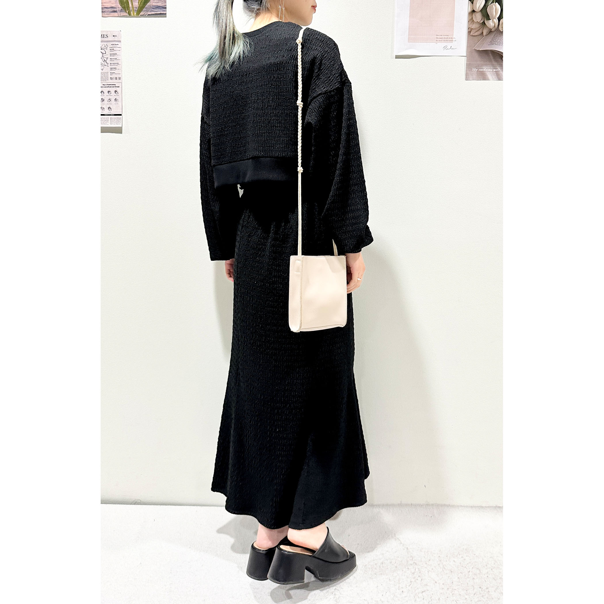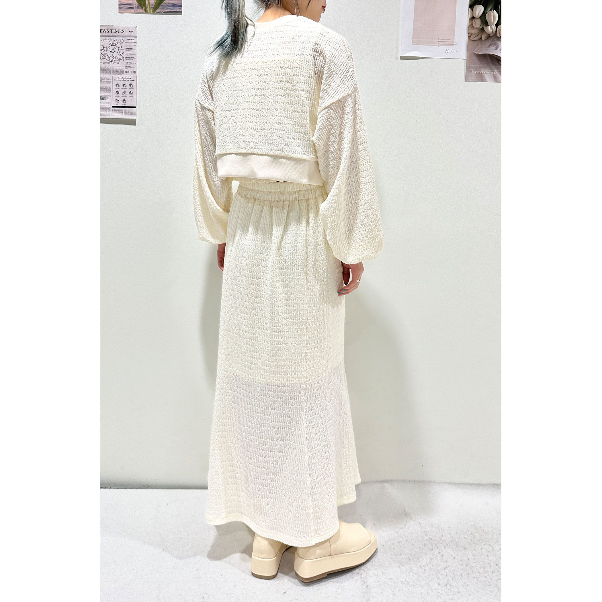 クロップド丈でトレンディムード高まる短丈トップスとキャミとスカートの3点セットです。裾はリブで絞っており肩が落ちた長袖にパフ感がキュート。キャミは前後スクエアネックでジャガードカット素材ですっきりフィットし、カップ付きなのでそのまま下着としても使えます。スカートはマーメイドシルエットになっており程よく体にフィットしレディライクな印象に◎別々でも着用いただけるので、ハイウエストのパンツでスタイリッシュにしたり、トップスをワンピと合わせたり、キャミにカーディガンを羽織っても◎様々なコーディネートが楽しめます♪※アイボリーのスカートのみ裏地付き