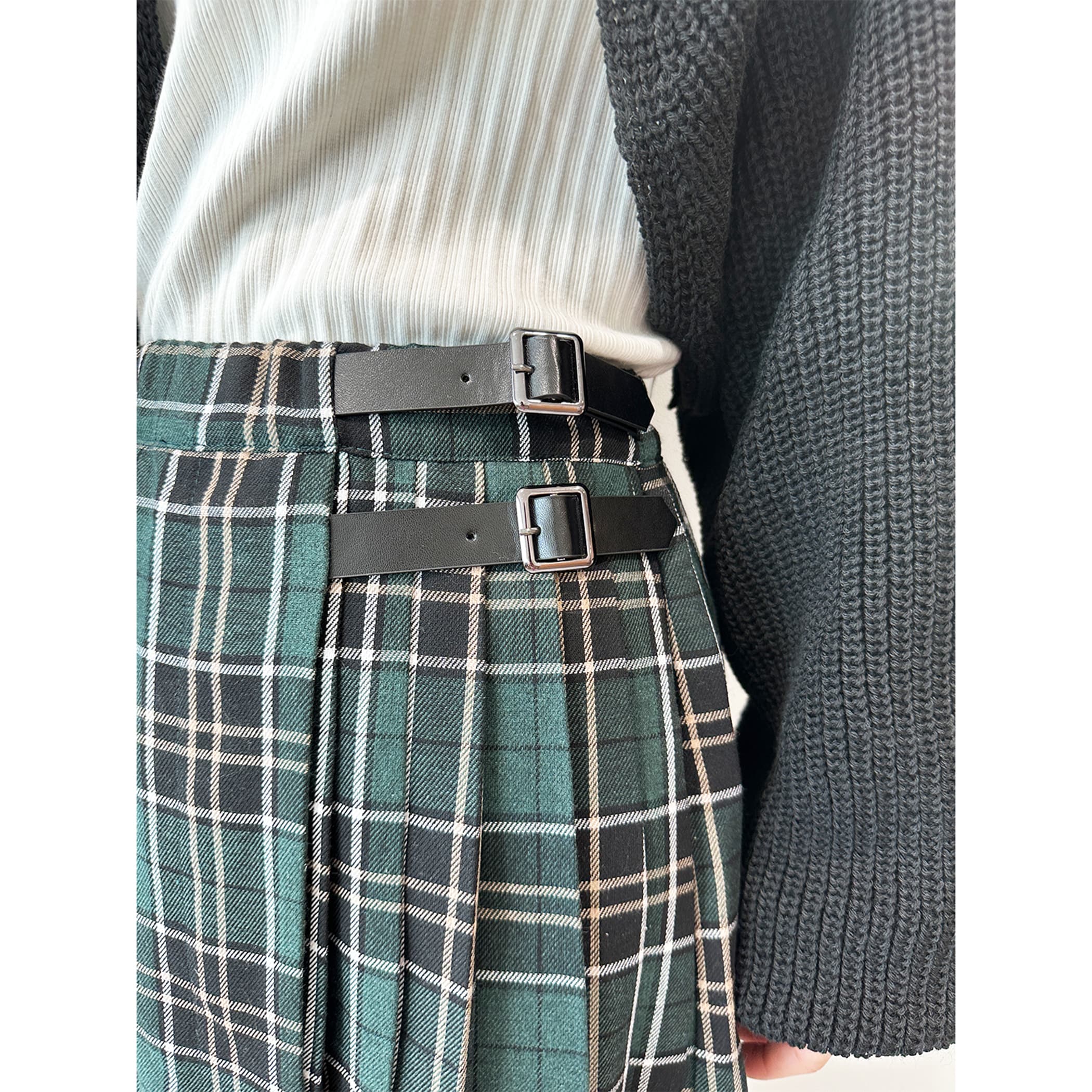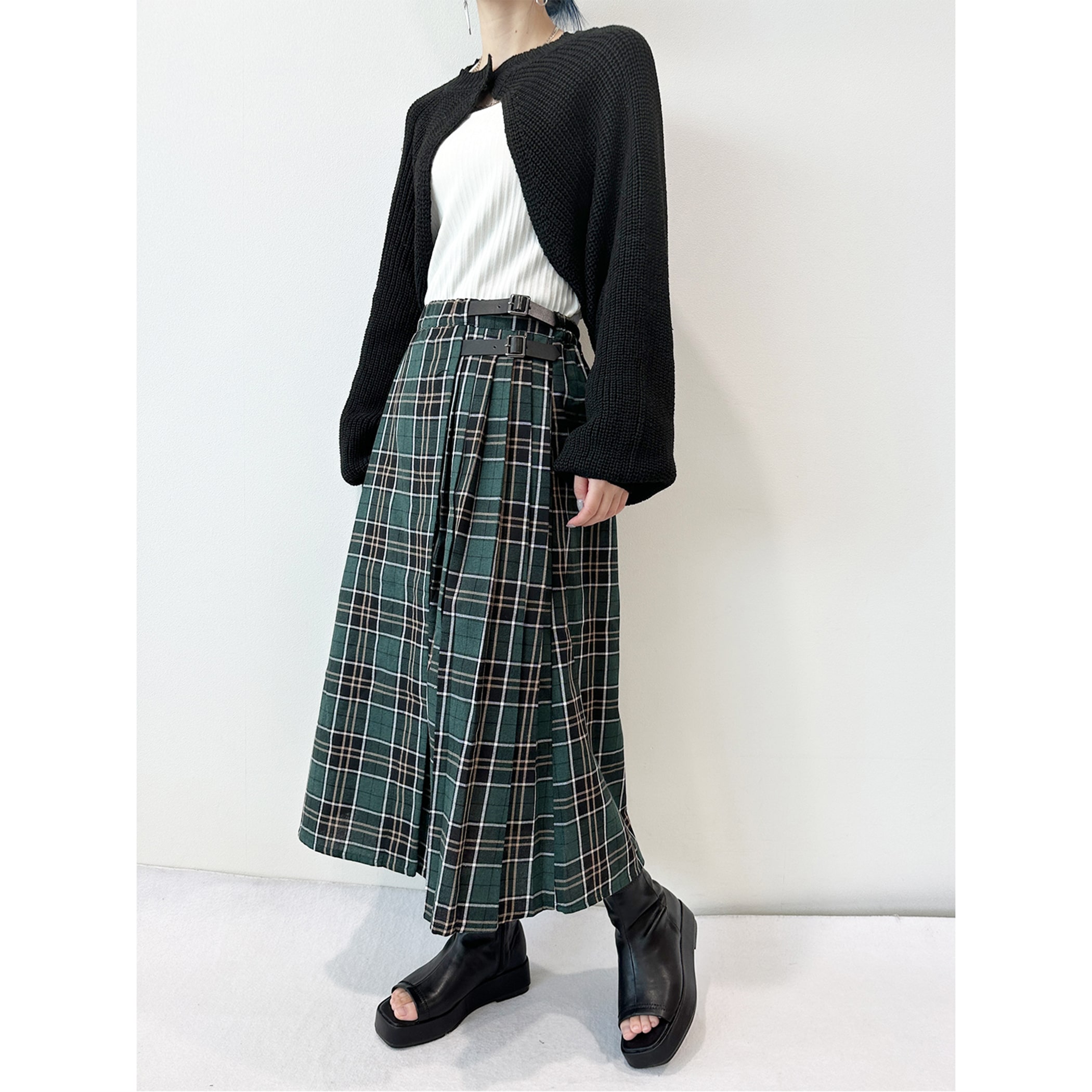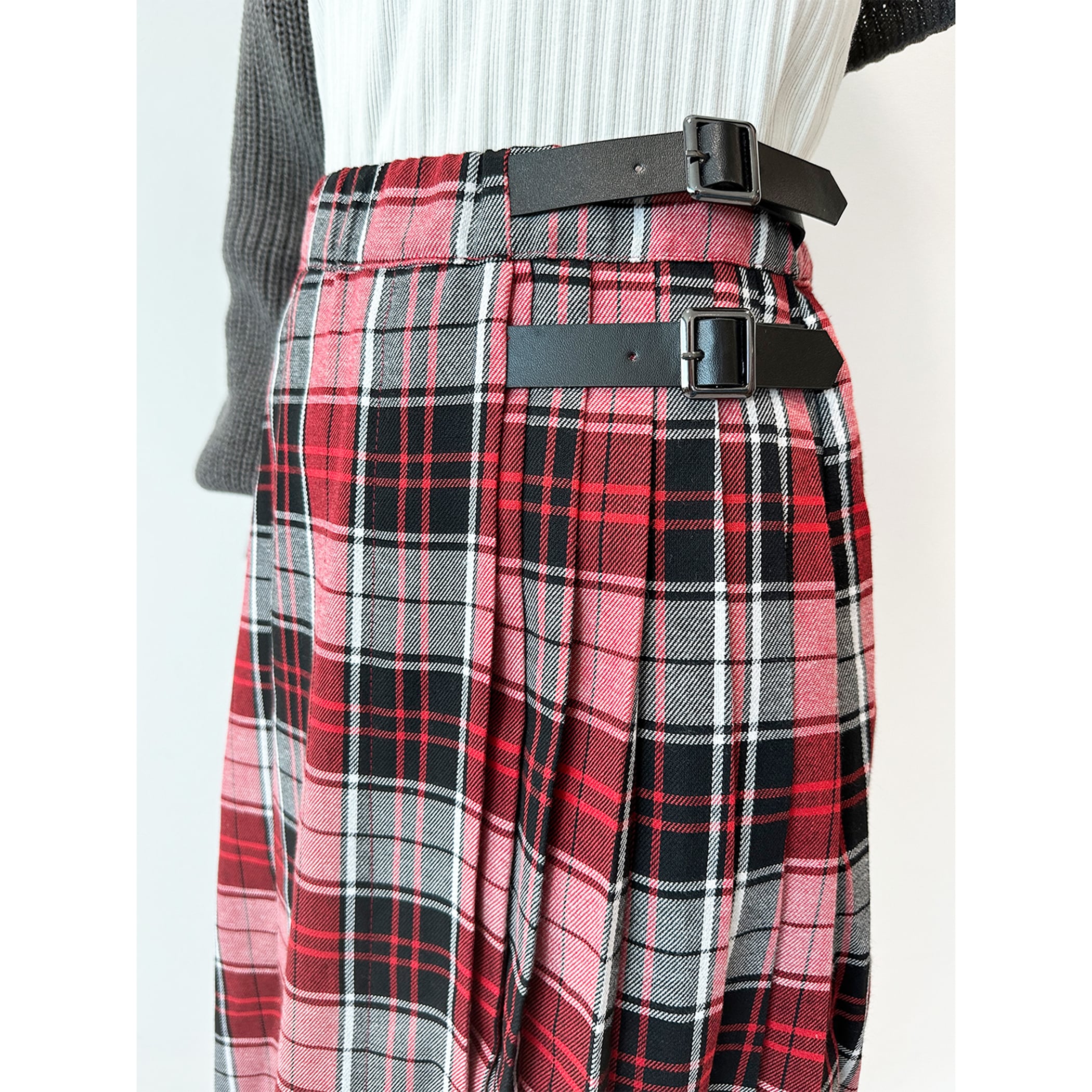 鮮やかながら深みのあるチェック柄が目を惹くプリーツスカート。合皮の飾りベルトがポイントで、大人っぽく取り入れて頂けます。