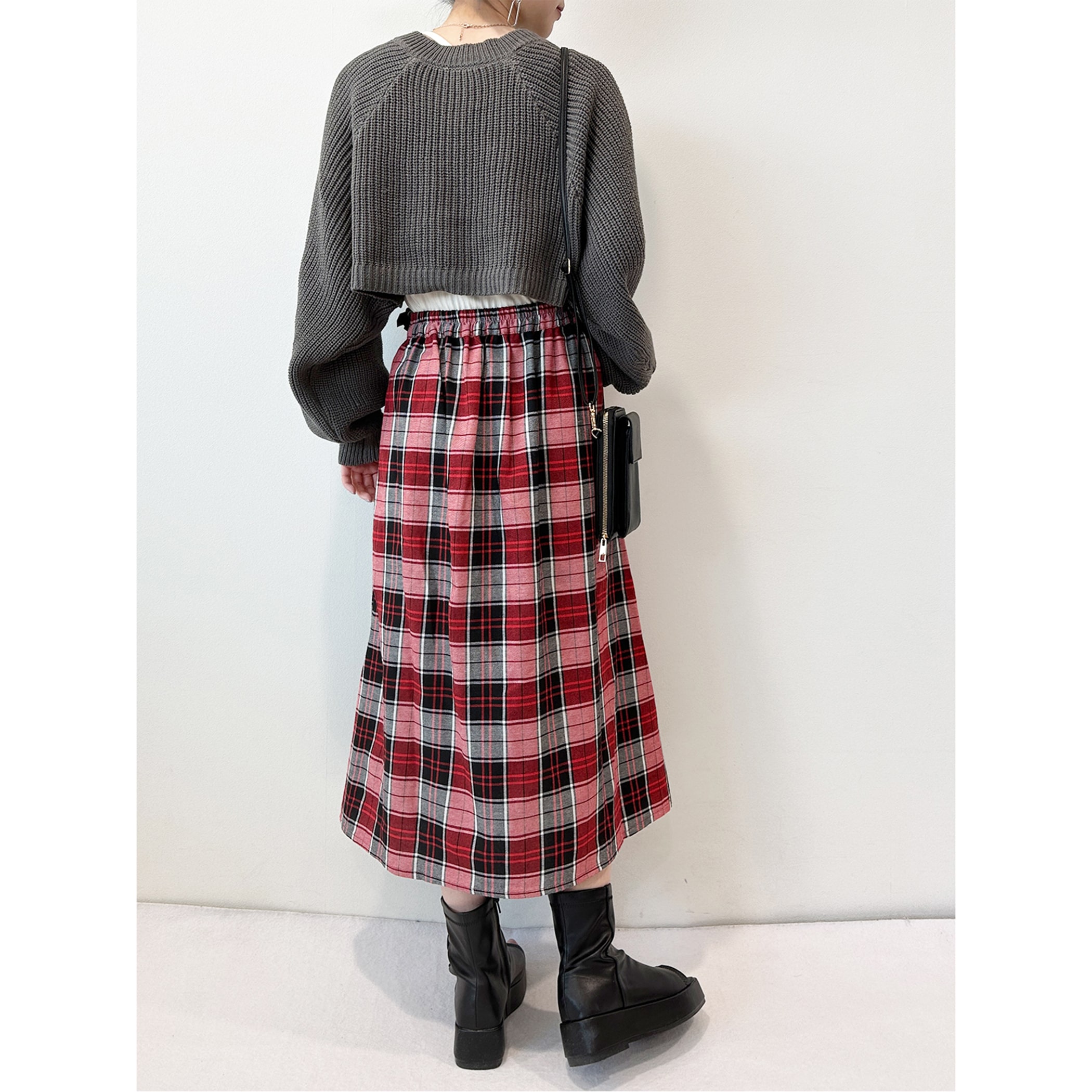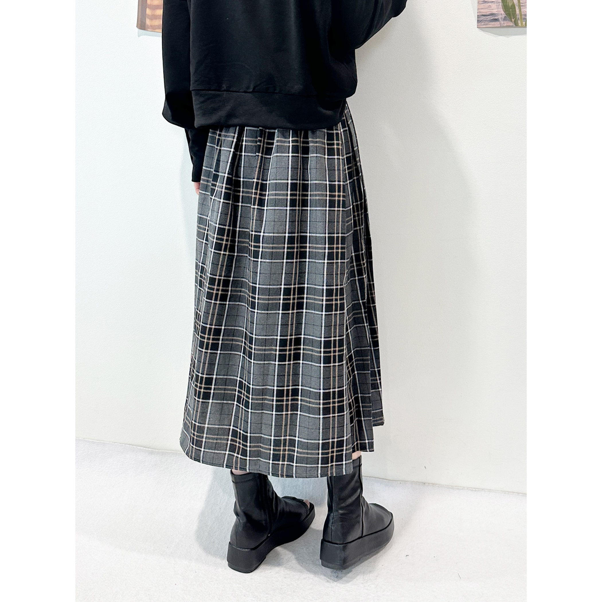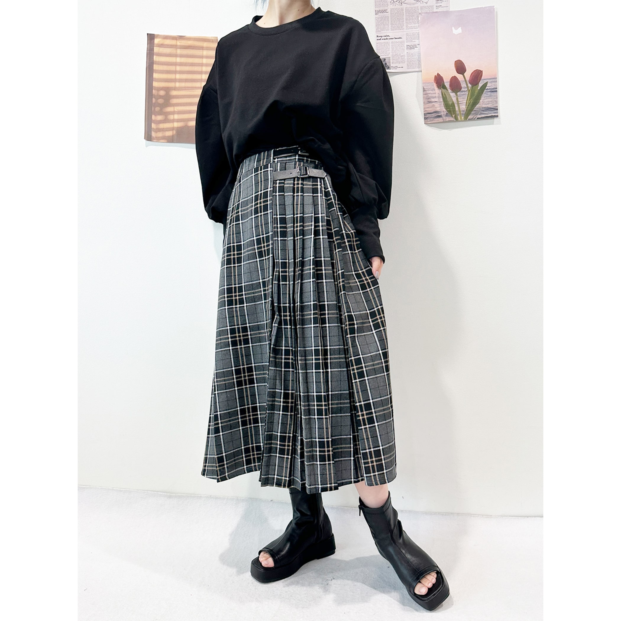 鮮やかながら深みのあるチェック柄が目を惹くプリーツスカート。合皮の飾りベルトがポイントで、大人っぽく取り入れて頂けます。