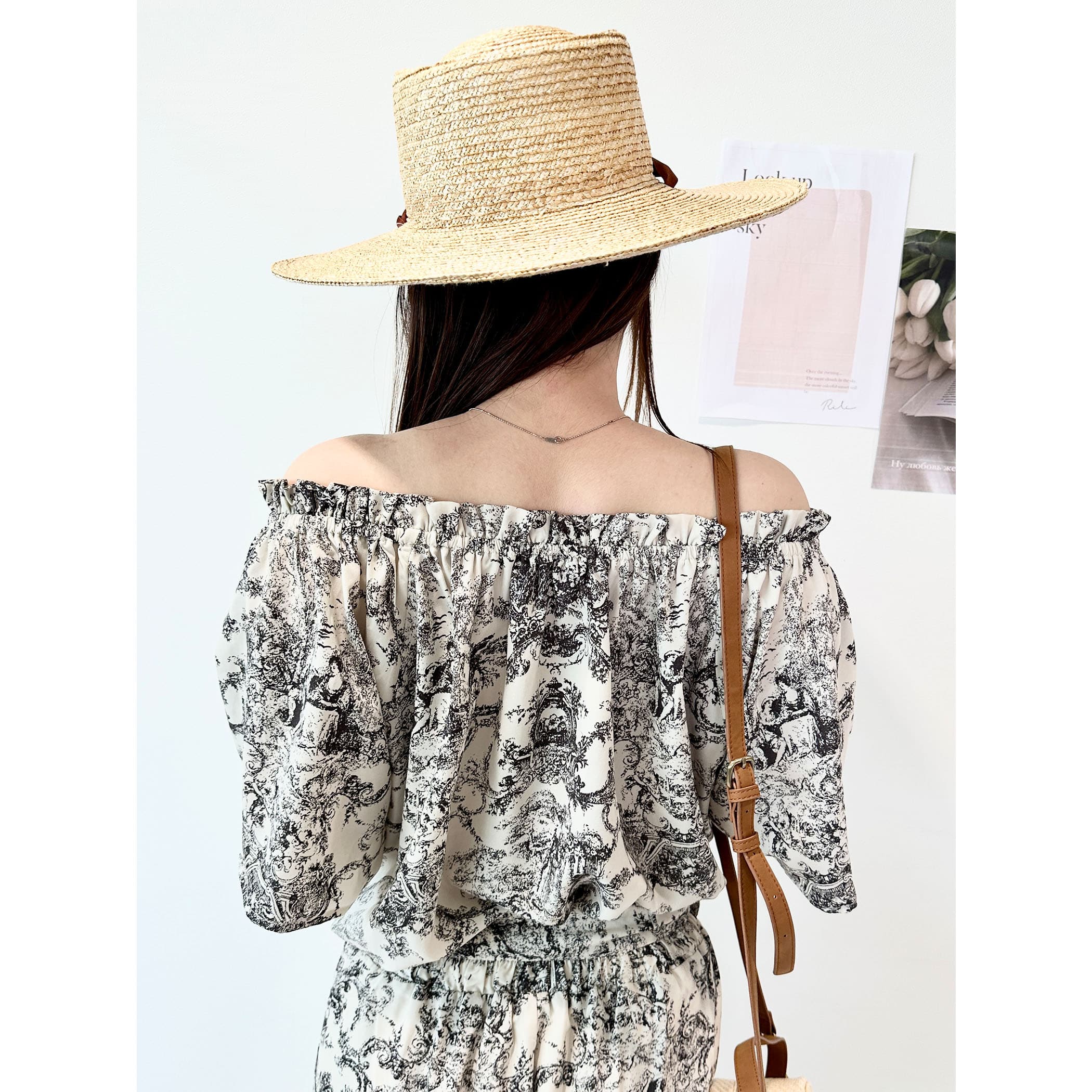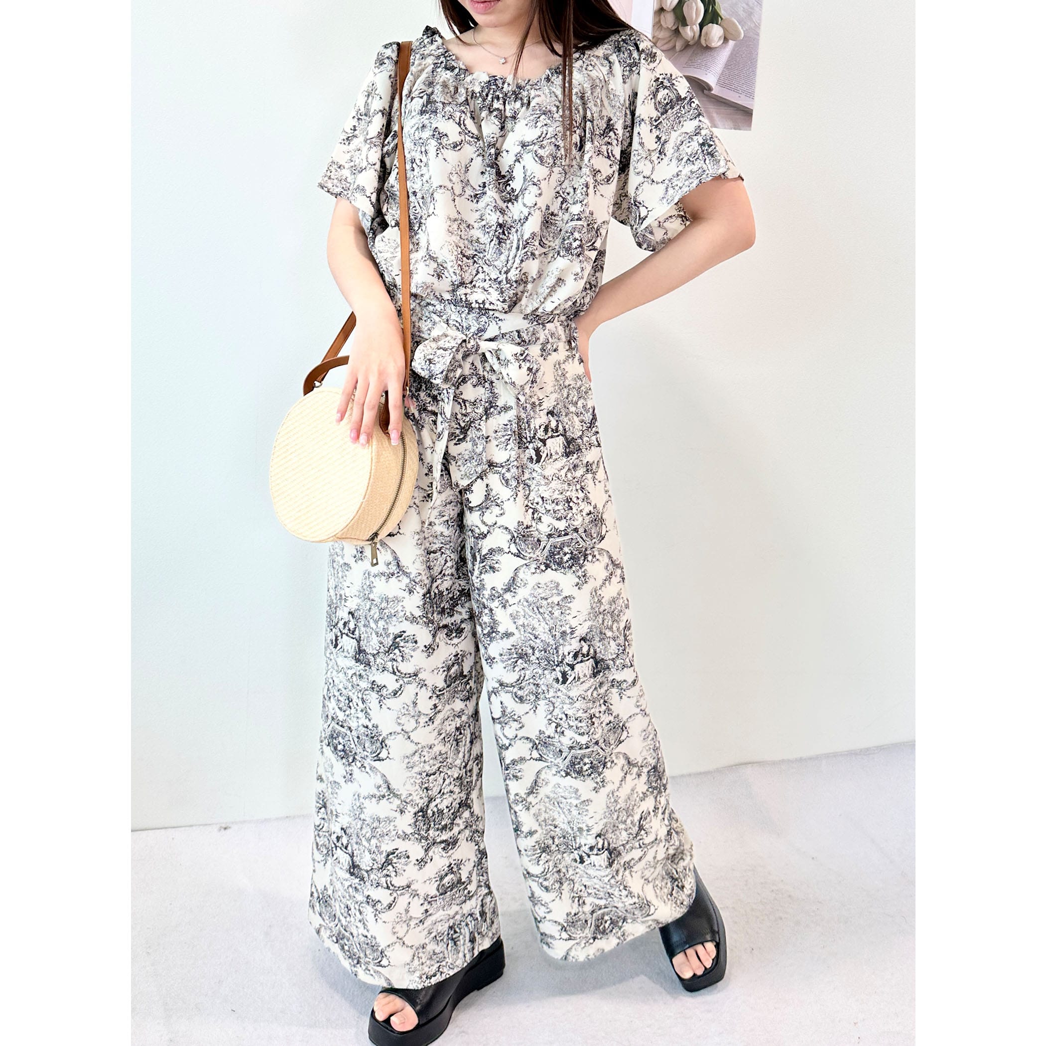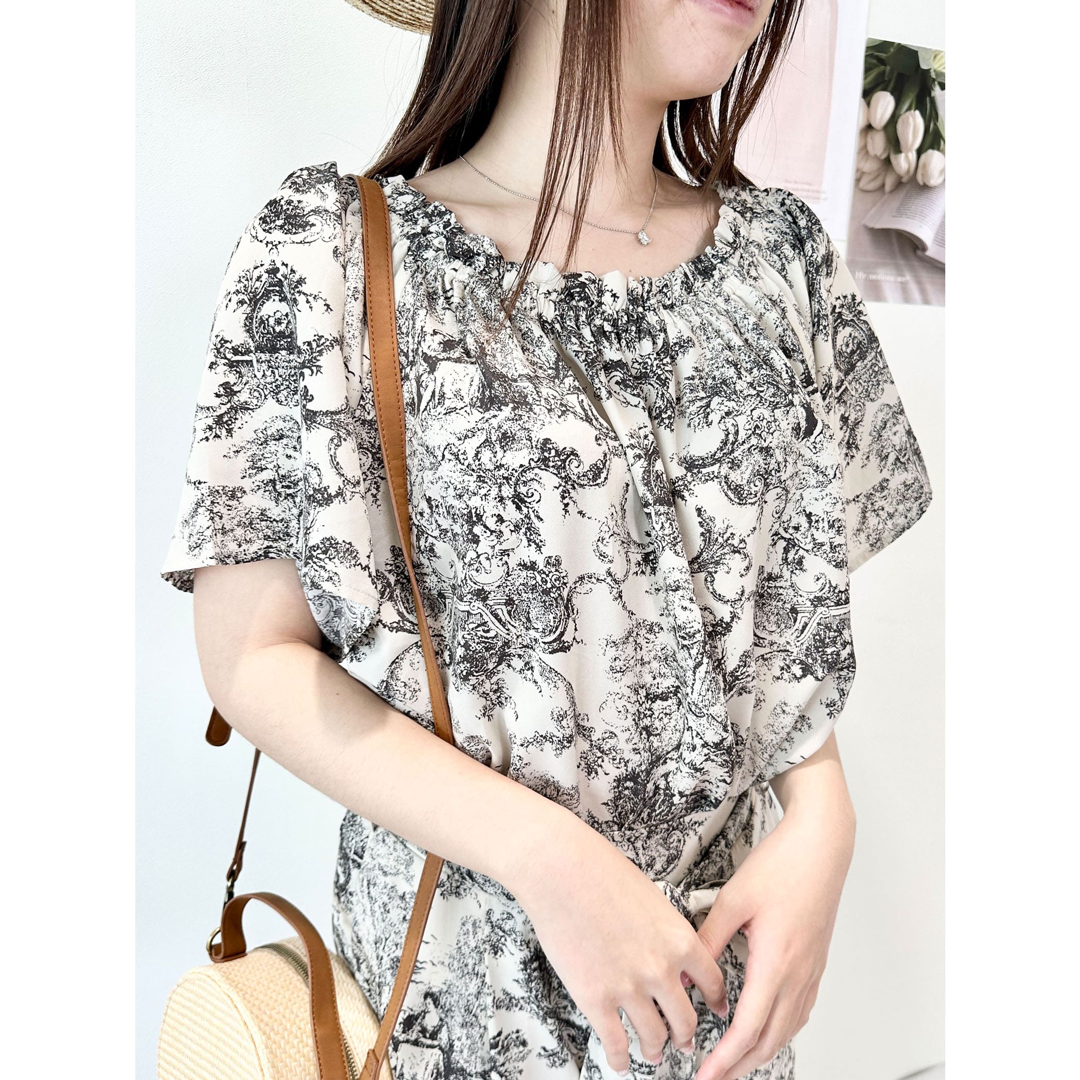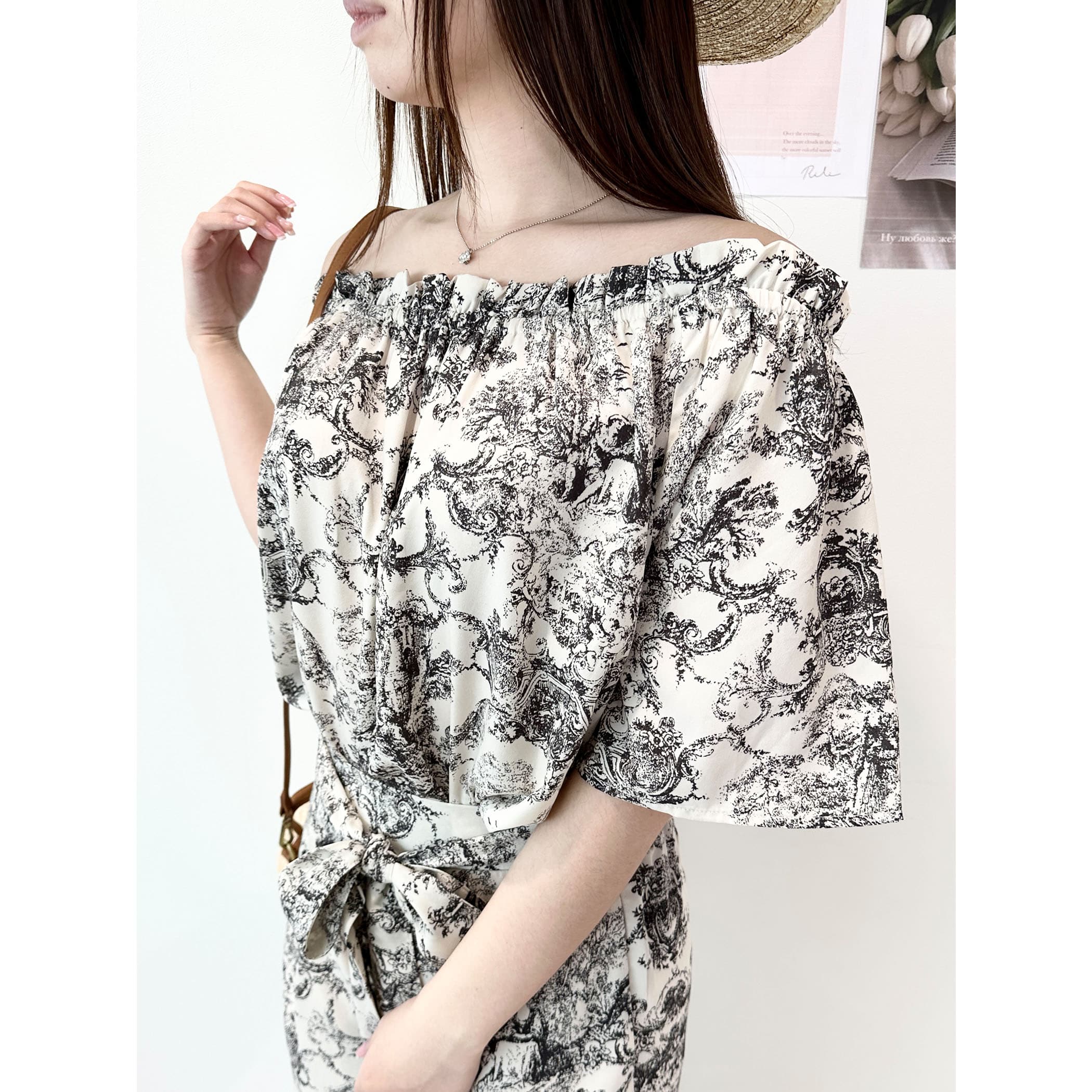 トレンドの『トワルドジュイ柄』のブラウス。肩を出してオフショルブラウスとしても使える2WAY仕様。プラスワンでスタイリングが一気に華やぐ1着です。スカートはもちろんパンツ合わせでも◎3012050スカンツとセットアップでも着用できます。