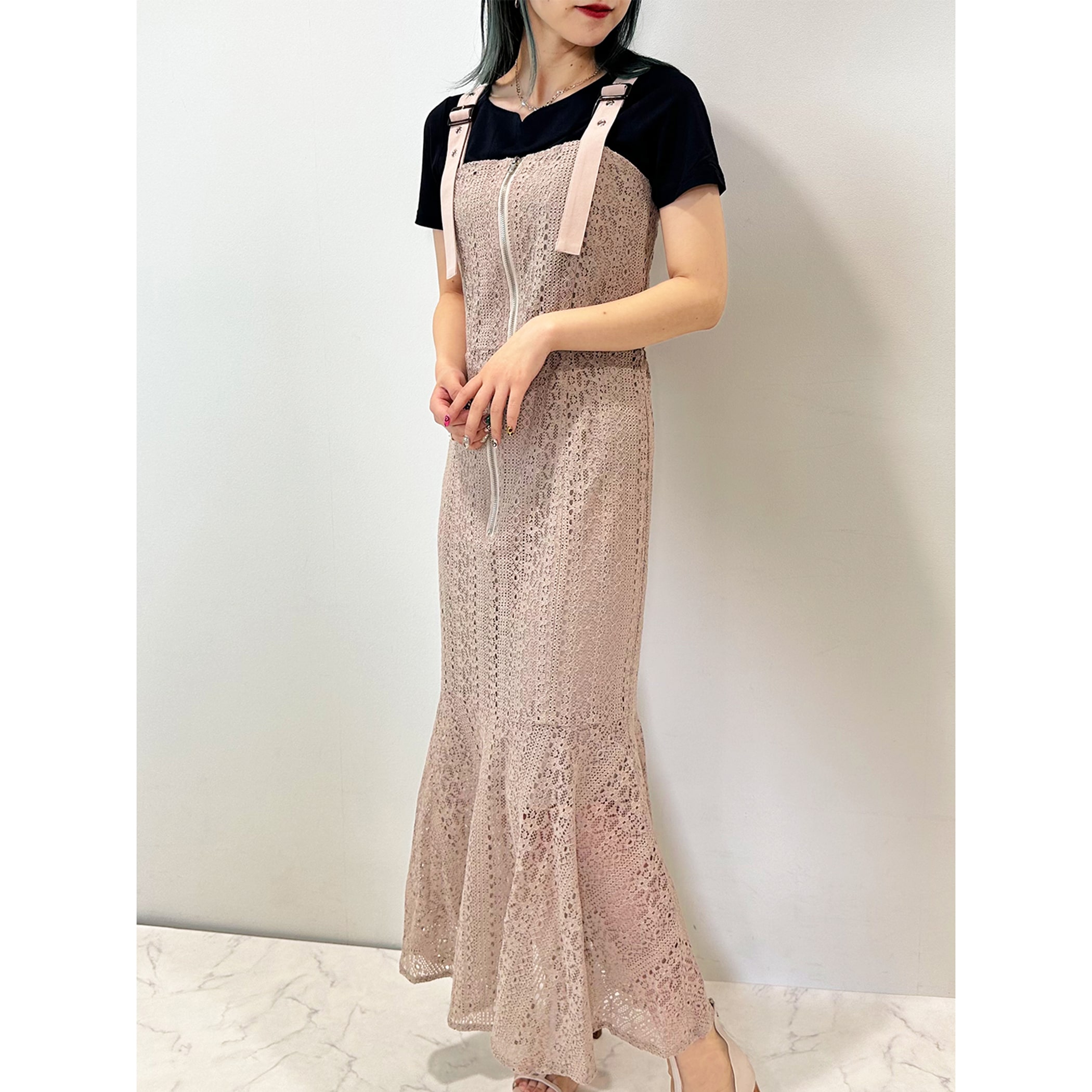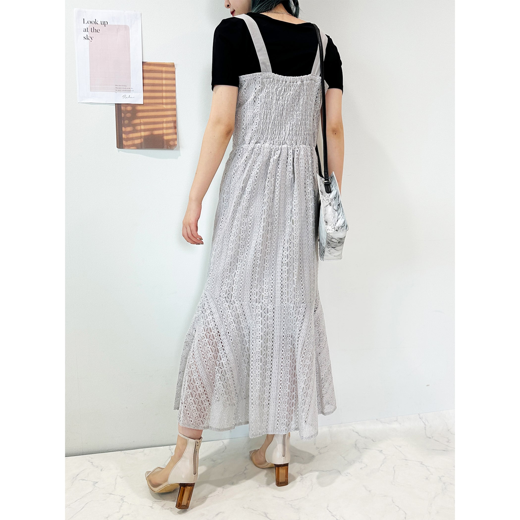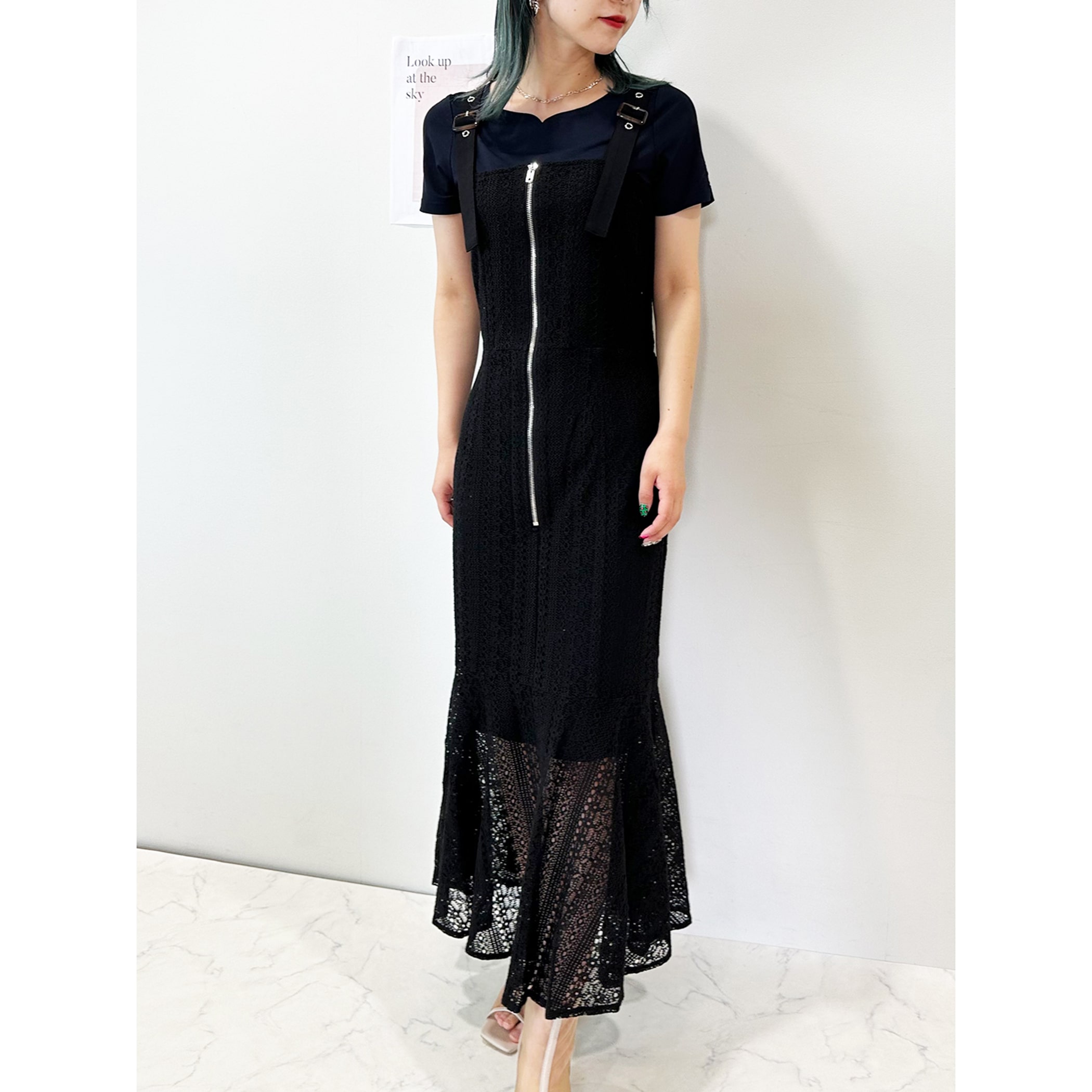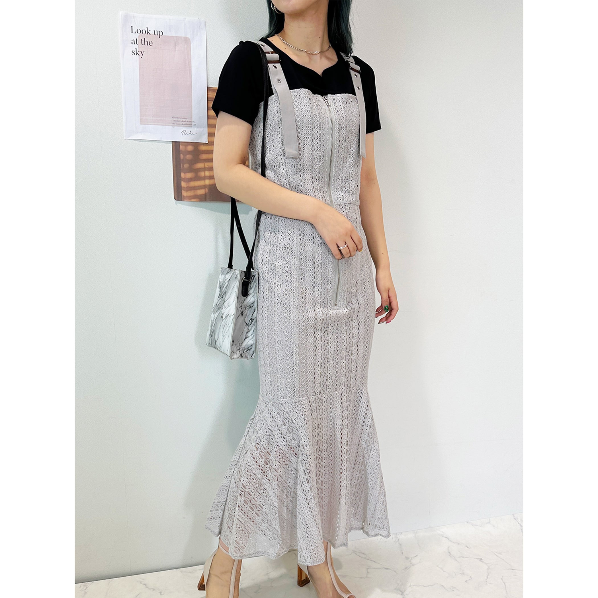 レースが着こなしのアクセントになるジャンパースカート。マーメイドシルエットで女性らしいスタイリングに仕上げてくれる一枚。シンプルなデザインなのでインナーを変えて幅広く着まわせるアイテムです。