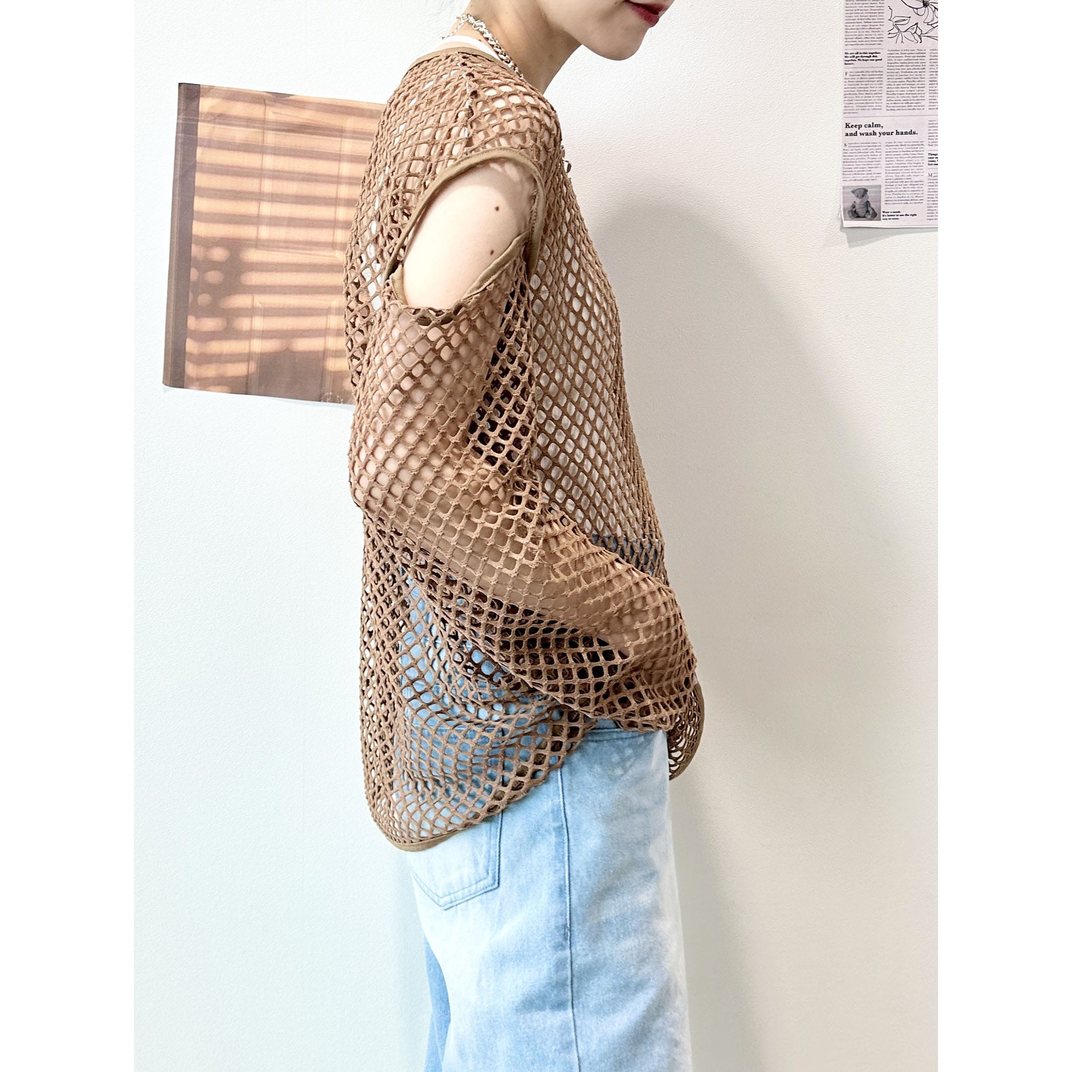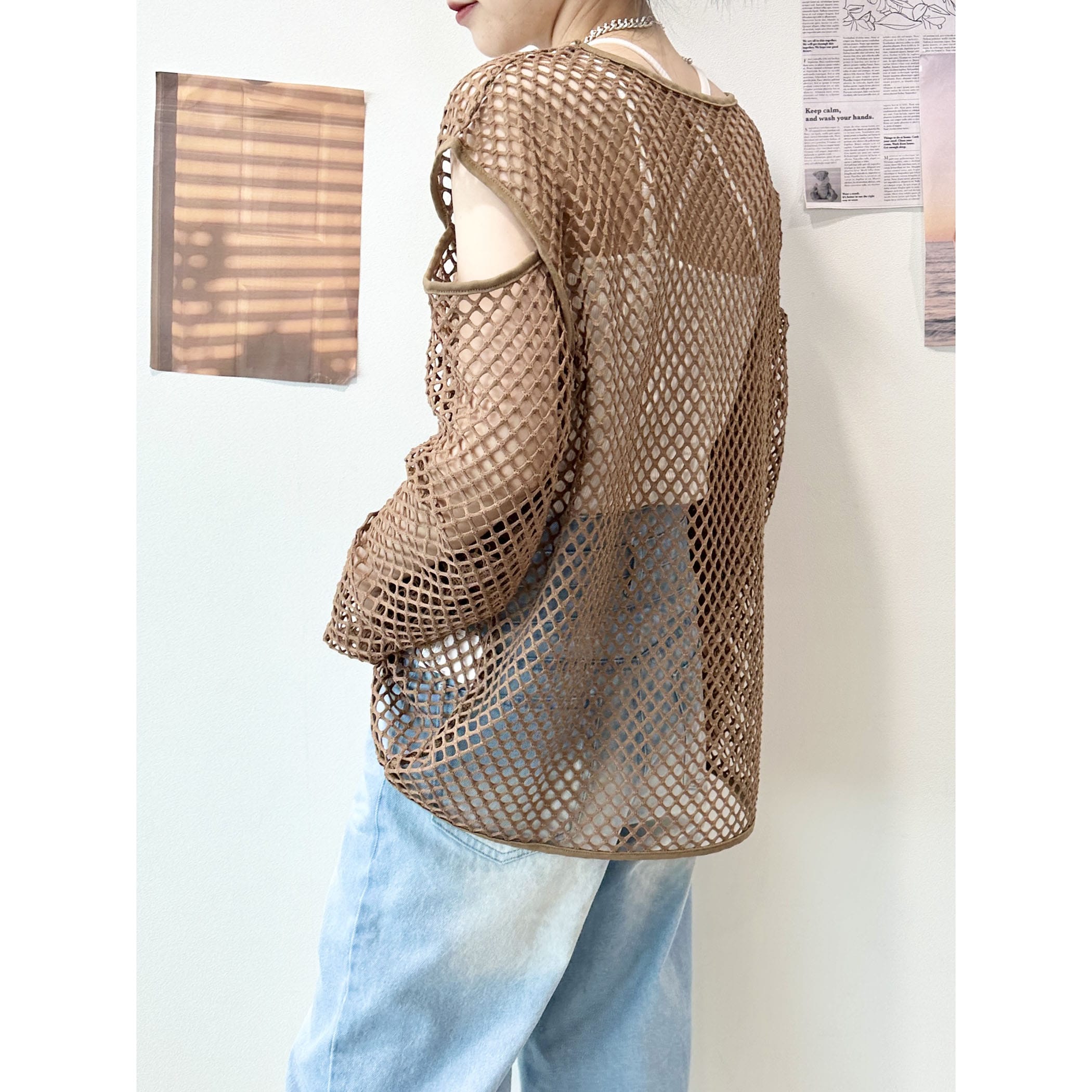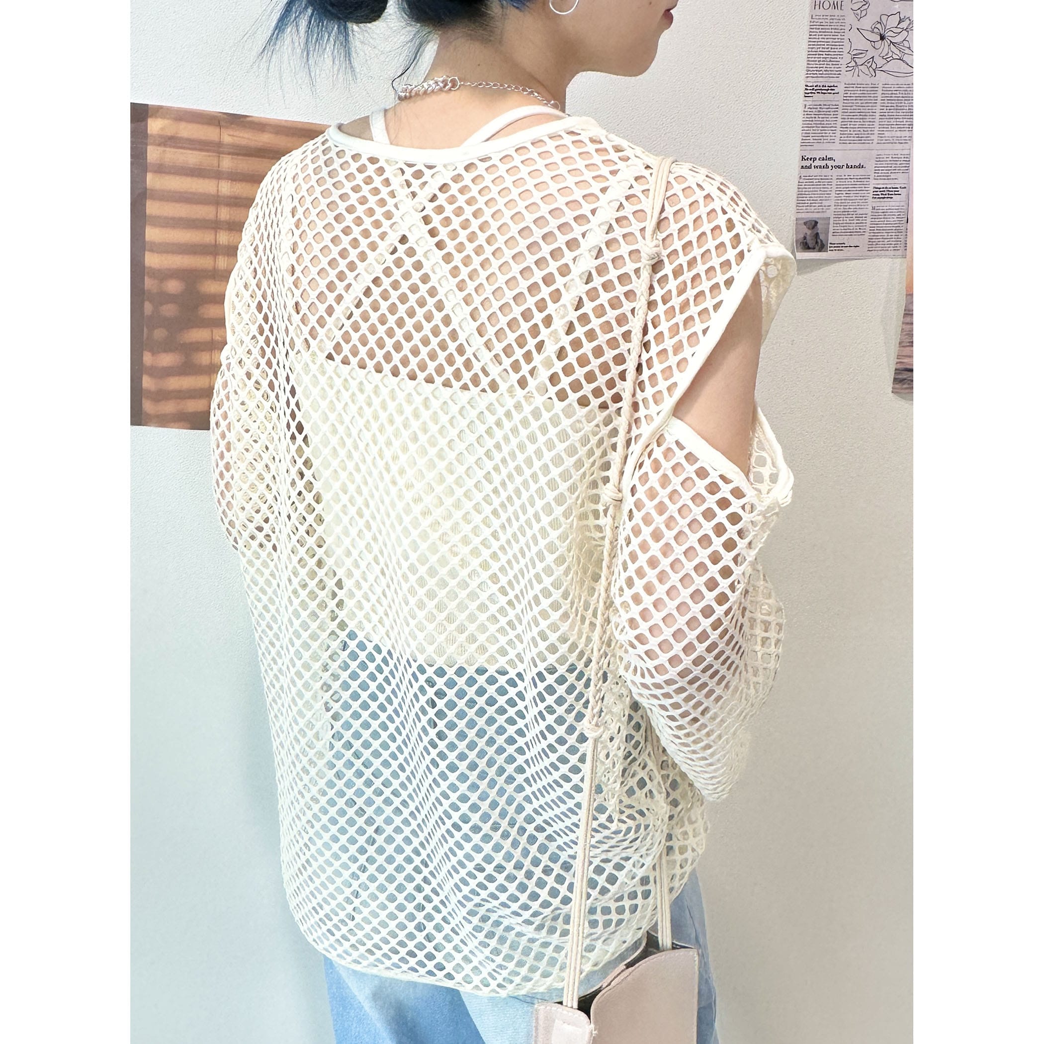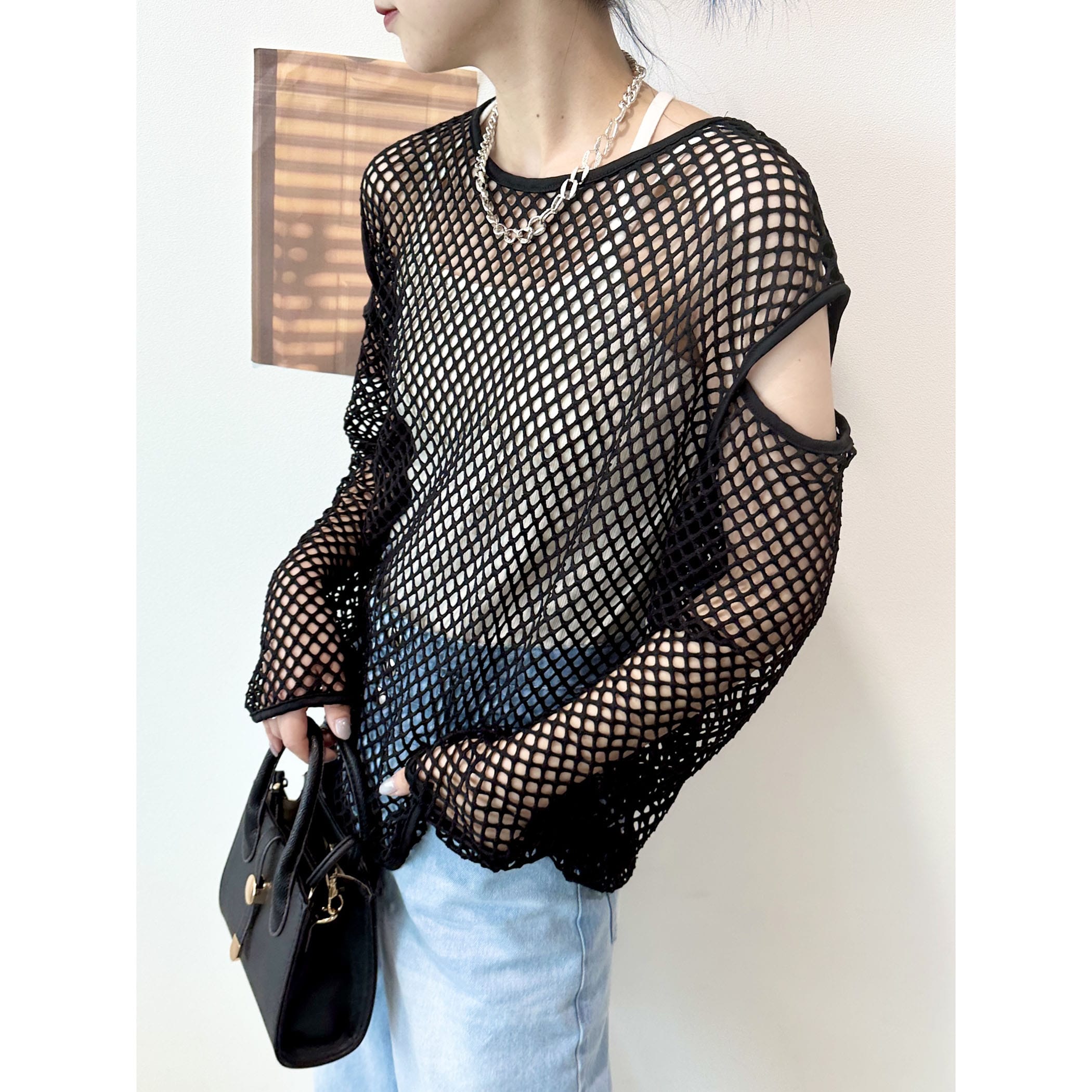 メッシュネットのざっくりな透け感がオシャレなトップス。ロゴTシャツやタンク。キャミソールなど様々なレイヤードスタイルが楽しめます。袖が開いたデザインもトレンドらしくて◎。いつものコーディネートにプラスするだけでトレンドライクかつカジュアルからモードまで幅広くスタイリングを楽しめる一枚です。
