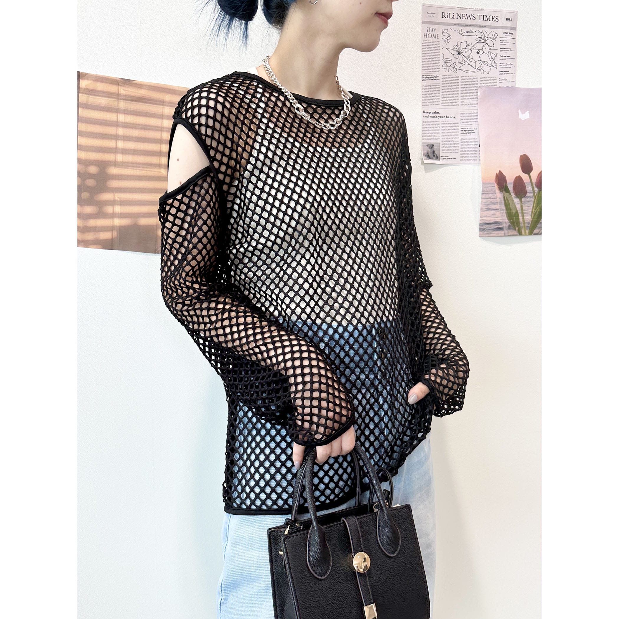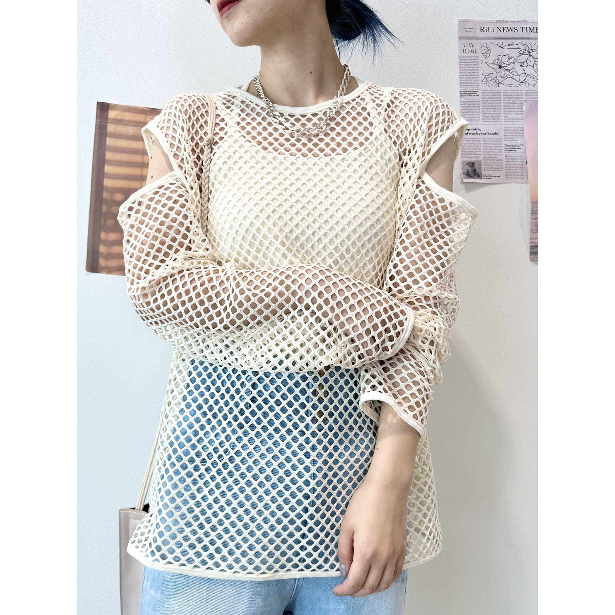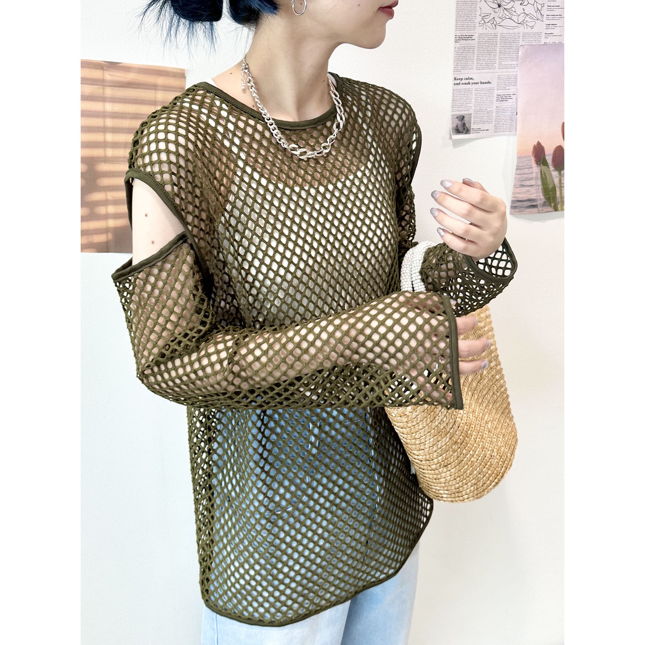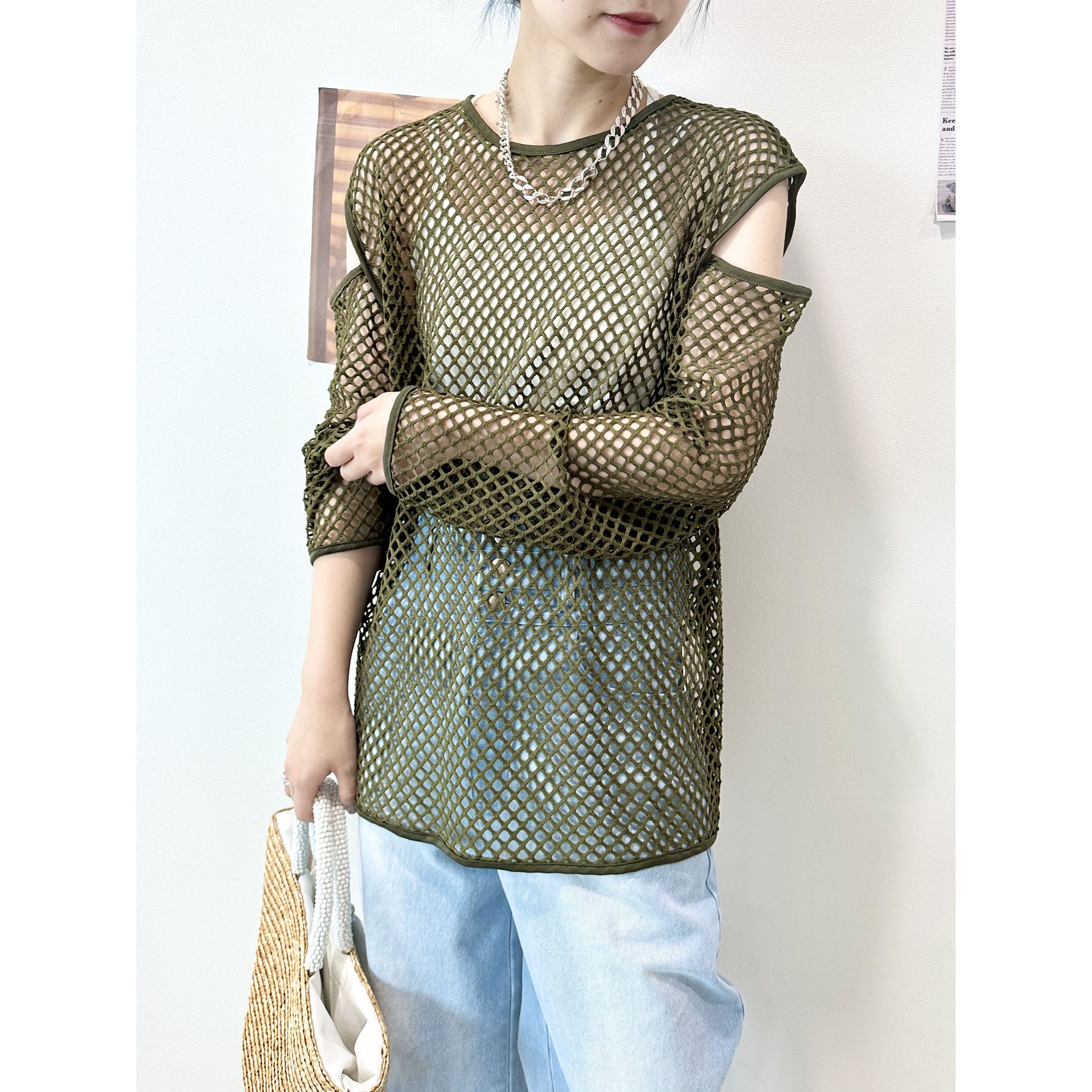 メッシュネットのざっくりな透け感がオシャレなトップス。ロゴTシャツやタンク。キャミソールなど様々なレイヤードスタイルが楽しめます。袖が開いたデザインもトレンドらしくて◎。いつものコーディネートにプラスするだけでトレンドライクかつカジュアルからモードまで幅広くスタイリングを楽しめる一枚です。