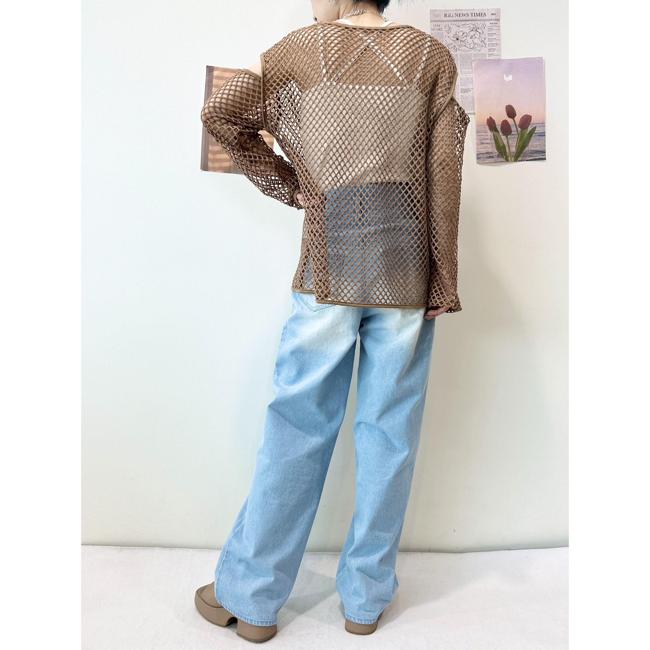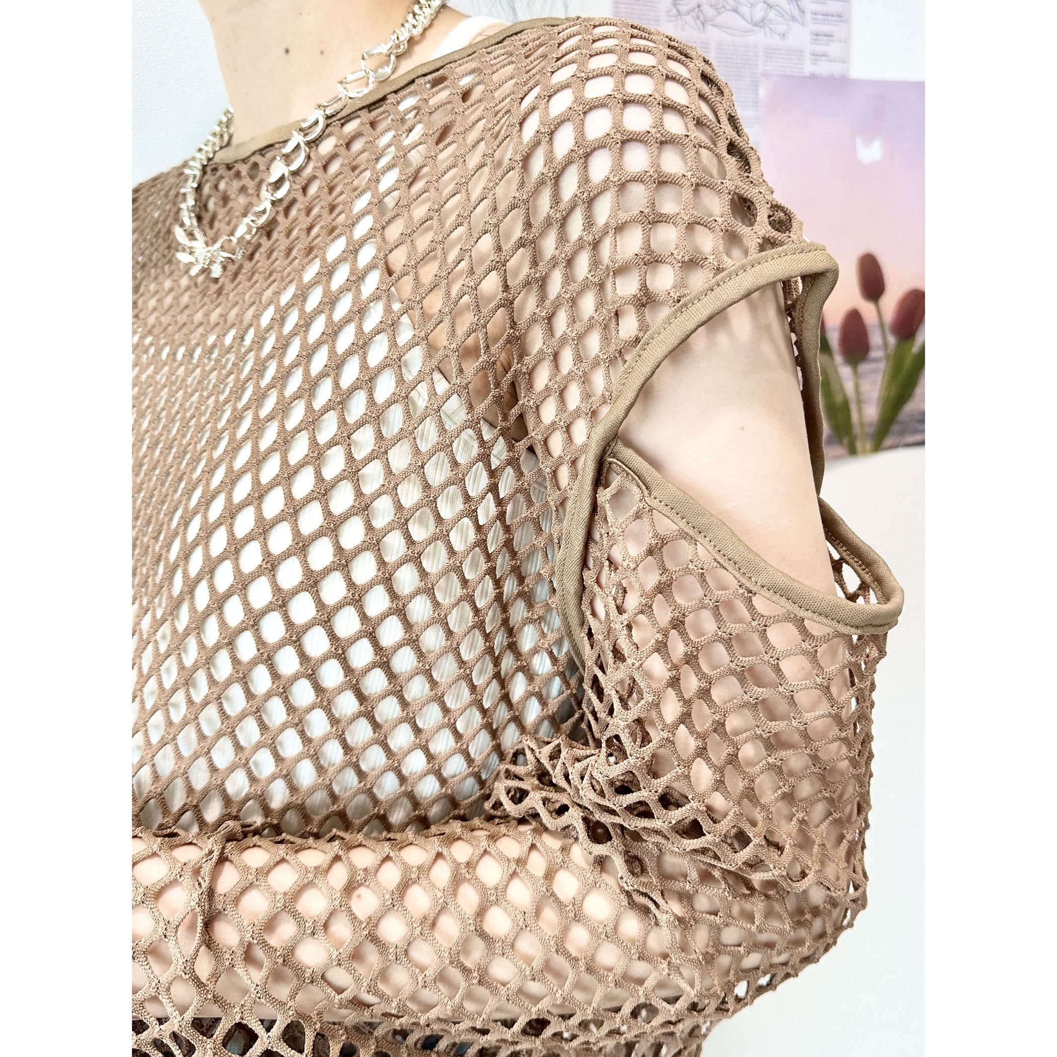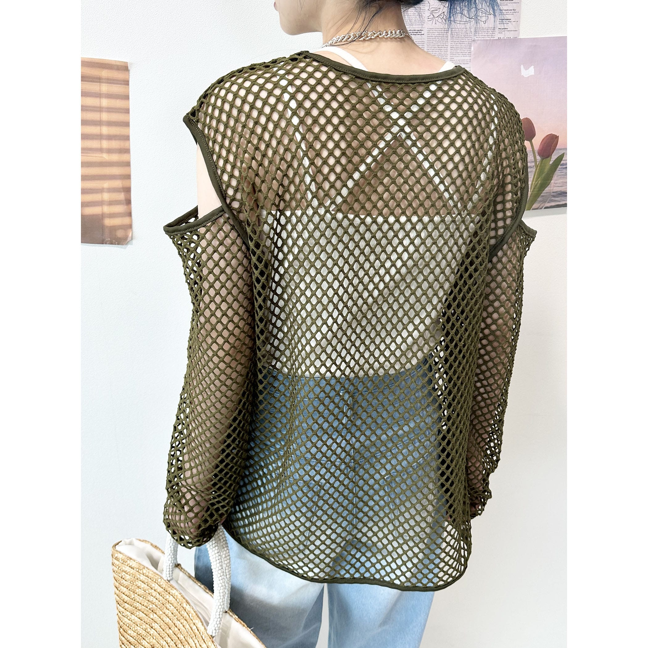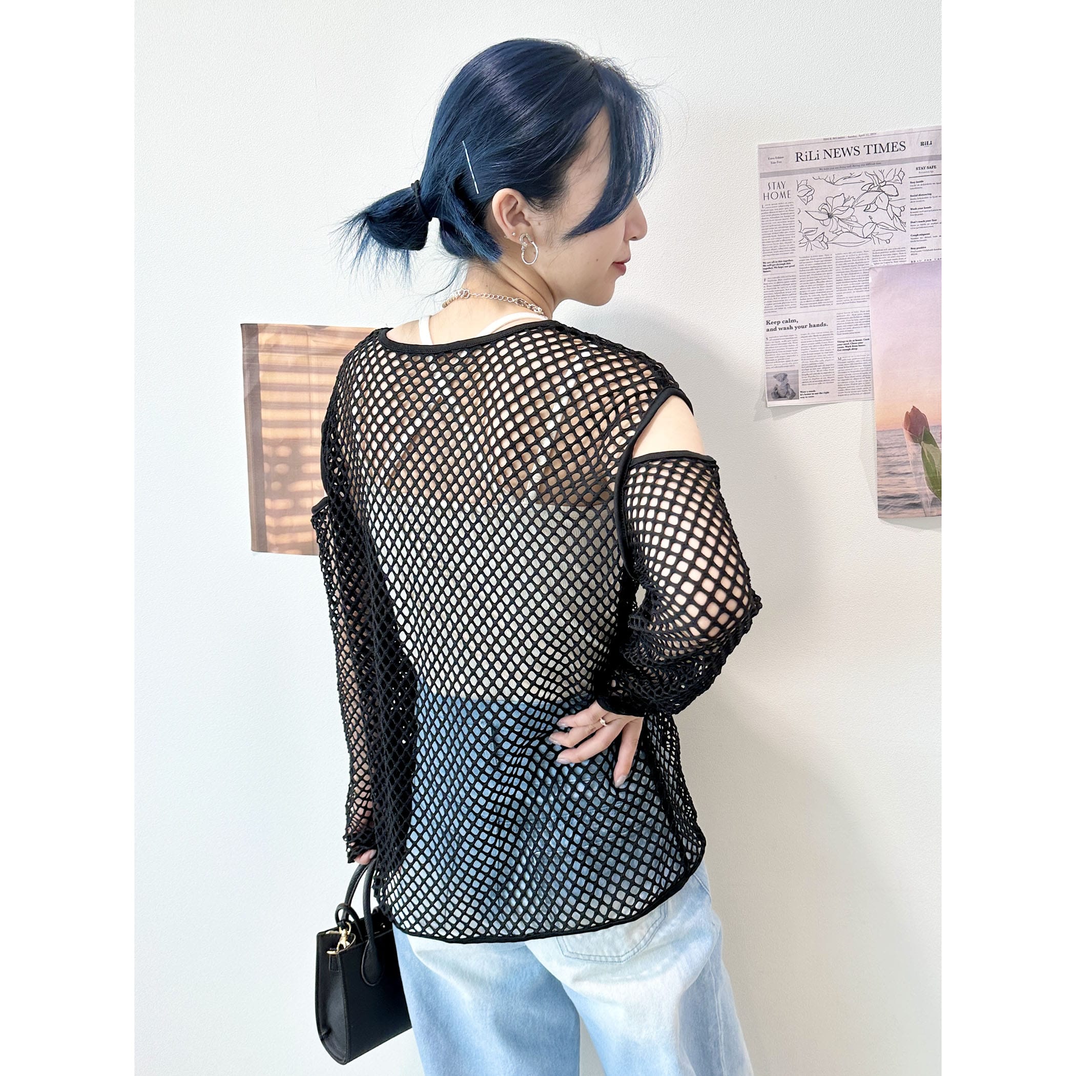 メッシュネットのざっくりな透け感がオシャレなトップス。ロゴTシャツやタンク。キャミソールなど様々なレイヤードスタイルが楽しめます。袖が開いたデザインもトレンドらしくて◎。いつものコーディネートにプラスするだけでトレンドライクかつカジュアルからモードまで幅広くスタイリングを楽しめる一枚です。