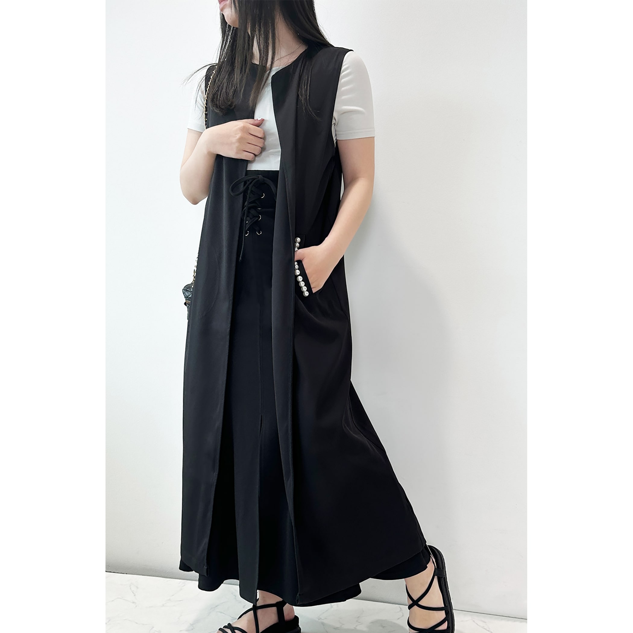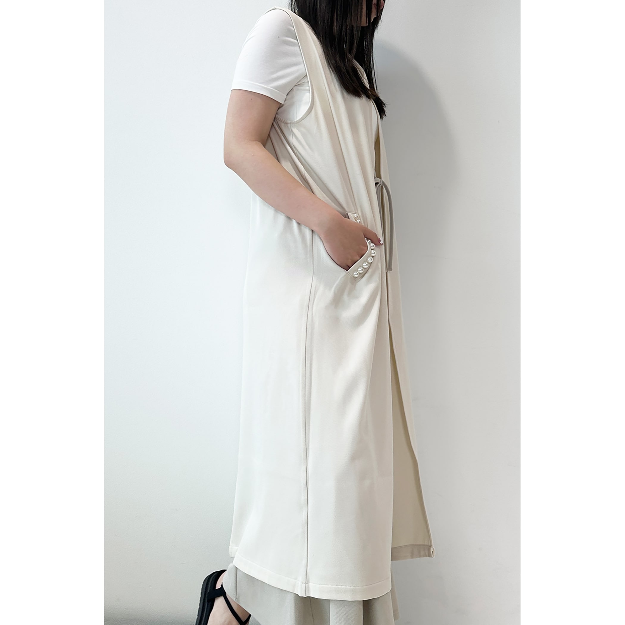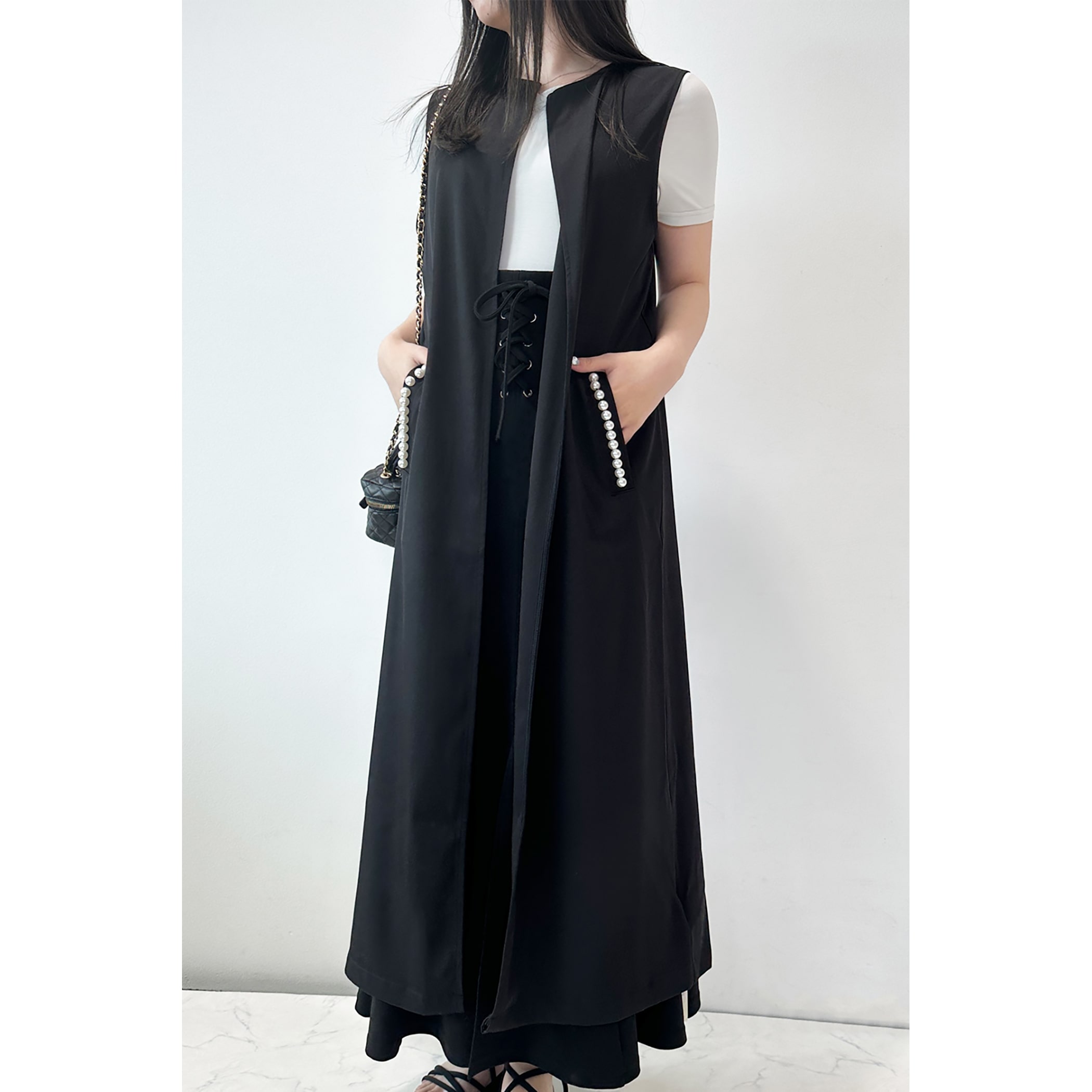 ポケットのパールが華やかなロングジレ。TシャツやロンTなどにさらっと羽織るだけでコーデが締まって見えます◎低身長・高身長でも着こなせれる丈感と、キレイなIラインでスタイルアップしてくれます。