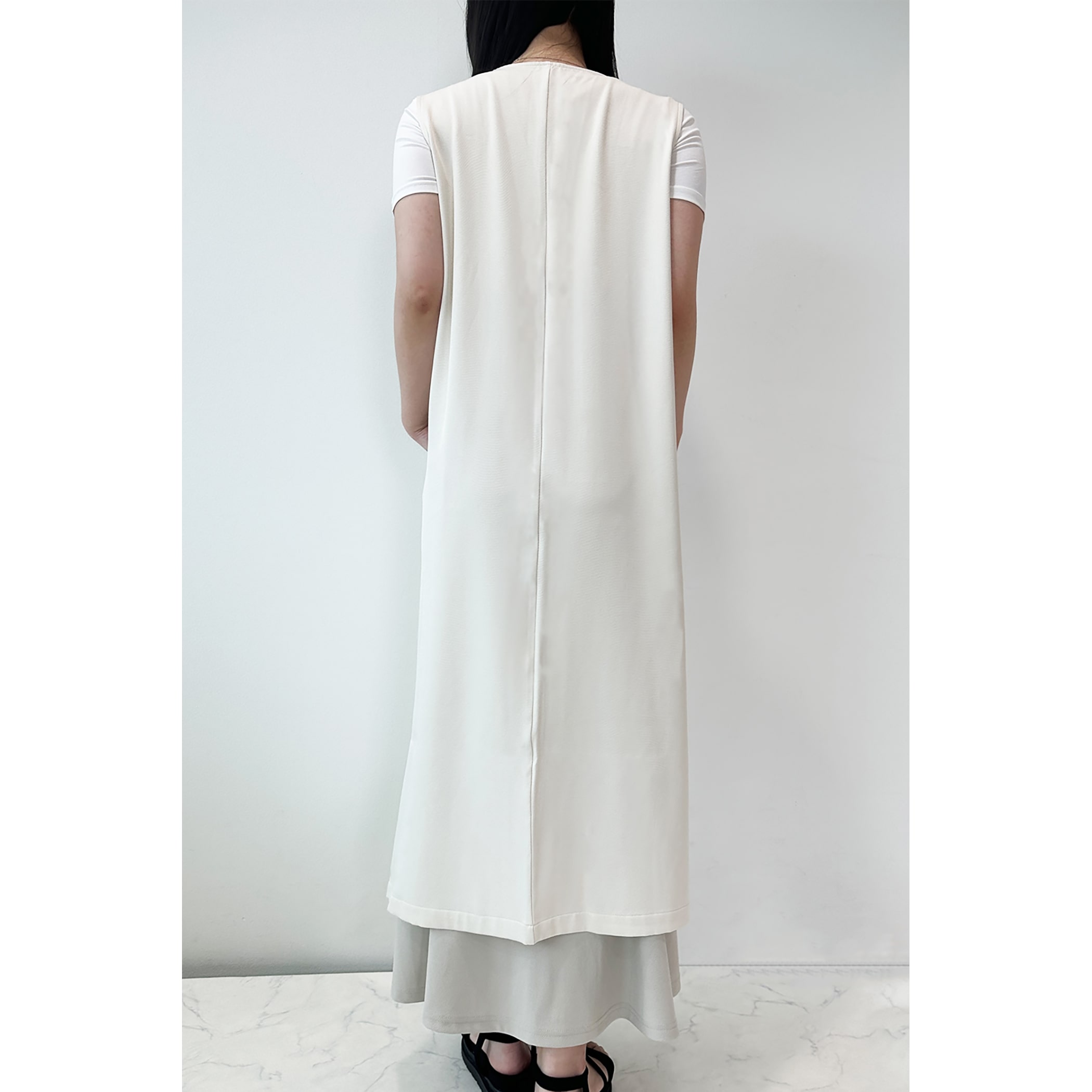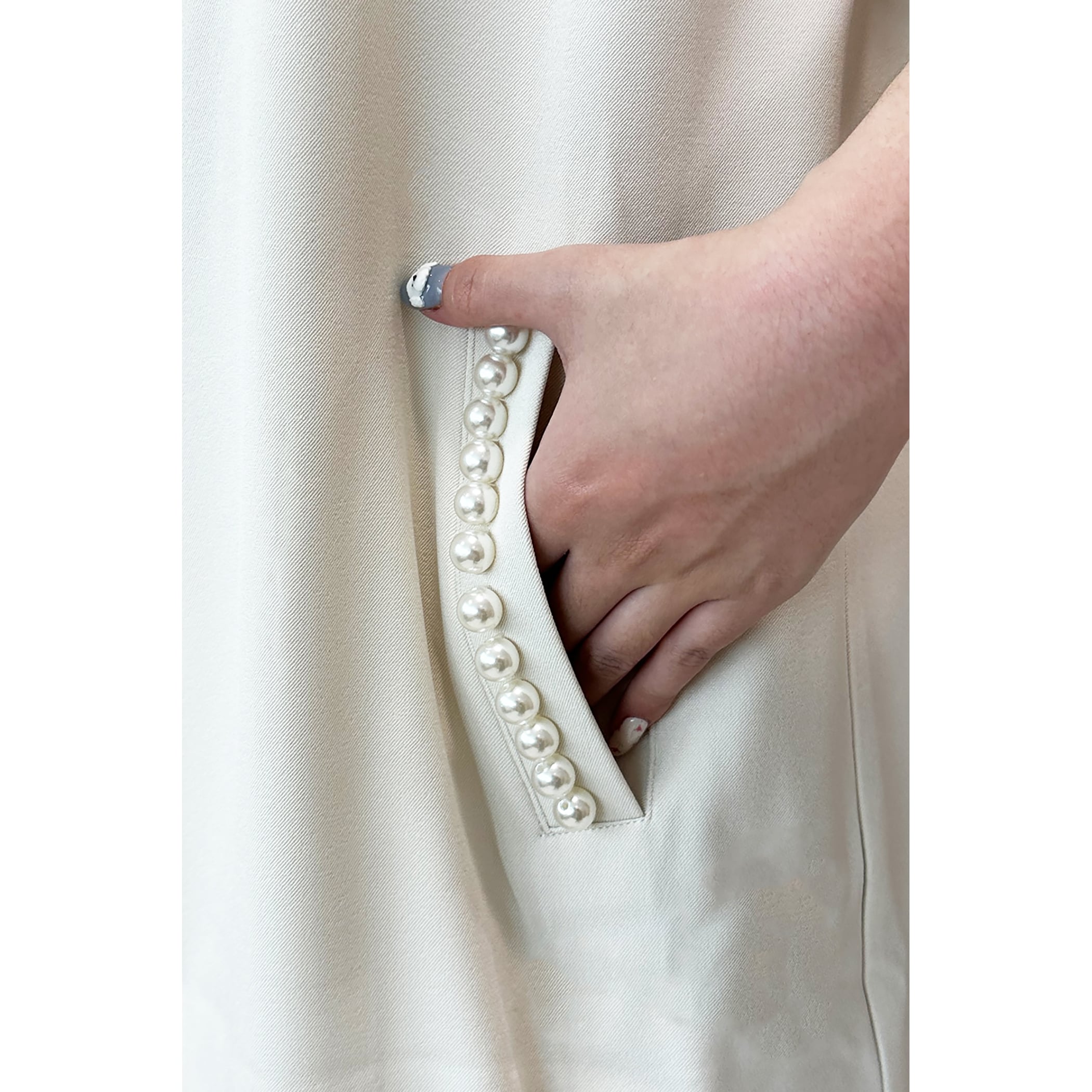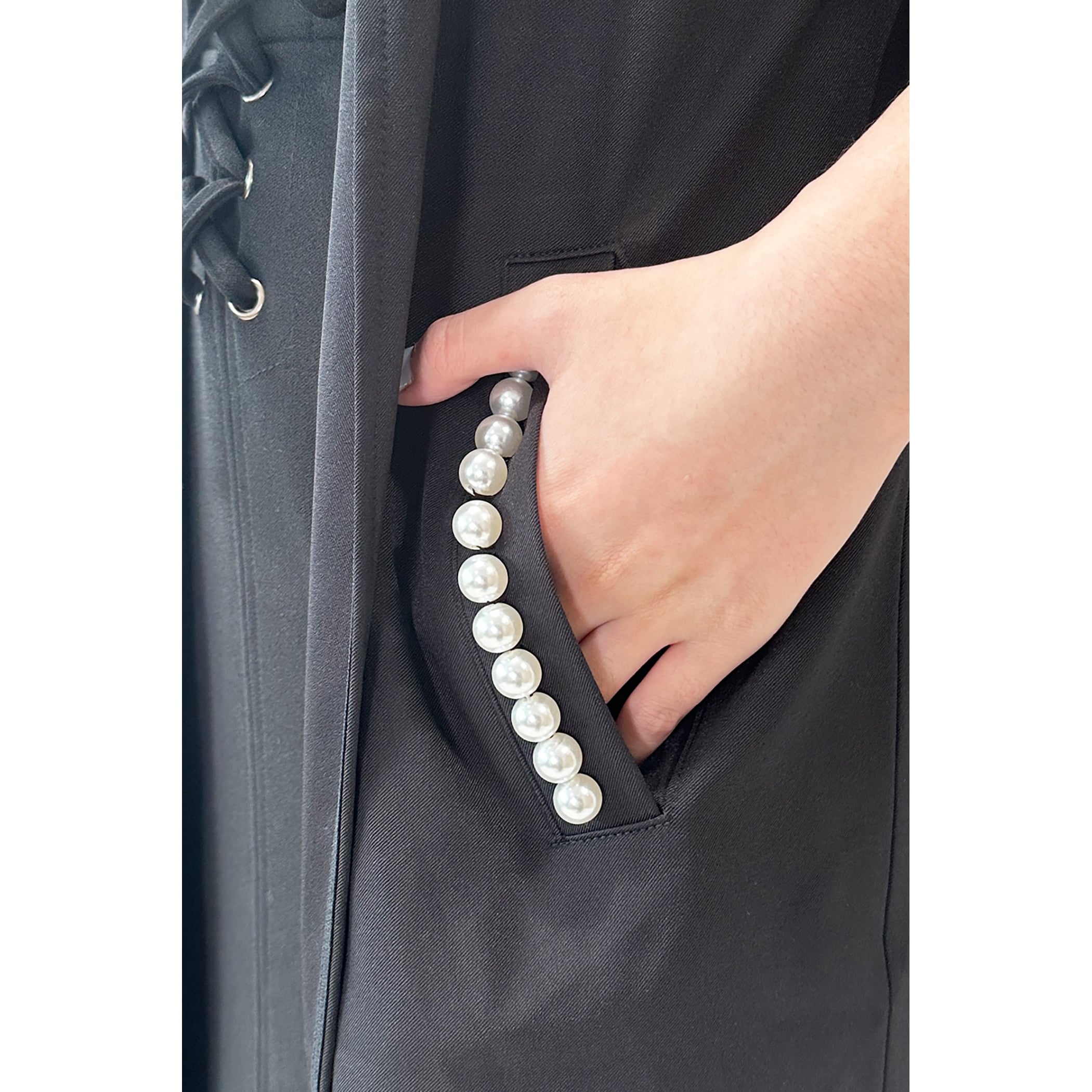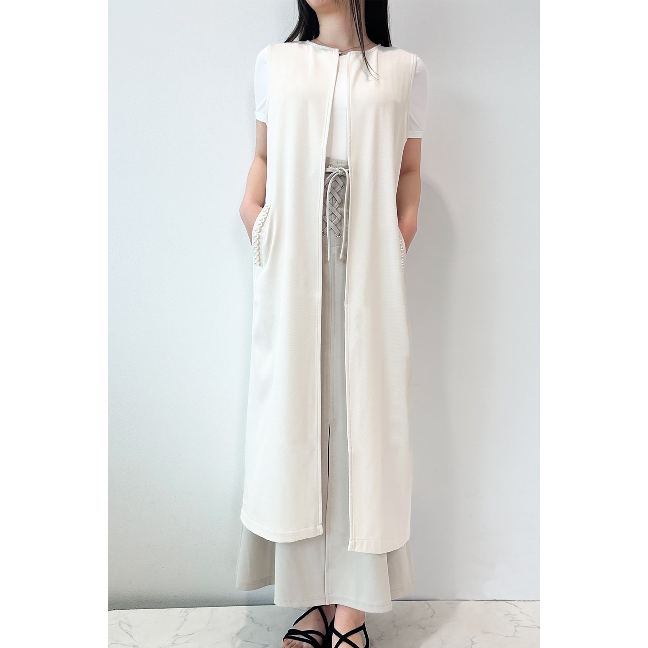 ポケットのパールが華やかなロングジレ。TシャツやロンTなどにさらっと羽織るだけでコーデが締まって見えます◎低身長・高身長でも着こなせれる丈感と、キレイなIラインでスタイルアップしてくれます。