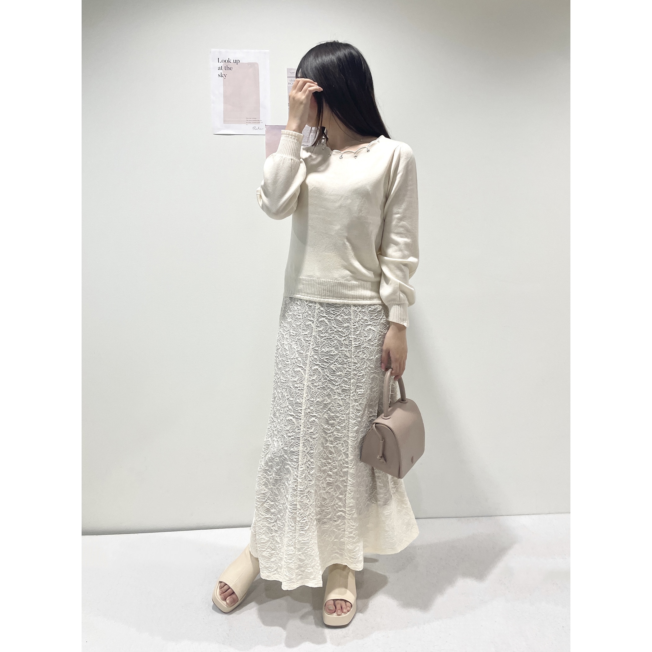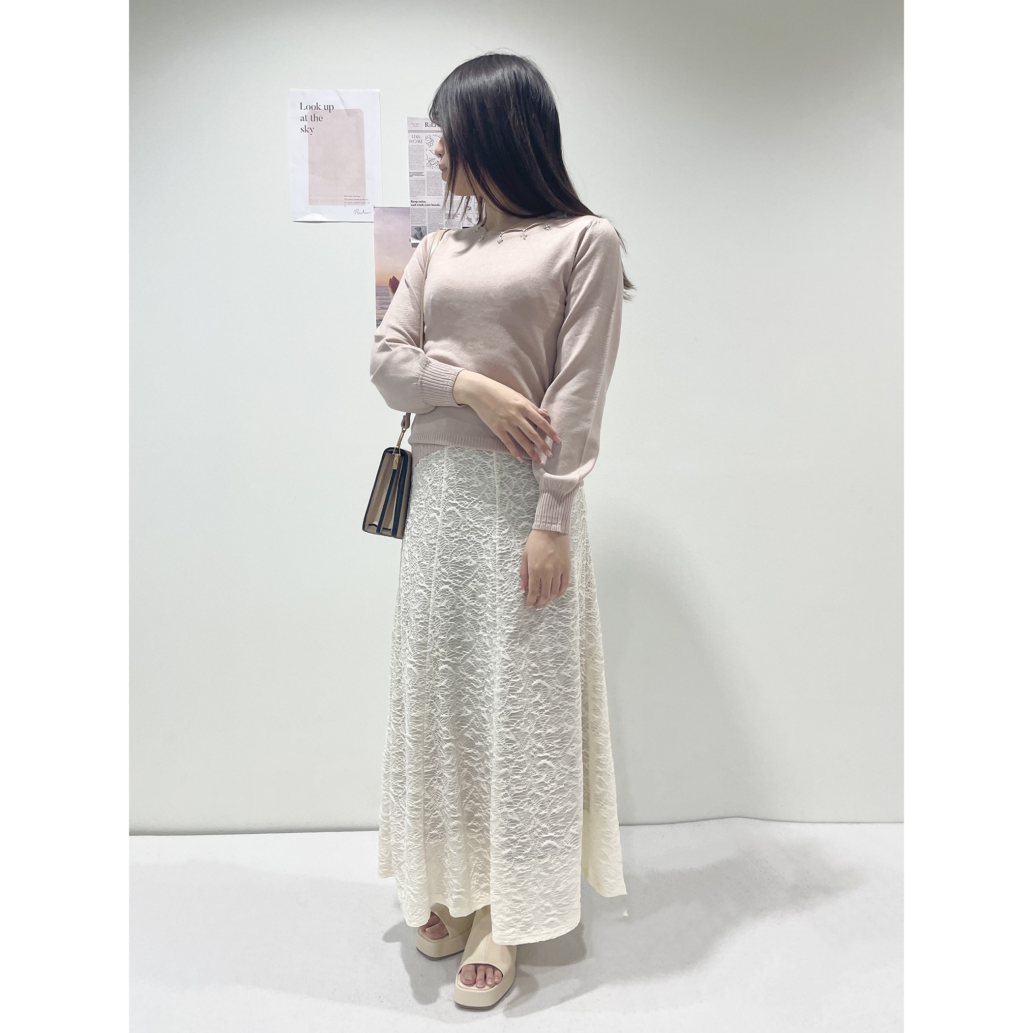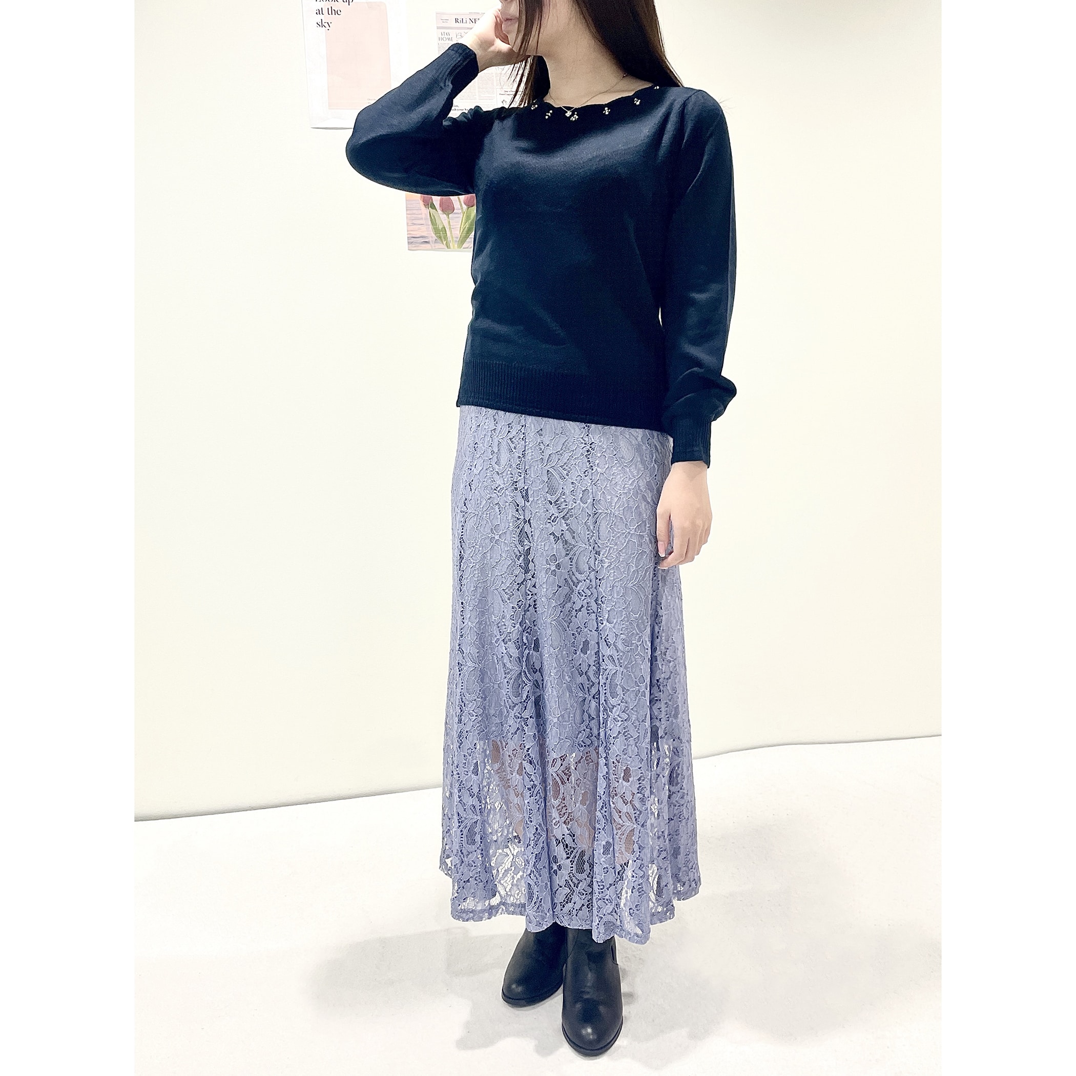 ビジューを飾ったスカラップの衿ぐりが華やかなプルオーバー。