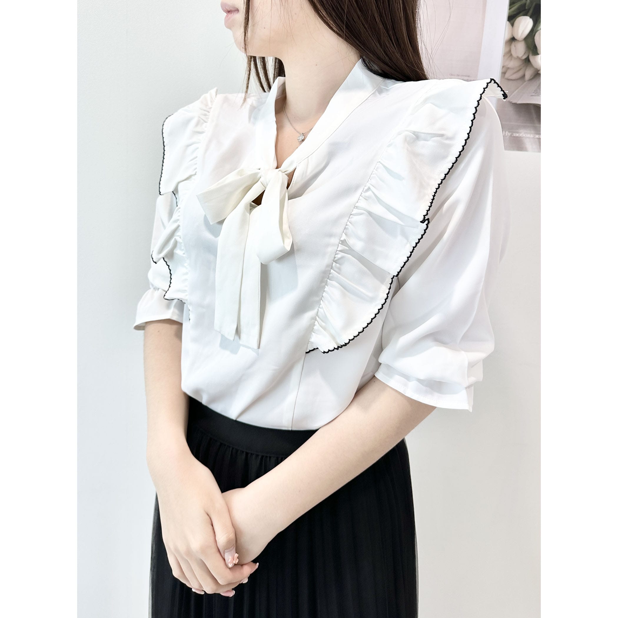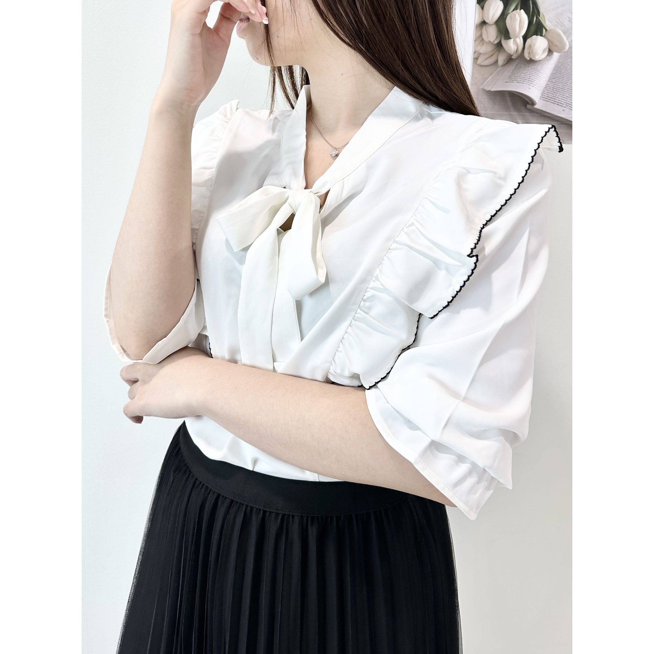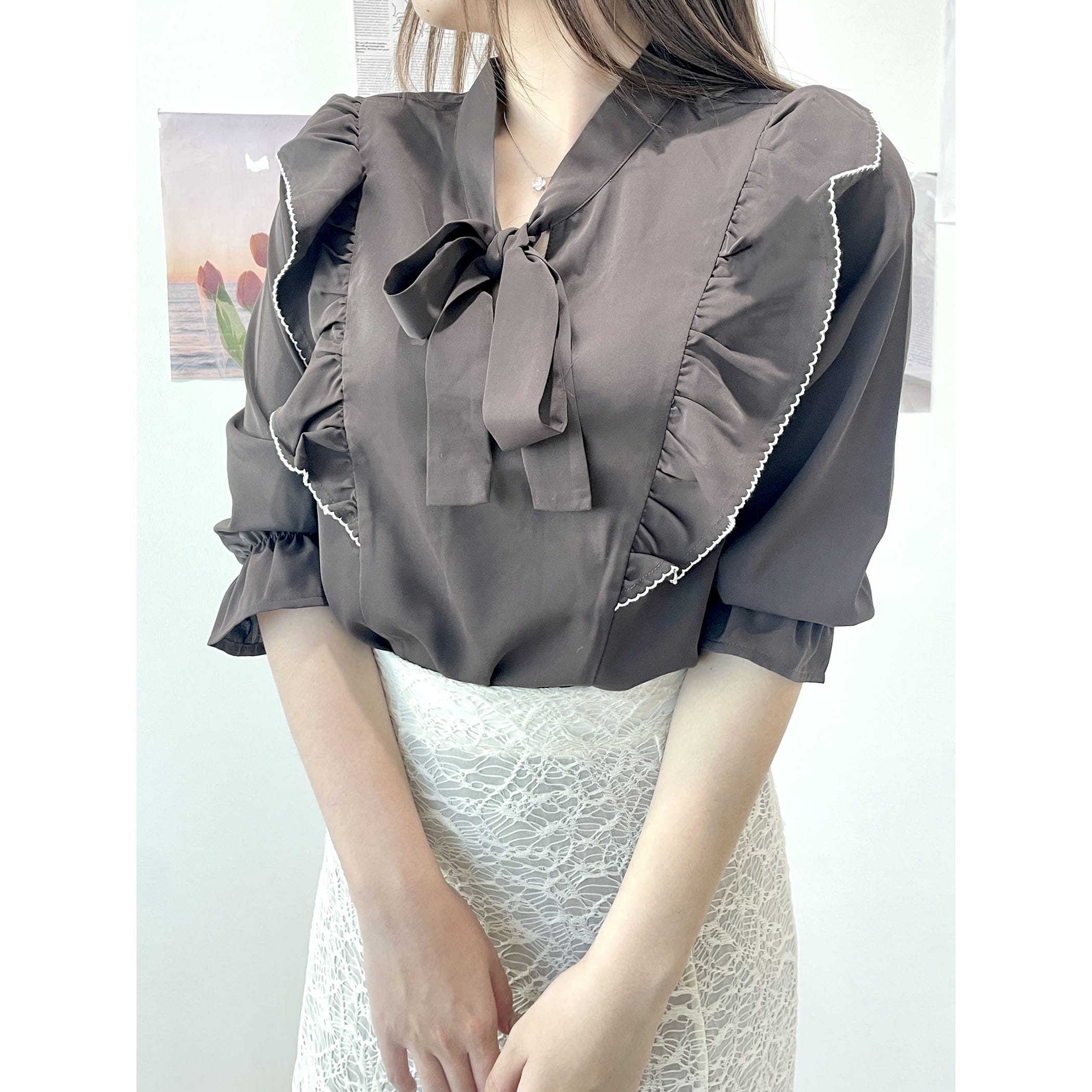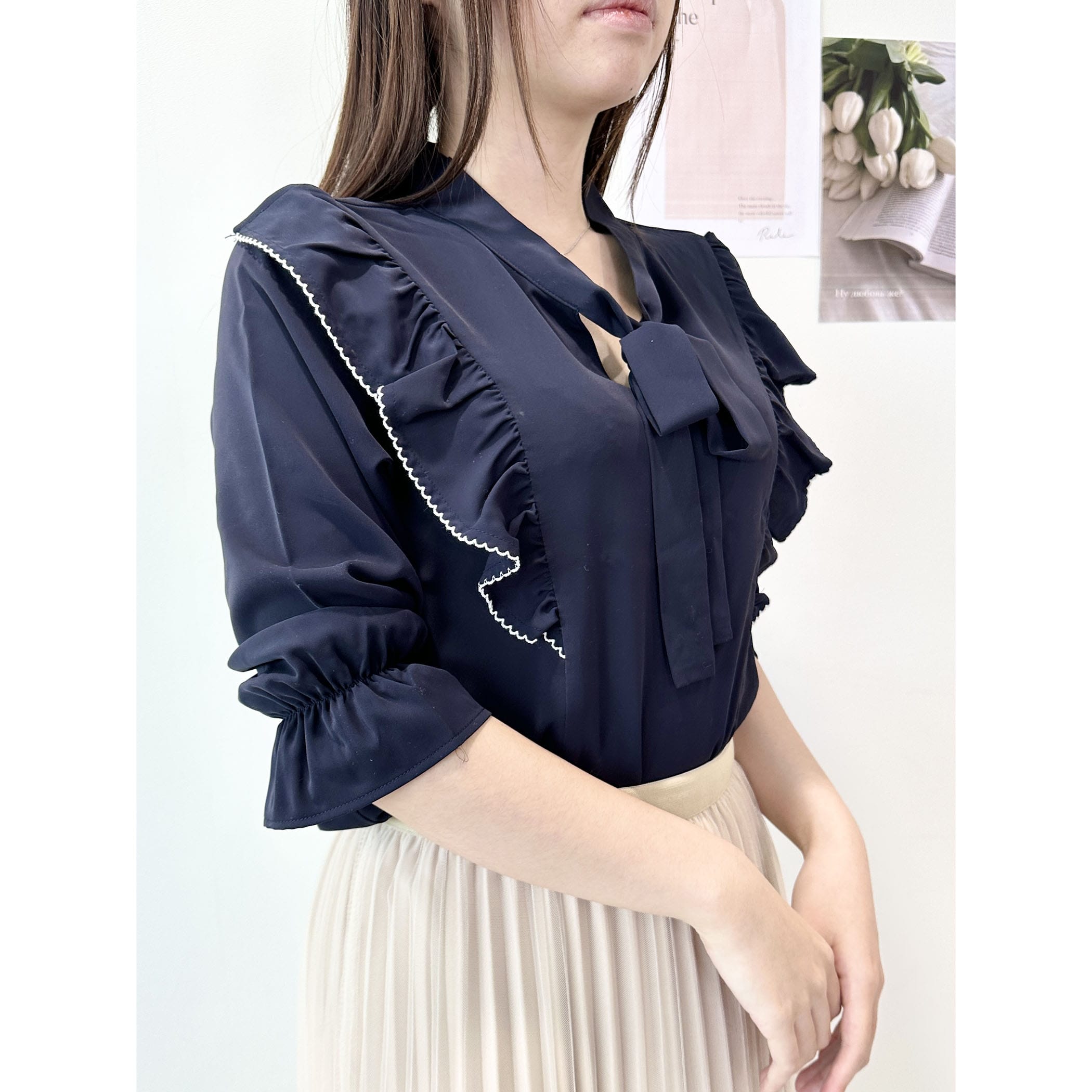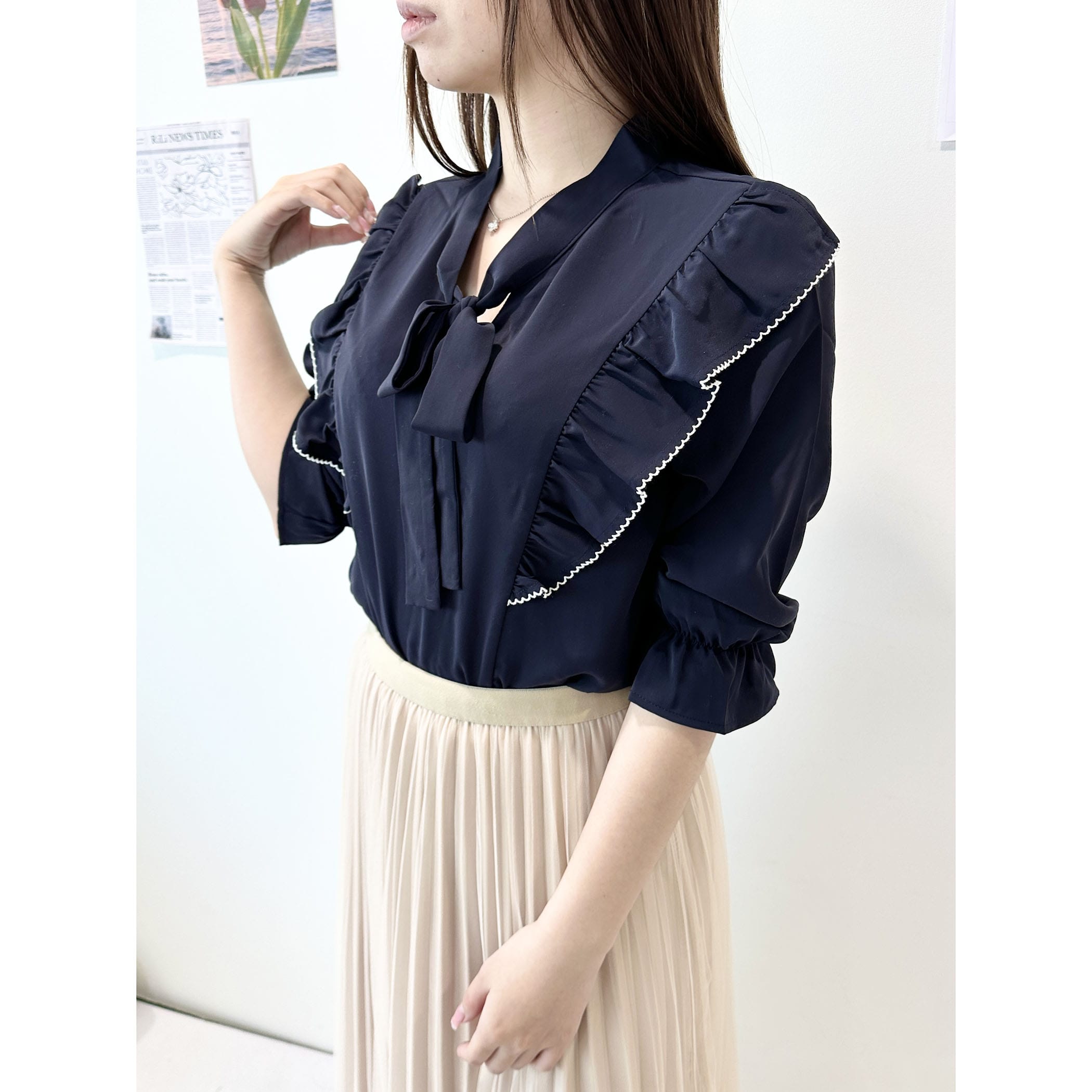 主役級にかわいいブラウス。ボウタイxフリルで一枚で華やかな印象に。袖口は、緩やかなゴムが入っているキャンディースリーブ。7分丈なので気になる二の腕をしっかりカバーしてくれます。スカートを合わせた着こなしはもちろん、キレイめパンツを合わせたスタイルも◎