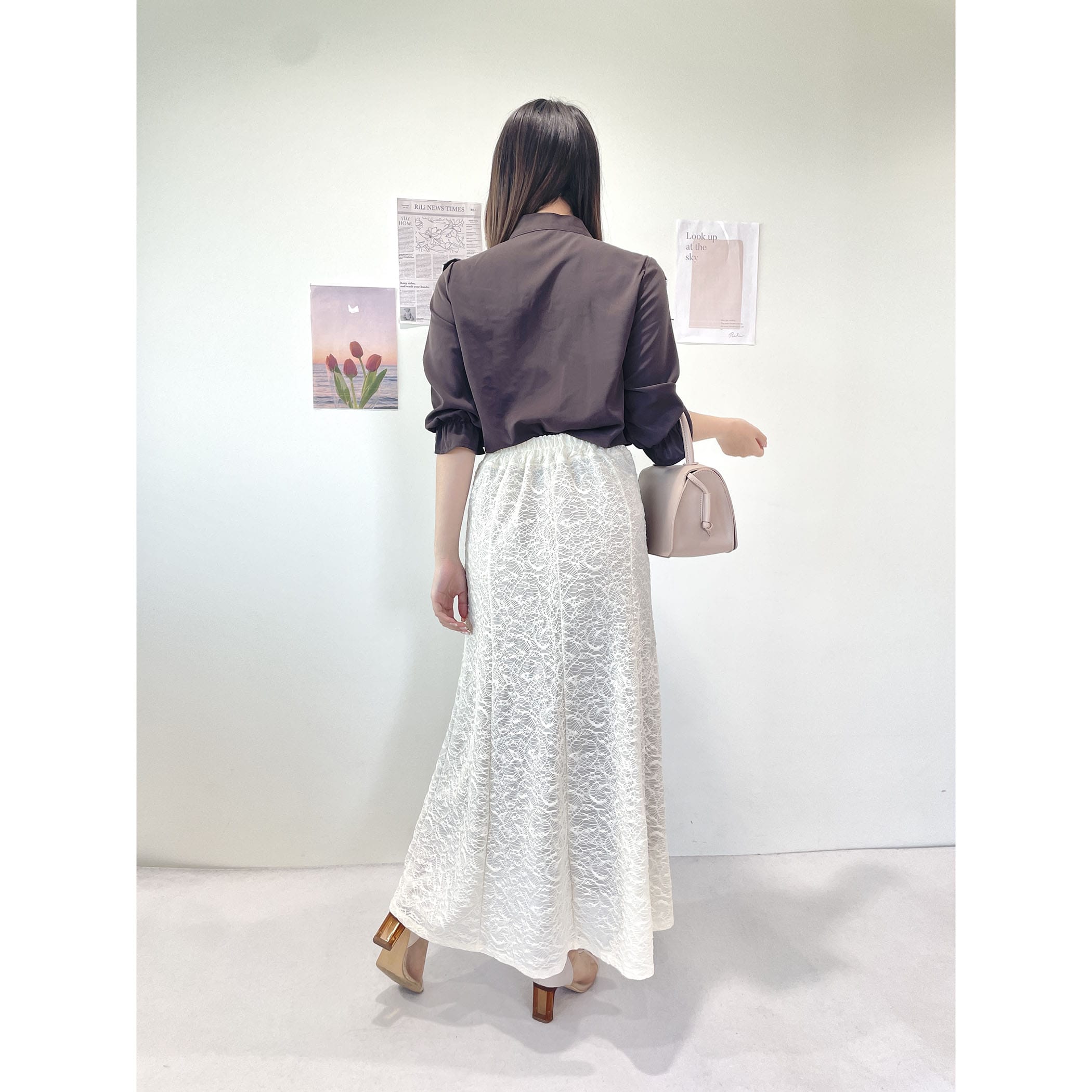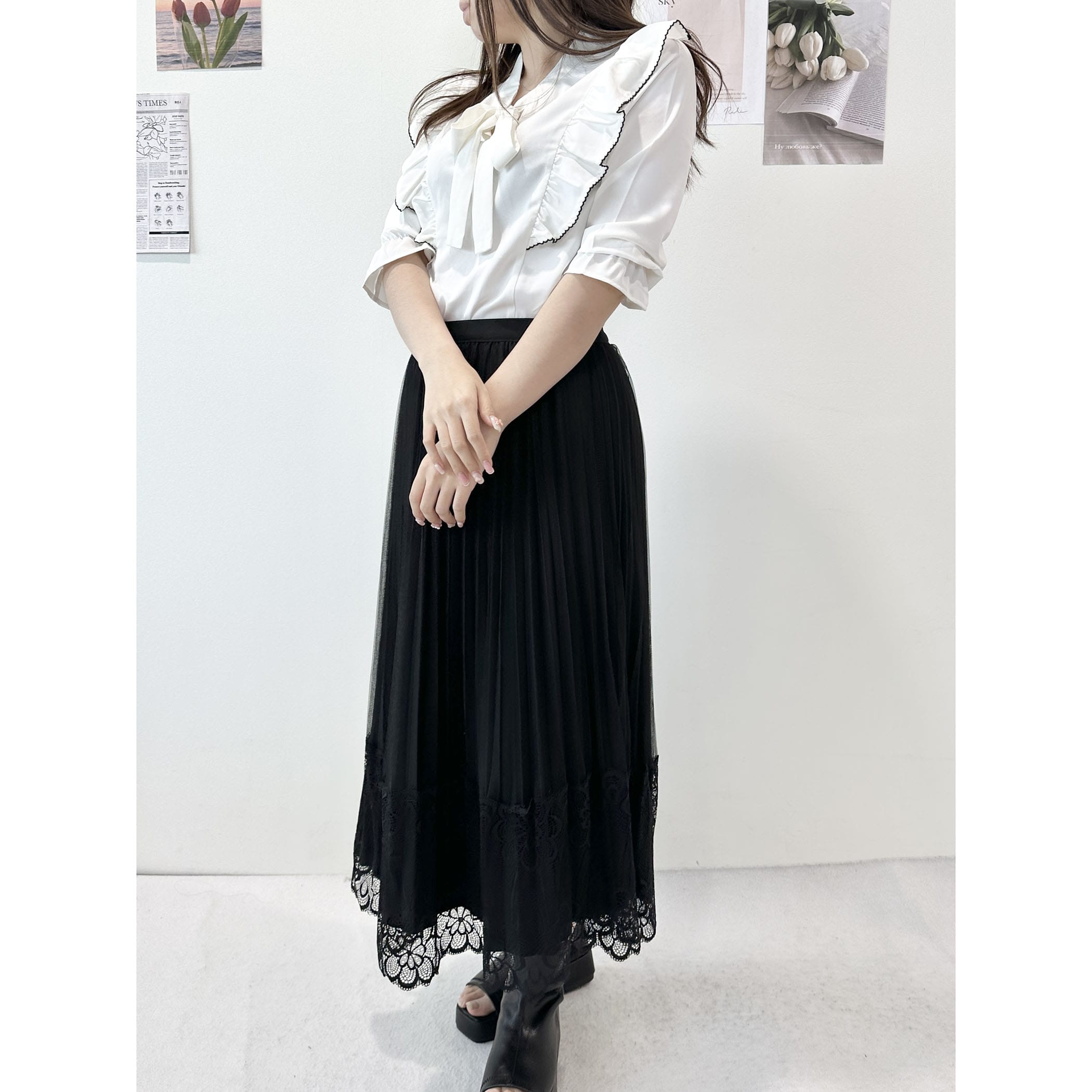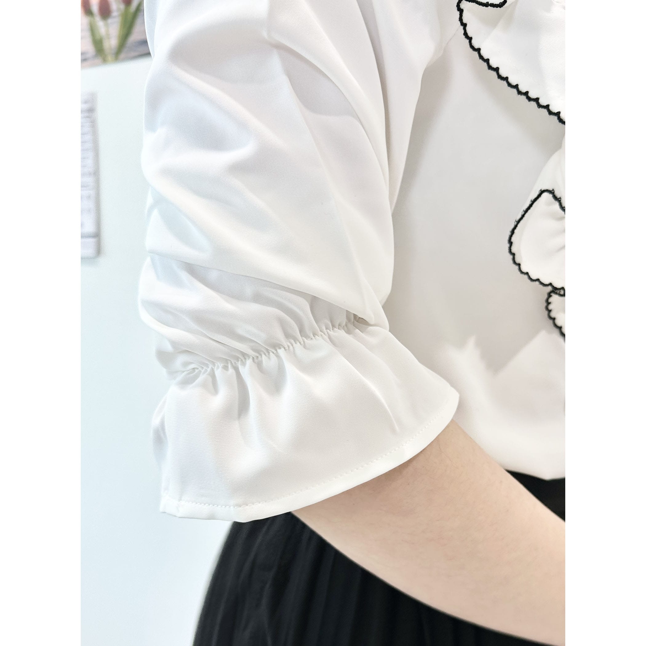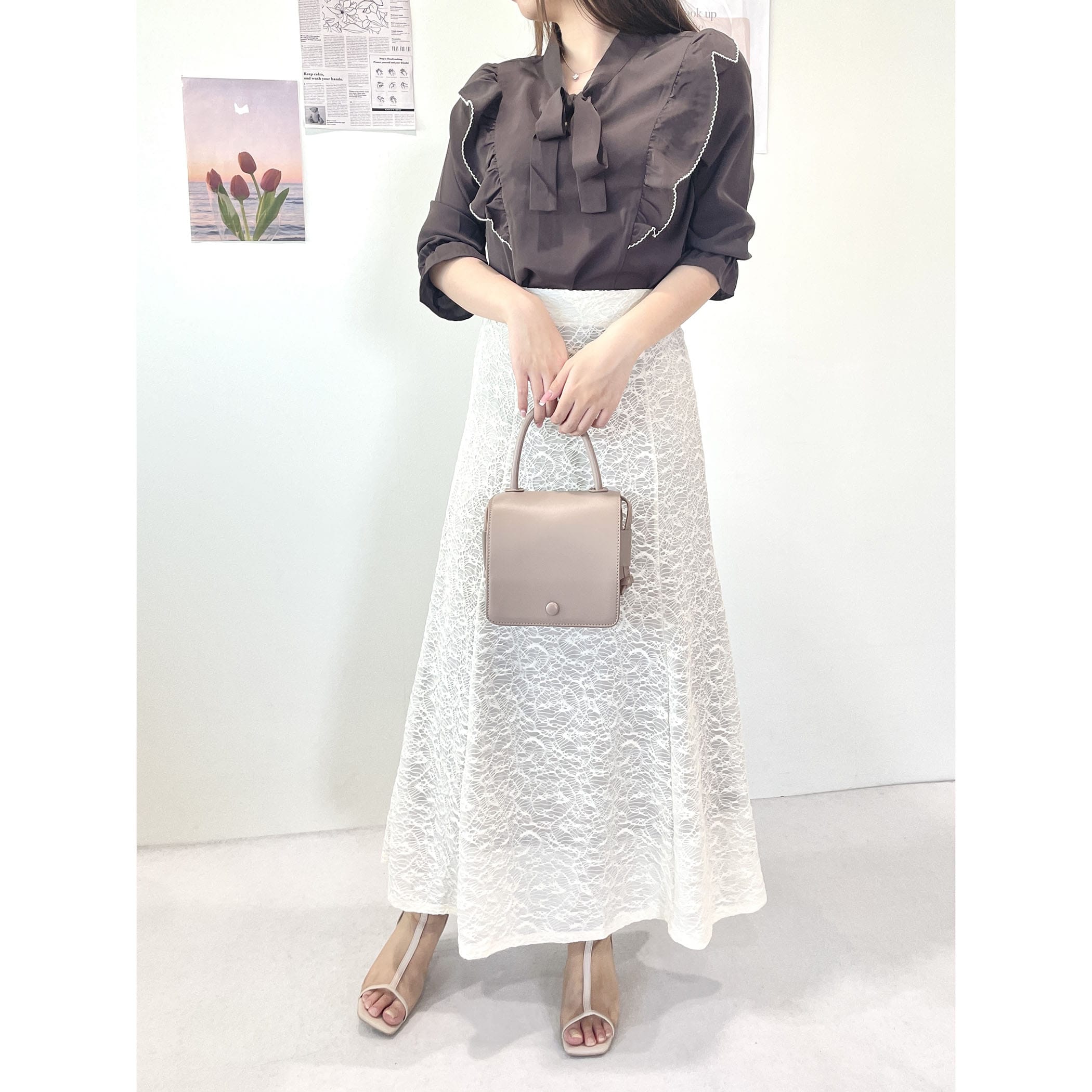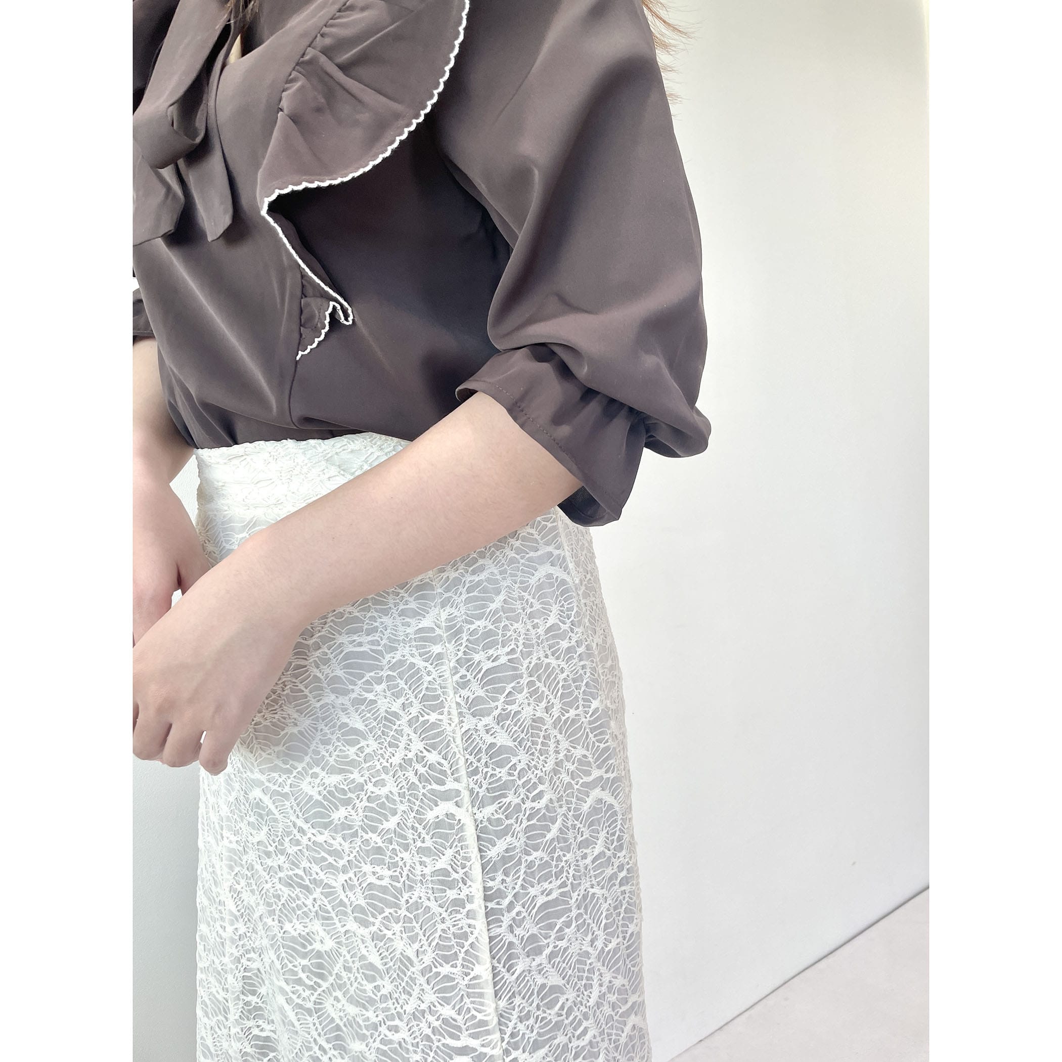 主役級にかわいいブラウス。ボウタイxフリルで一枚で華やかな印象に。袖口は、緩やかなゴムが入っているキャンディースリーブ。7分丈なので気になる二の腕をしっかりカバーしてくれます。スカートを合わせた着こなしはもちろん、キレイめパンツを合わせたスタイルも◎