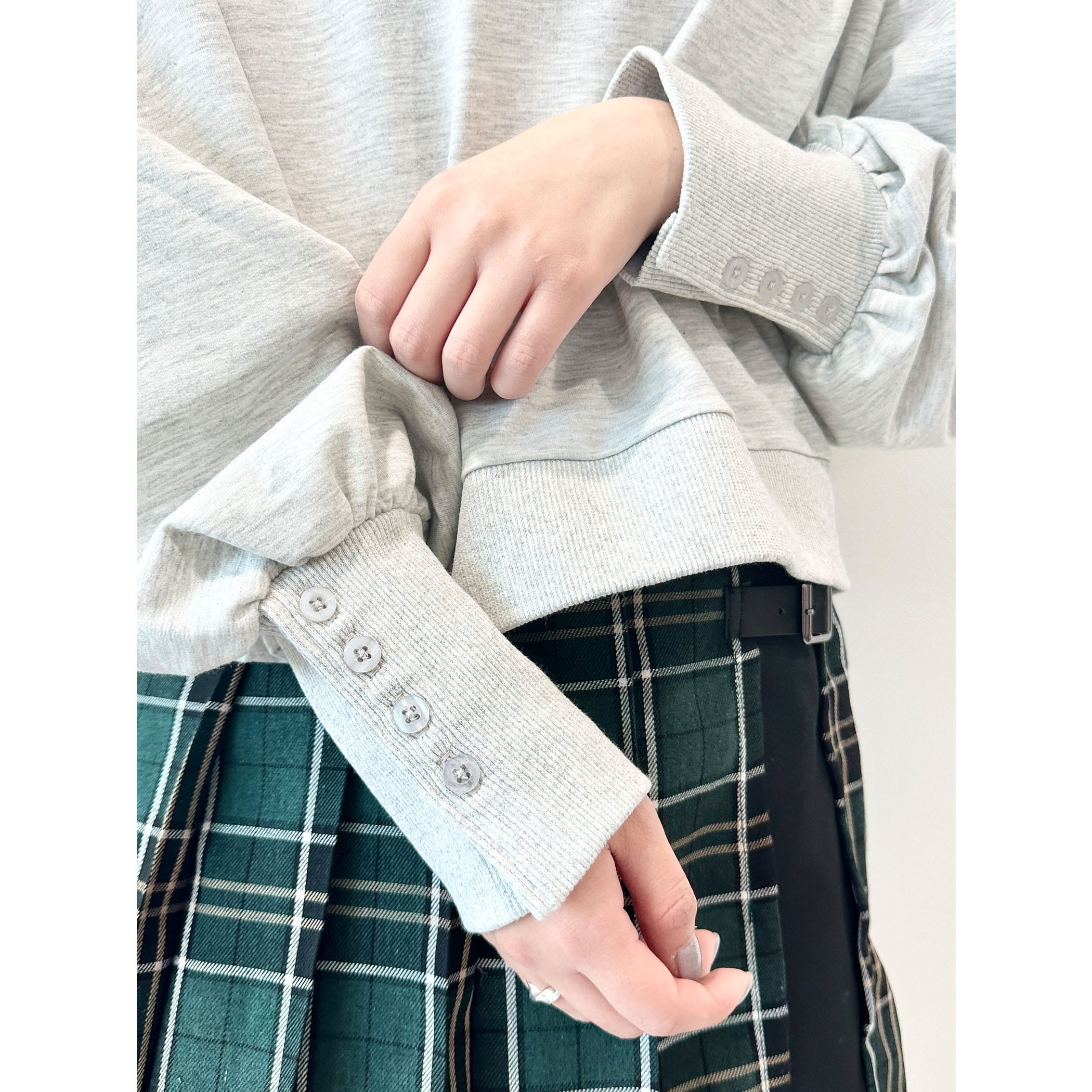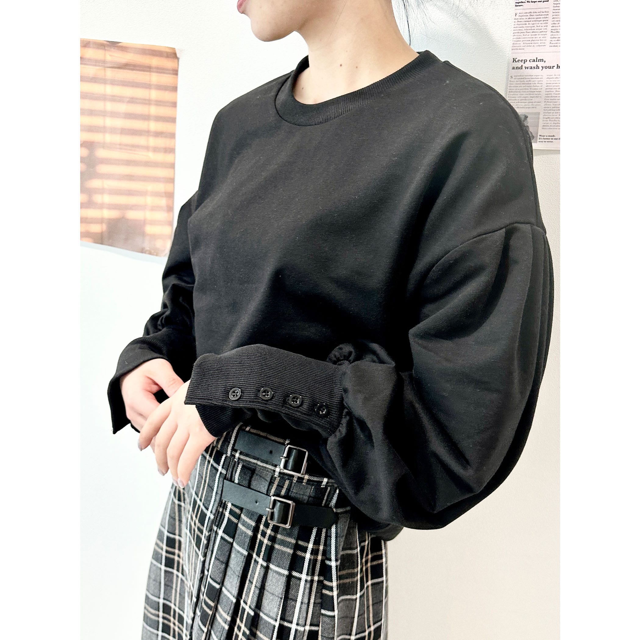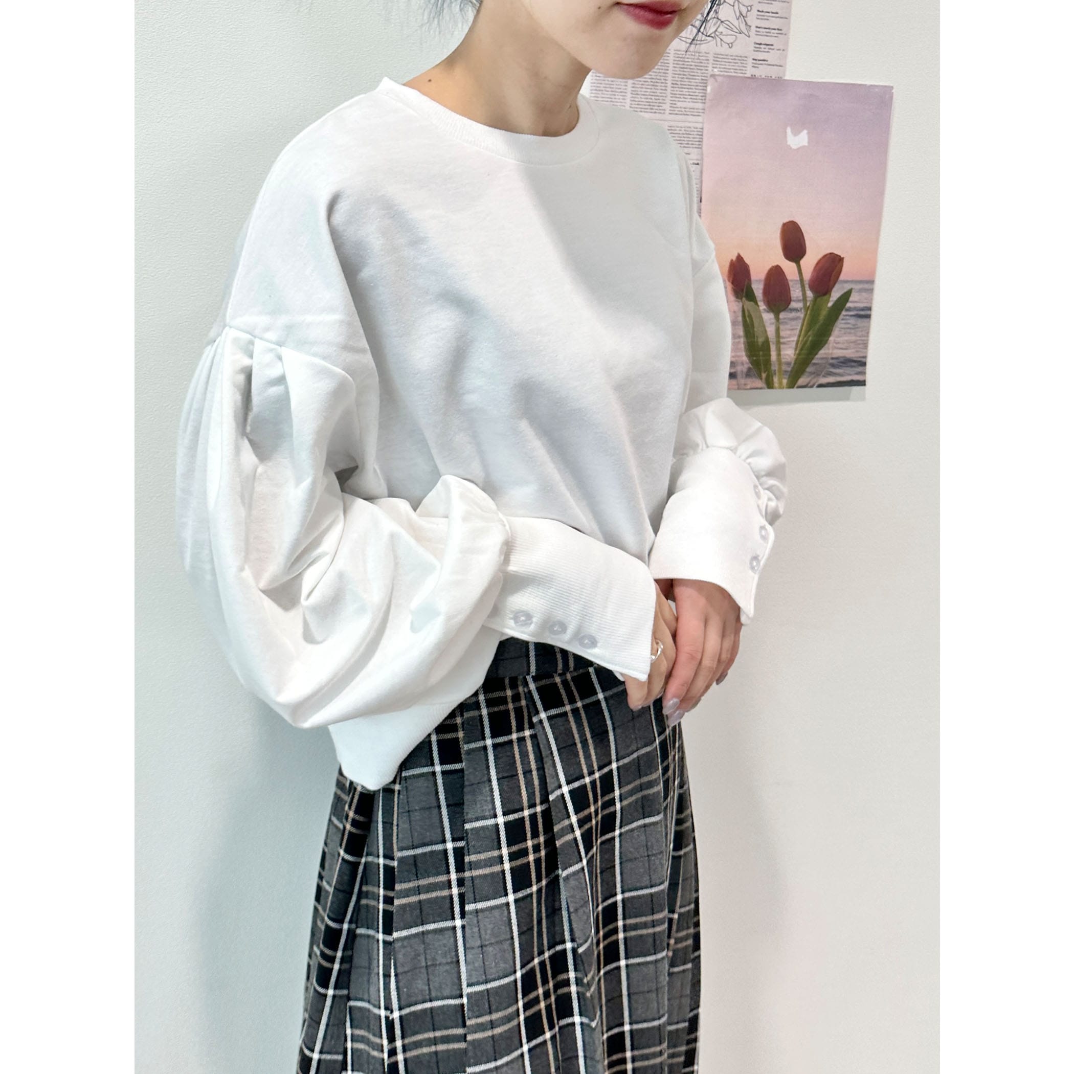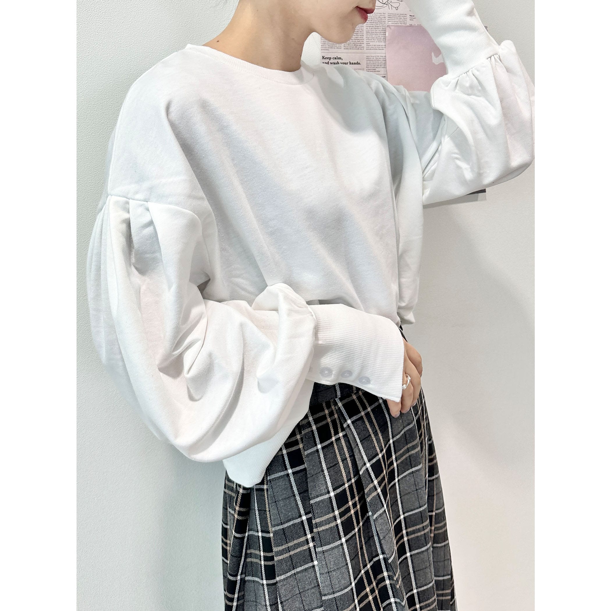 ふんわりとしたボリューム袖がフェミニンなショート丈プルオーバー。ミニ裏毛のサラッとした素材でロングシーズンお使いいただけます。ボリューム袖のふんわり感を活かす、長めの袖口の切り替えがメリハリのある女性らしいシルエットに。ロングカフス部分は釦付きでスリット仕様でトレンドライクなデザインになっています。ゆったりとしたオーバーサイズなシルエットにクロップド丈でバランスよく、ボトムを選ばずスタイリングしていただけます。