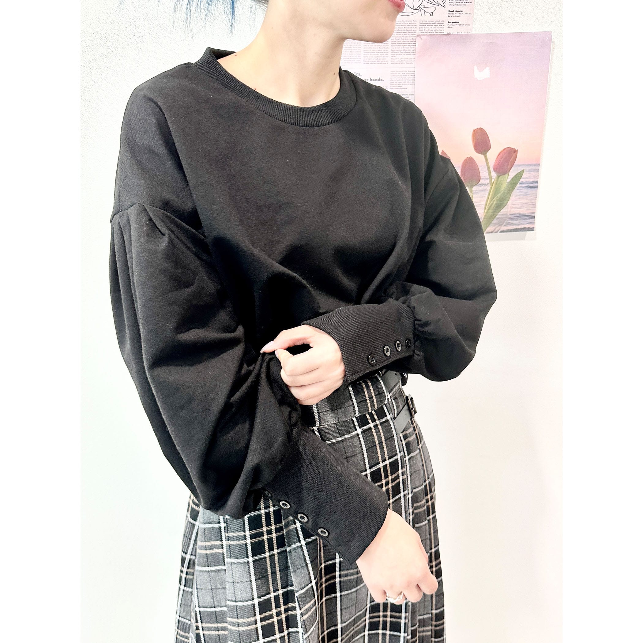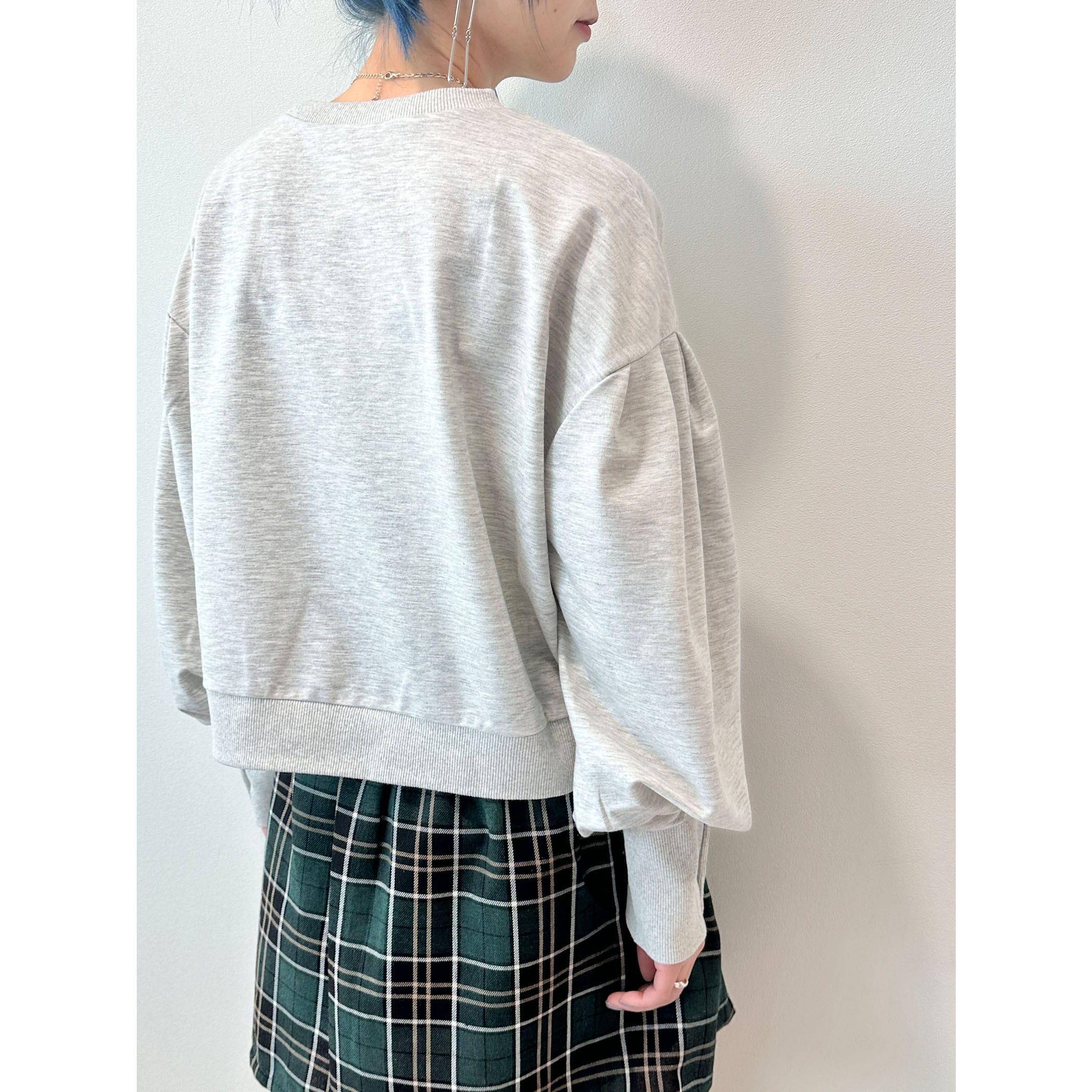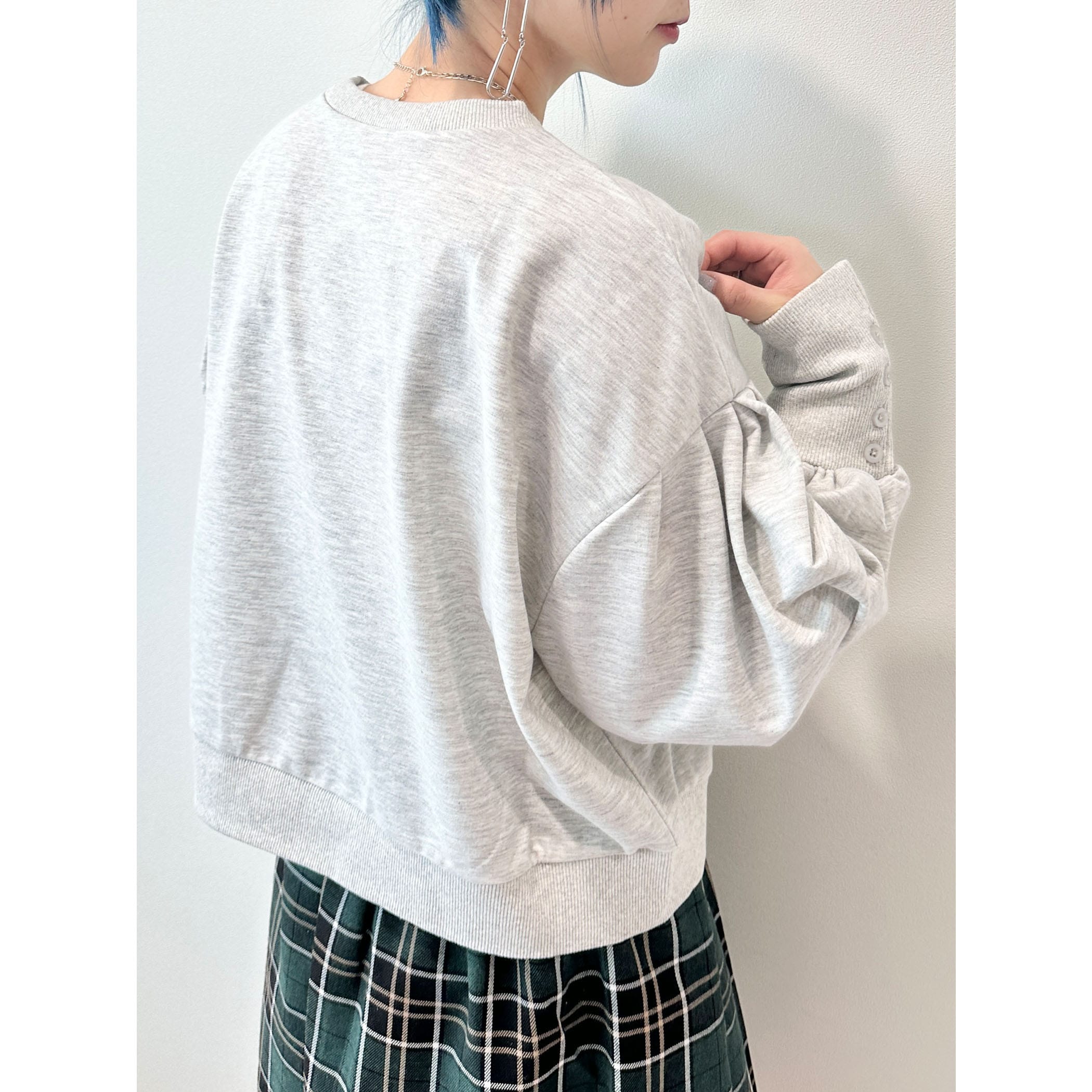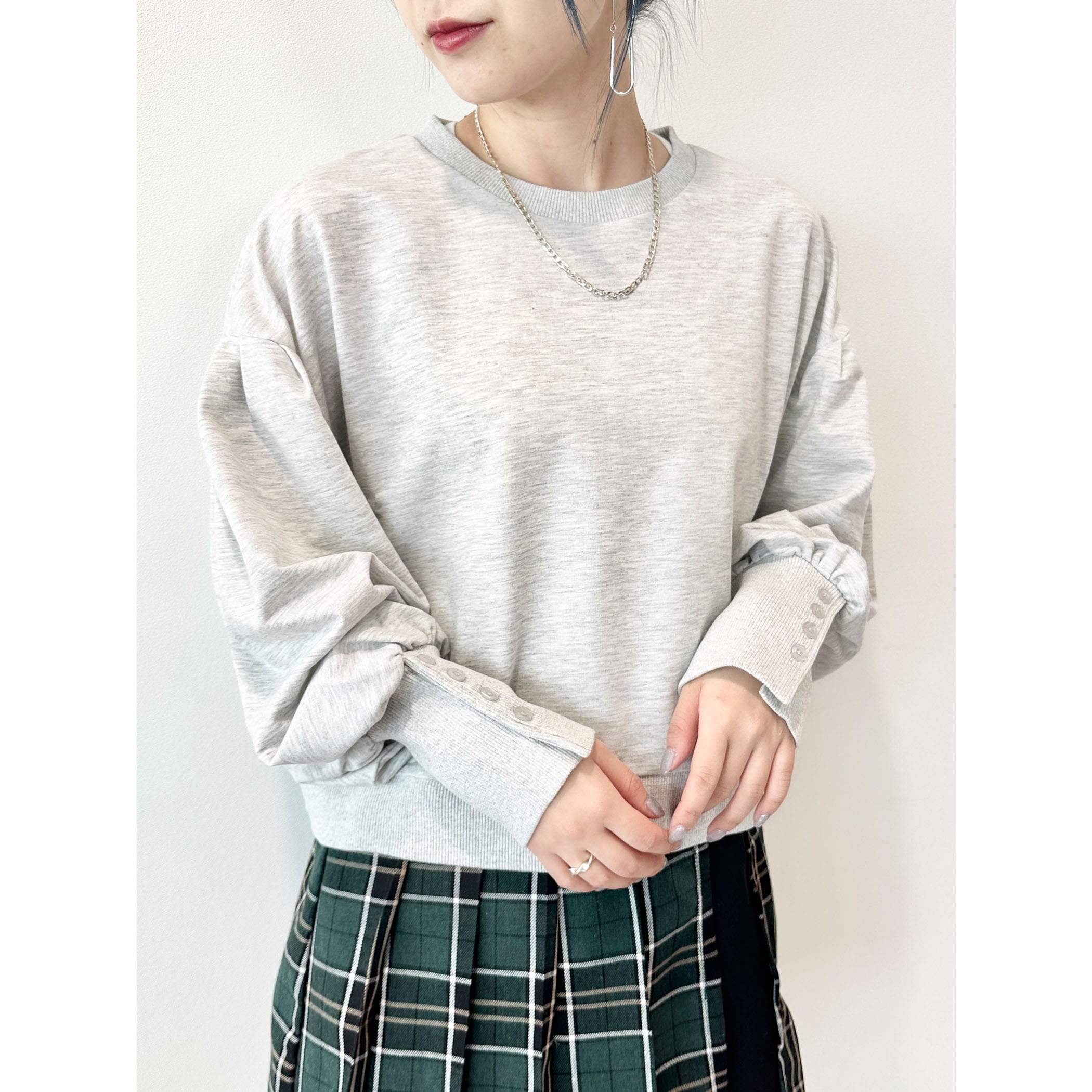 ふんわりとしたボリューム袖がフェミニンなショート丈プルオーバー。ミニ裏毛のサラッとした素材でロングシーズンお使いいただけます。ボリューム袖のふんわり感を活かす、長めの袖口の切り替えがメリハリのある女性らしいシルエットに。ロングカフス部分は釦付きでスリット仕様でトレンドライクなデザインになっています。ゆったりとしたオーバーサイズなシルエットにクロップド丈でバランスよく、ボトムを選ばずスタイリングしていただけます。