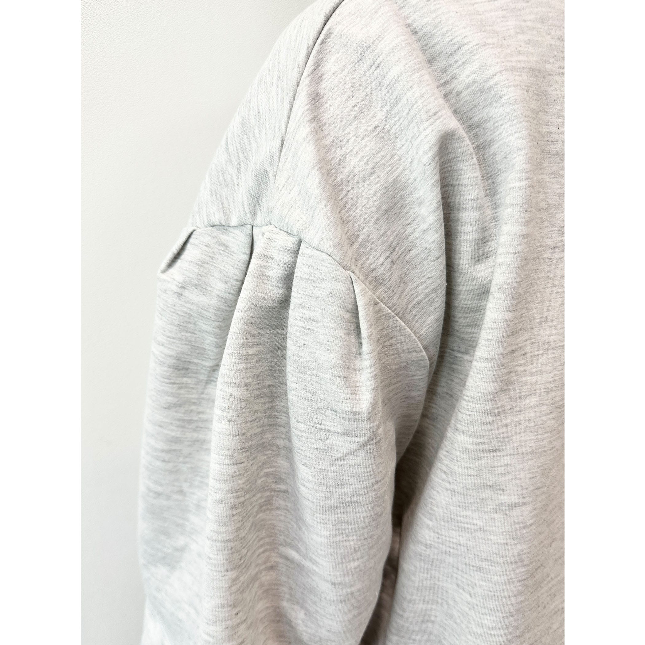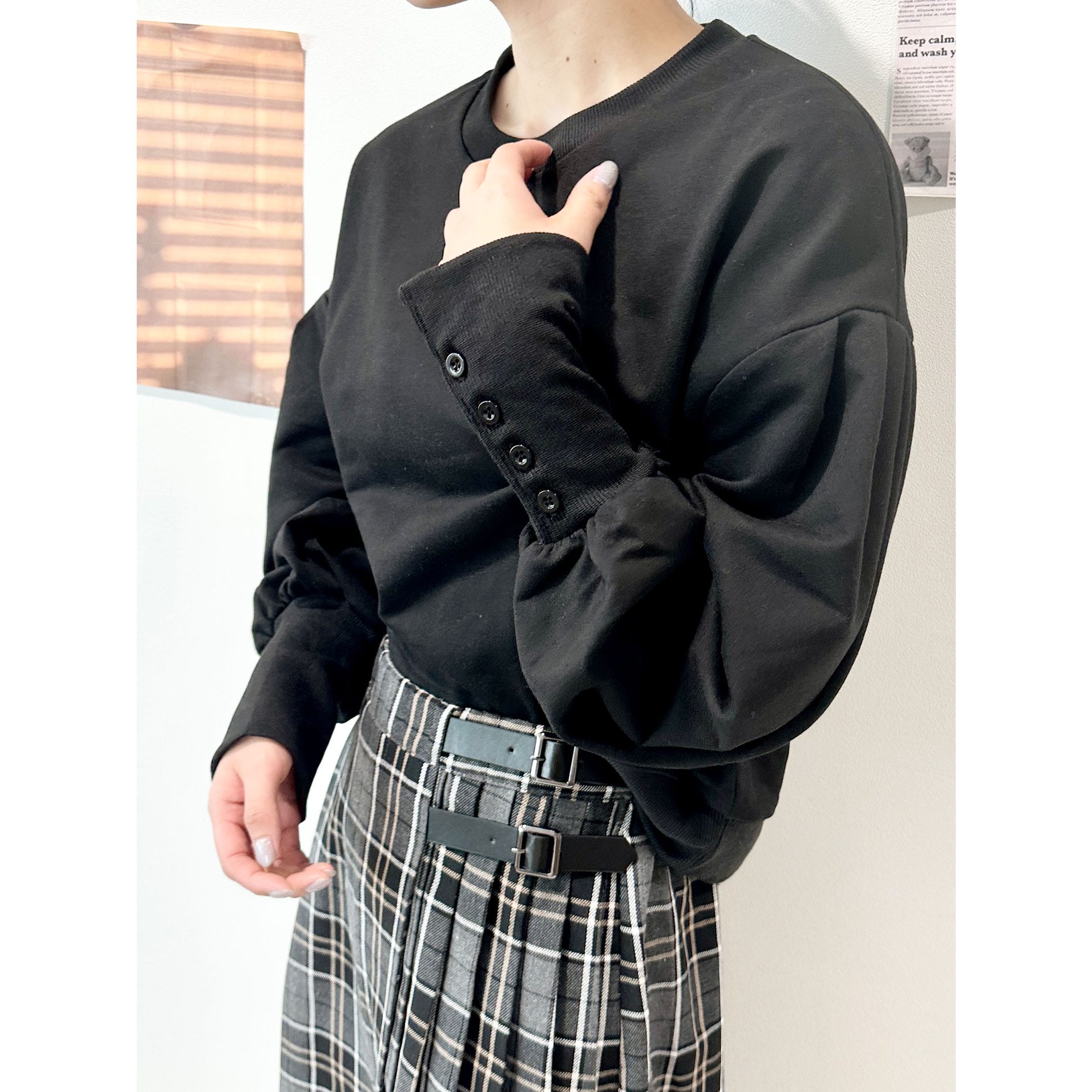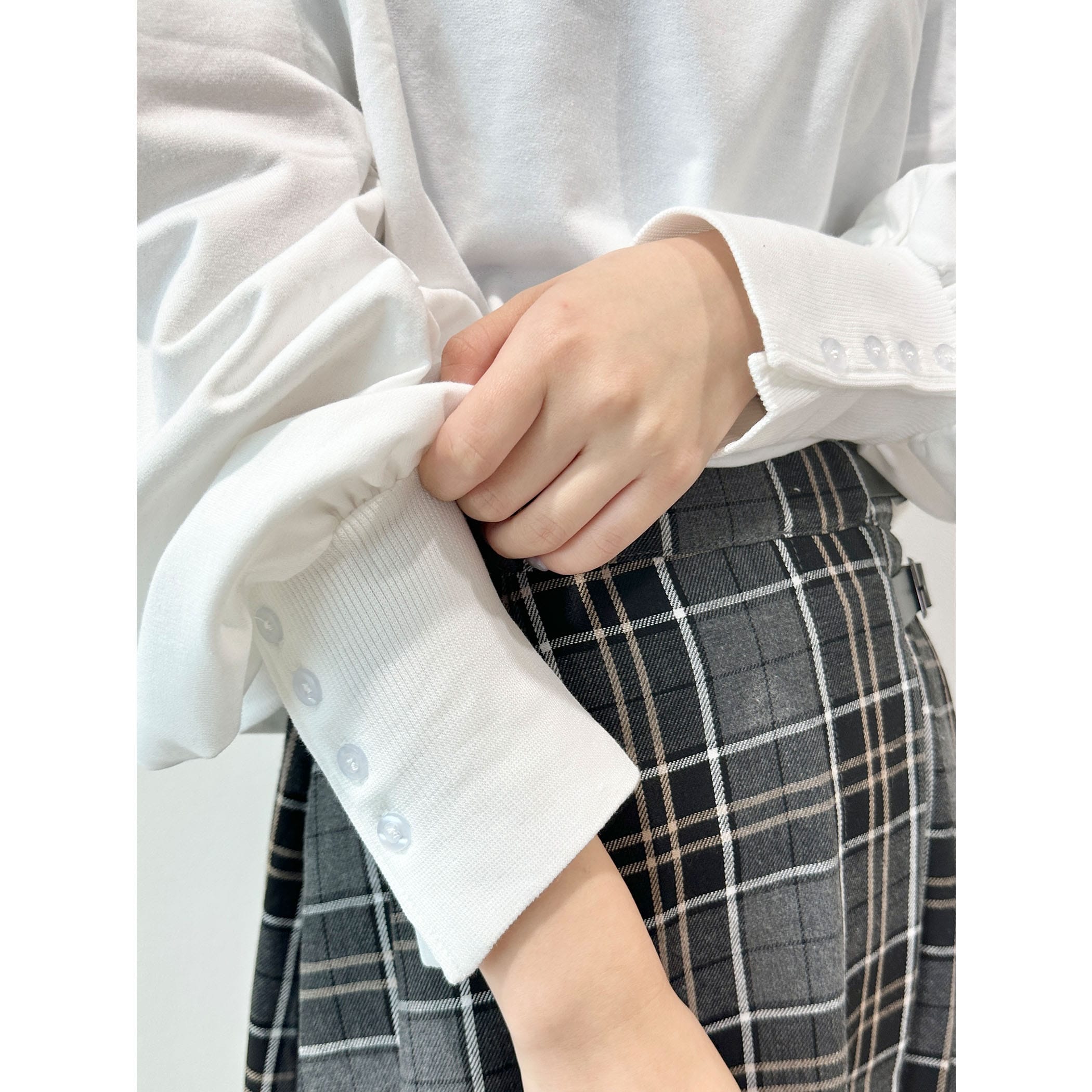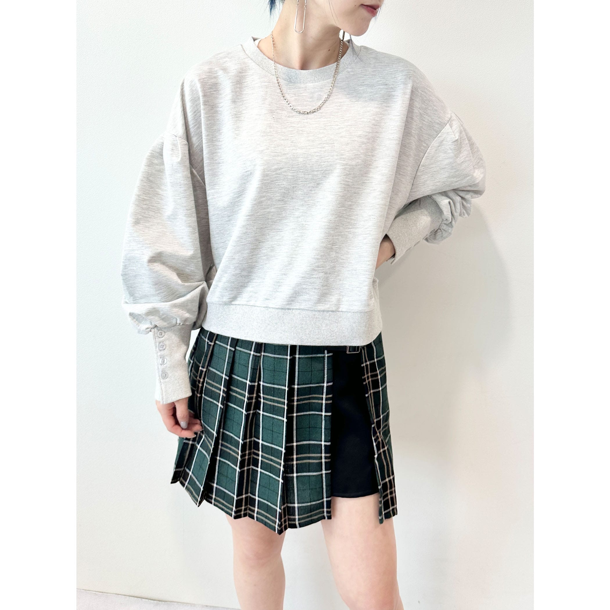 ふんわりとしたボリューム袖がフェミニンなショート丈プルオーバー。ミニ裏毛のサラッとした素材でロングシーズンお使いいただけます。ボリューム袖のふんわり感を活かす、長めの袖口の切り替えがメリハリのある女性らしいシルエットに。ロングカフス部分は釦付きでスリット仕様でトレンドライクなデザインになっています。ゆったりとしたオーバーサイズなシルエットにクロップド丈でバランスよく、ボトムを選ばずスタイリングしていただけます。