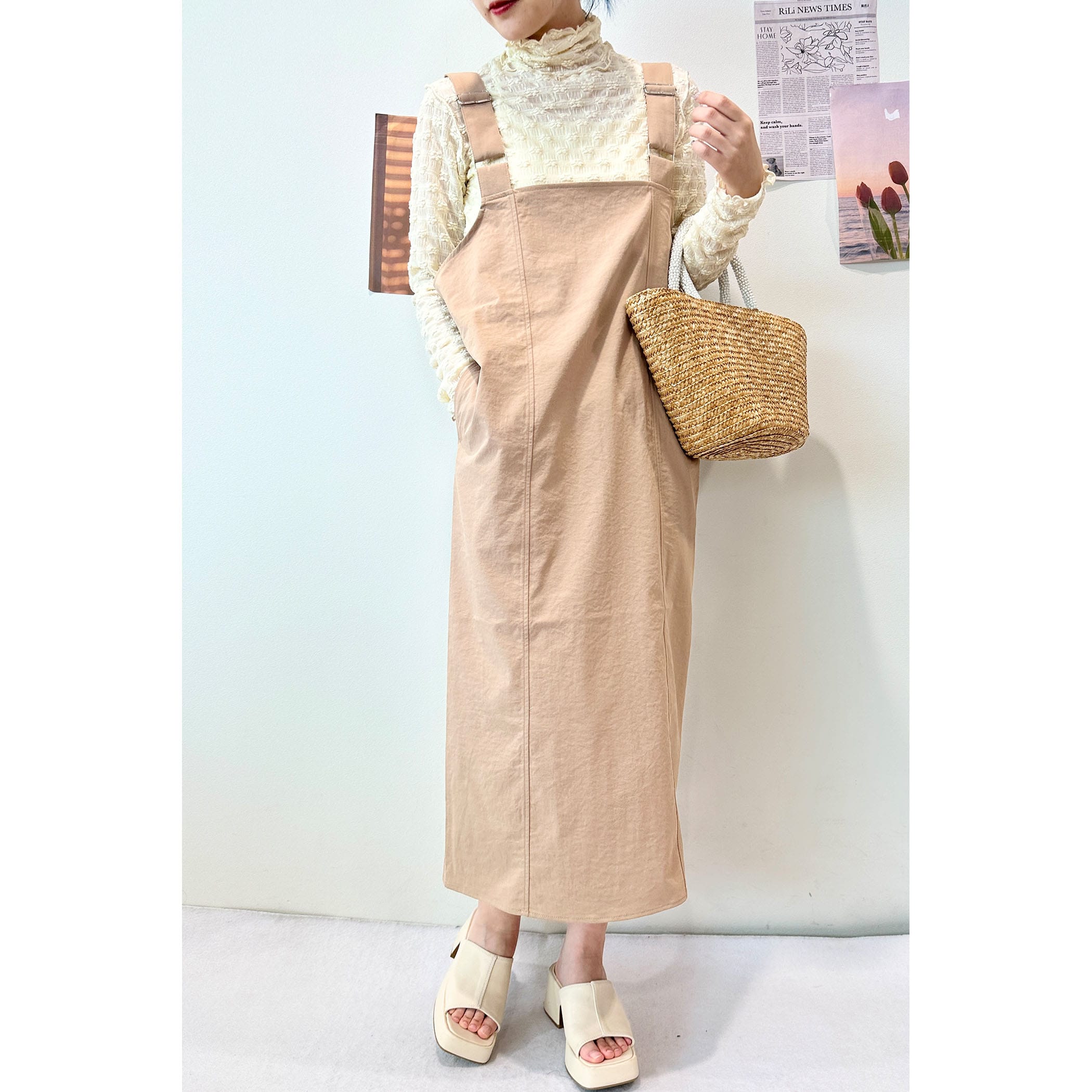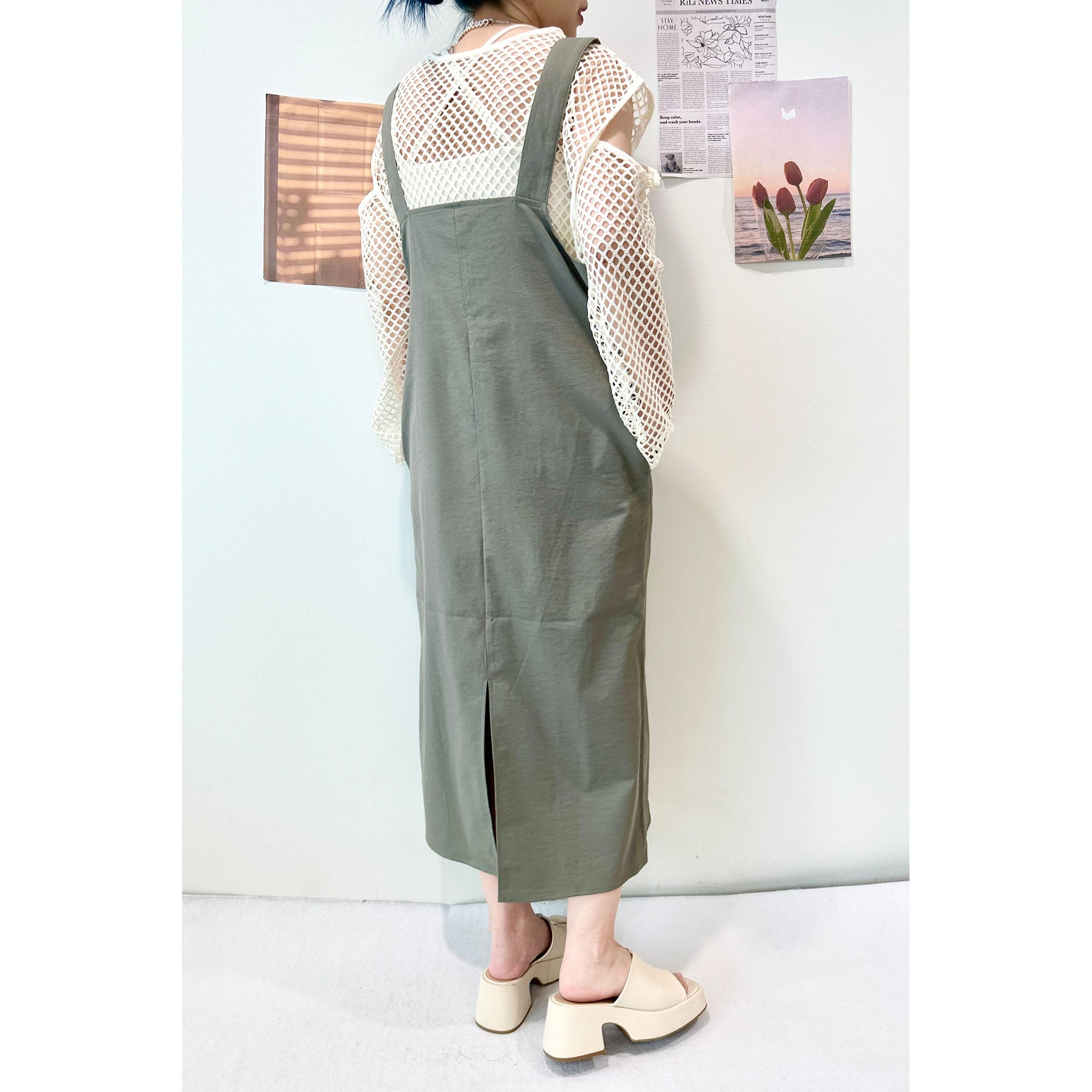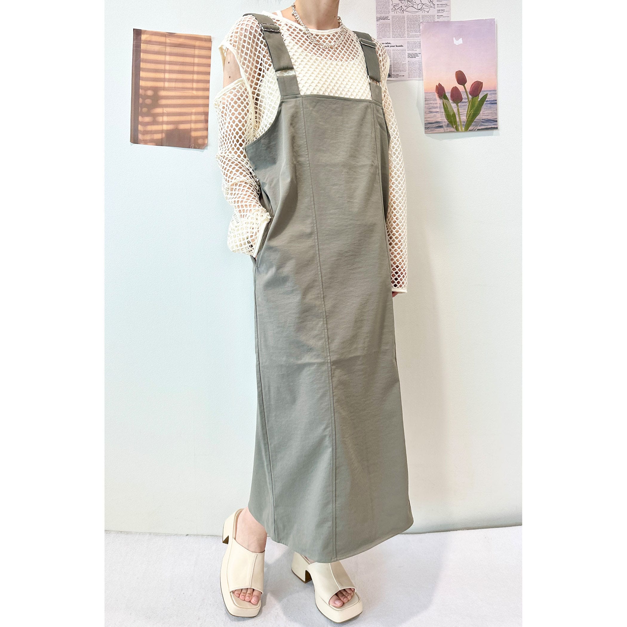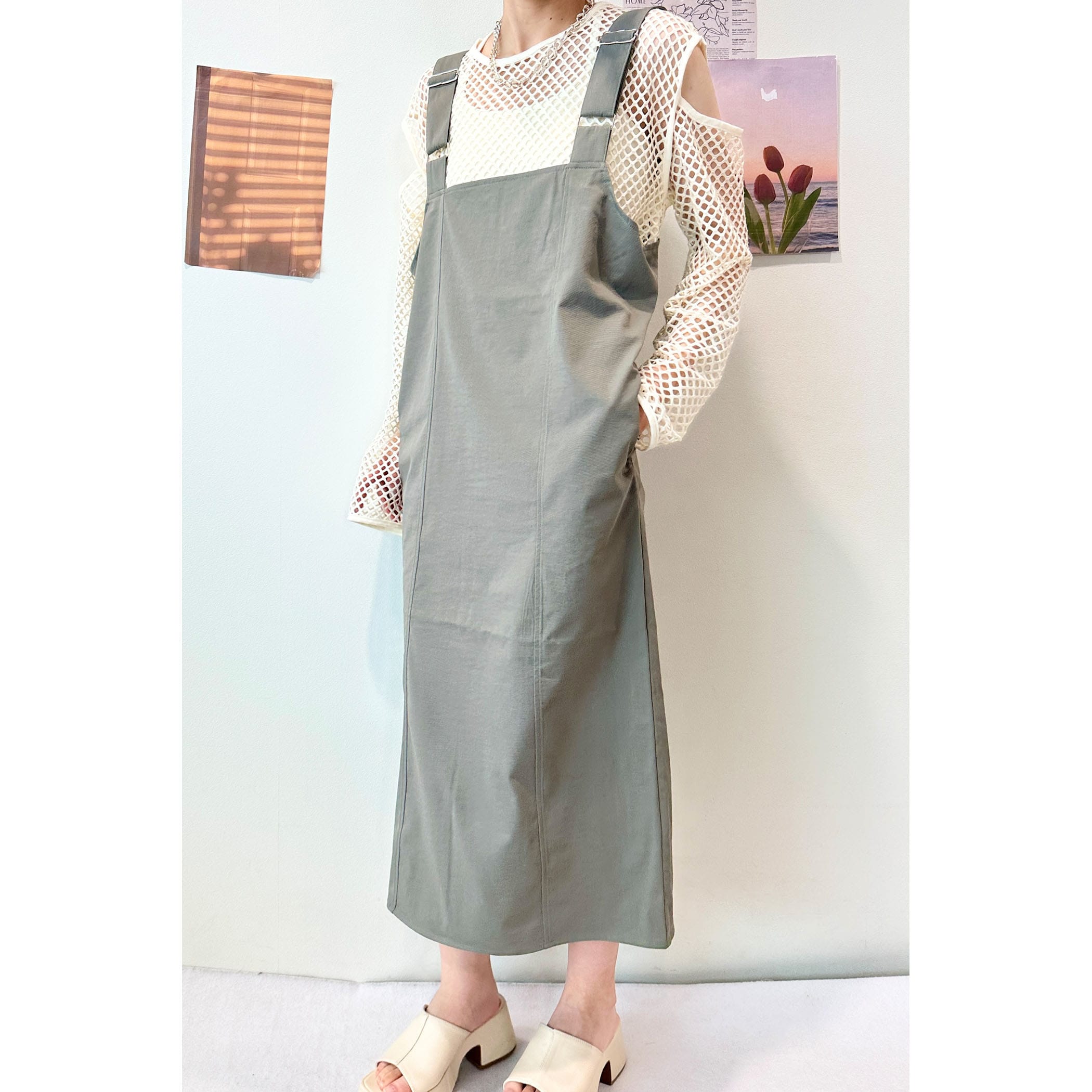今期トレンドのジャンスカをワークムードで展開。肩紐がベルト調の素材になっていて両脇にポケットが付いた価値観のある一枚です。スウェットやTシャツと合わせるとカジュアルに、レースインナーやメロートップスと合わせていただくと程よくフェミニンにコーディネートいただけます。レイヤードスタイルにオススメのアイテムです。
