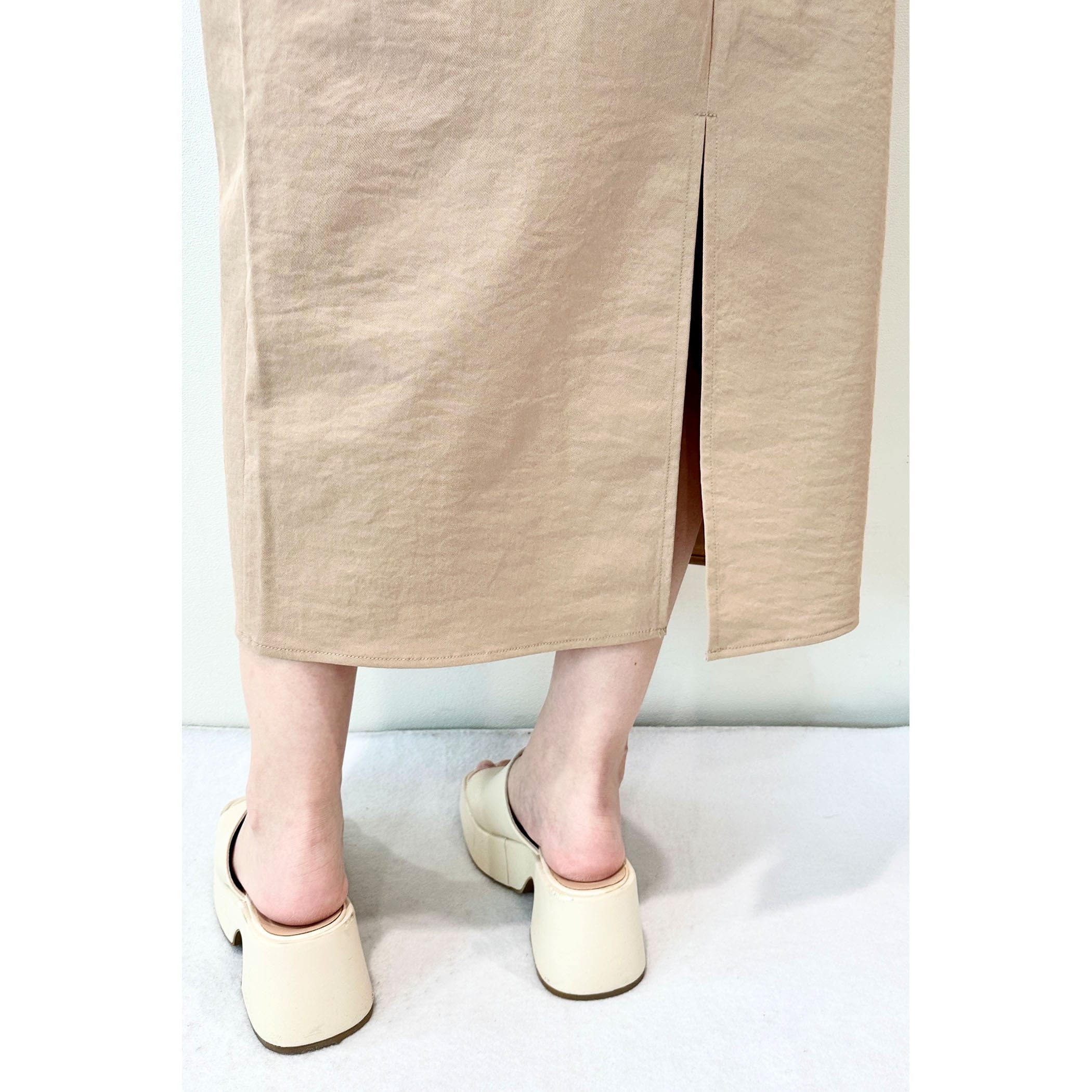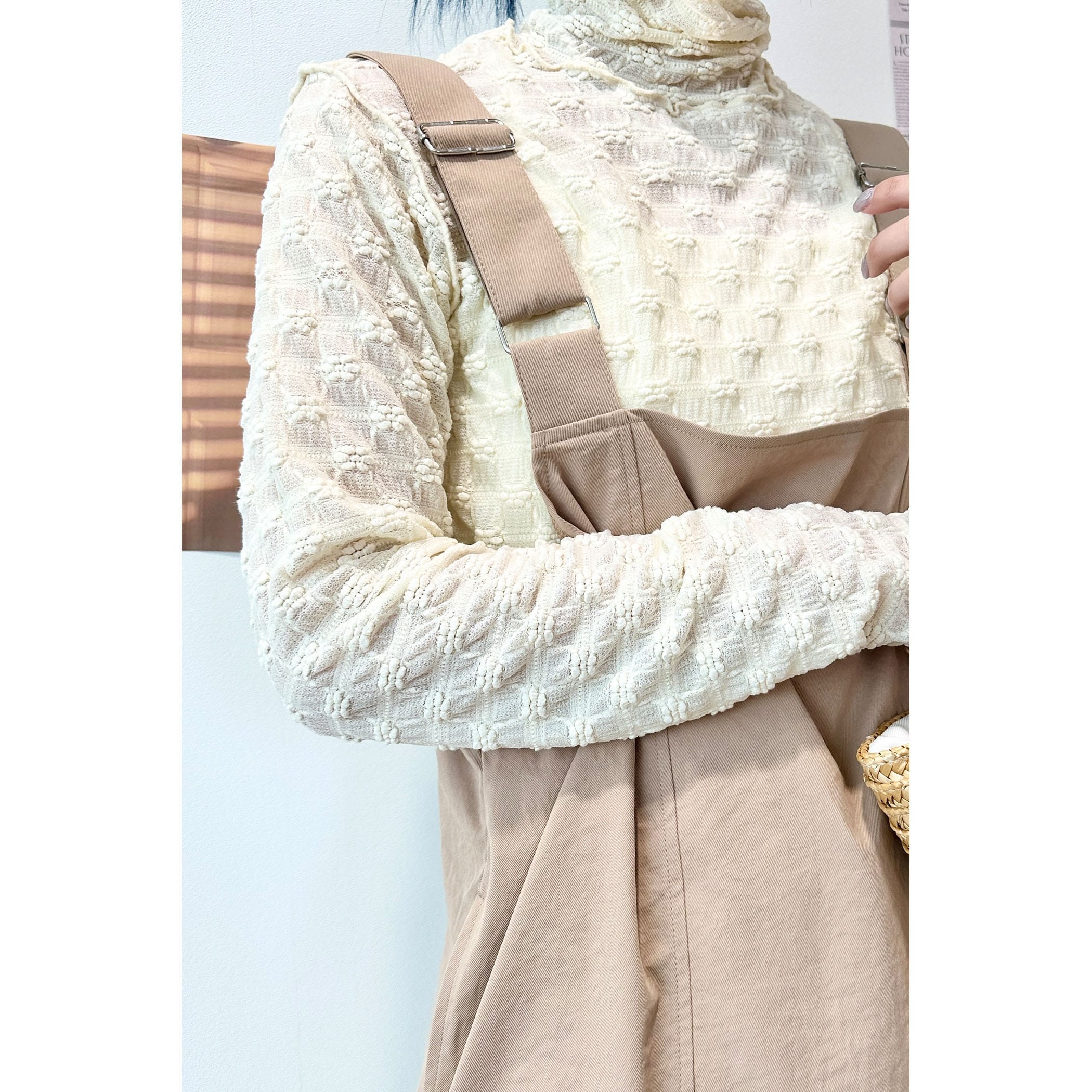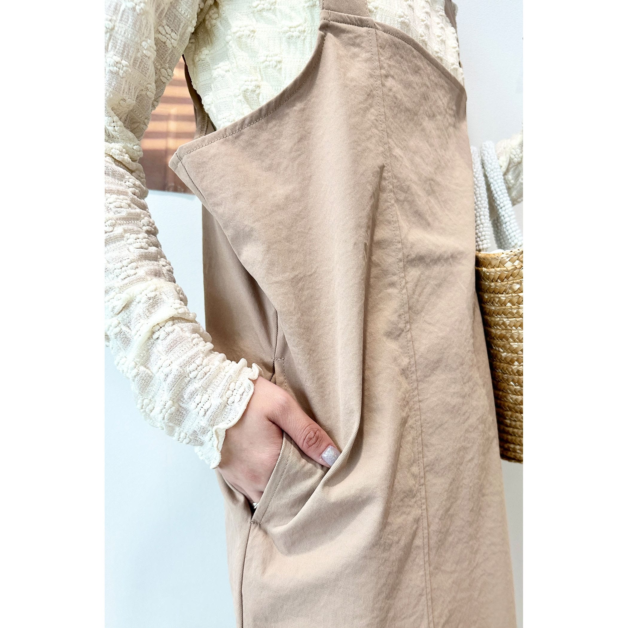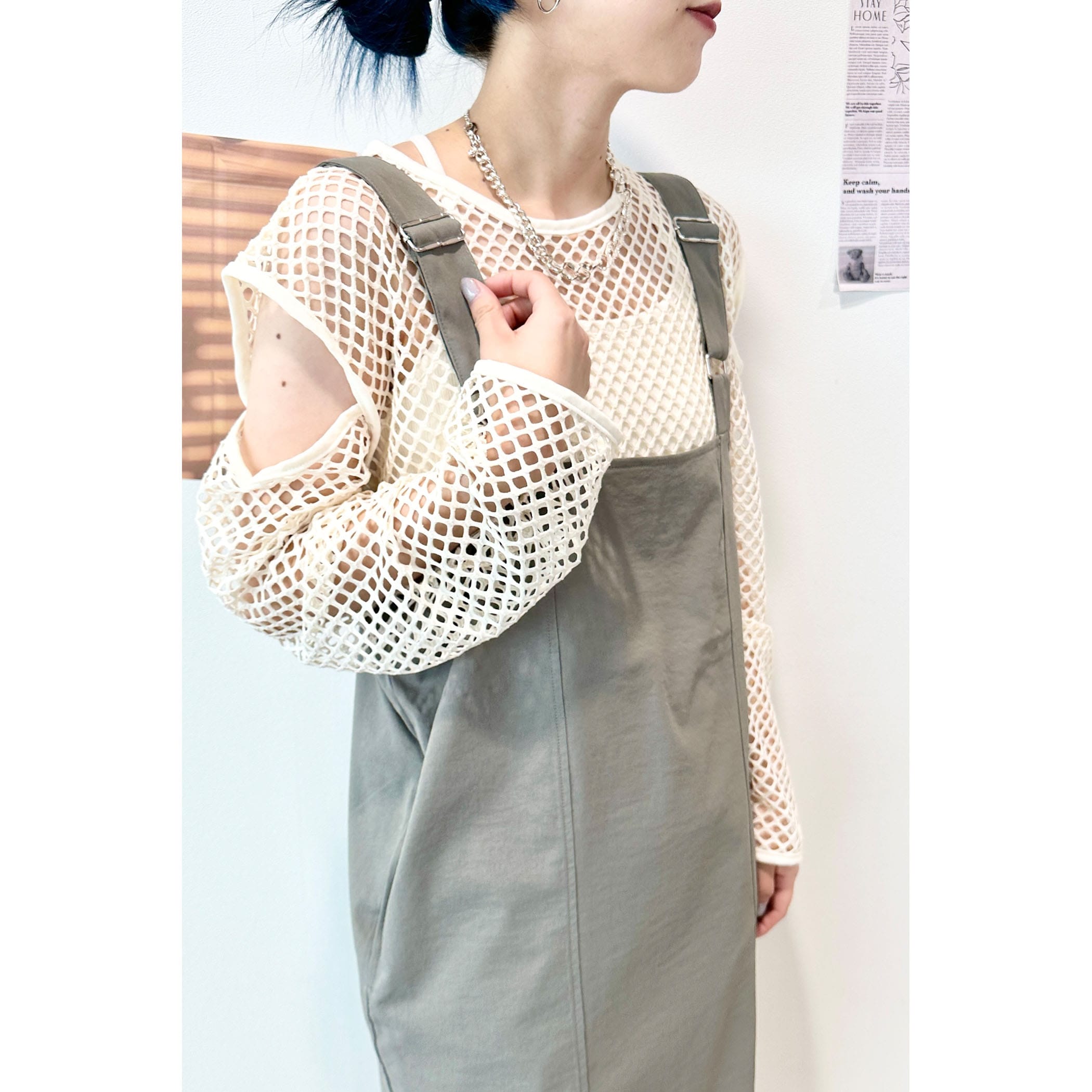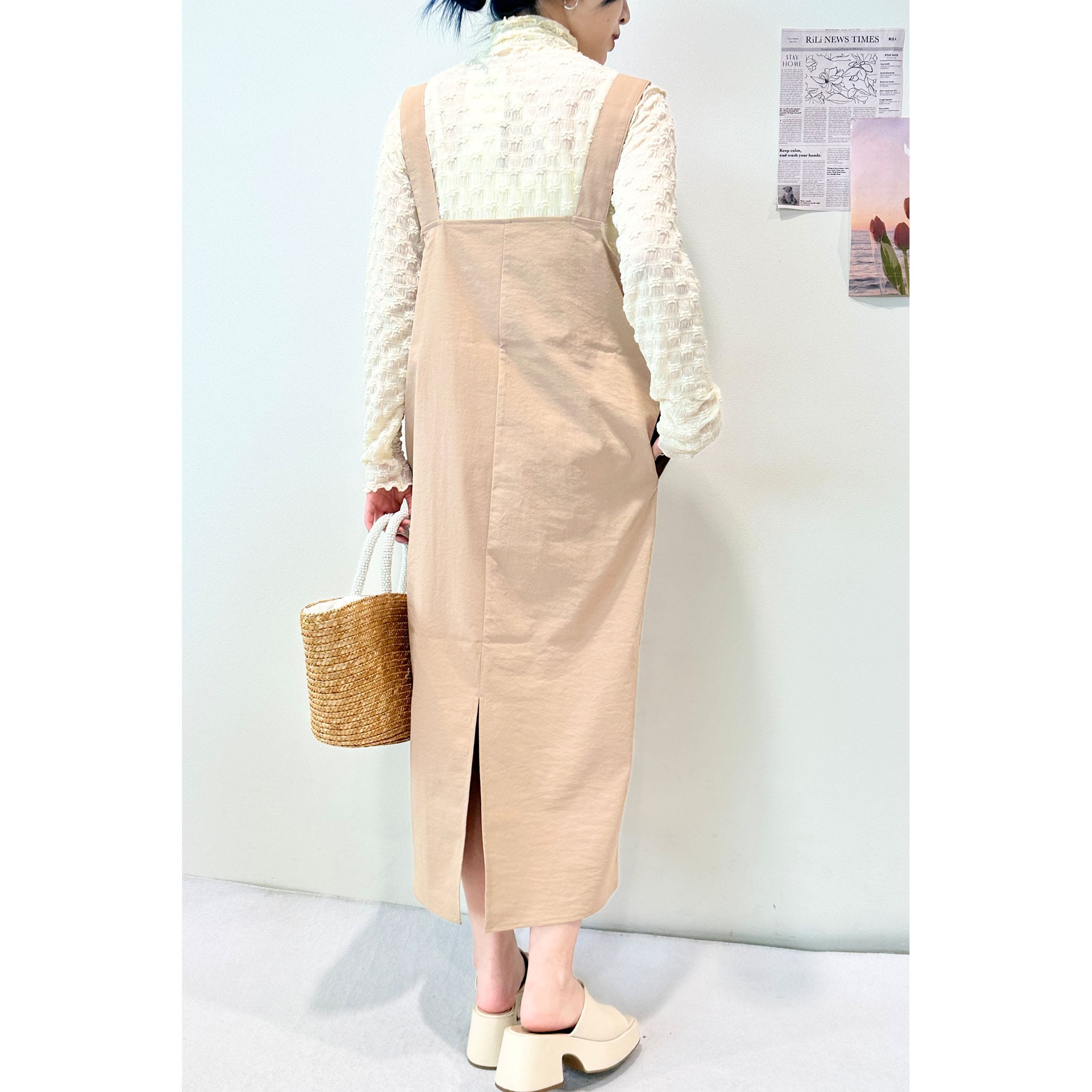 今期トレンドのジャンスカをワークムードで展開。肩紐がベルト調の素材になっていて両脇にポケットが付いた価値観のある一枚です。スウェットやTシャツと合わせるとカジュアルに、レースインナーやメロートップスと合わせていただくと程よくフェミニンにコーディネートいただけます。レイヤードスタイルにオススメのアイテムです。