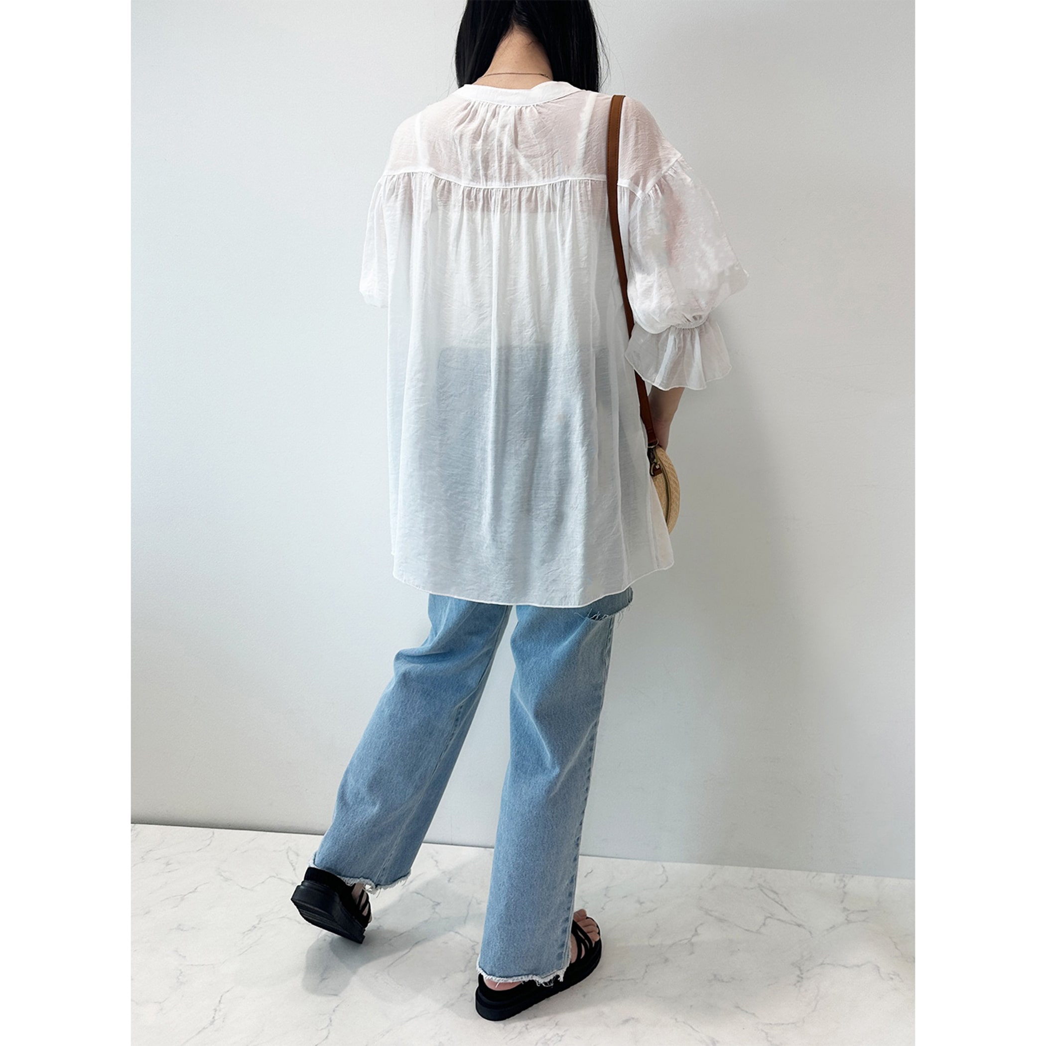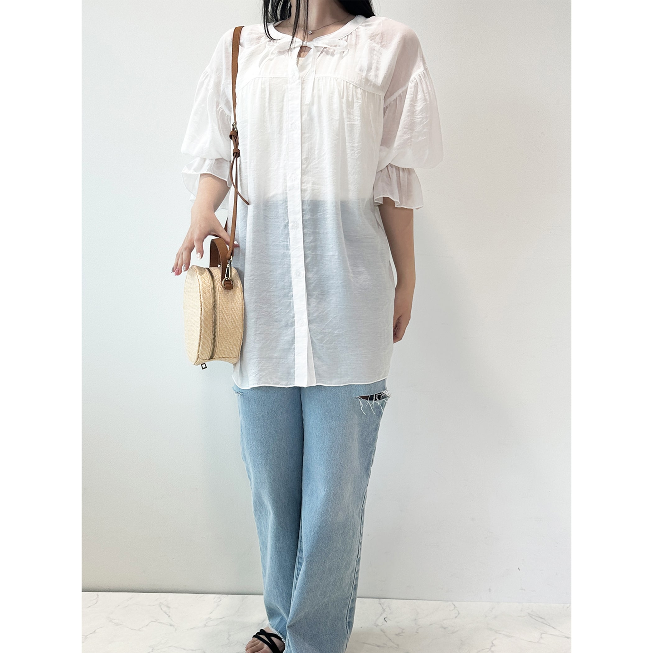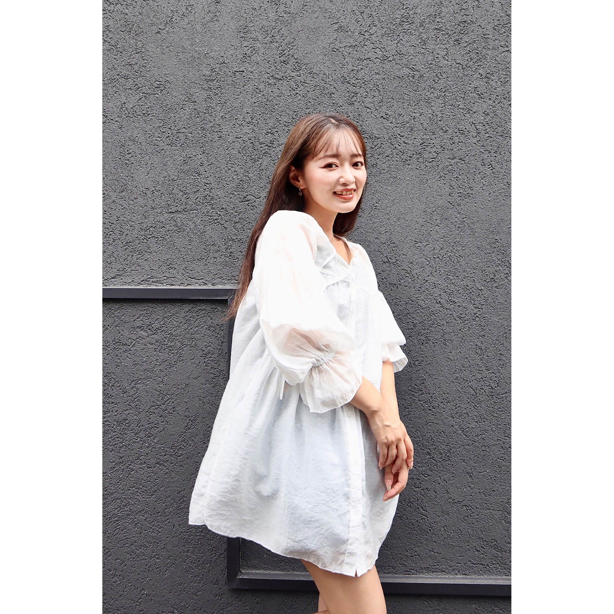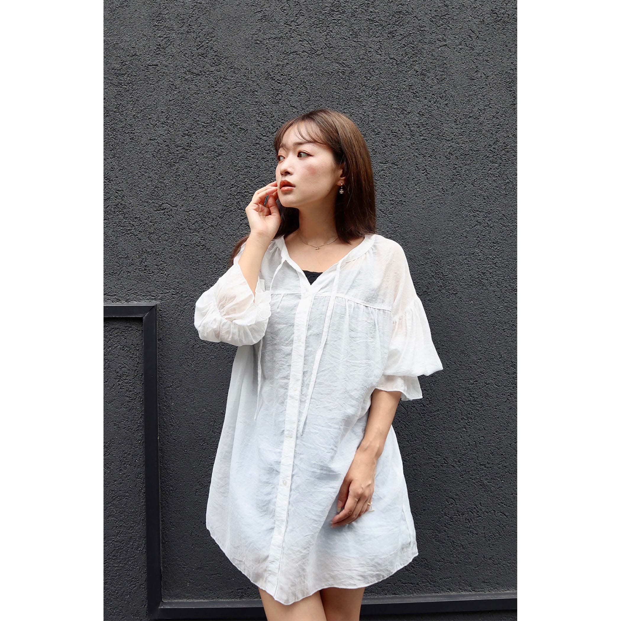 上品な透け感とふんわりとしたキャンディースリーブがフェミニンらしいチュニック丈ブラウス。甘めの雰囲気の商品ですが、カジュアルなカラー展開なので、スカートにもパンツにも合わせやすい一枚です。ドロップショルダーで大きめのシルエットなので、着用するだけで抜け感とこなれ感を持たせた雰囲気にコーディネートに仕上げてくれます。