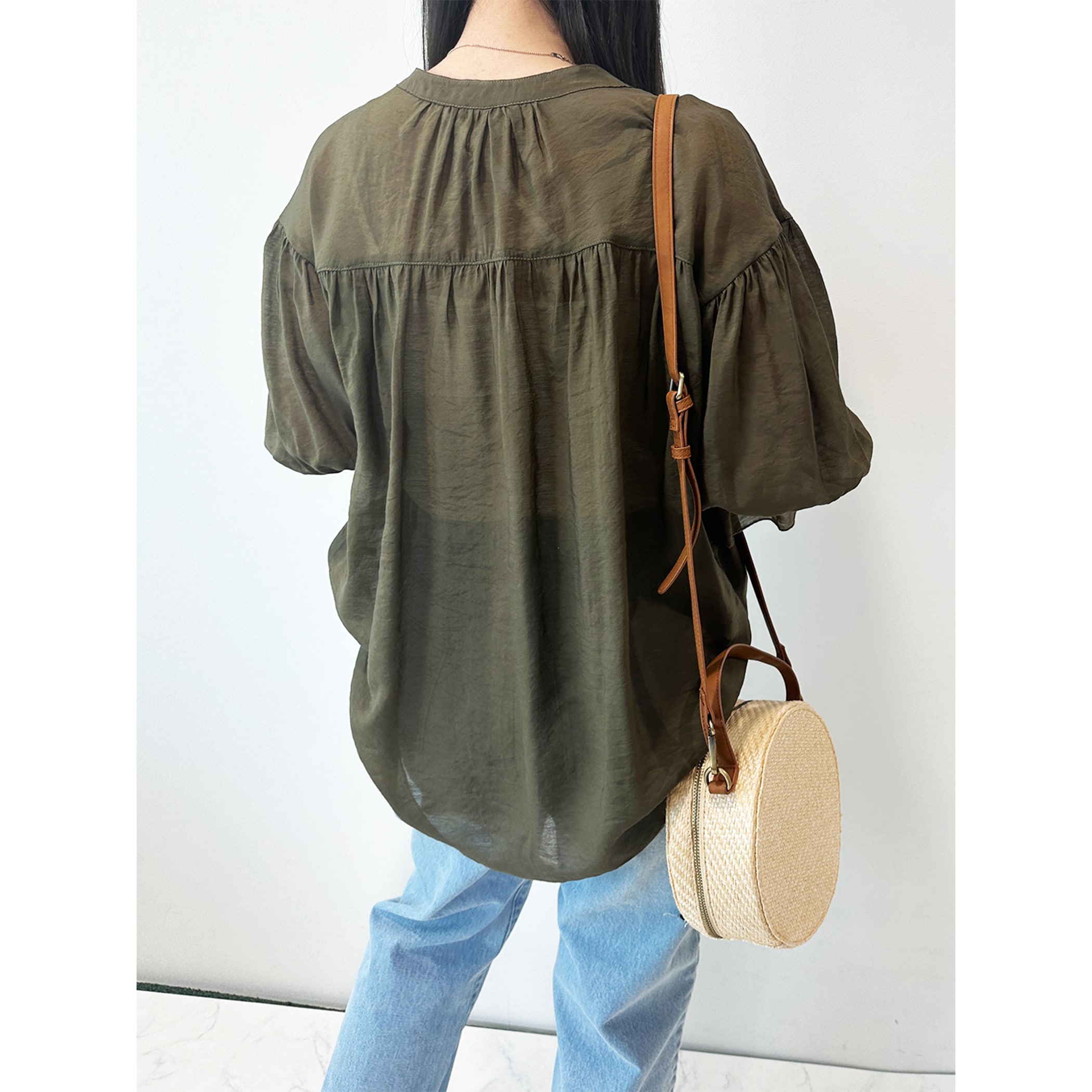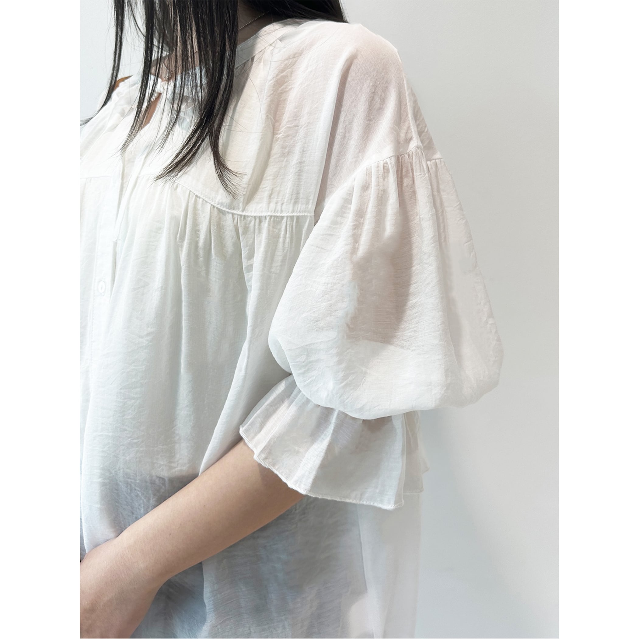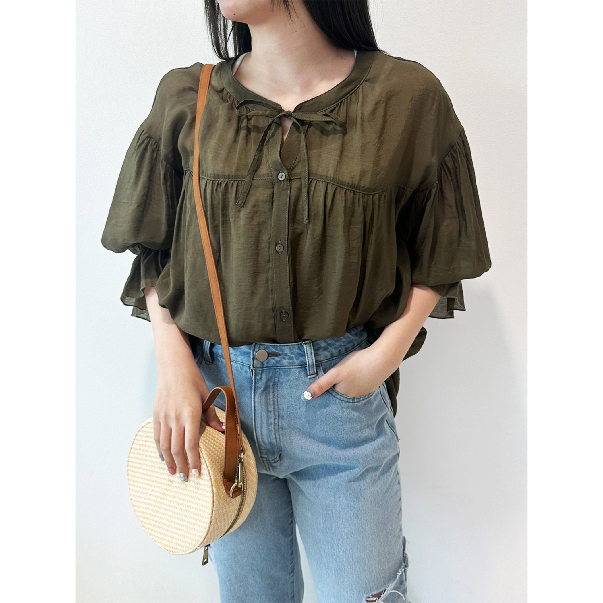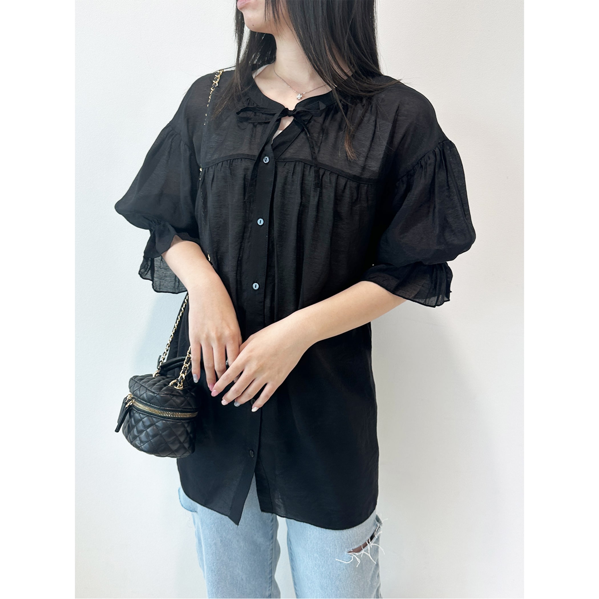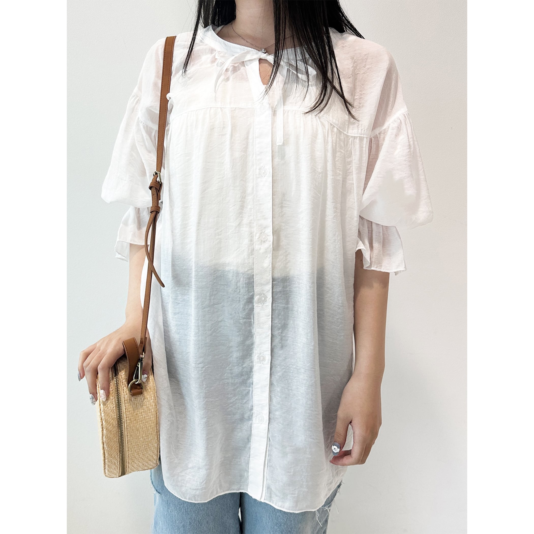 上品な透け感とふんわりとしたキャンディースリーブがフェミニンらしいチュニック丈ブラウス。甘めの雰囲気の商品ですが、カジュアルなカラー展開なので、スカートにもパンツにも合わせやすい一枚です。ドロップショルダーで大きめのシルエットなので、着用するだけで抜け感とこなれ感を持たせた雰囲気にコーディネートに仕上げてくれます。
