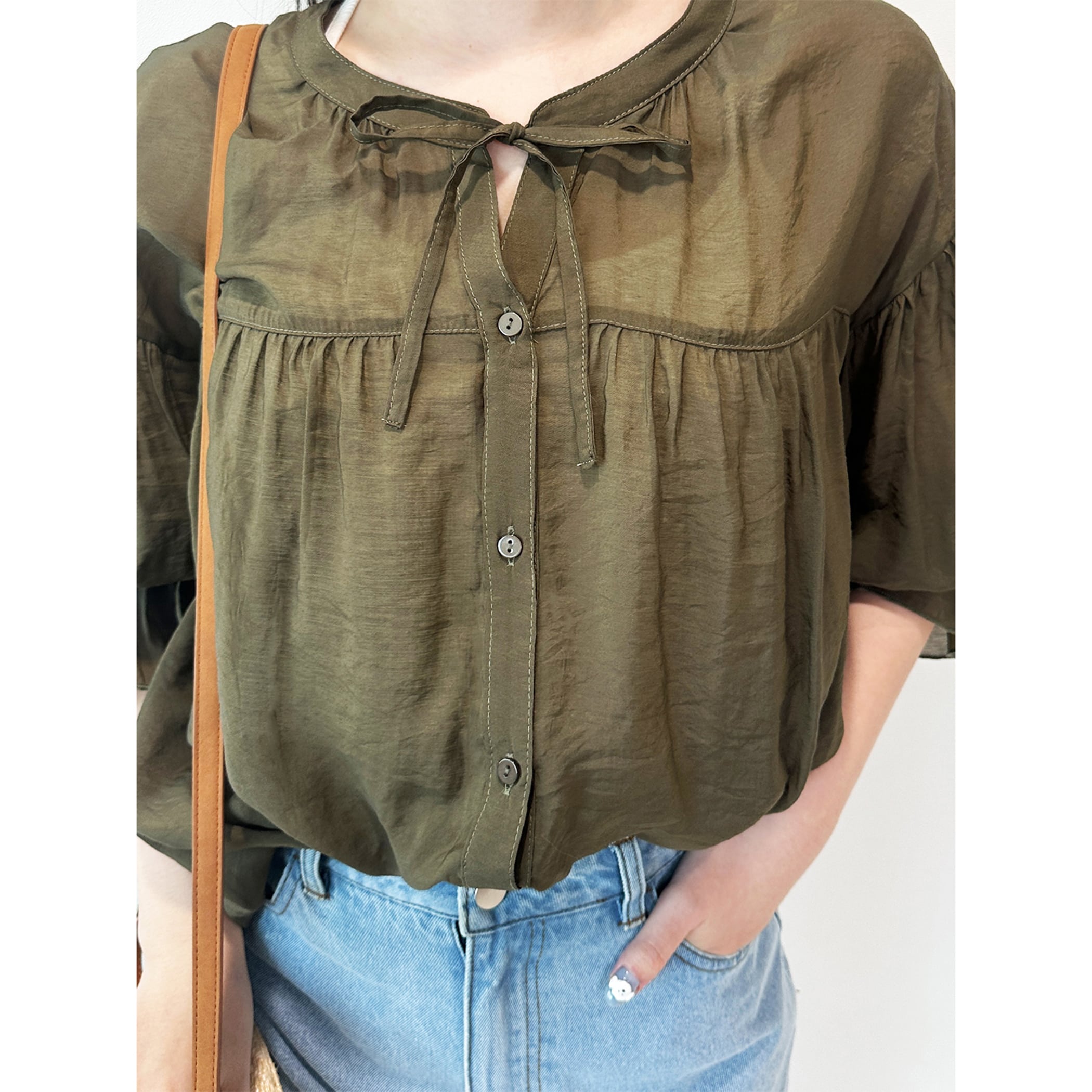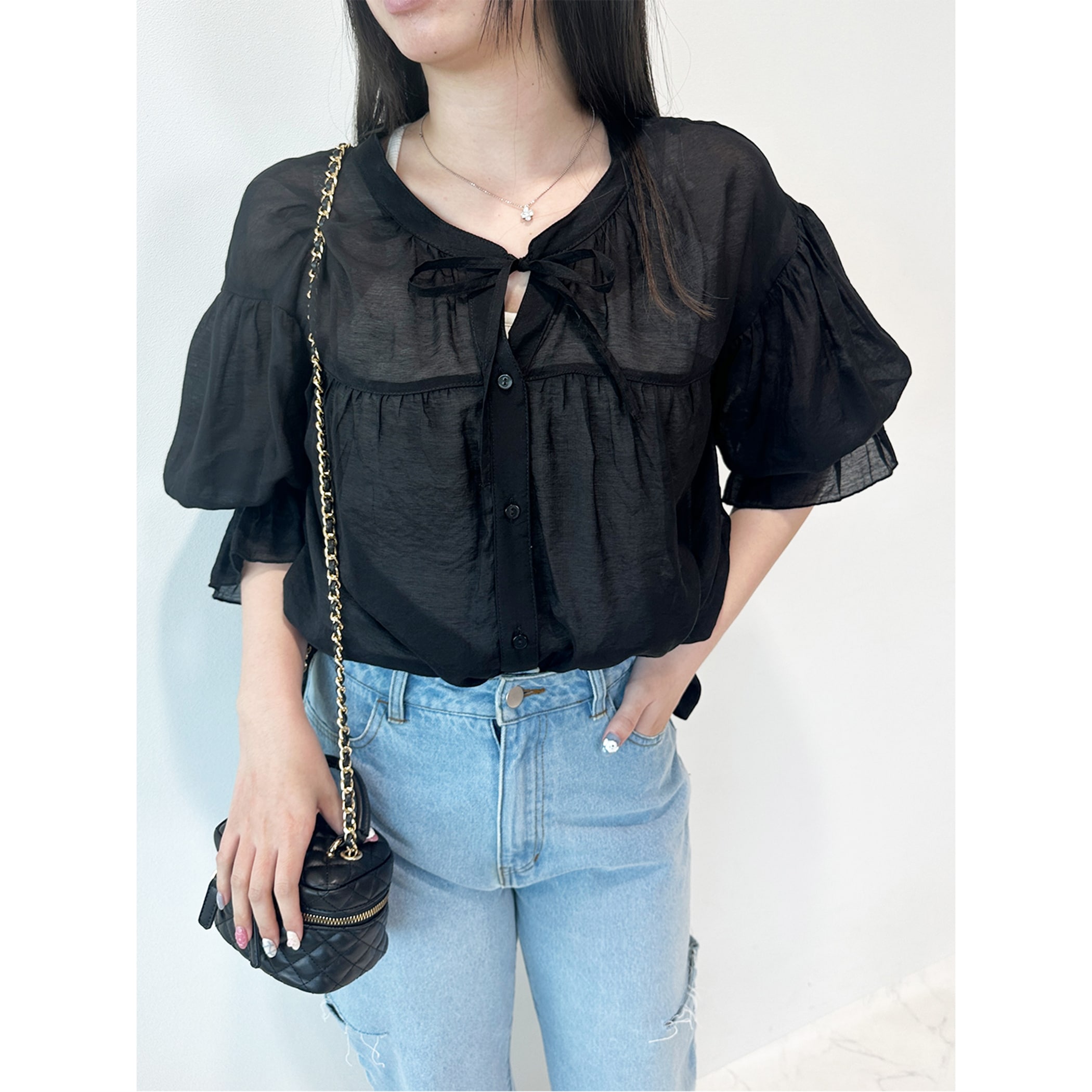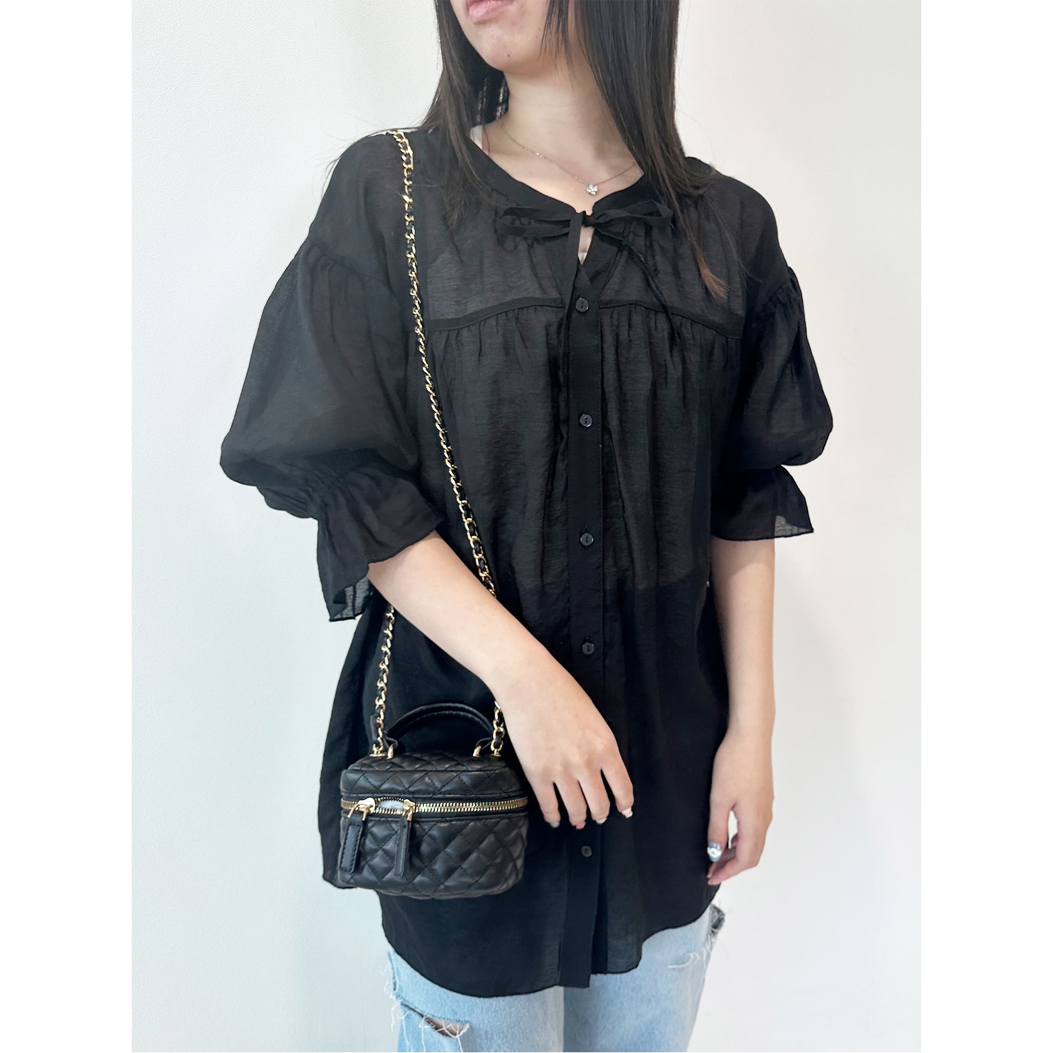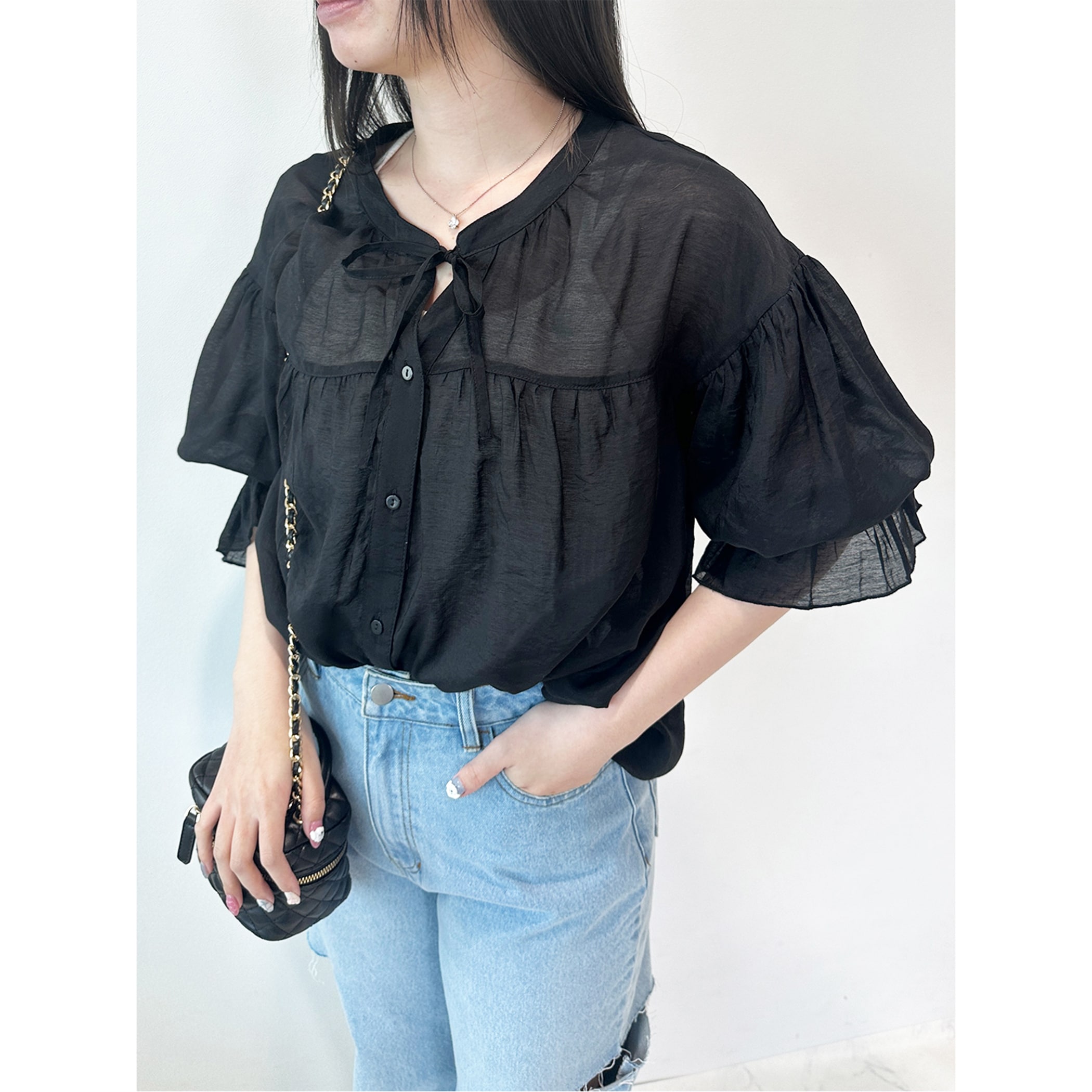上品な透け感とふんわりとしたキャンディースリーブがフェミニンらしいチュニック丈ブラウス。甘めの雰囲気の商品ですが、カジュアルなカラー展開なので、スカートにもパンツにも合わせやすい一枚です。ドロップショルダーで大きめのシルエットなので、着用するだけで抜け感とこなれ感を持たせた雰囲気にコーディネートに仕上げてくれます。