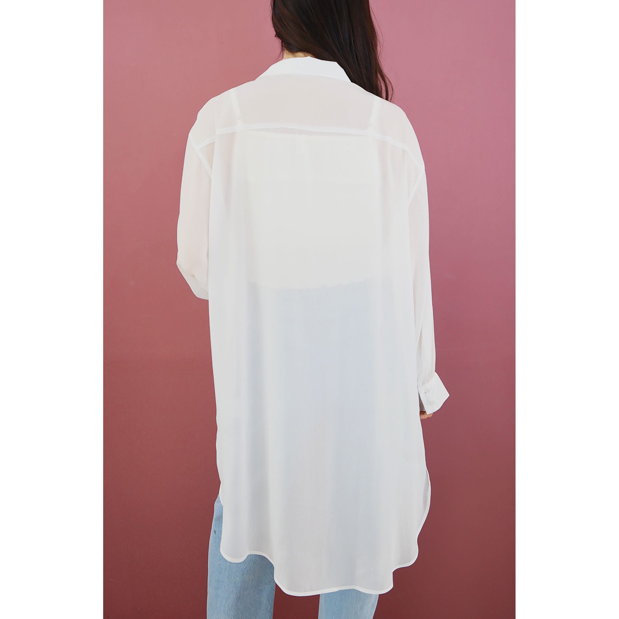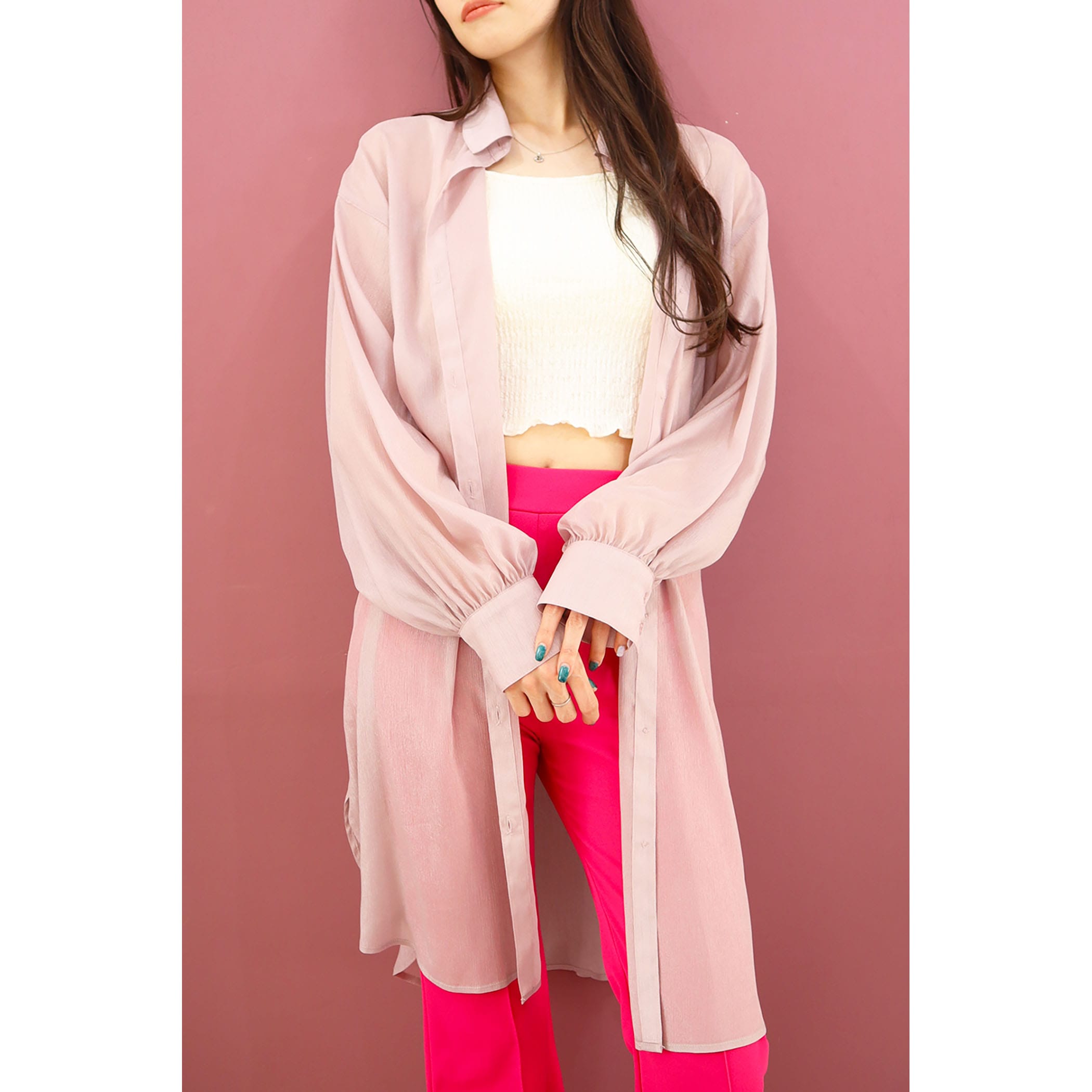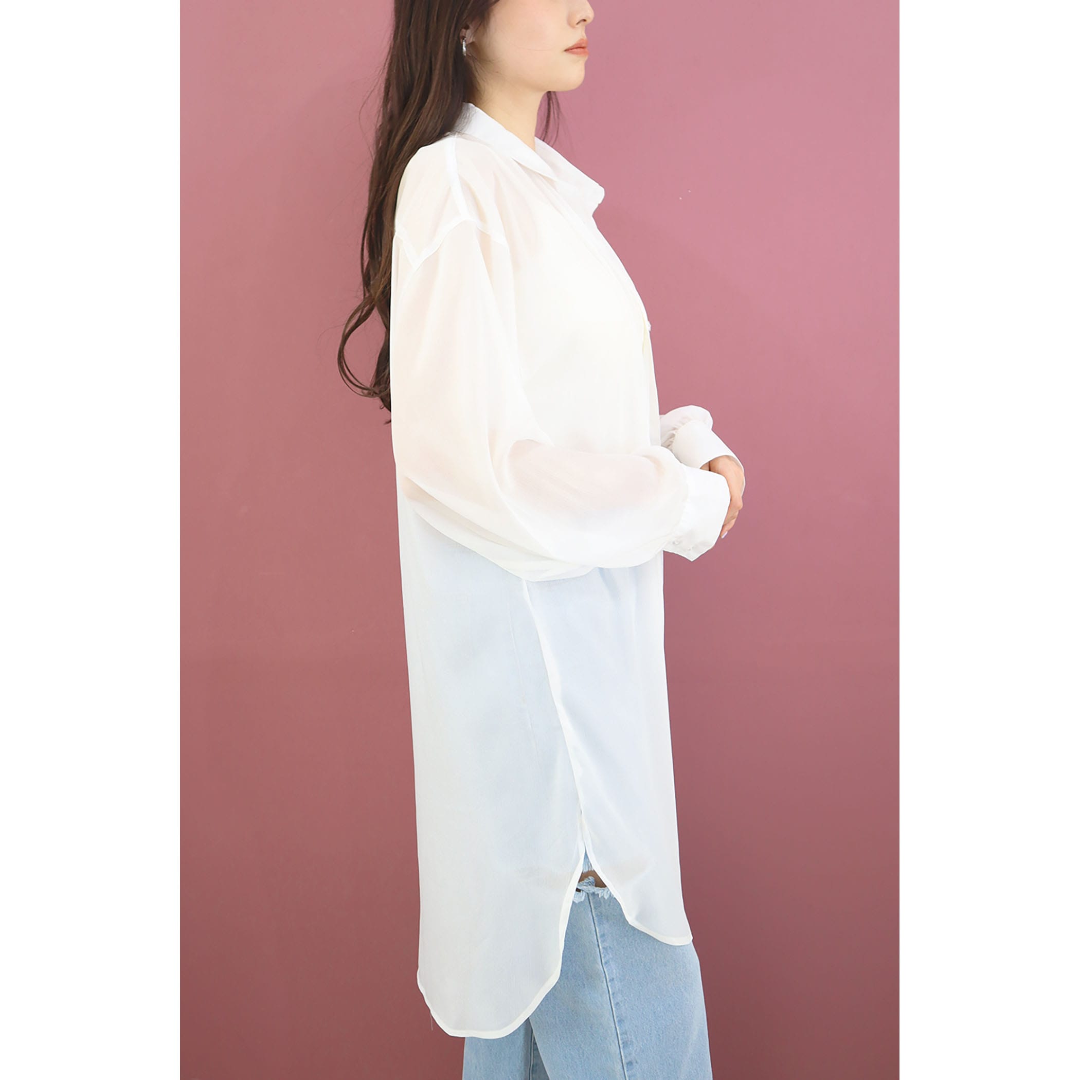 上品でさりげない光沢感と楊柳素材が価値観のあるロングシャツ。シアー感があり軽い素材感なので、さらりと羽織れコーディネートにエアリー感を持たせてくれます。ドロップショルダーで後ヘムデザインなので、横から見たシルエットもこなれた印象と程よい抜け感を持たせてくれます。