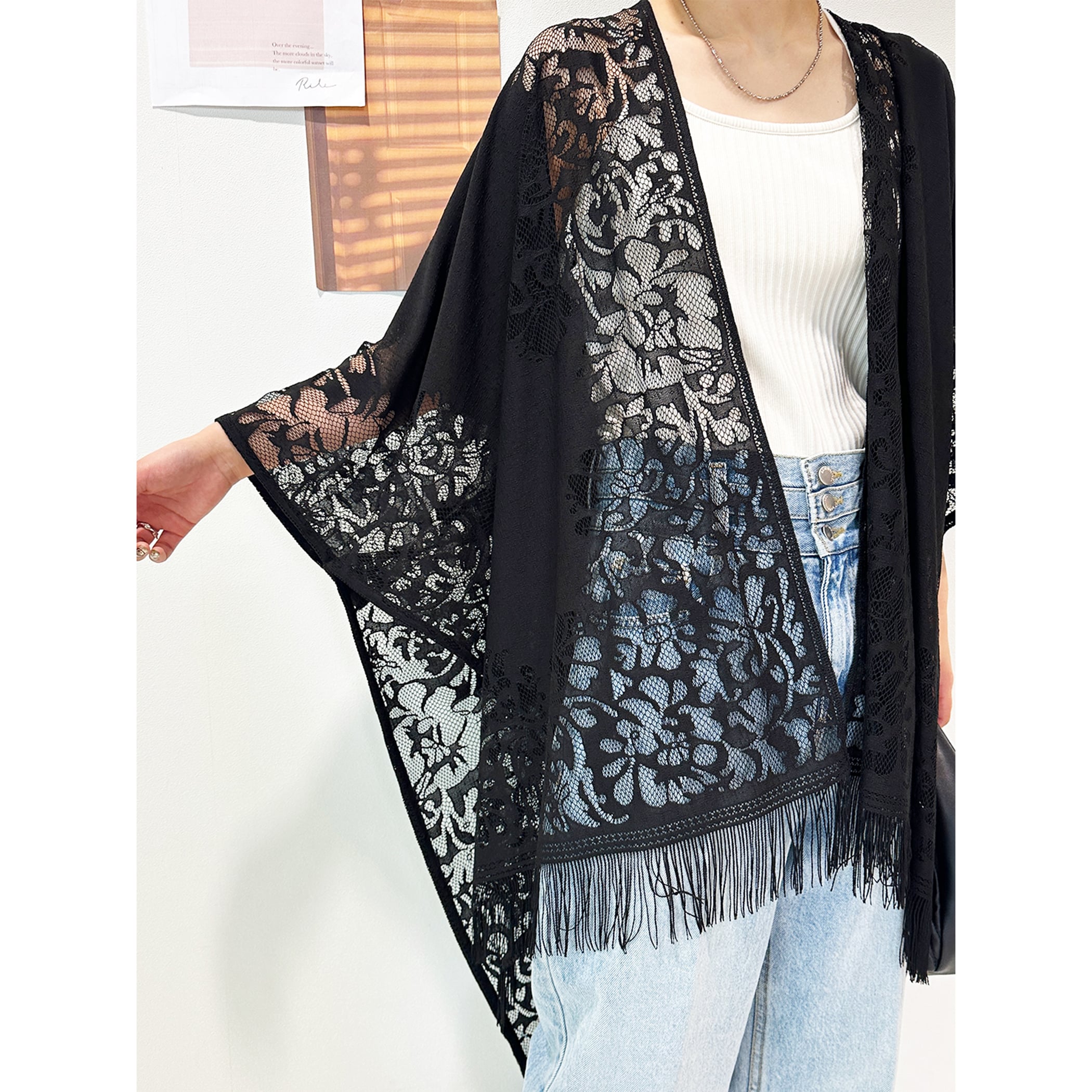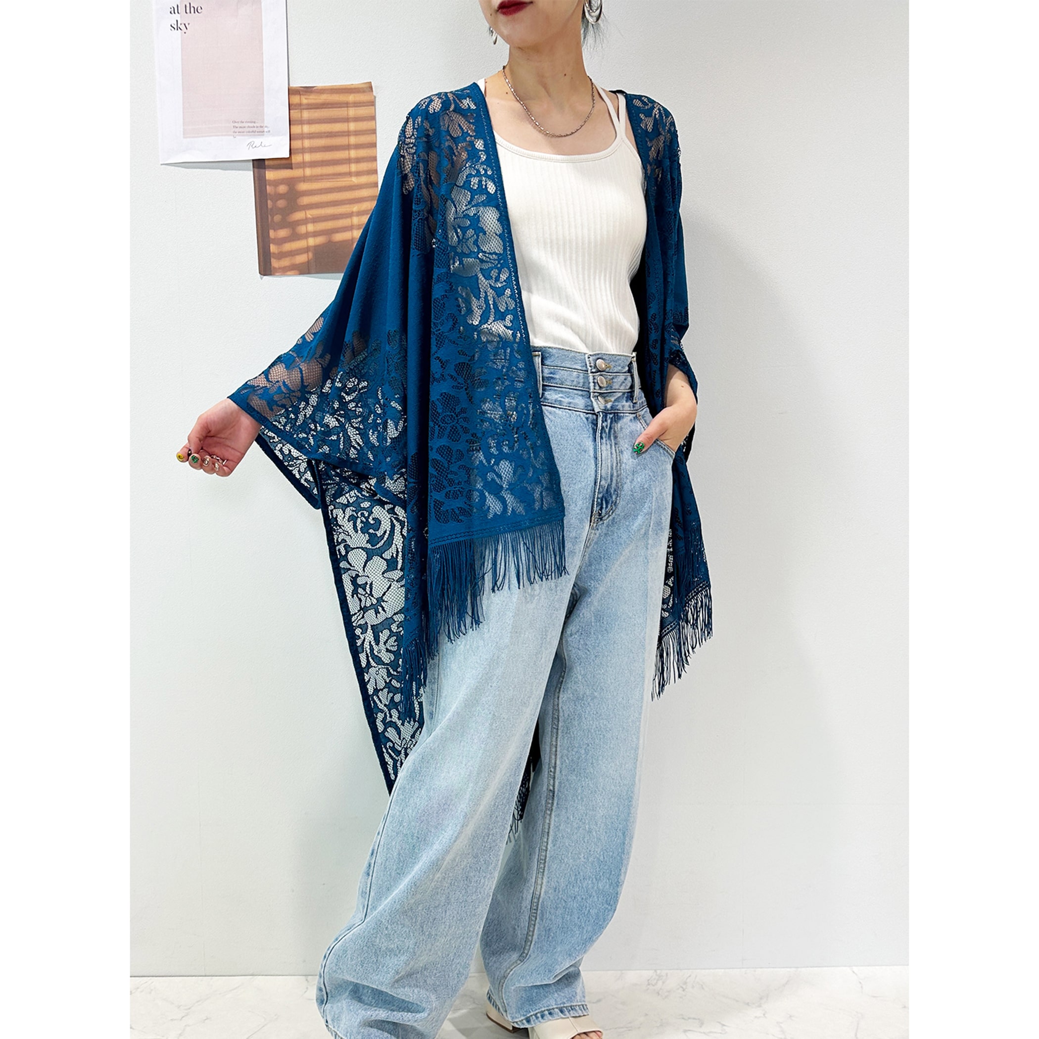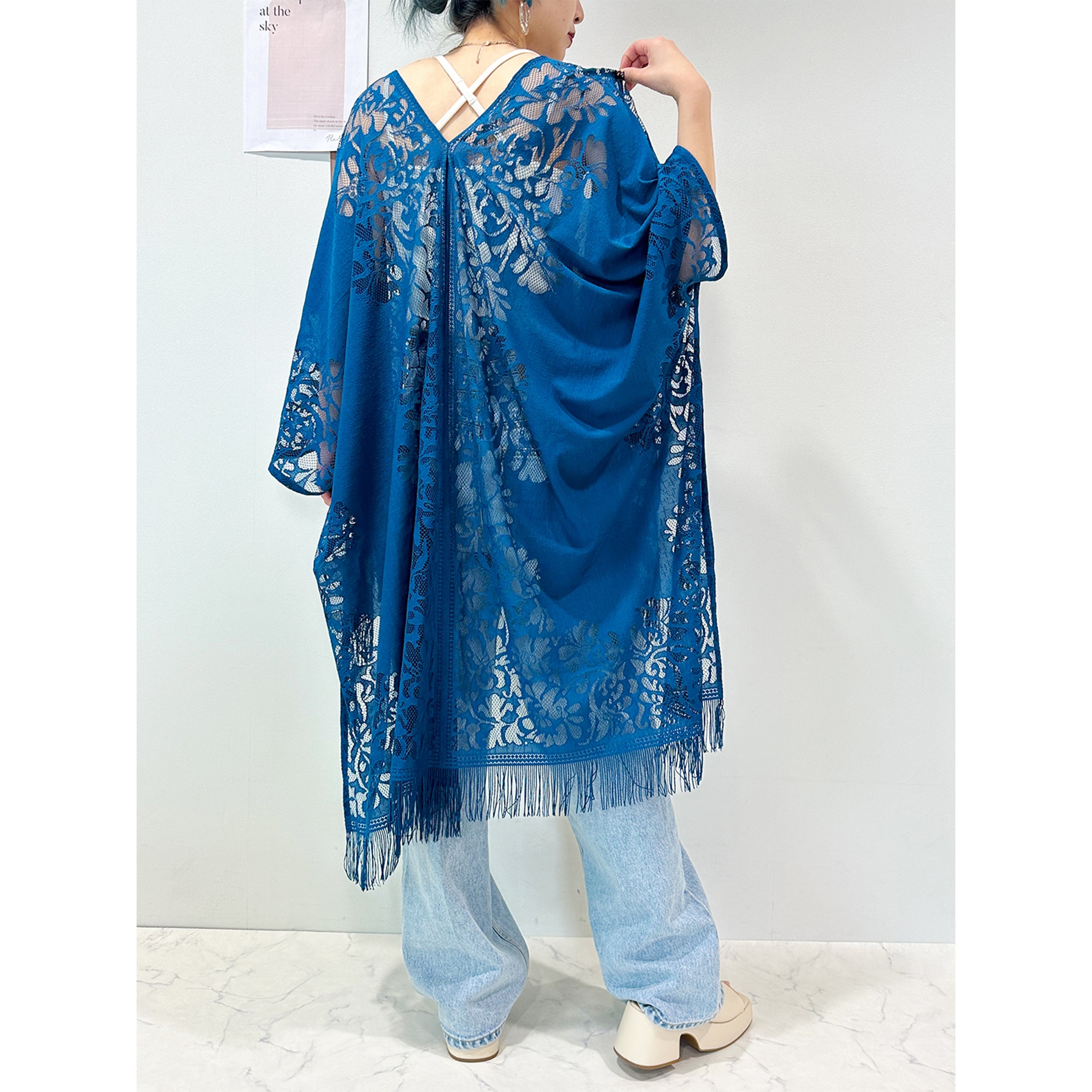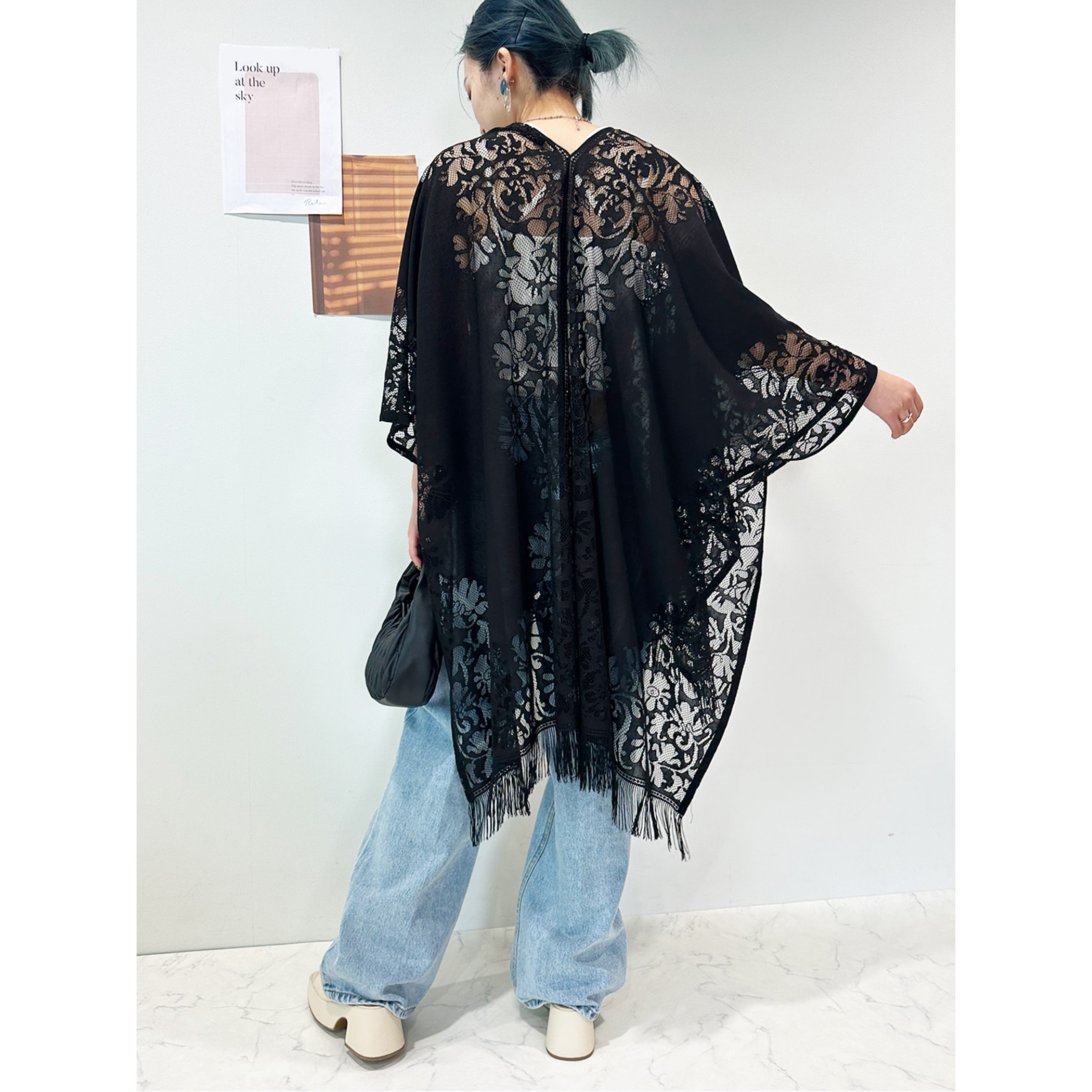 羽織るだけで映える総柄レースのポンチョカーディガン。着用するとイレヘムのドレープになり、歩く度にゆれるフリンジが高級感のある一枚です。デニムやパンツ・ワンピースともコーディネートしやすく、二の腕や体形カバーもしてくれる優秀アイテムです。