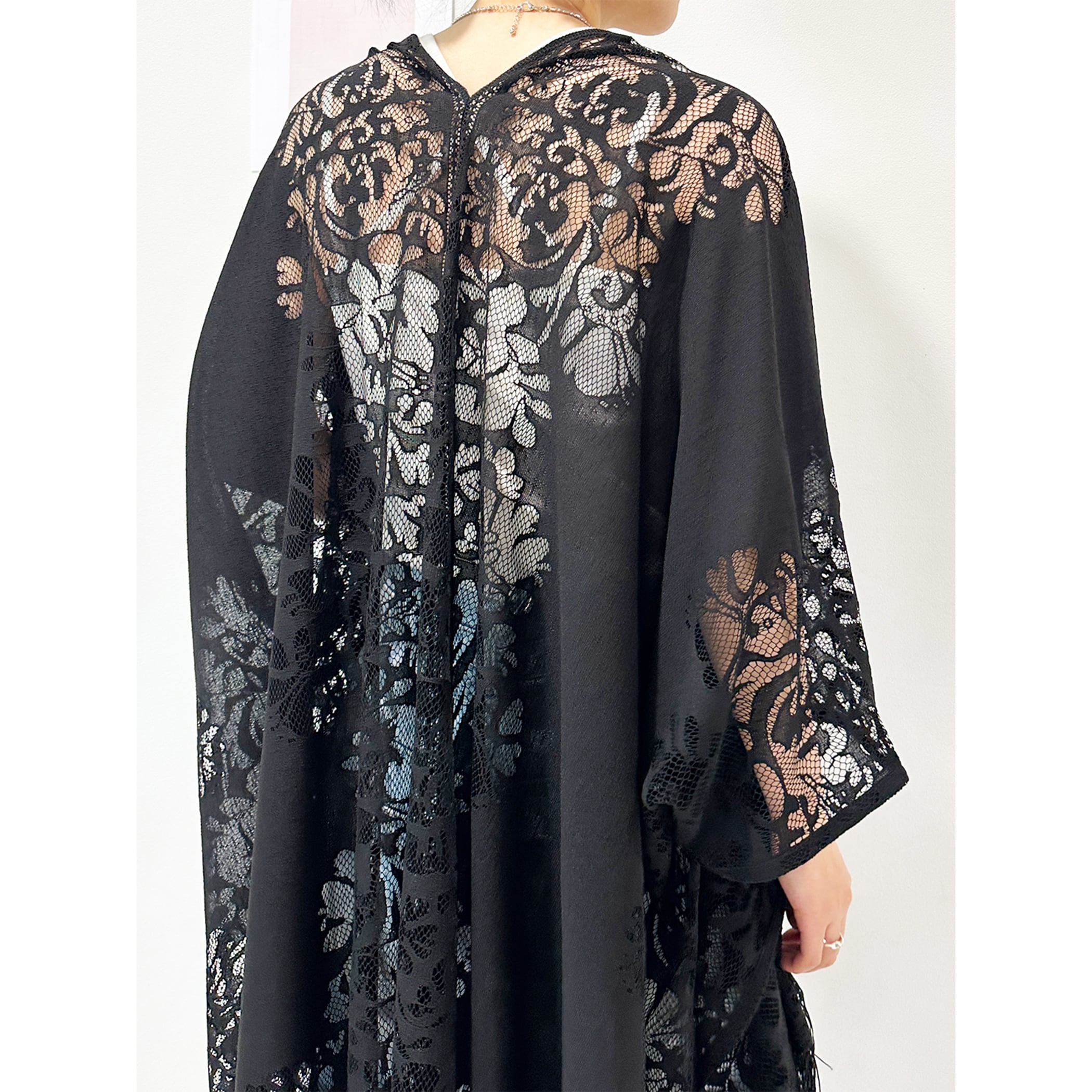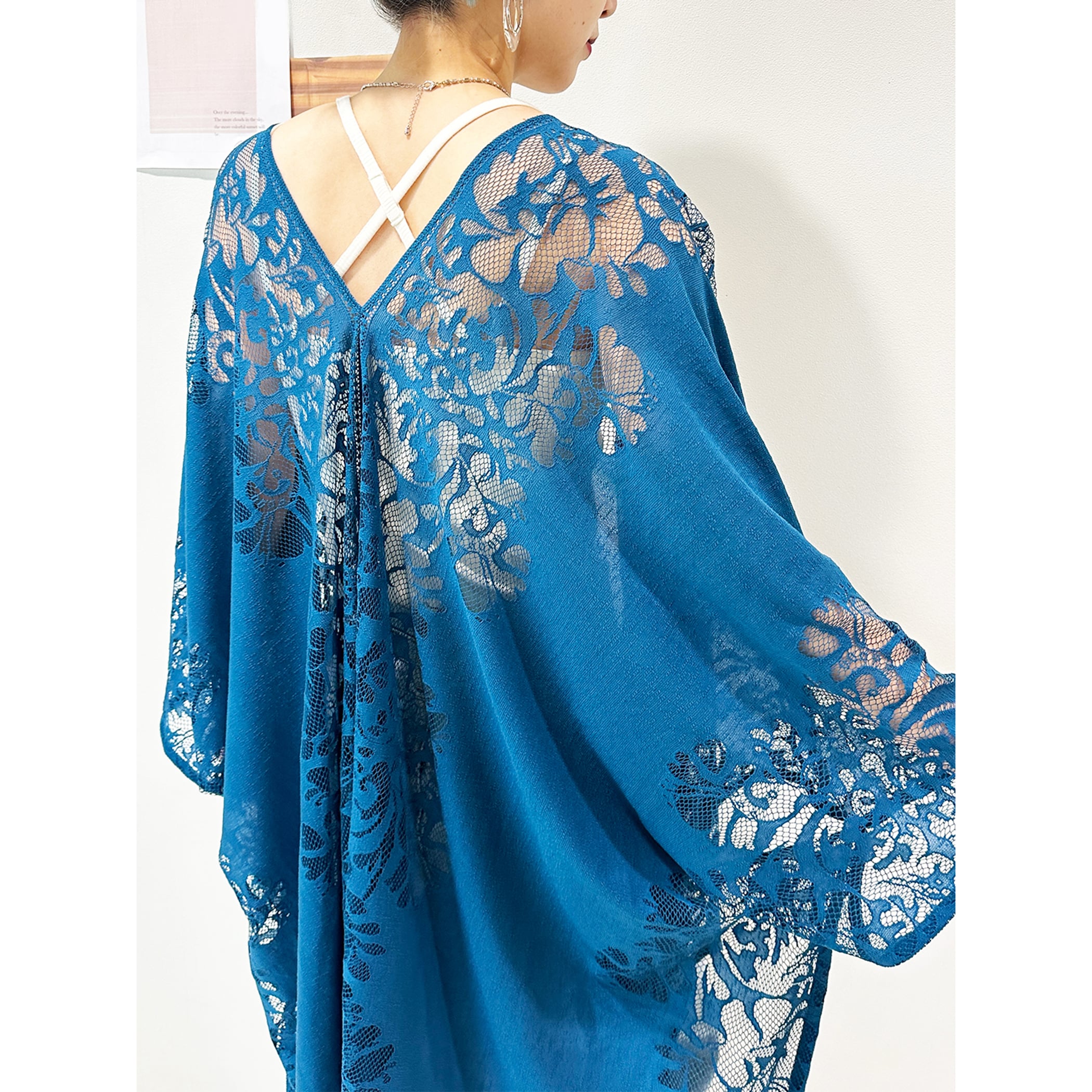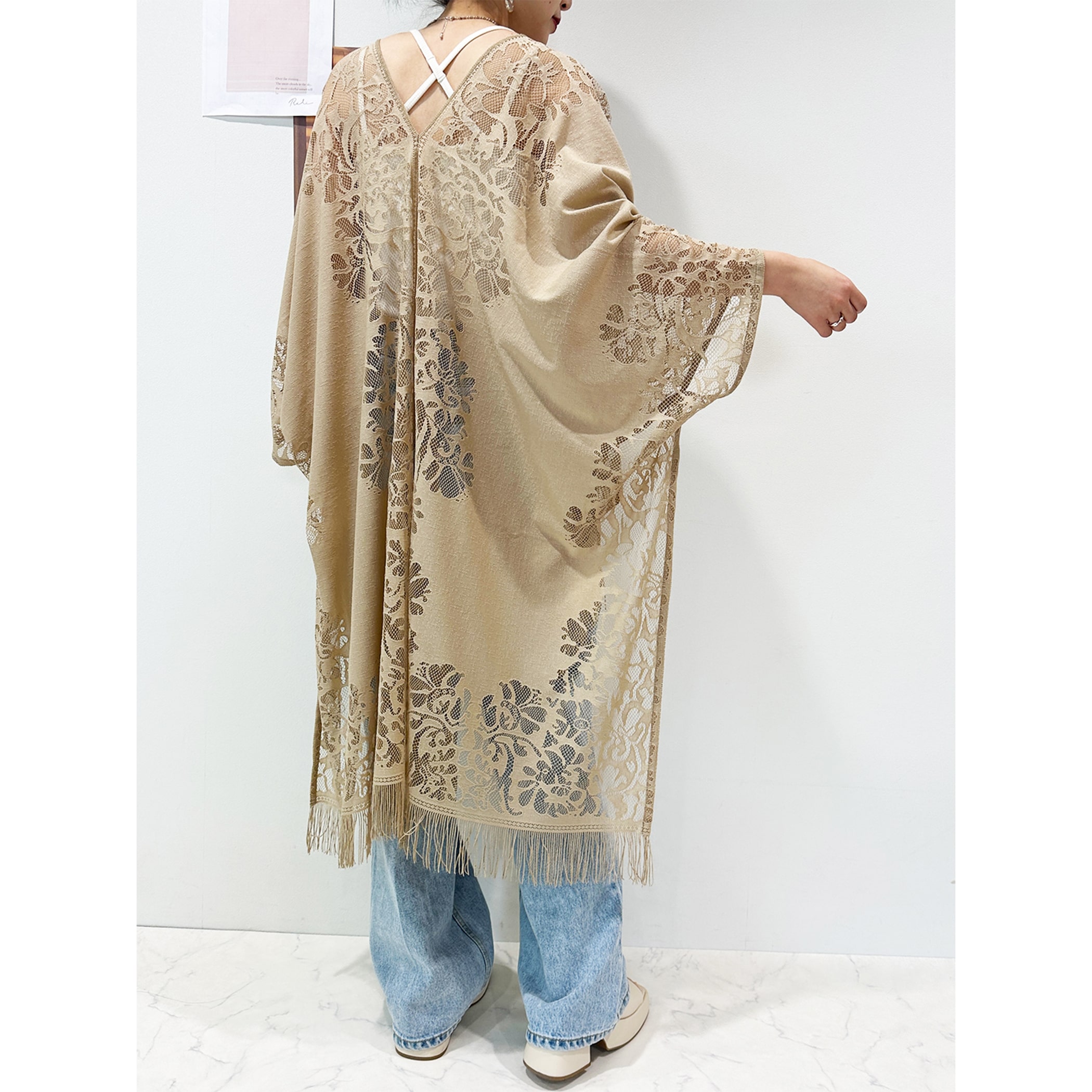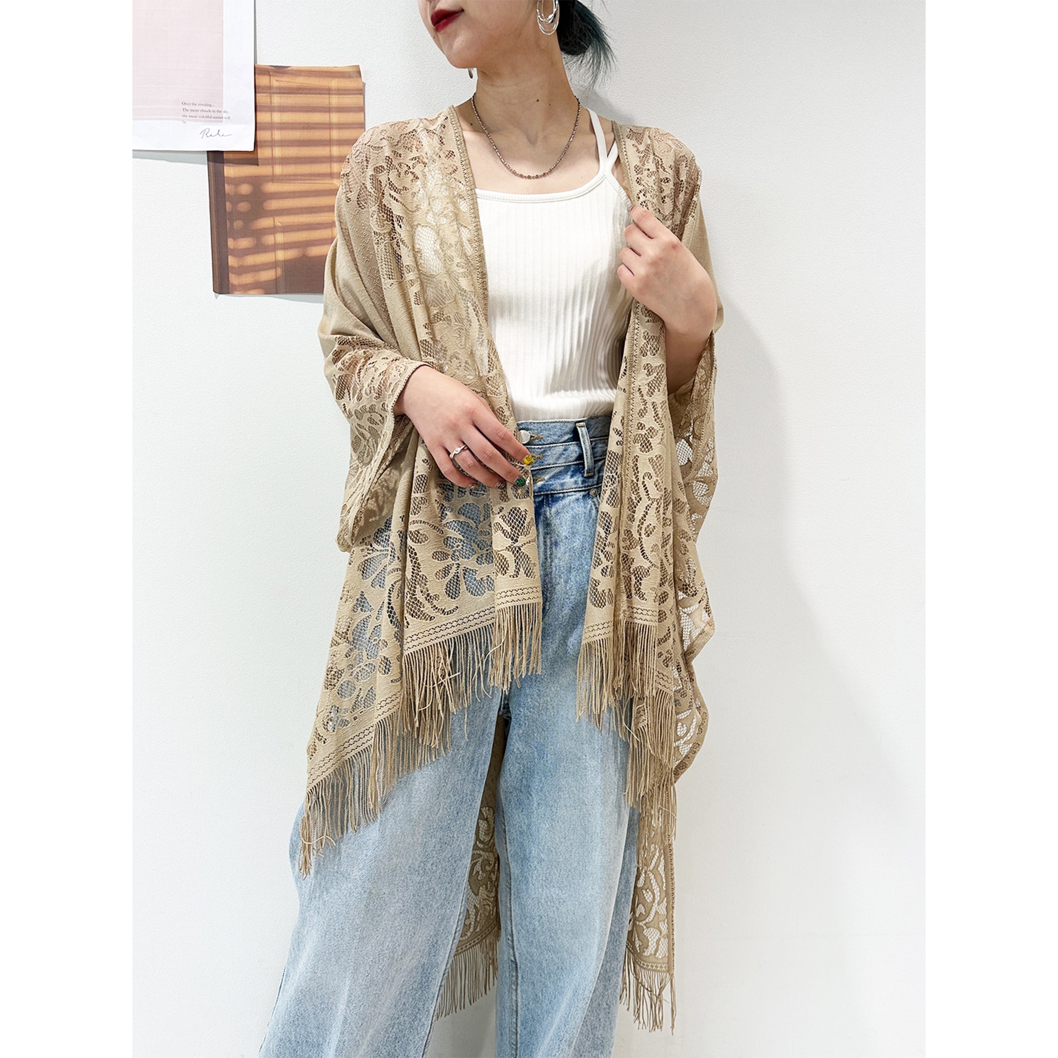 羽織るだけで映える総柄レースのポンチョカーディガン。着用するとイレヘムのドレープになり、歩く度にゆれるフリンジが高級感のある一枚です。デニムやパンツ・ワンピースともコーディネートしやすく、二の腕や体形カバーもしてくれる優秀アイテムです。