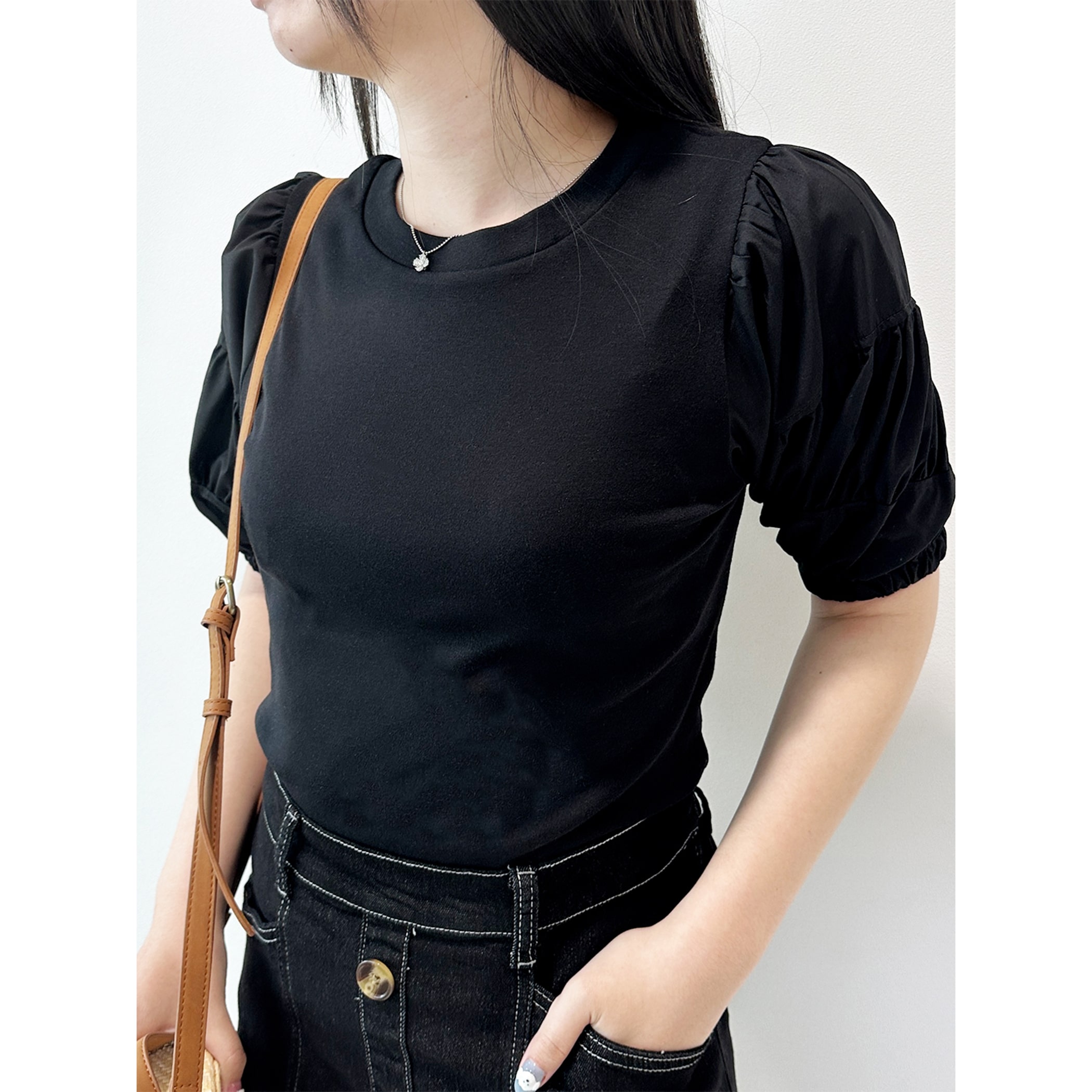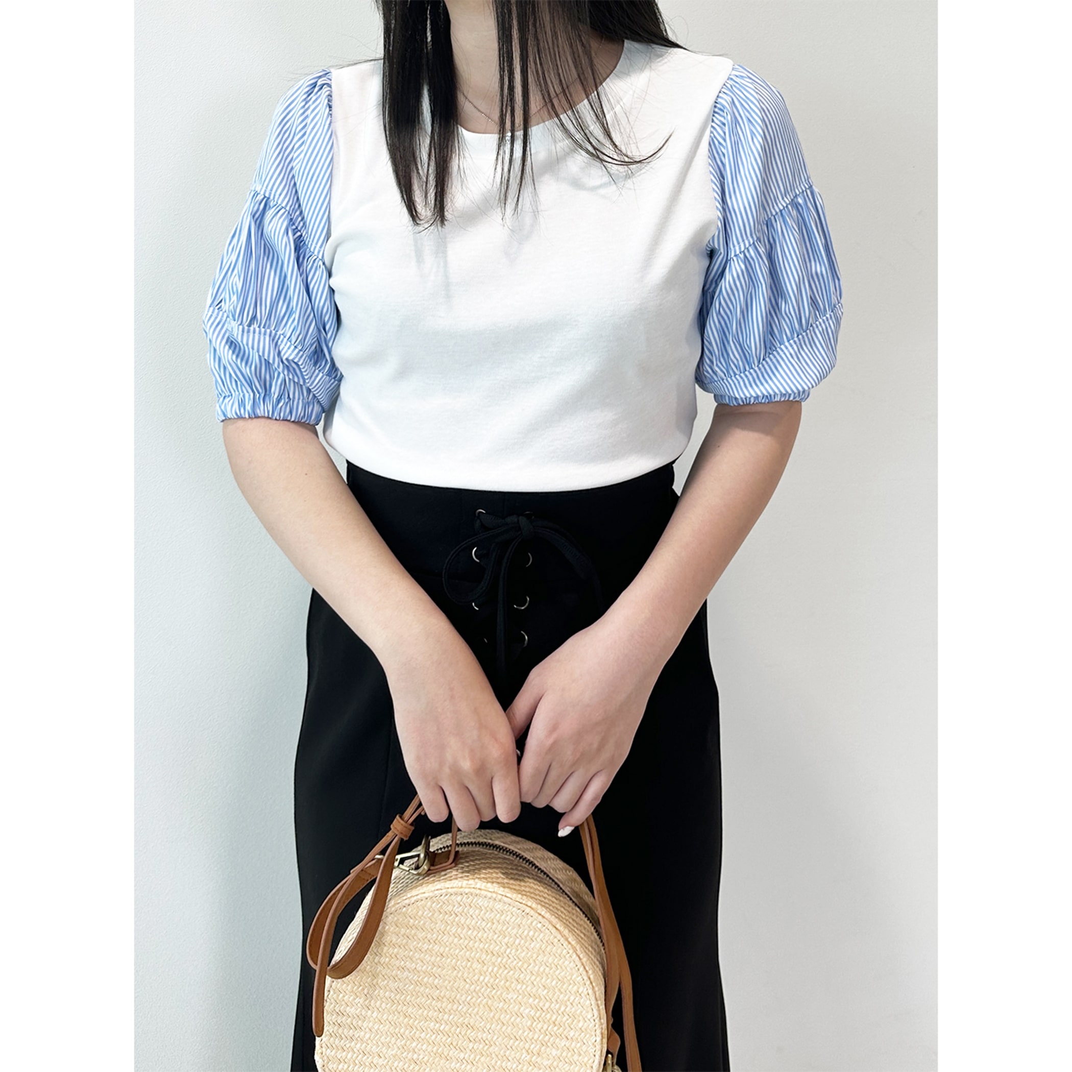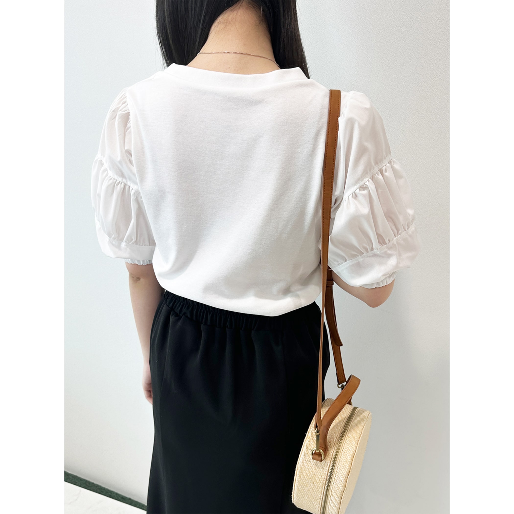 袖にブロード素材を使用したギャザリングデザインが目を引くプルオーバー。身頃が軽めのカットソー素材で体のラインを拾わないサイズ感なのでストレスフリーに着用いただけます。ハイウエストスカートと合わせるとフェミニンなイメージに、デニムやワイドパンツと合わせるとカジュアルなコーディネートに仕上げてくれます。