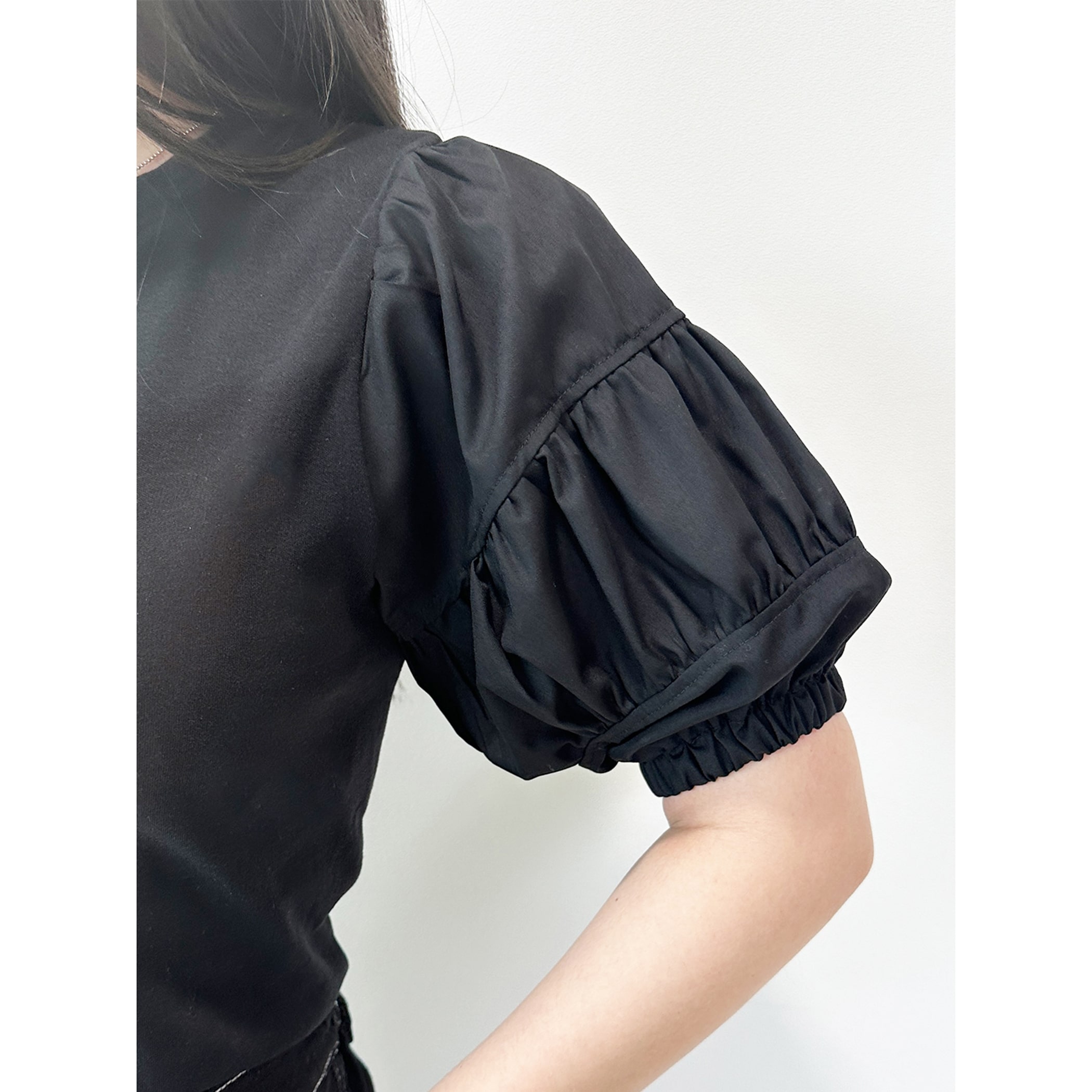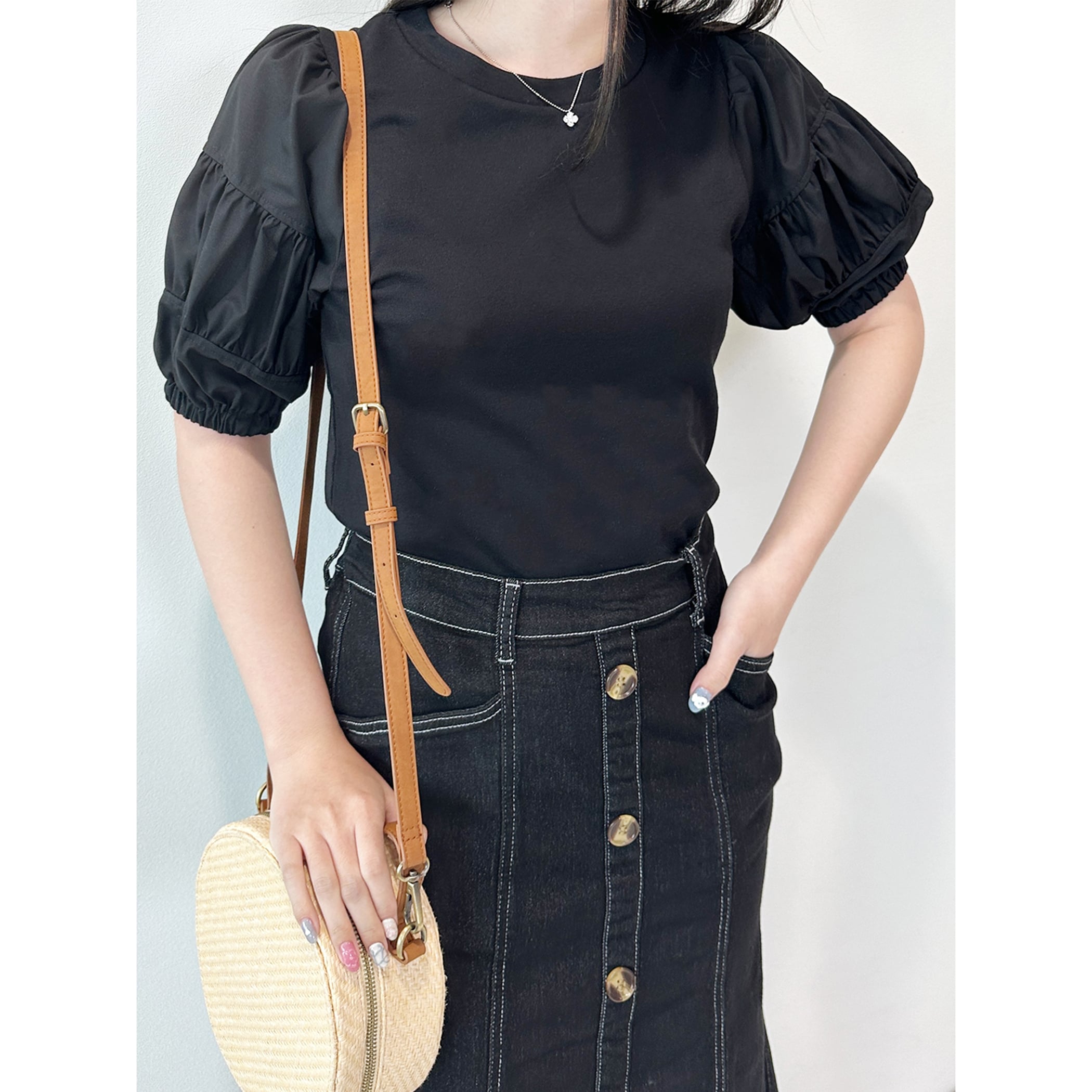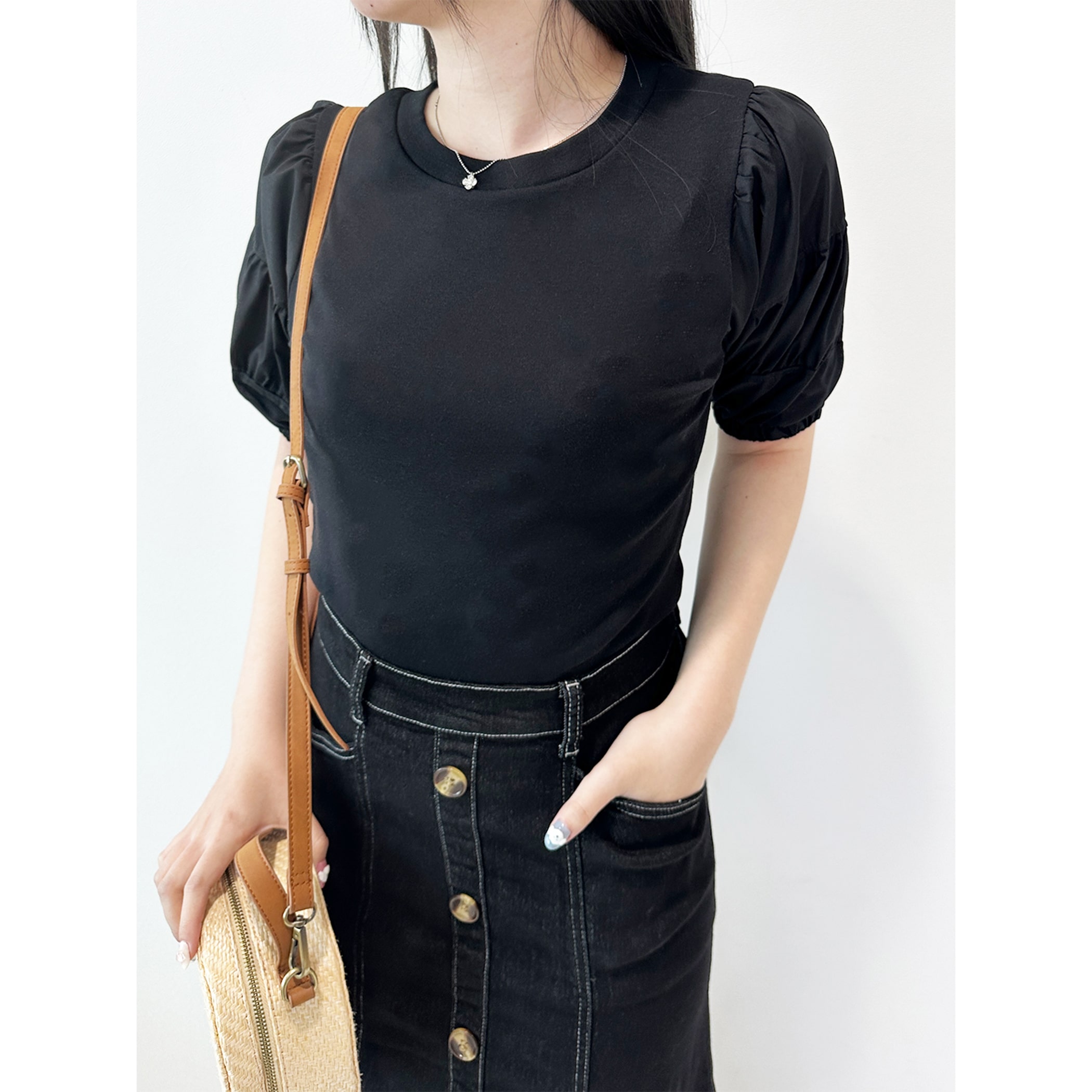 袖にブロード素材を使用したギャザリングデザインが目を引くプルオーバー。身頃が軽めのカットソー素材で体のラインを拾わないサイズ感なのでストレスフリーに着用いただけます。ハイウエストスカートと合わせるとフェミニンなイメージに、デニムやワイドパンツと合わせるとカジュアルなコーディネートに仕上げてくれます。