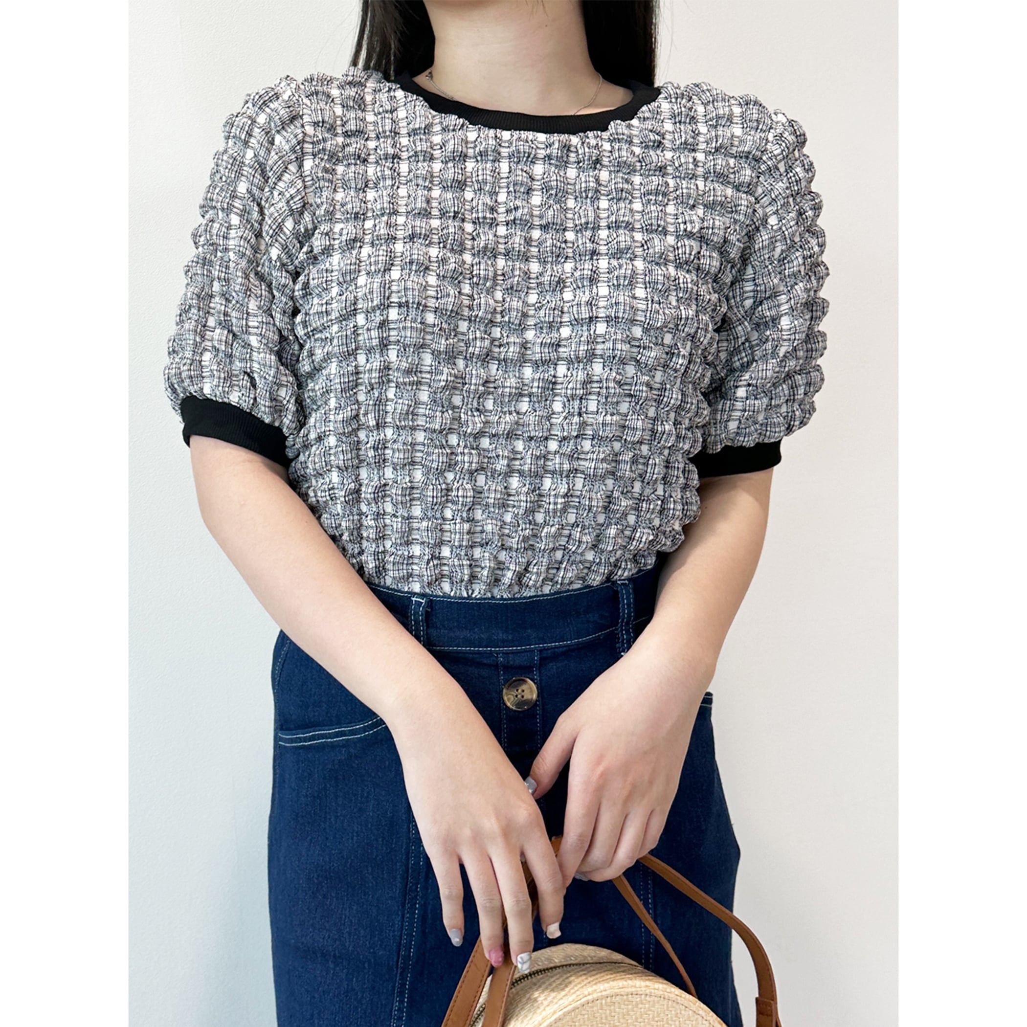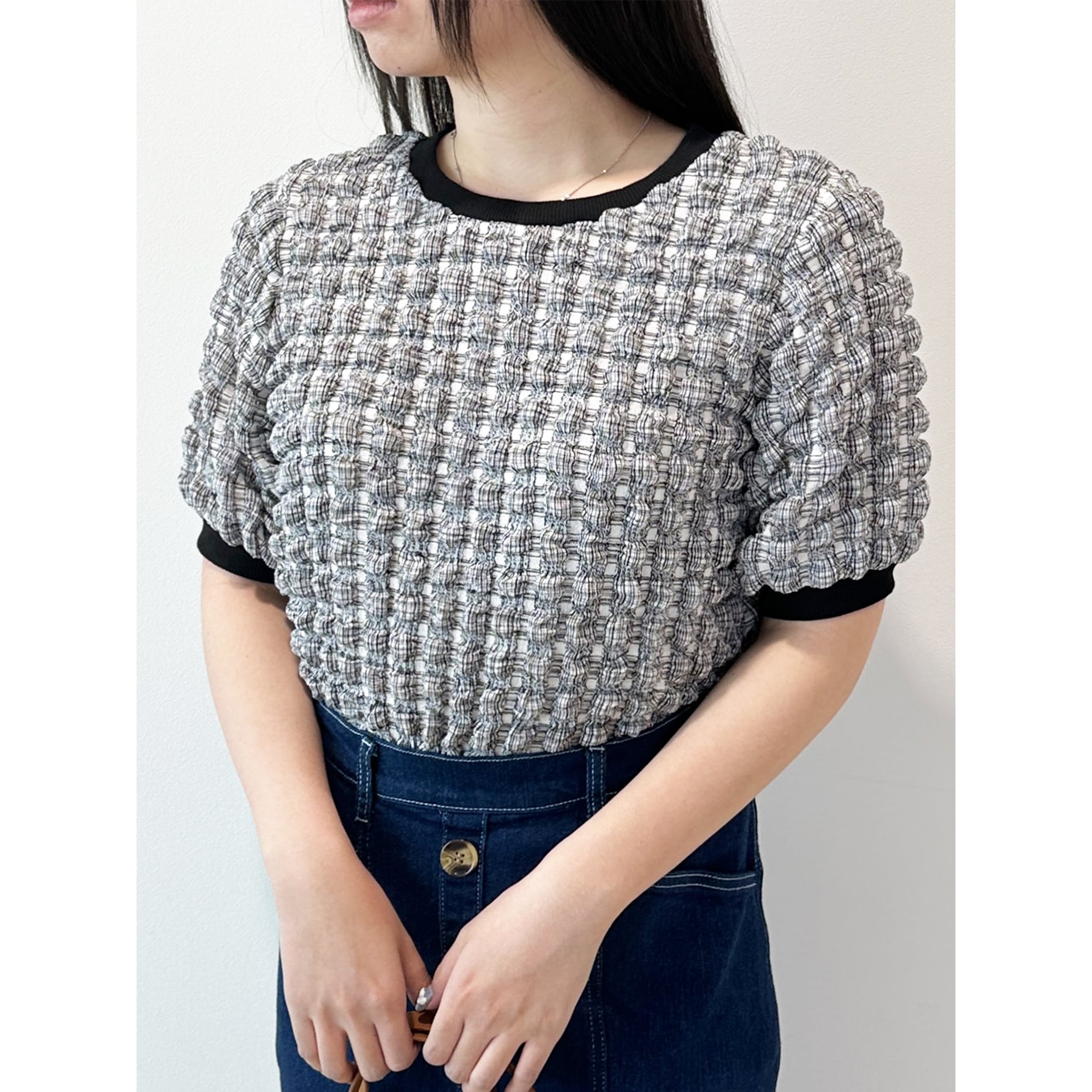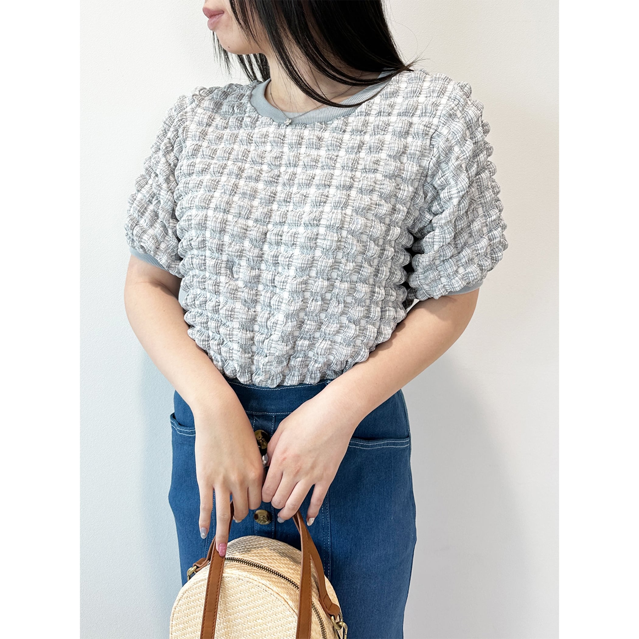 トレンドのポップコーン素材のトップスが落ち着いたチェック柄で展開。一枚で華のある商品なのでシンプルなボトムを合わせてもトレンドライクなコーディネートに仕上げてれます。ぽこぽこした素材感ですがサラっとした肌触りなので熱い時期も着用しやすいアイテムです。