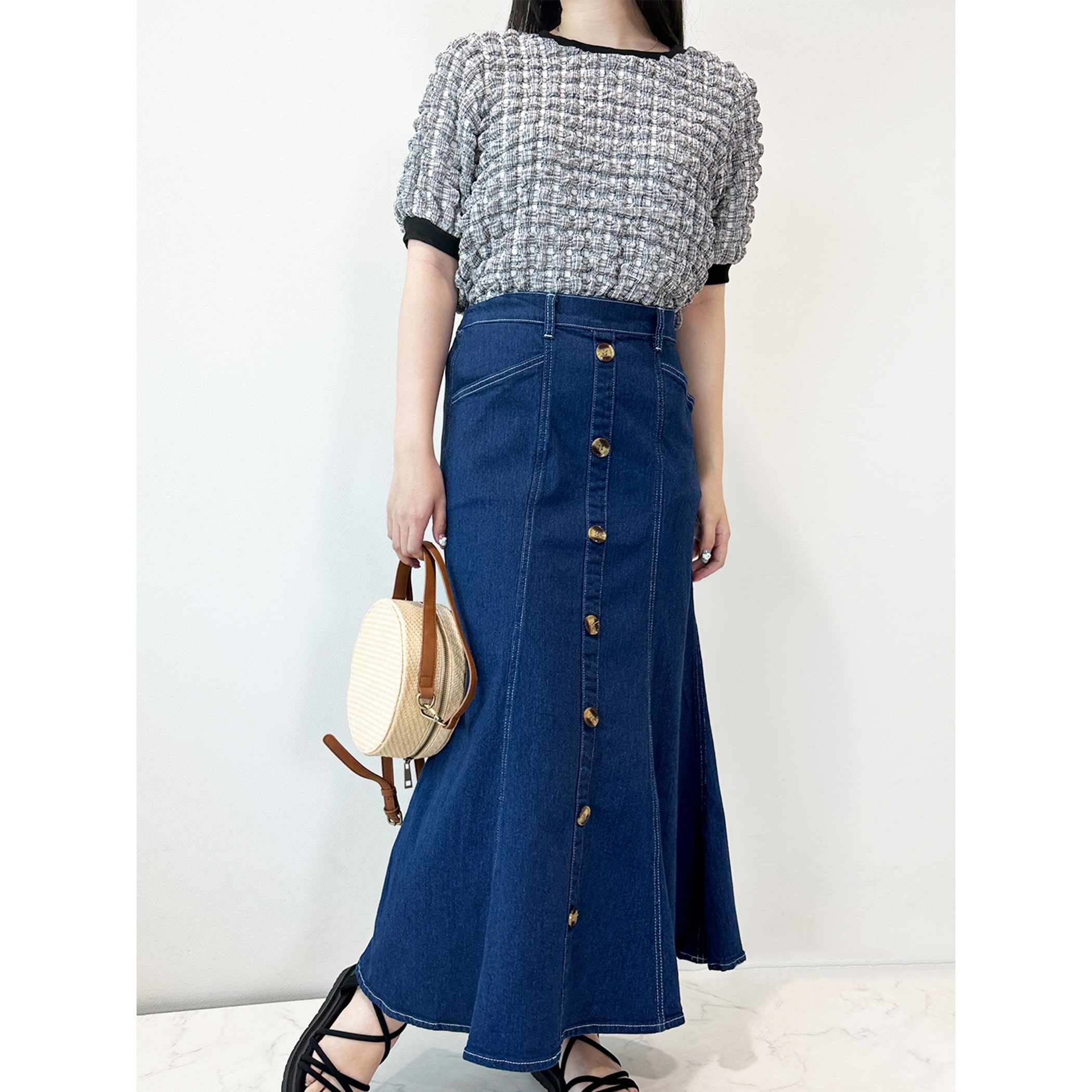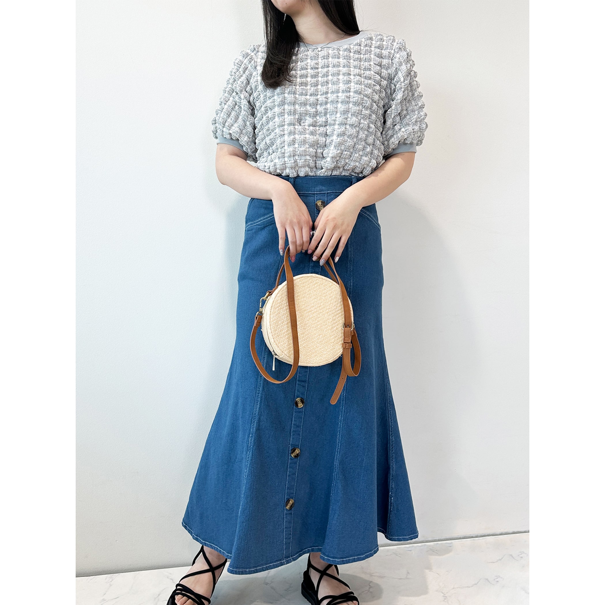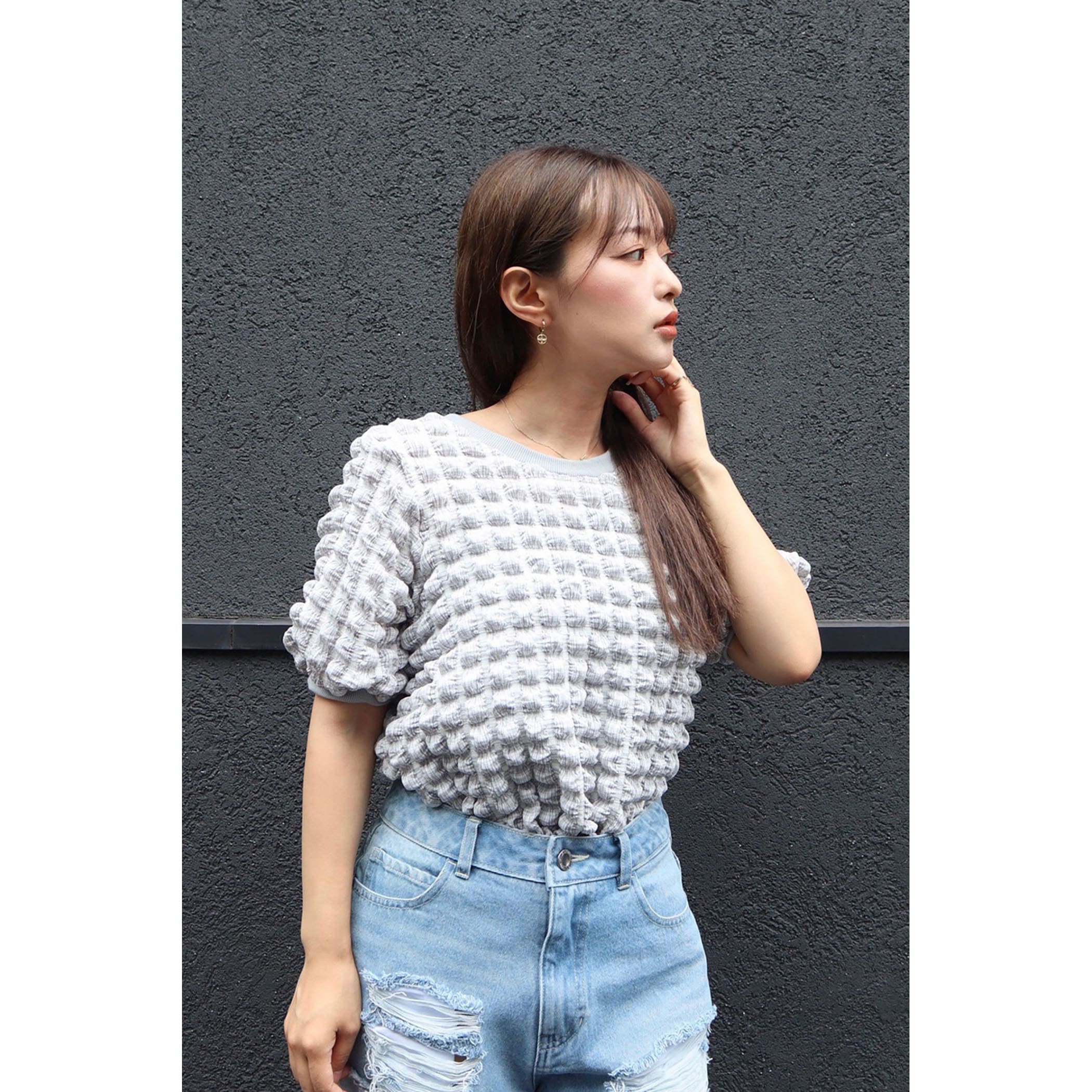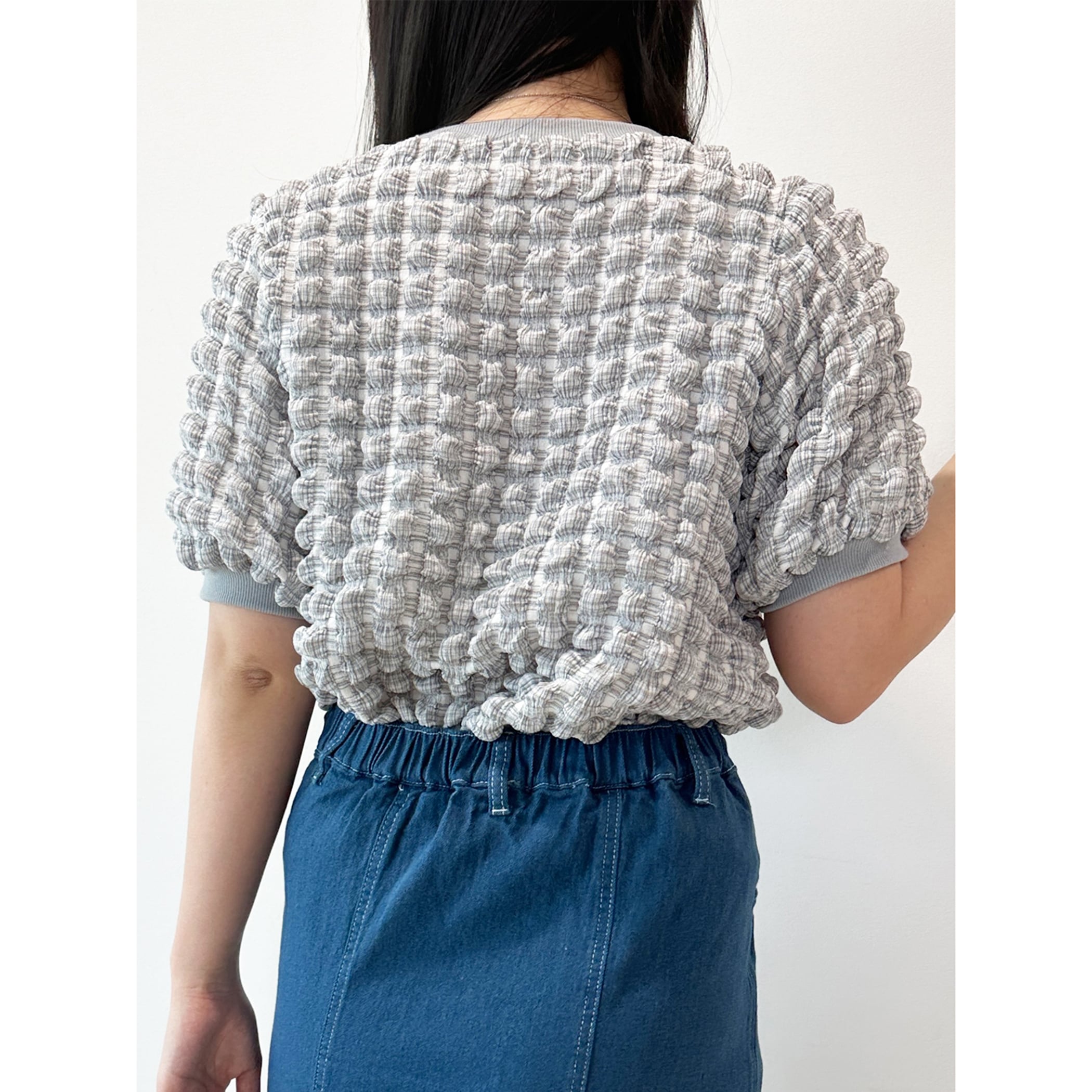 トレンドのポップコーン素材のトップスが落ち着いたチェック柄で展開。一枚で華のある商品なのでシンプルなボトムを合わせてもトレンドライクなコーディネートに仕上げてれます。ぽこぽこした素材感ですがサラっとした肌触りなので熱い時期も着用しやすいアイテムです。