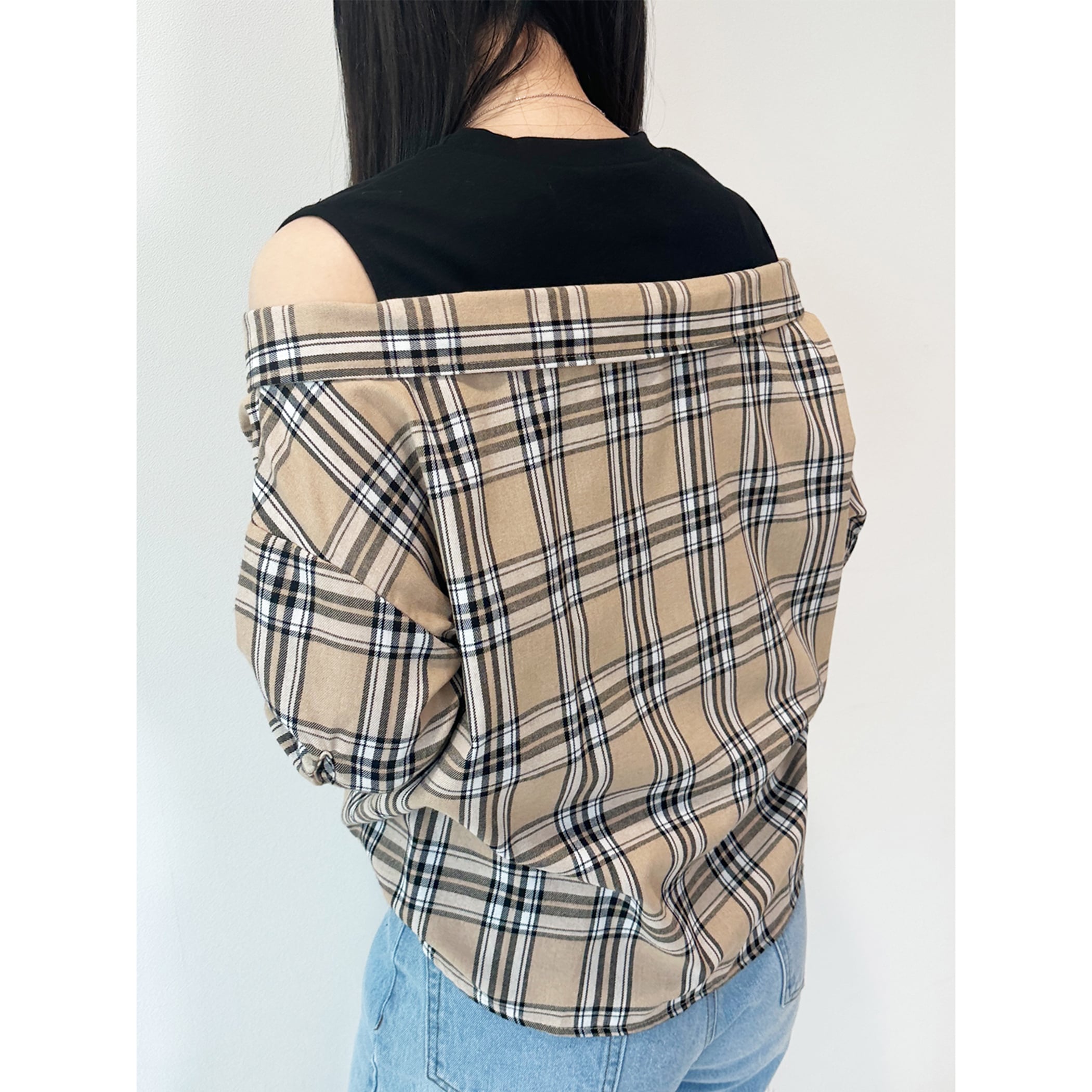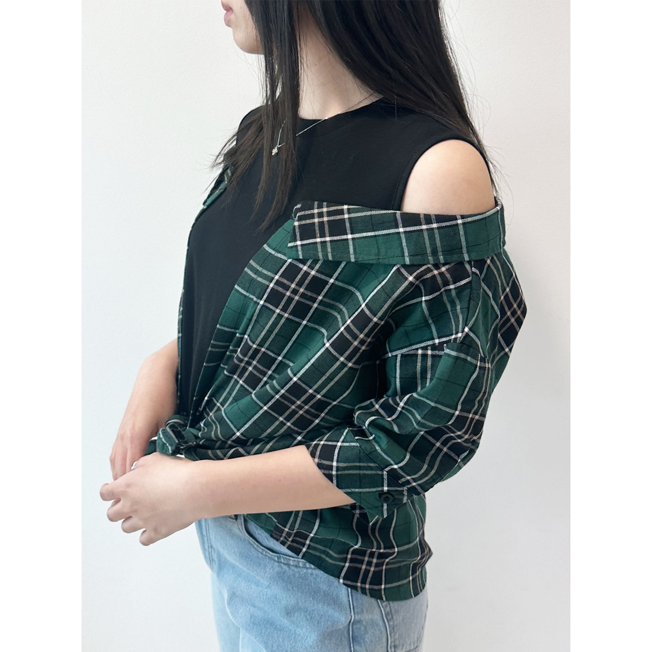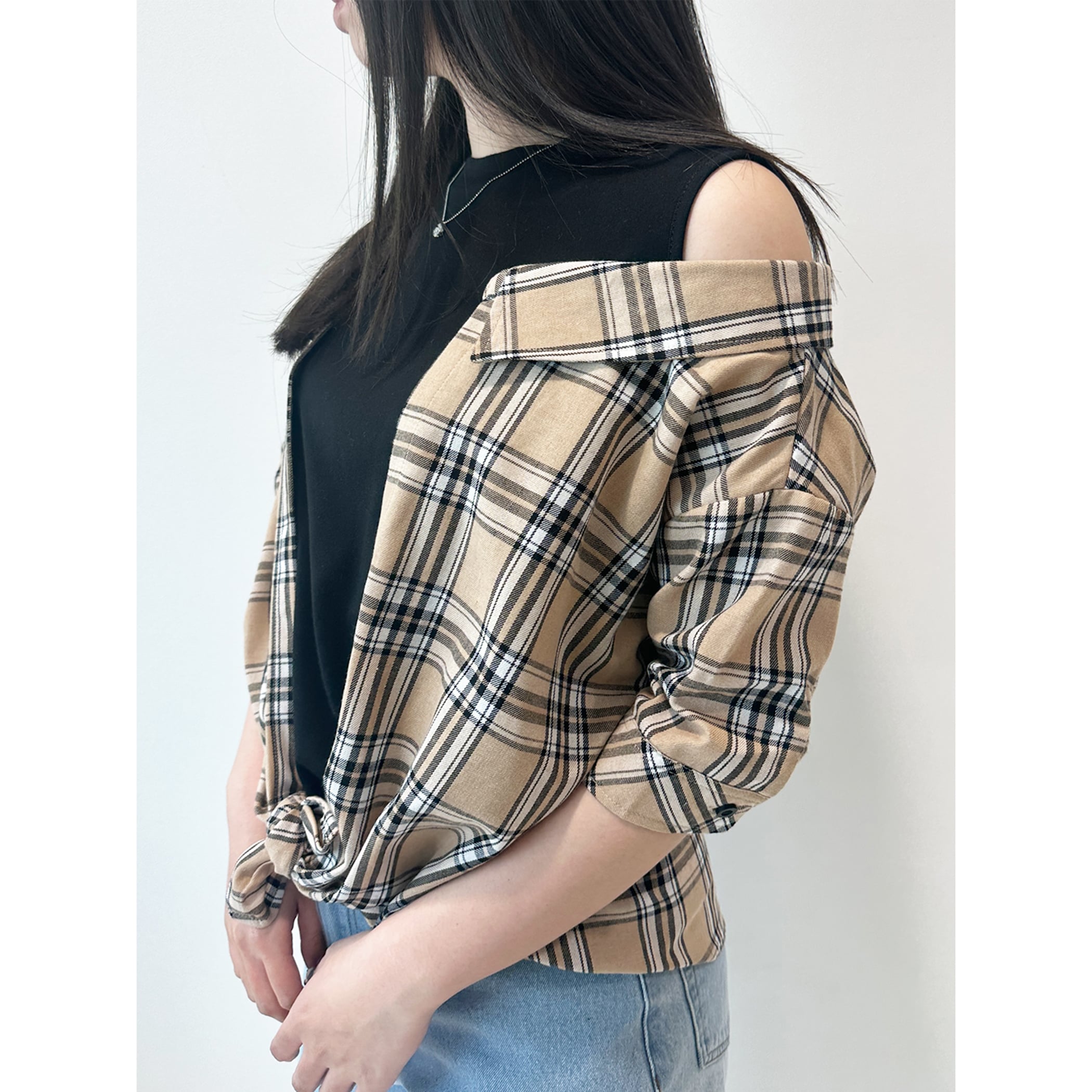 一枚でコーディネートが完成するレイヤードシャツ。タンクトップにチェックシャツがレイヤードされており、もたつきを感じることなく肌見せスタイルが楽しめます。肩出しのデザインですが袖は二の腕が隠れるくらいの5分丈なので、肌見せが苦手な方でも着用しやすいデザインです。デニムやワイドパンツ・マーメイドスカートなど幅広いボトムに合わせやすい一枚です。