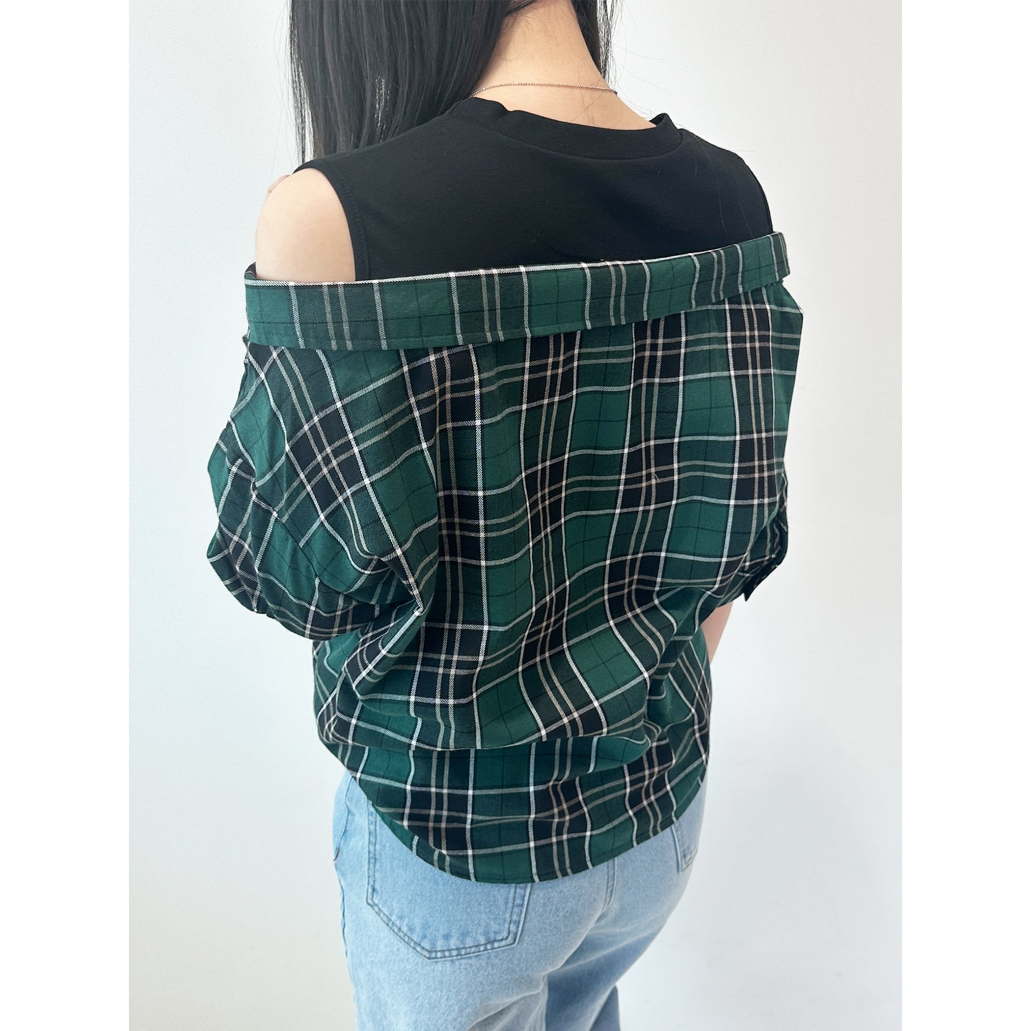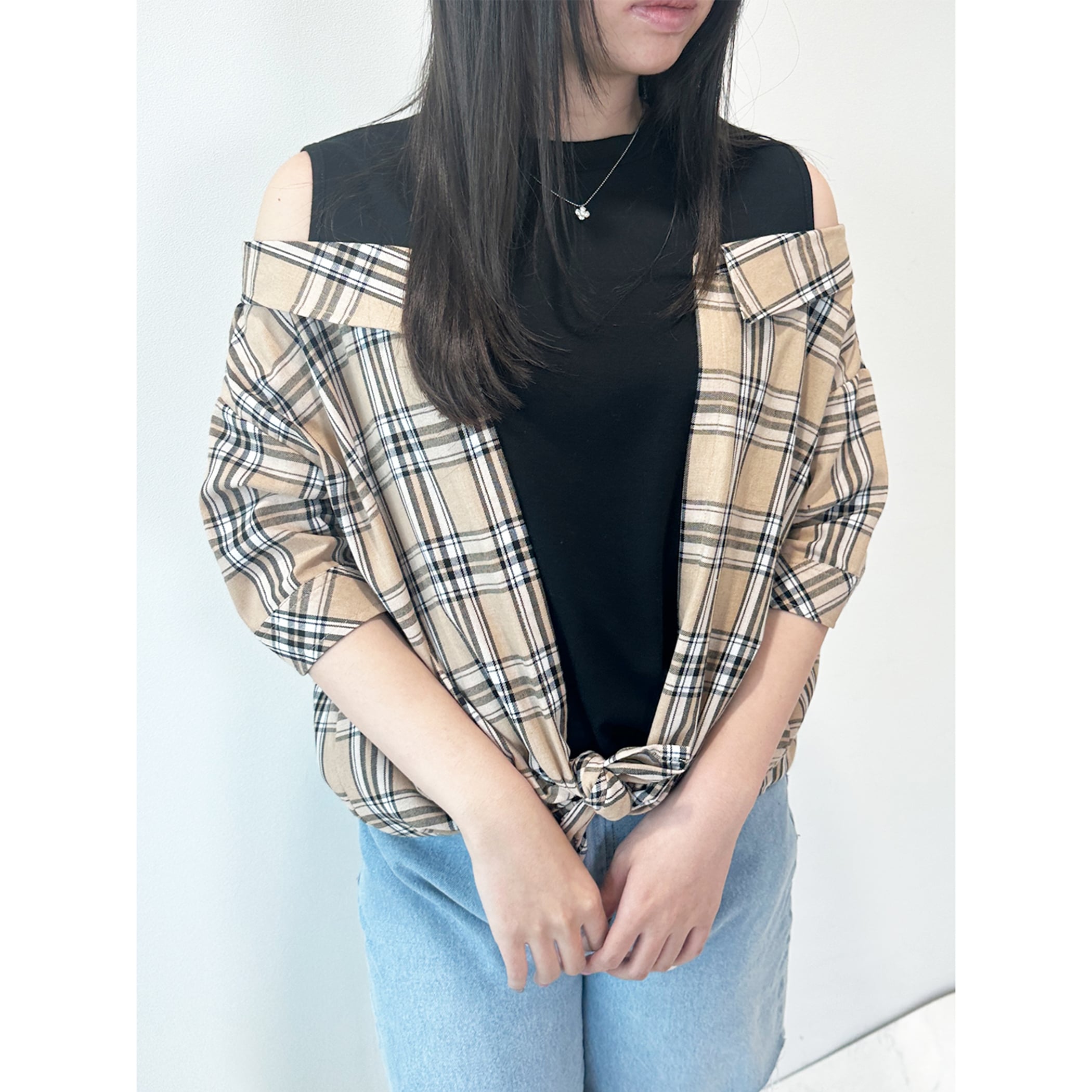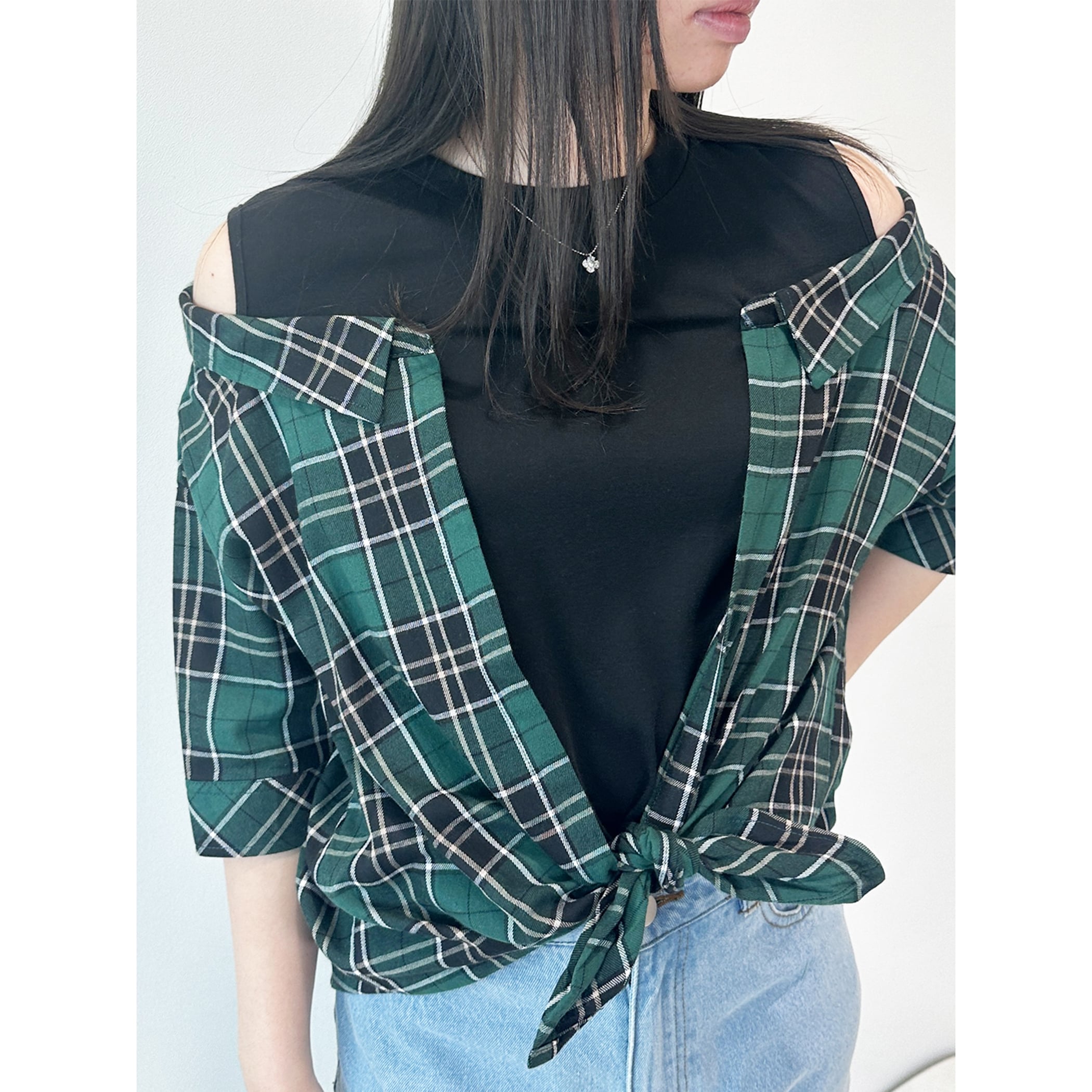 一枚でコーディネートが完成するレイヤードシャツ。タンクトップにチェックシャツがレイヤードされており、もたつきを感じることなく肌見せスタイルが楽しめます。肩出しのデザインですが袖は二の腕が隠れるくらいの5分丈なので、肌見せが苦手な方でも着用しやすいデザインです。デニムやワイドパンツ・マーメイドスカートなど幅広いボトムに合わせやすい一枚です。