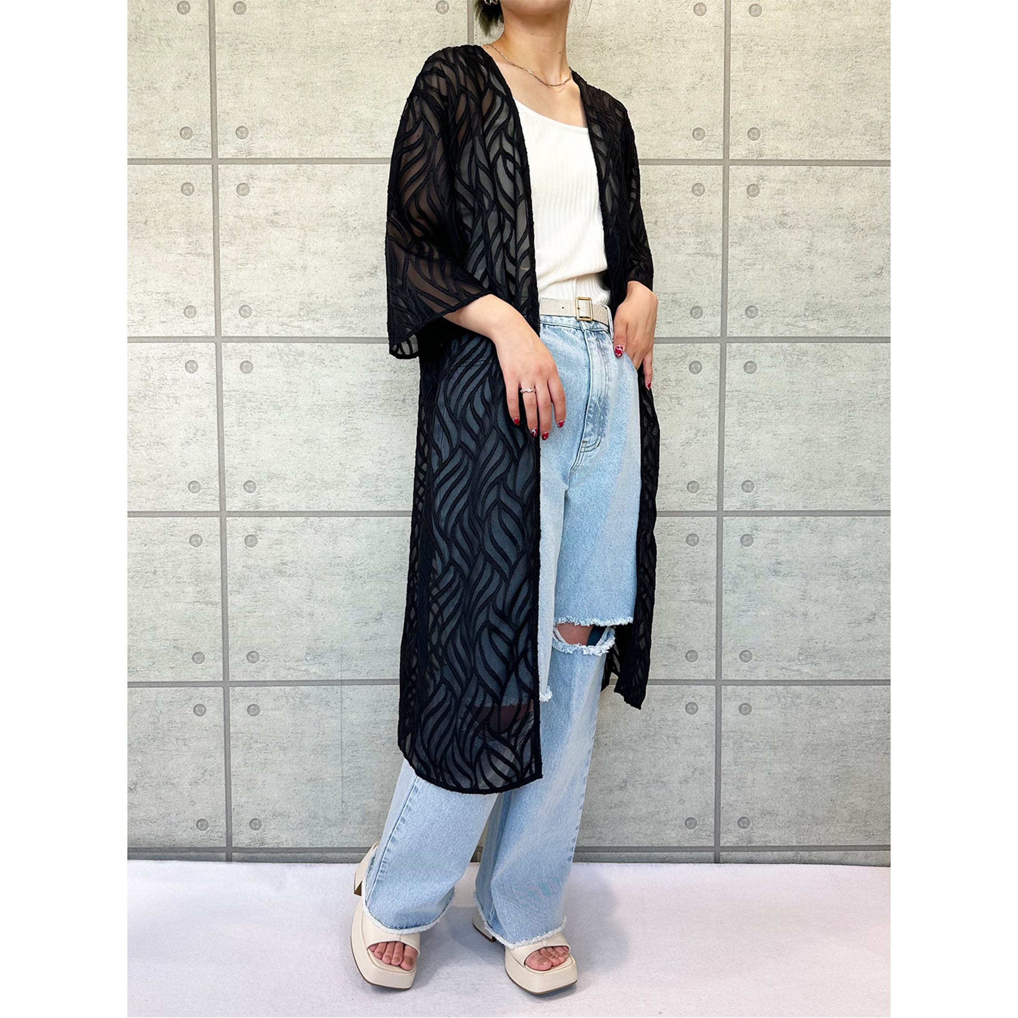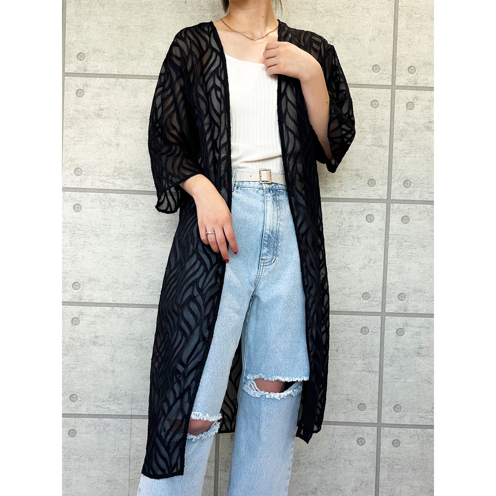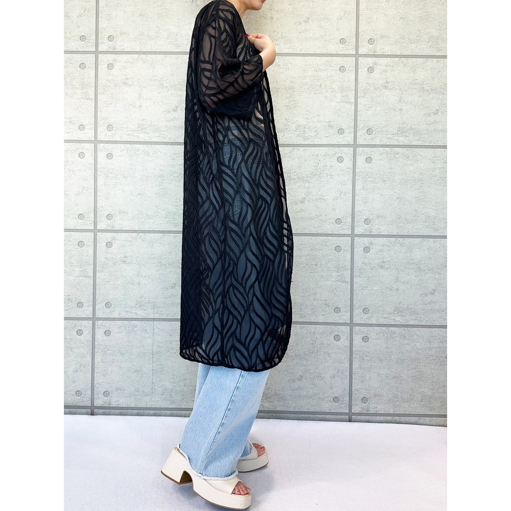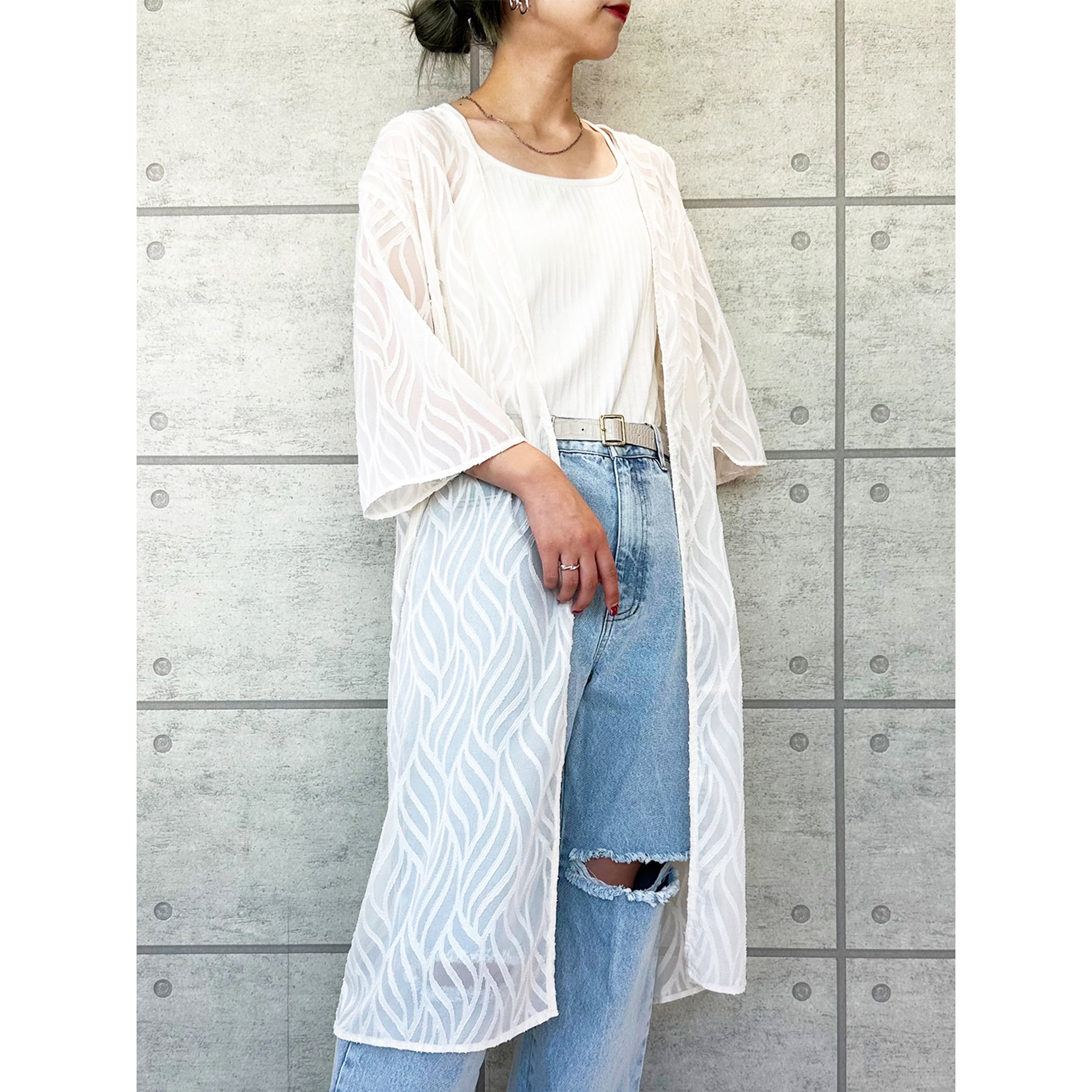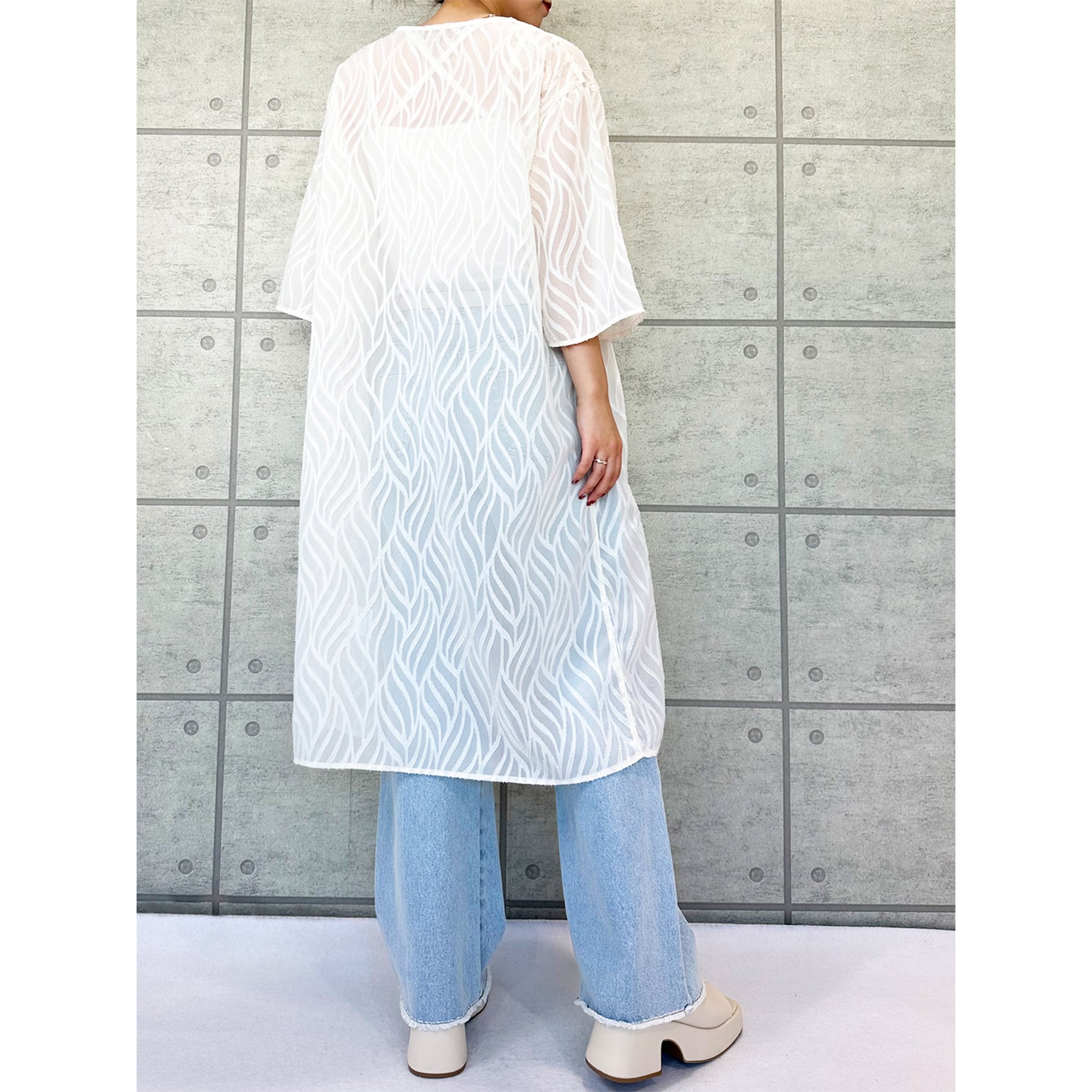 柄に凹凸感と上品な透け感がオシャレなロングガウン。ドロップショルダーでゆとりのあるシルエットなので、ラフに羽織るだけでこなれた雰囲気に。軽い素材なので歩く度にゆれるシルエットがオシャレなアイテムです。熱い時期のレイヤードスタイルに大活躍の一枚です。