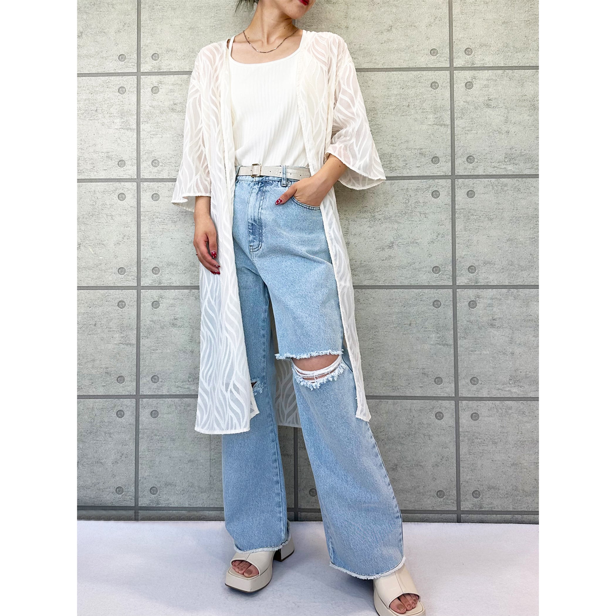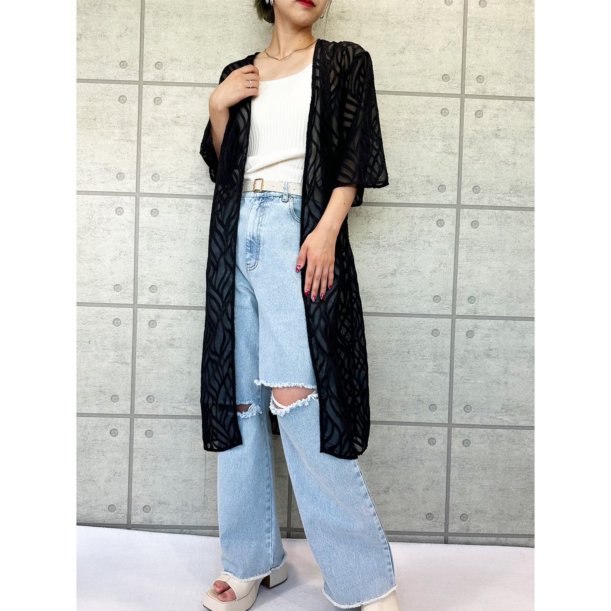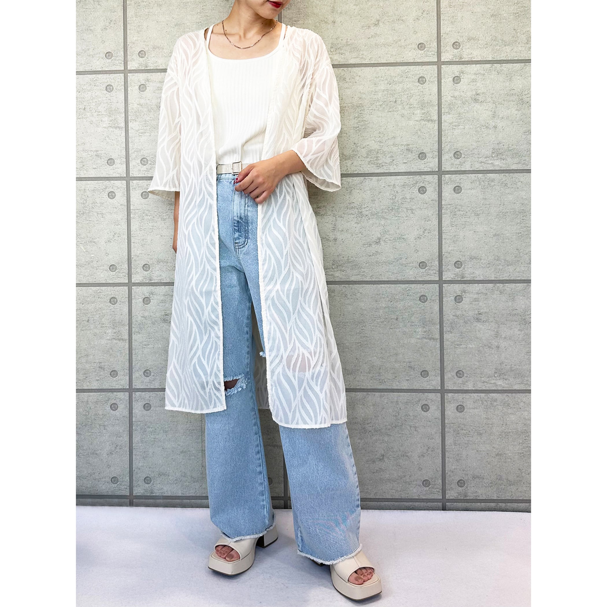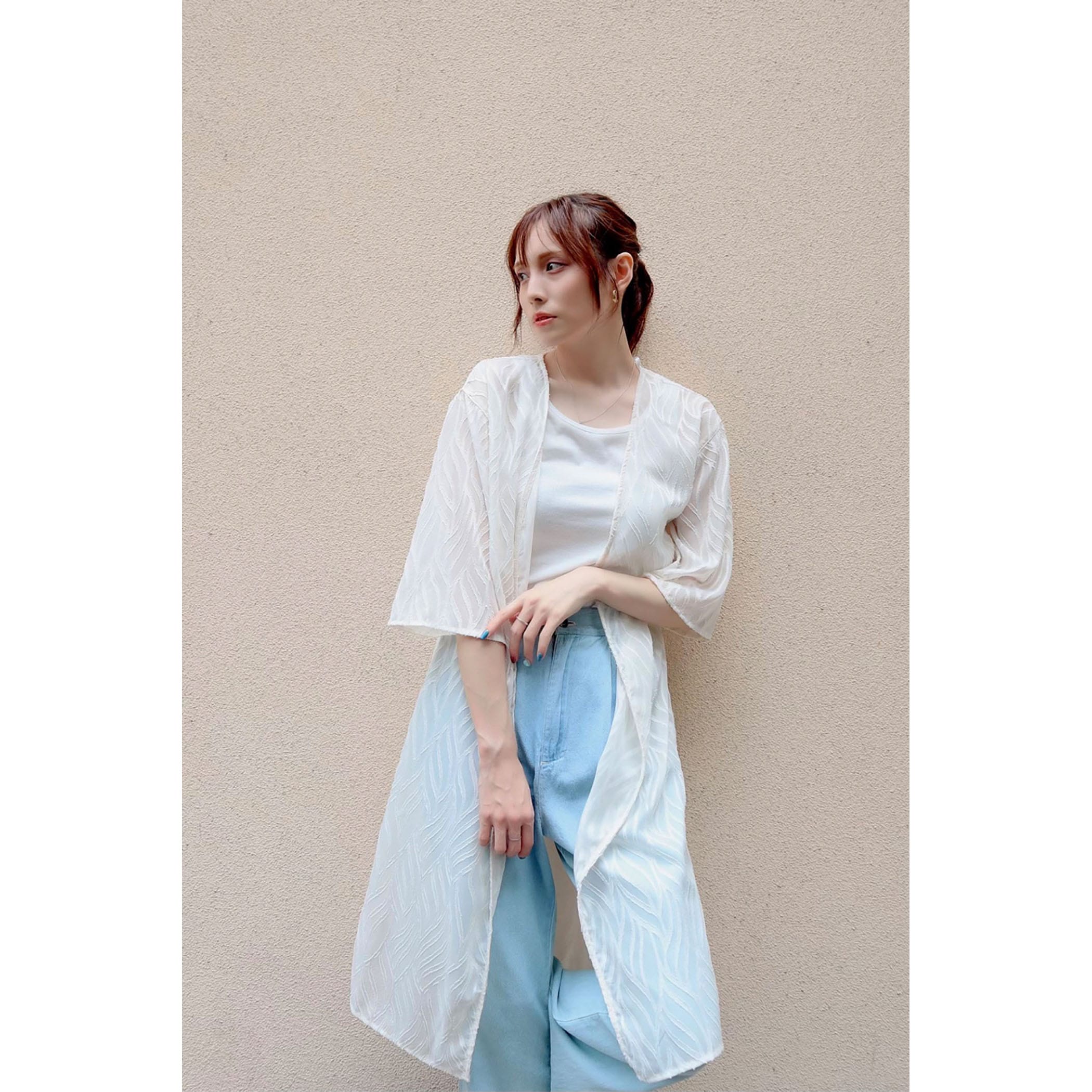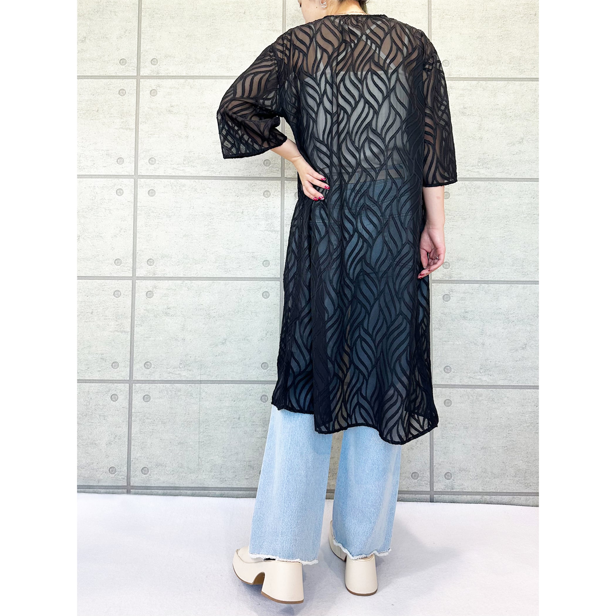柄に凹凸感と上品な透け感がオシャレなロングガウン。ドロップショルダーでゆとりのあるシルエットなので、ラフに羽織るだけでこなれた雰囲気に。軽い素材なので歩く度にゆれるシルエットがオシャレなアイテムです。熱い時期のレイヤードスタイルに大活躍の一枚です。